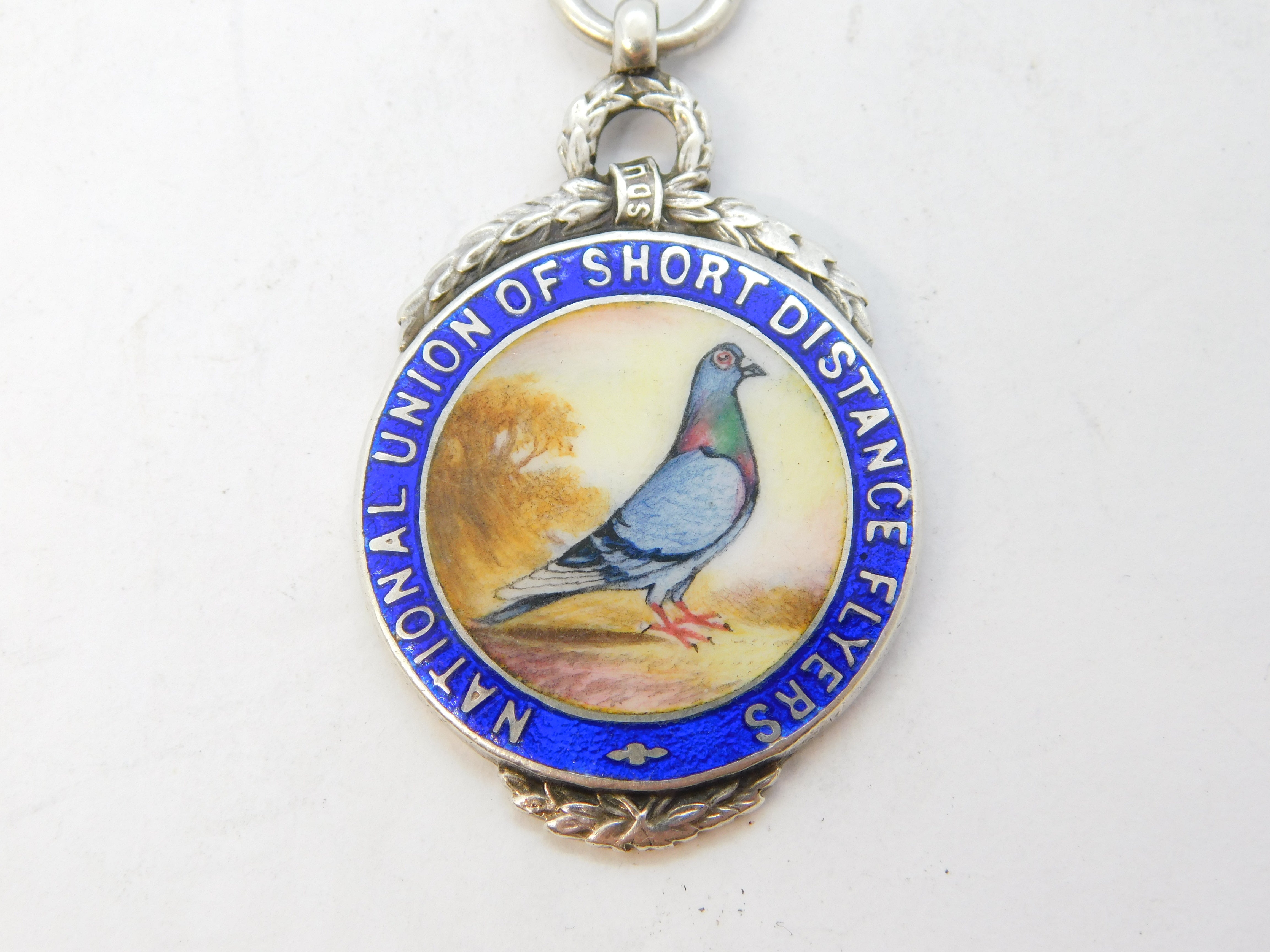 Details: A fantastic and wonderfully designed antique art deco sterling silver & colourful enamel fob medal issued by the 'National Union of Short Distance Flyers' of racing pigeon interest with charming detail, hallmarked Birmingham 1926 to the reverse. This is a wonderful item that would make a perfect gift or addition to any collection. We are more than happy to provide XRF reports for items upon request.
