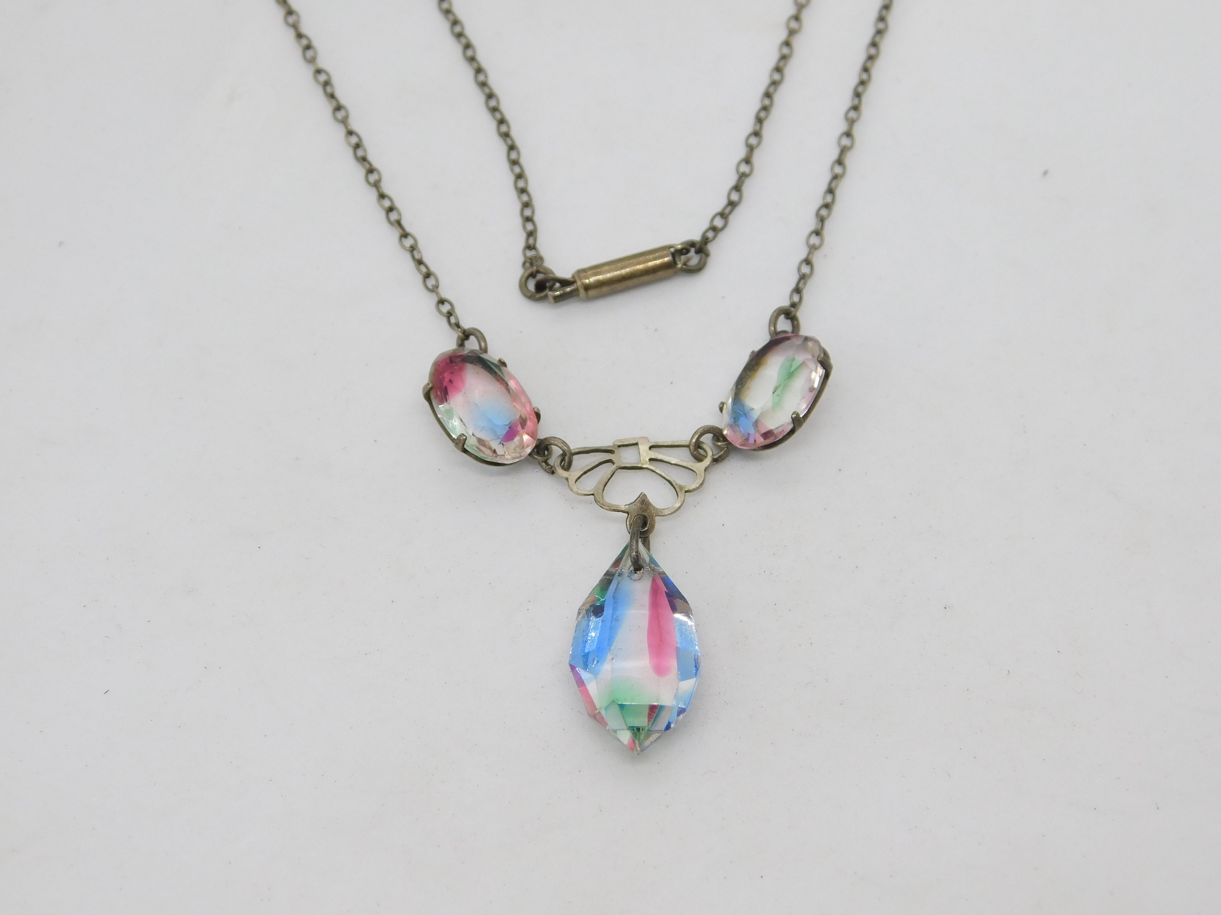 Art Deco Sterling Silver Faceted Iris Glass Floral Drop Necklace c1920 Antique