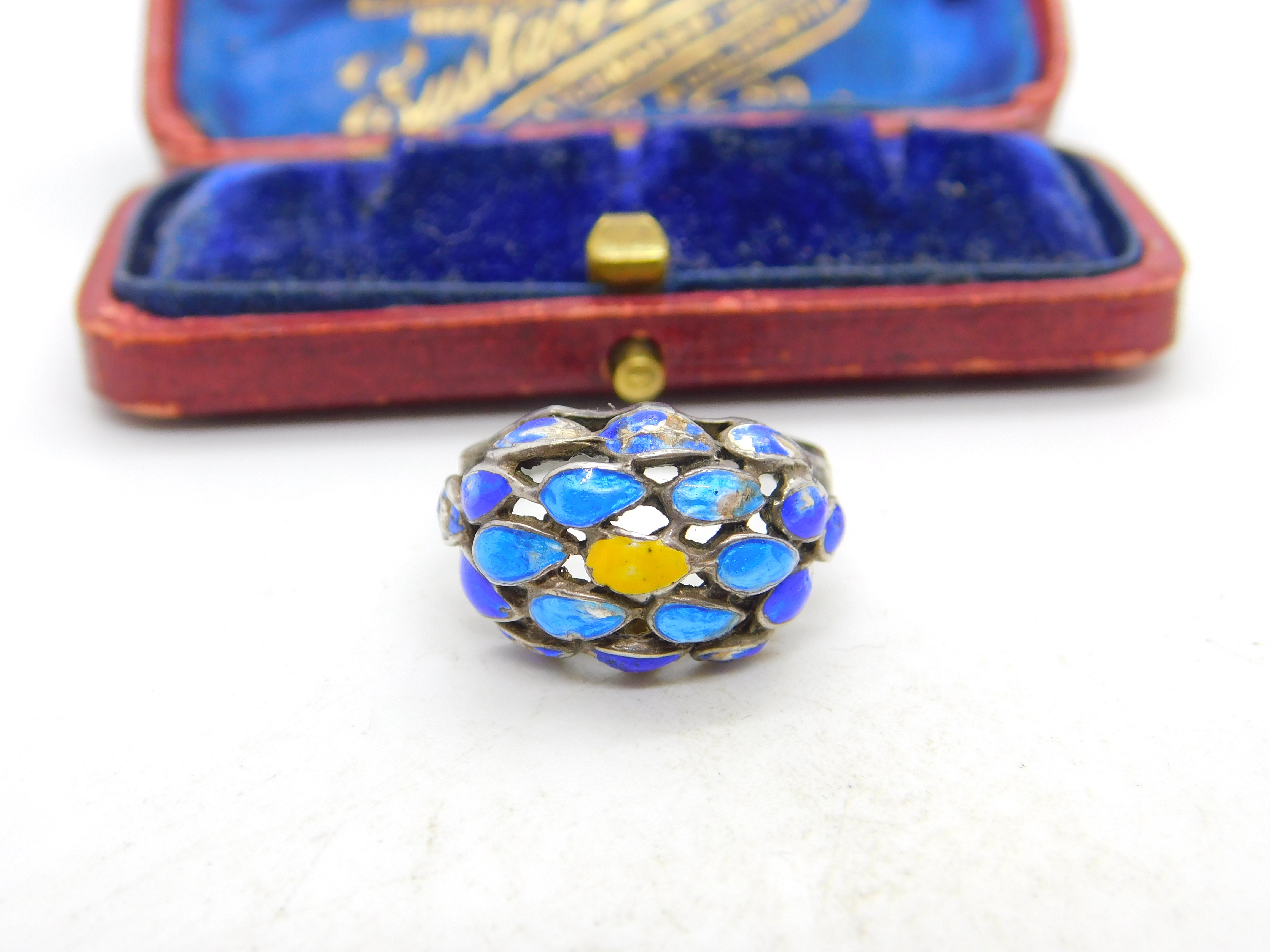 Sterling Silver Colourful Enamel Floral Pattern Dress Ring Antique c1920 Art Deco