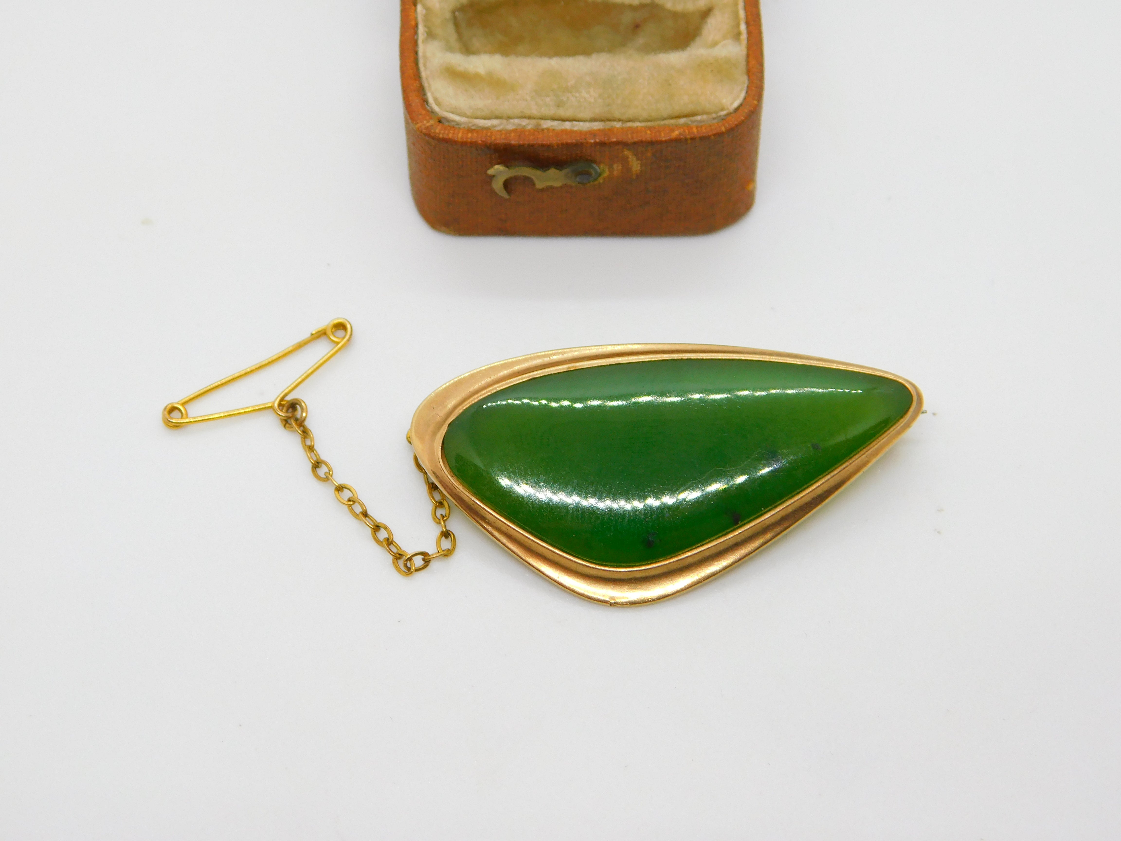 9ct Yellow Gold Abstract Nephrite Jade Brooch Pin Antique c1920 Art Deco