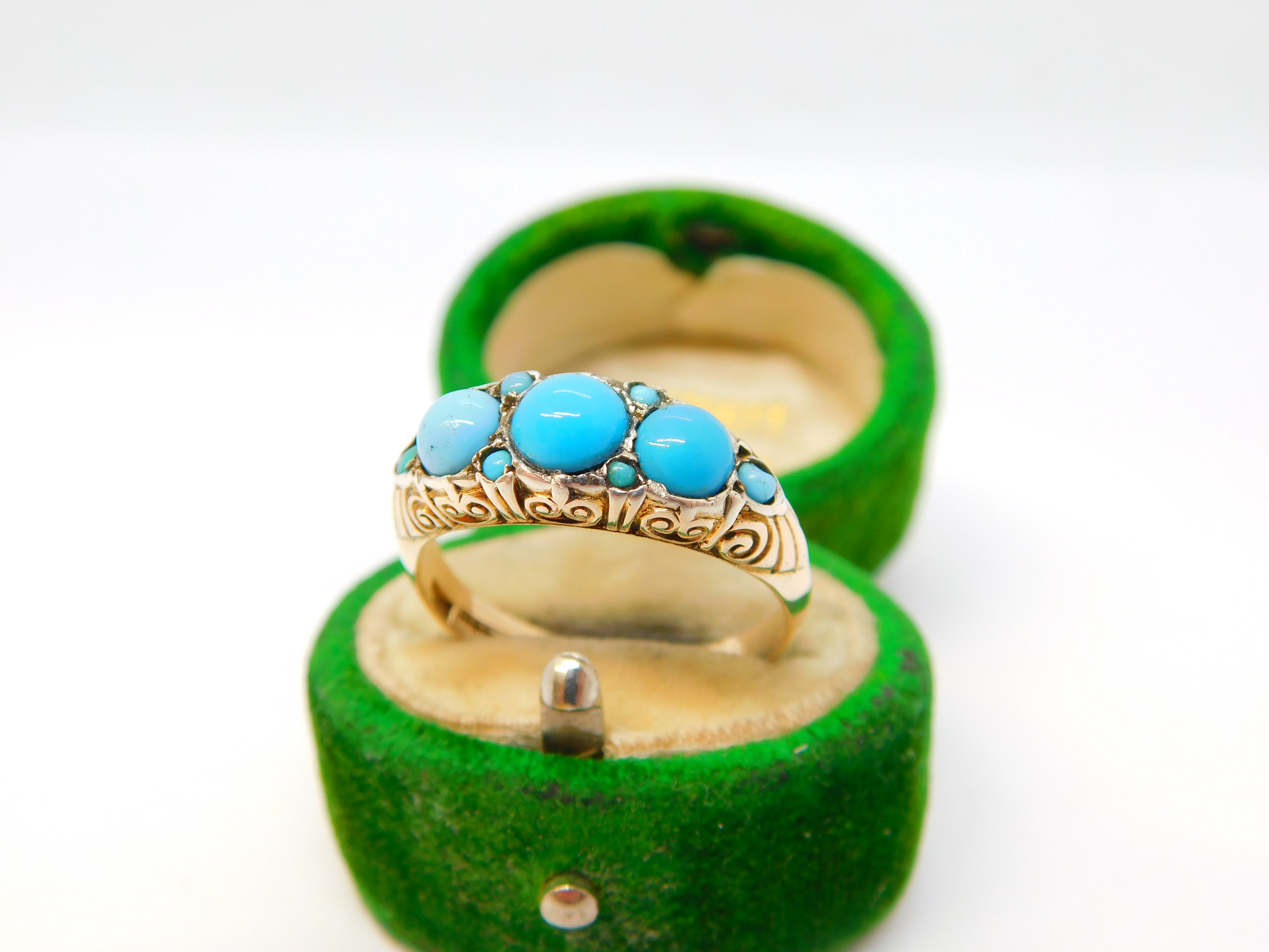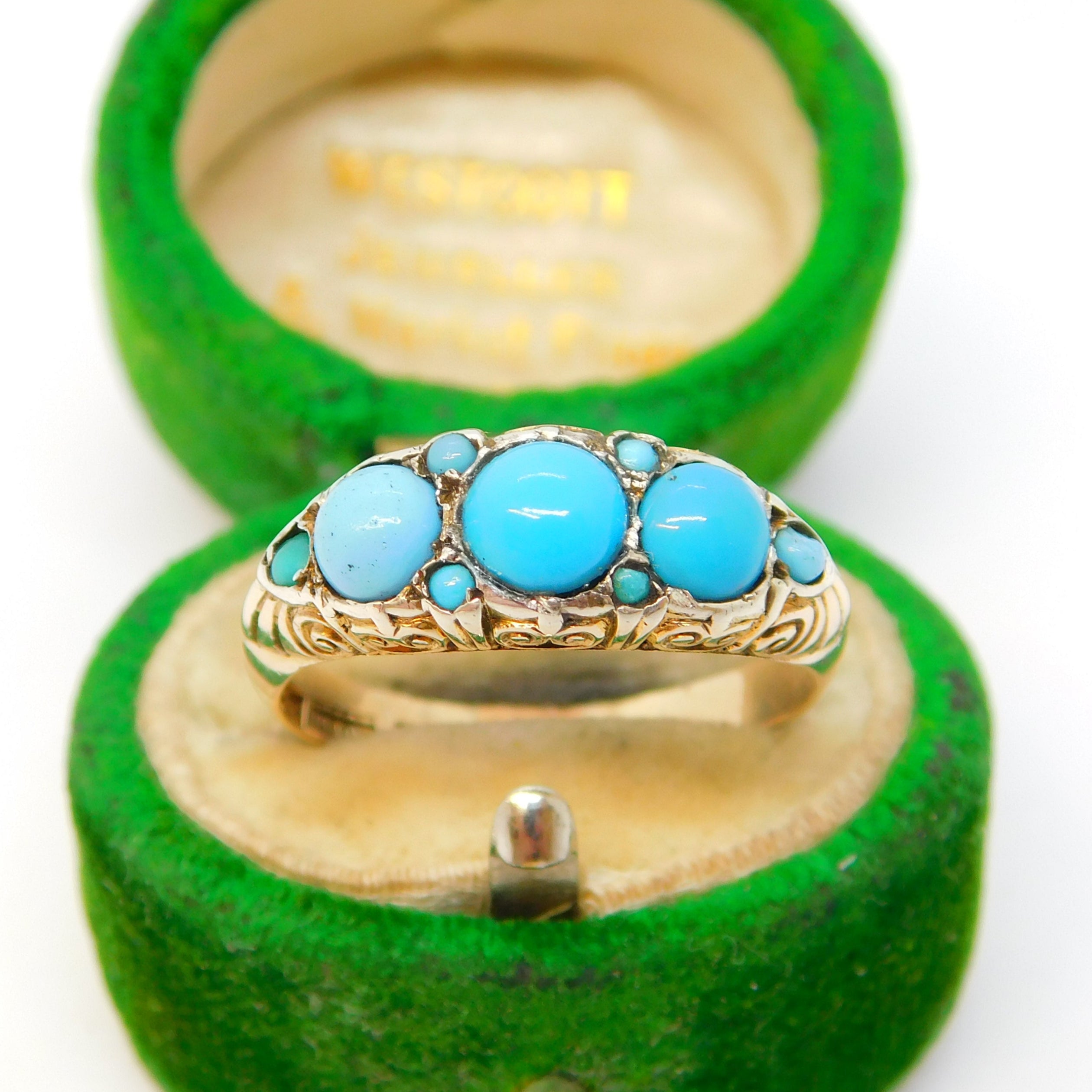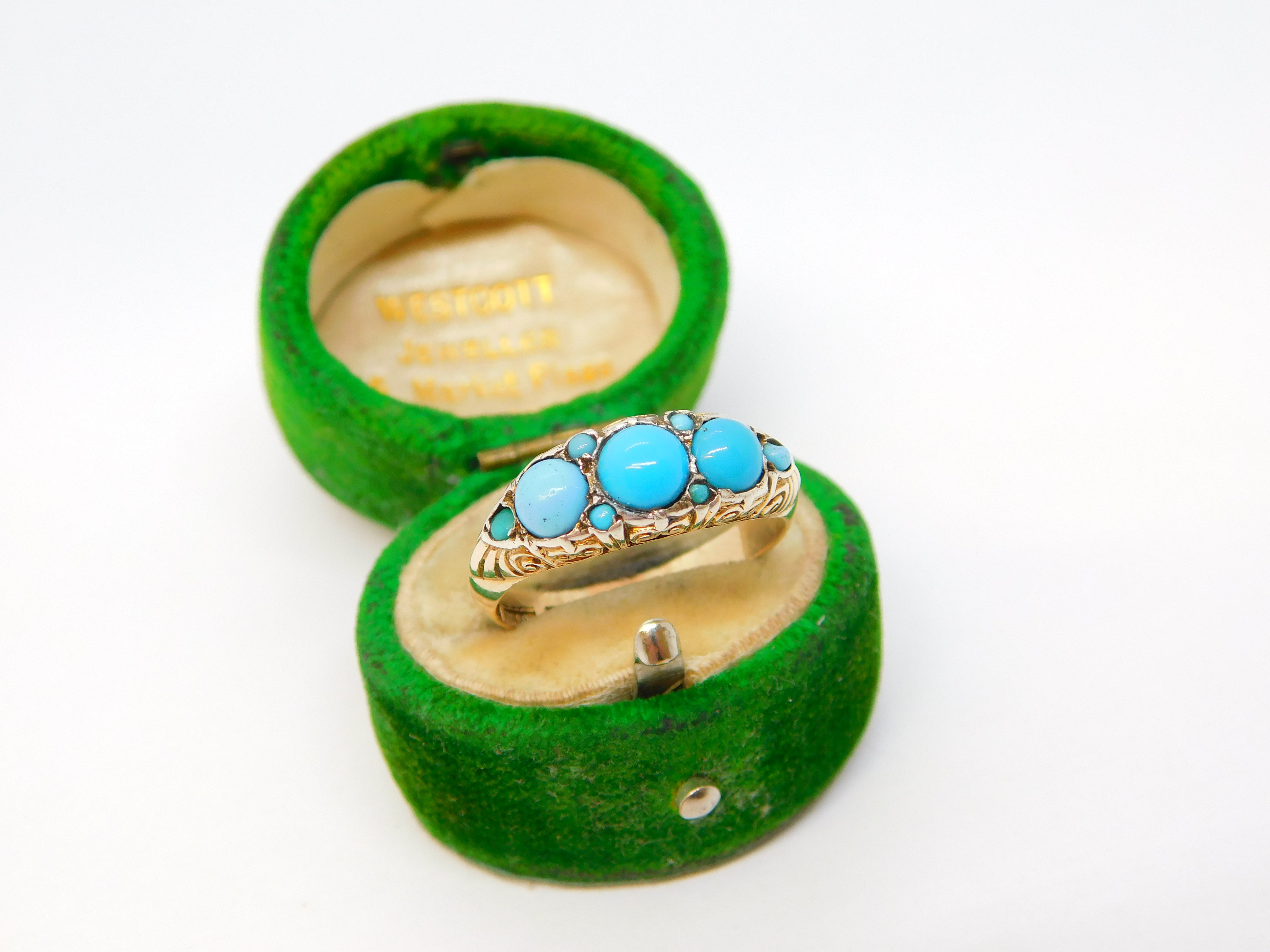Details: A fantastic and wonderfully designed antique Edwardian art nouveau period 9ct yellow gold boat ring set with graduating natural turquoise hallmarked to the interior with M.B & Co. mark for prestigious jewellery designers Murrle Bennett & Co. alongside '9ct' marks. This is a wonderful item that would make a perfect gift or addition to any collection. The BOX pictured is for PRESENTATION ONLY and is NOT included in the listings but used to frame the pictures unless specifically stated otherwise.