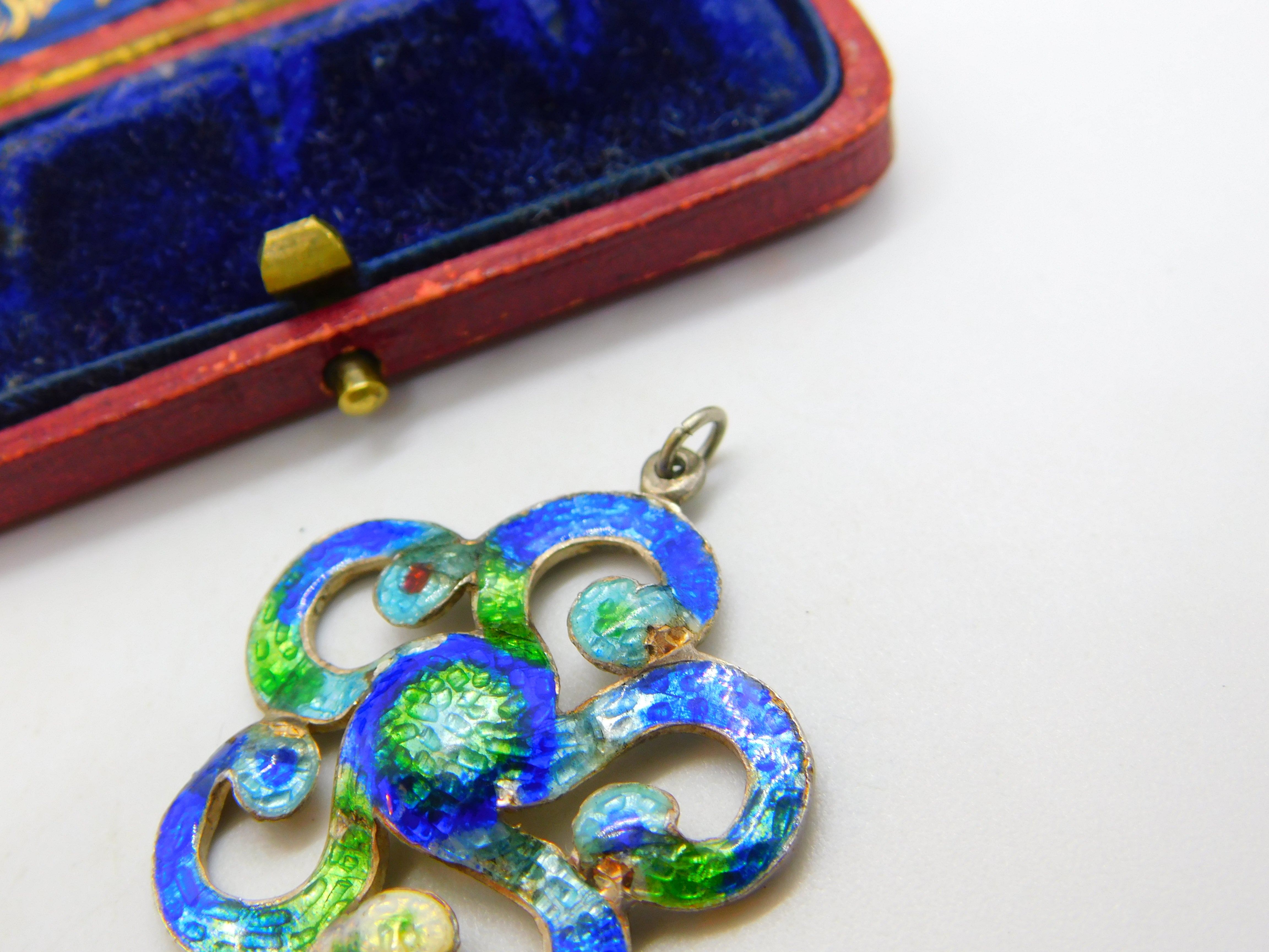 Details: A fantastic and wonderfully designed antique Edwardian sterling silver & colourful guilloche enamel floral swirl pattern drop pendant in true art nouveau style hallmarked Birmingham, 1909 by Henry Pope. Minor dings to the enamel please see pictures. This is a wonderful item that would make a perfect gift or addition to any collection. The BOX pictured is for PRESENTATION ONLY and is NOT included in the listings but used to frame the pictures unless specifically stated otherwise.