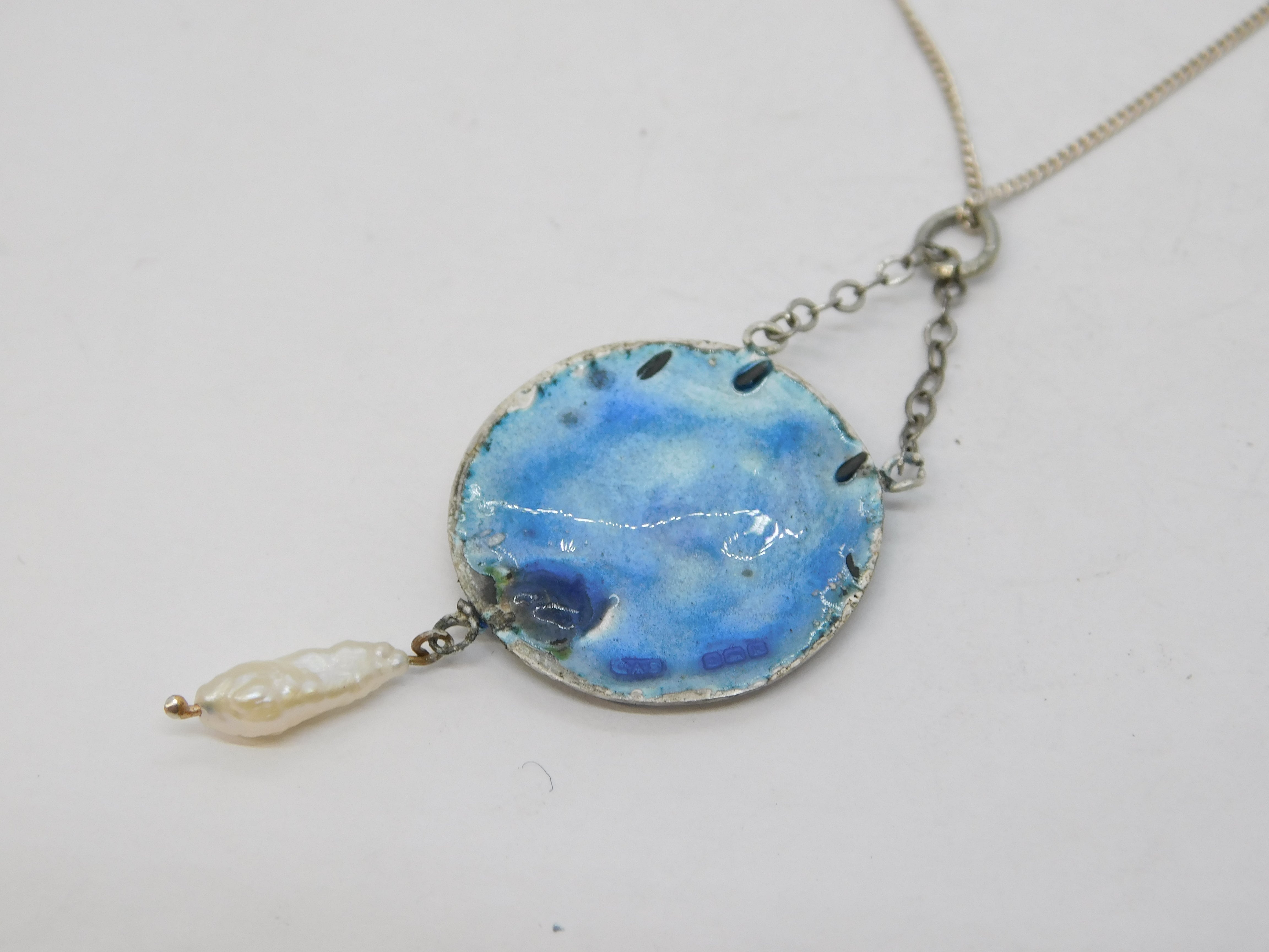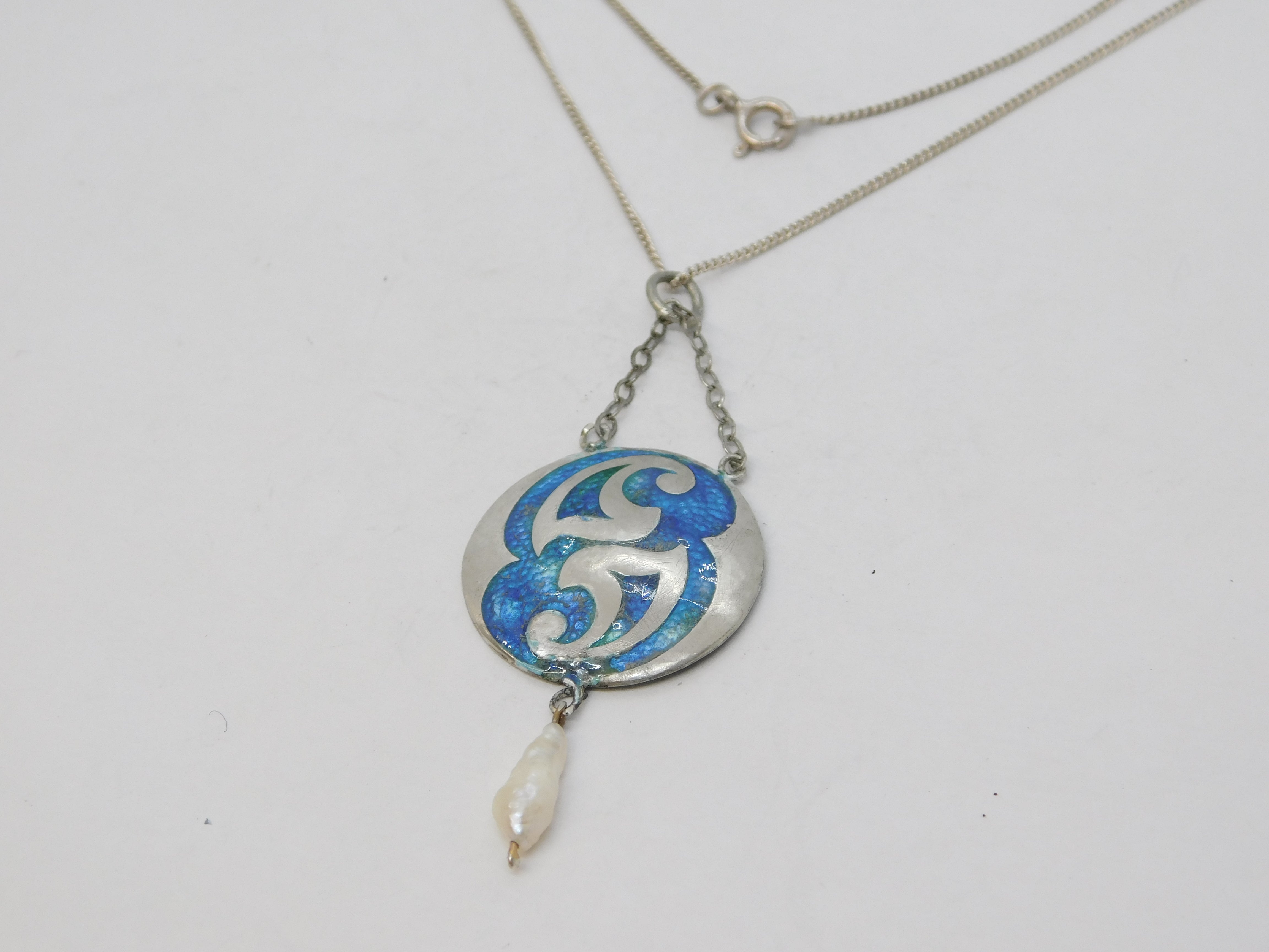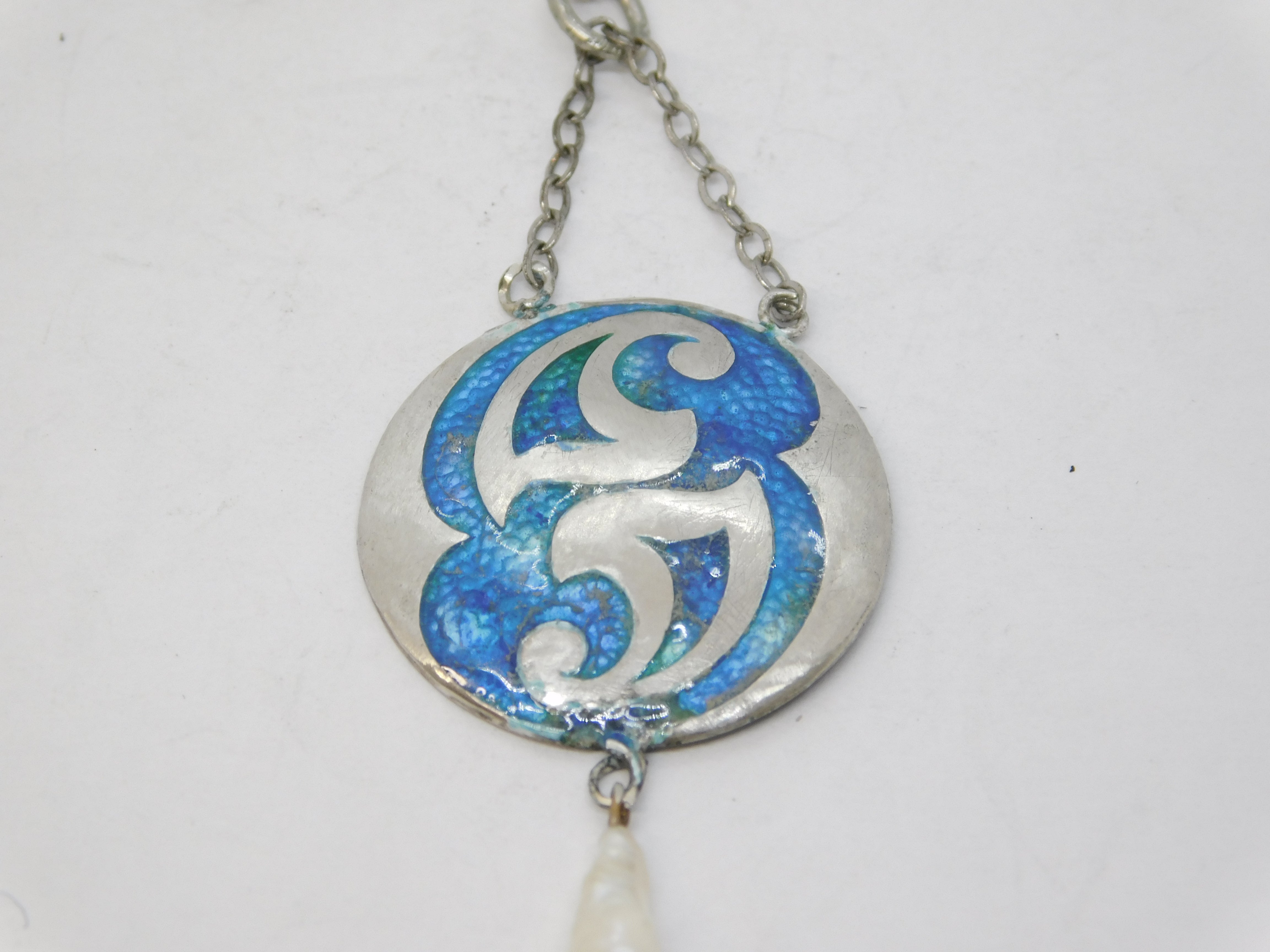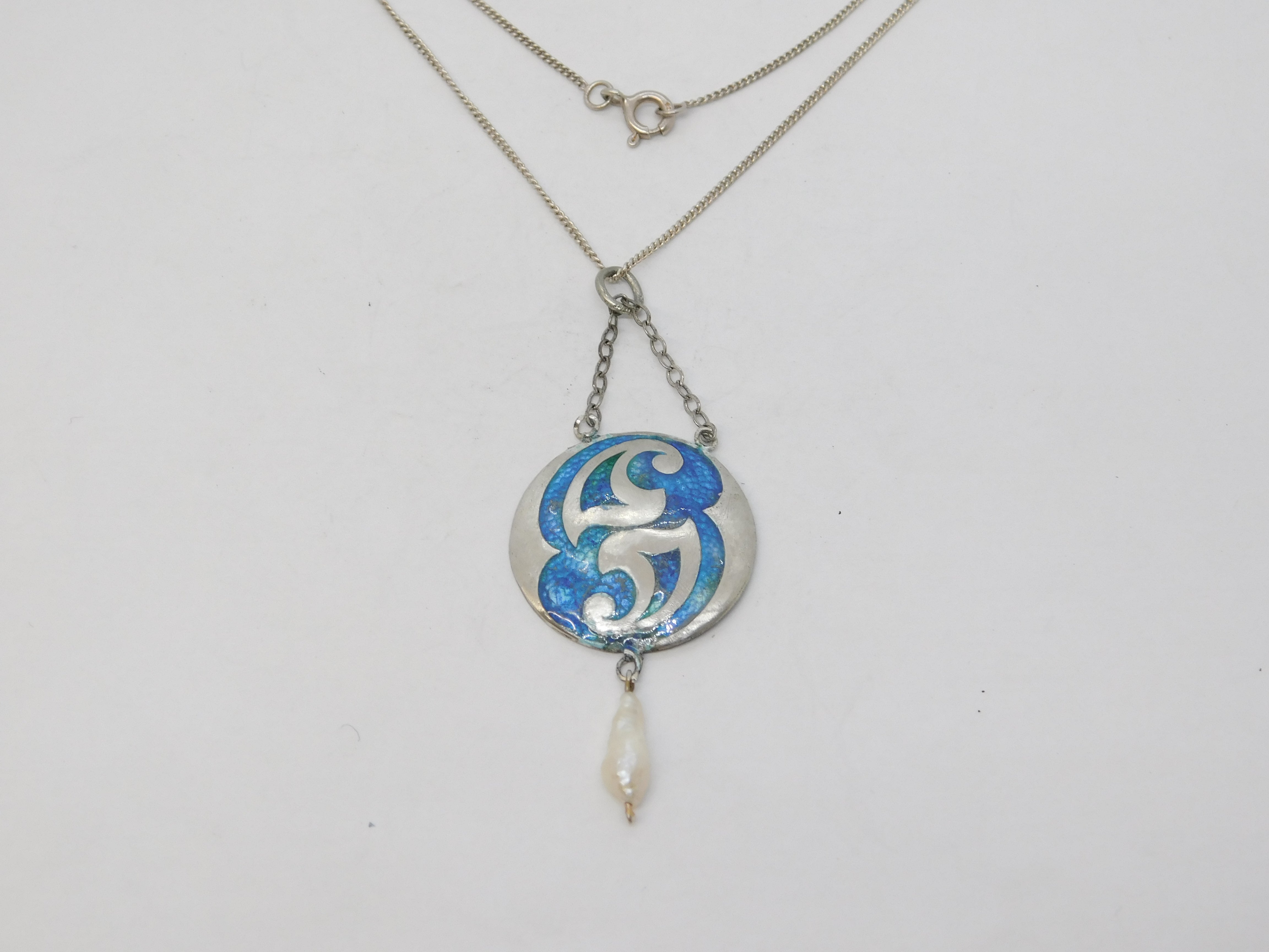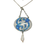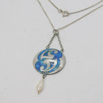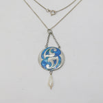 Art Nouveau Sterling Silver Guilloche Enamel, Pearl Drop Necklace Antique 1909 Birmingham