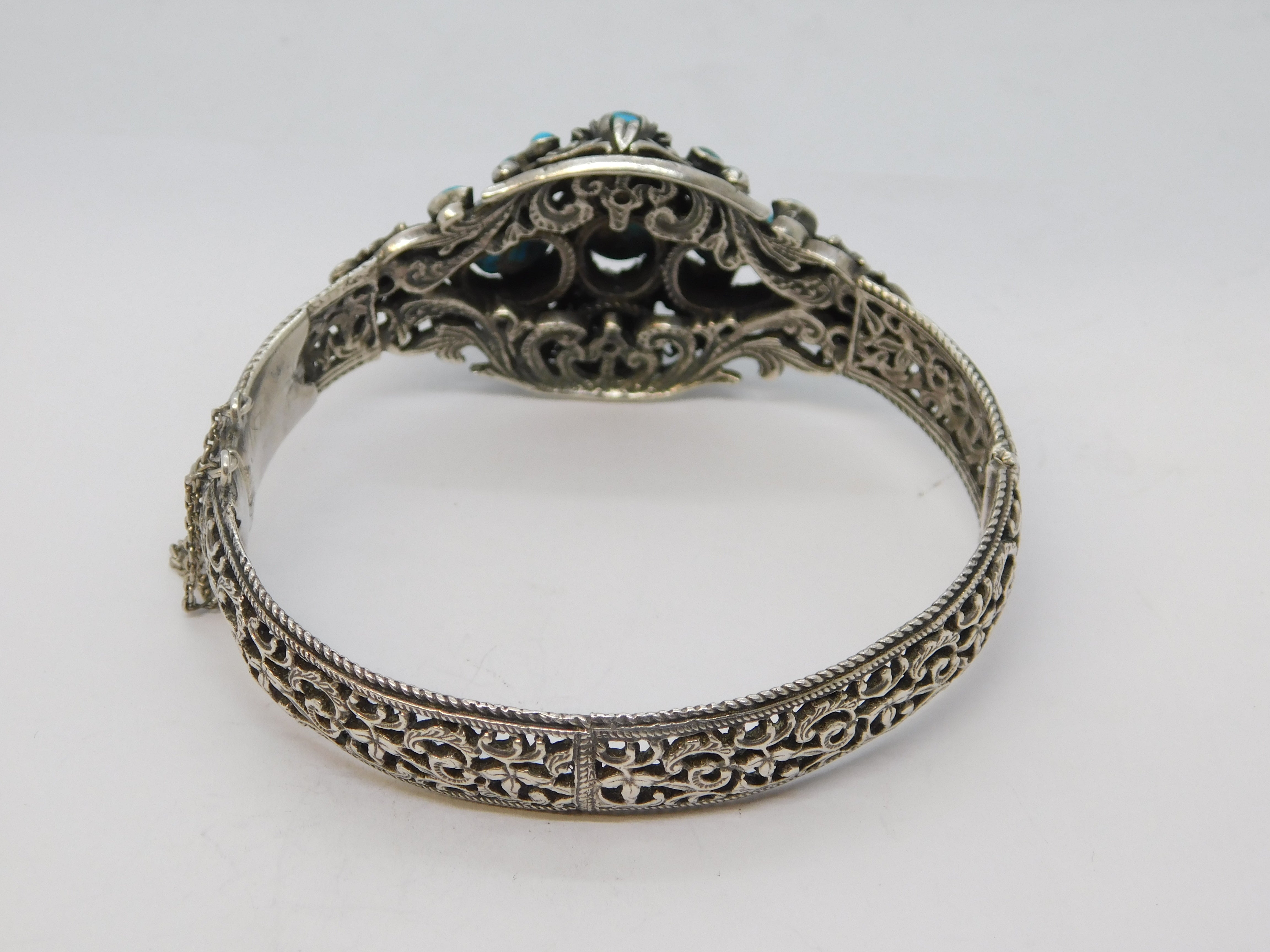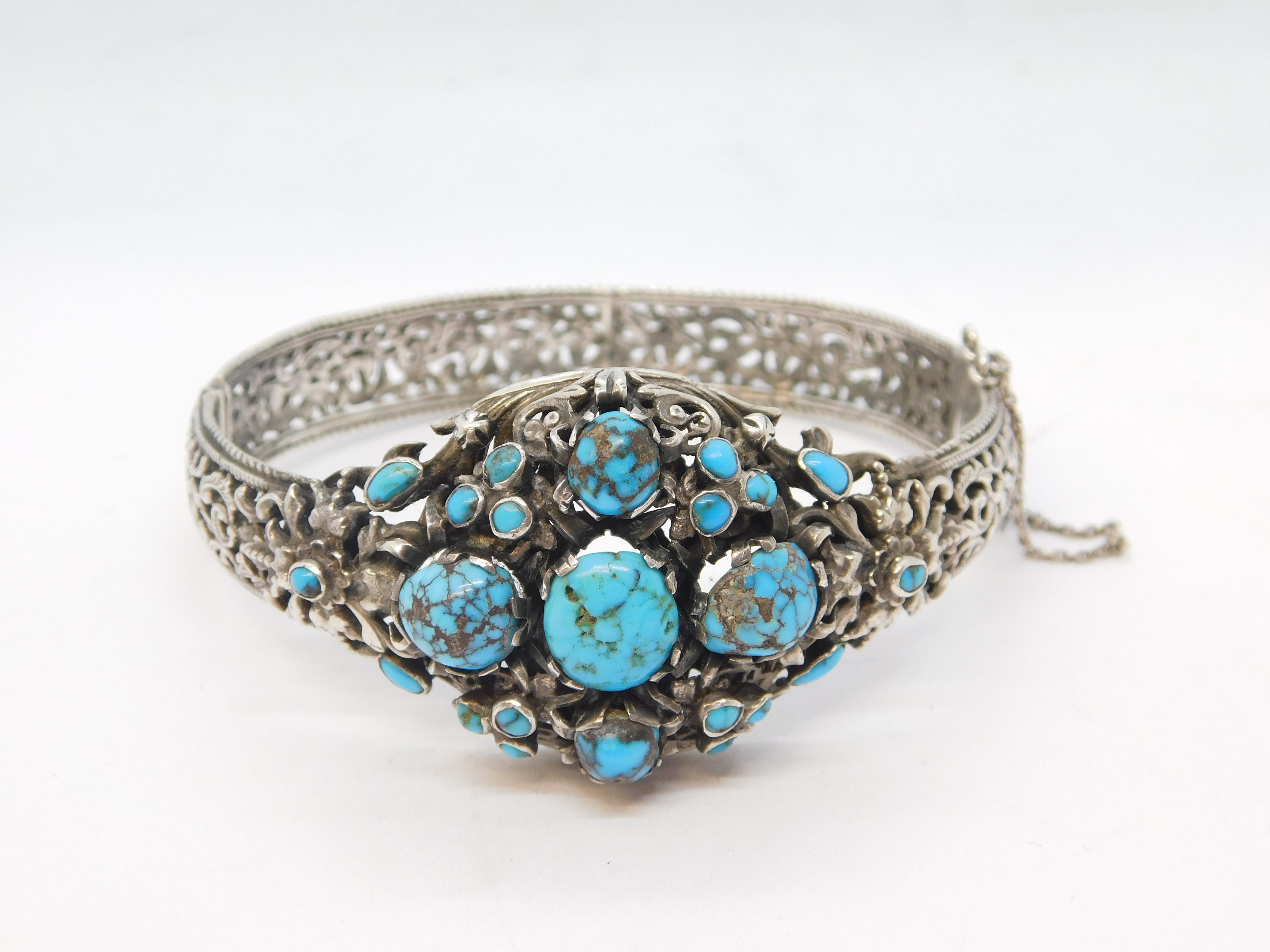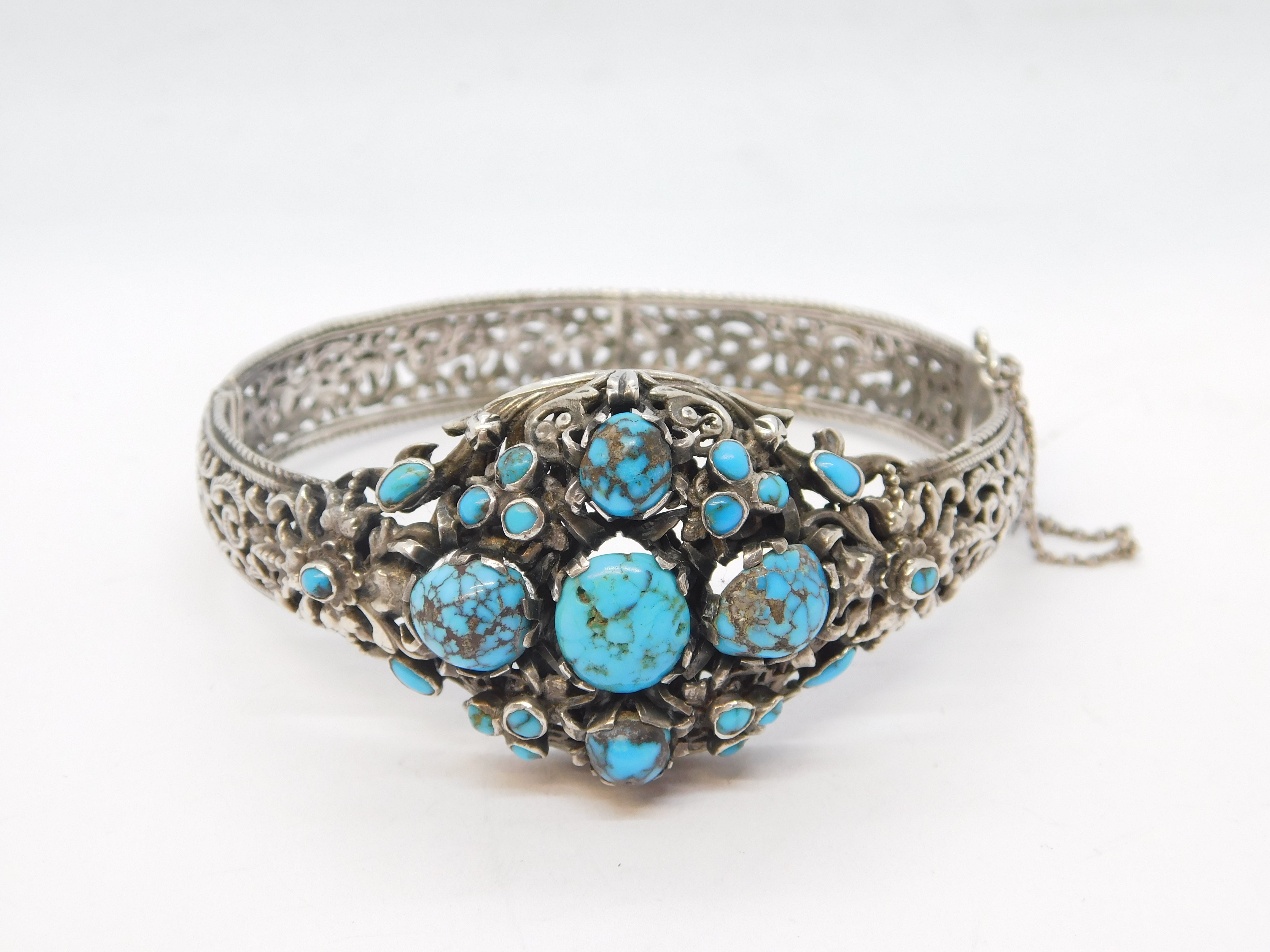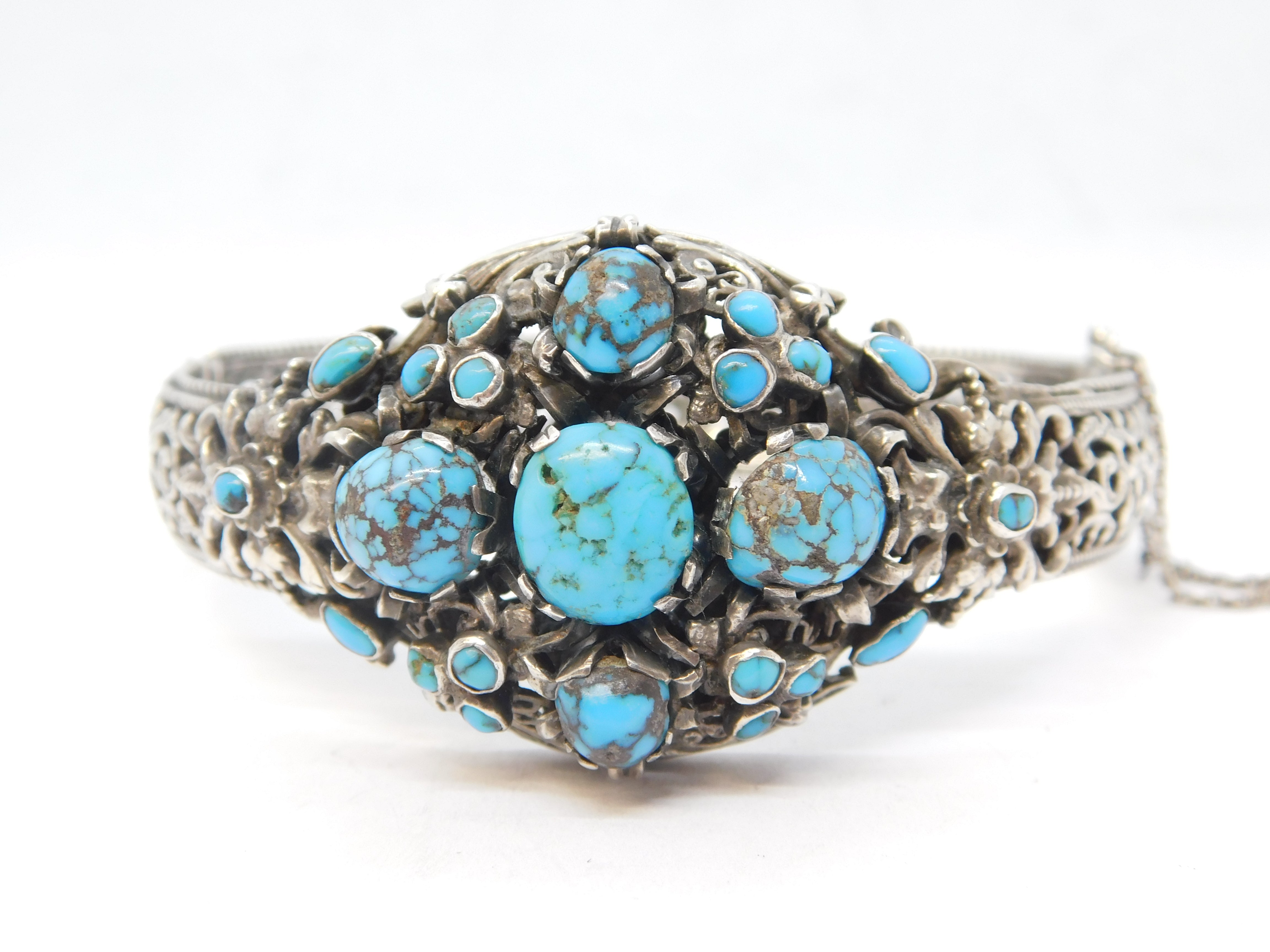 Details: A fantastic and wonderfully designed antique 19th century austo-hungarian 800 grade silver floral bangle bracelet set with wonderful turquoise stones throughout hallmarked to the clasp and XRF tested 1880. This is a wonderful item that would make a perfect gift or addition to any collection. We are more than happy to provide XRF reports for items upon request.