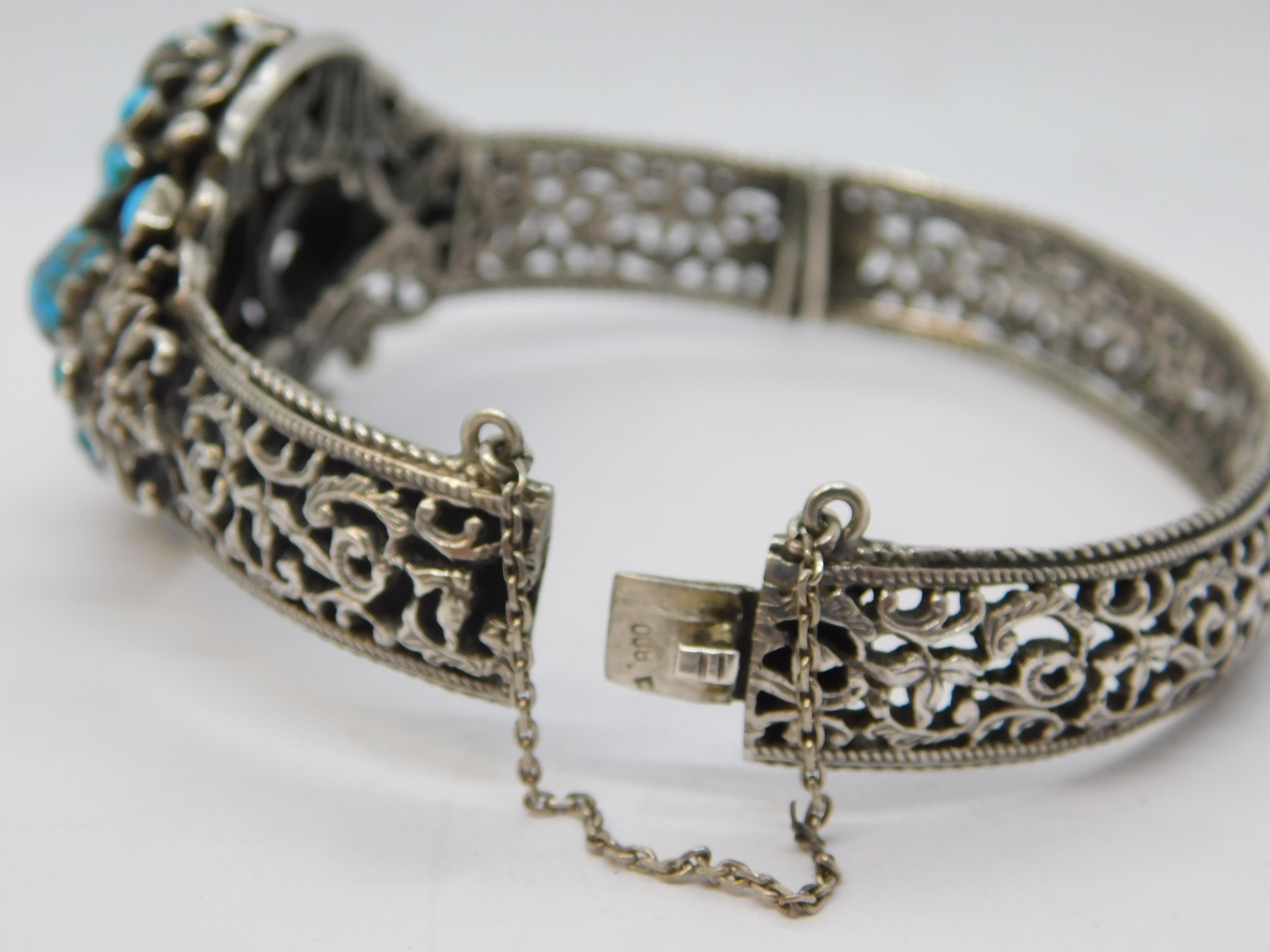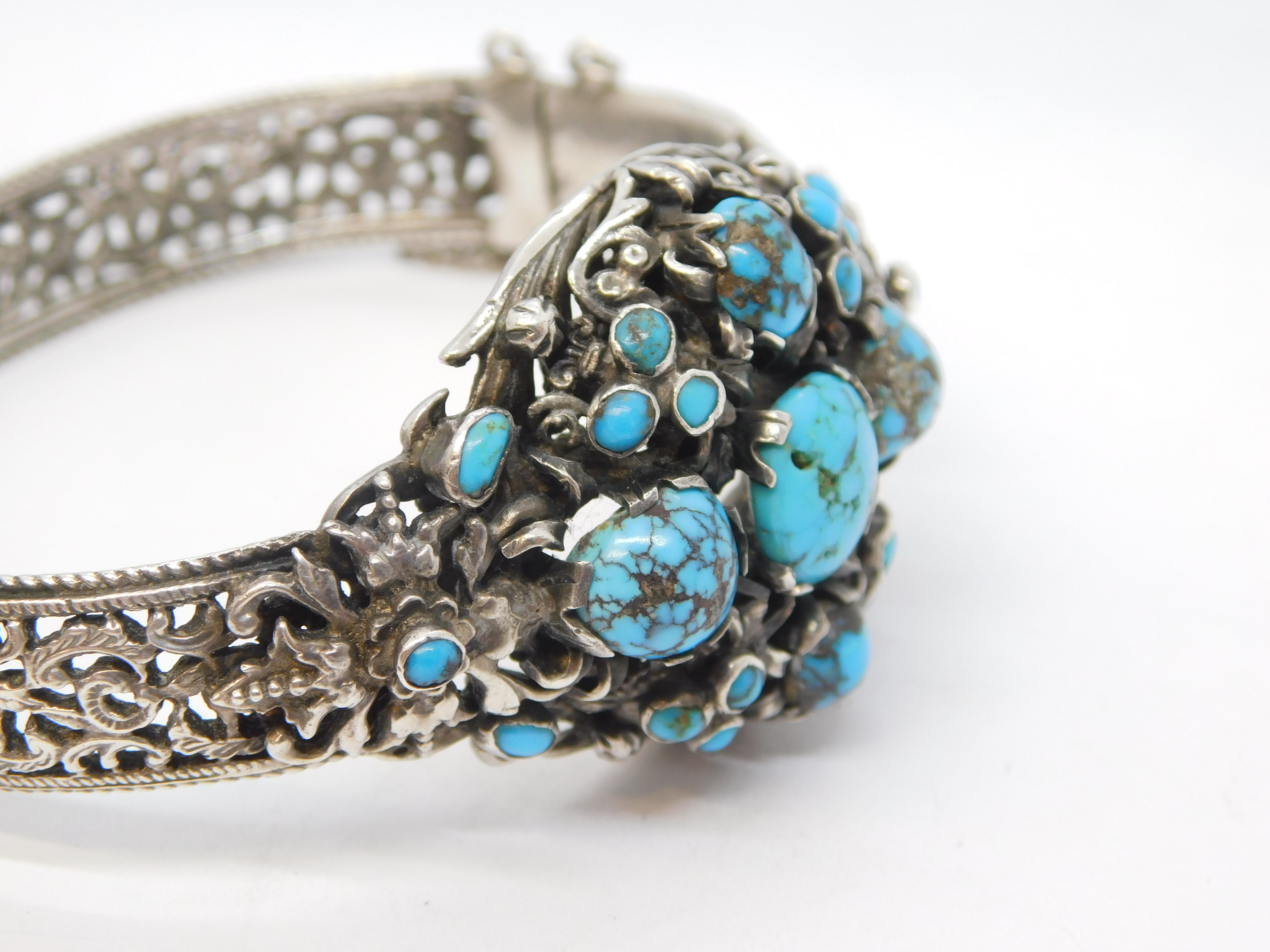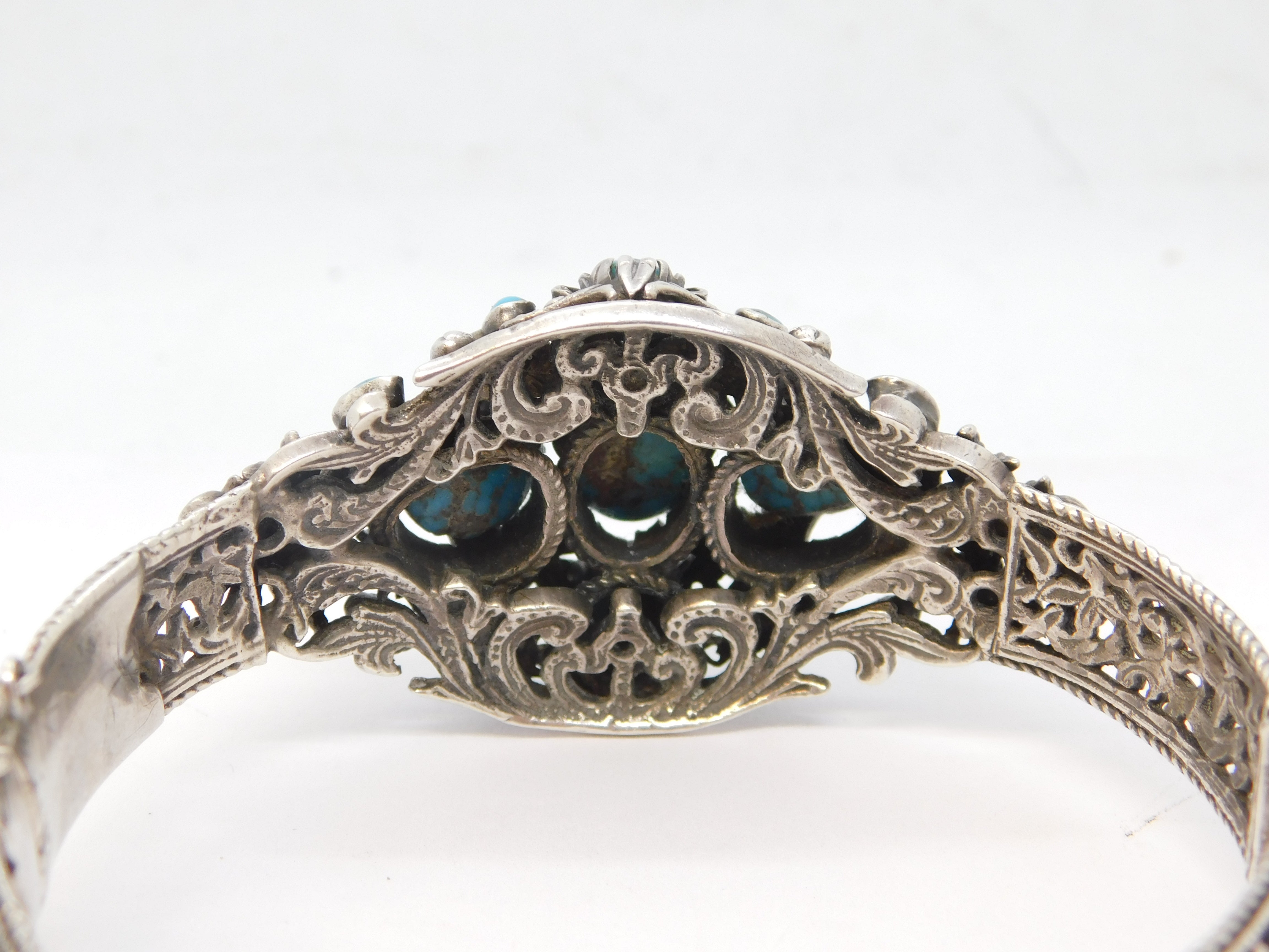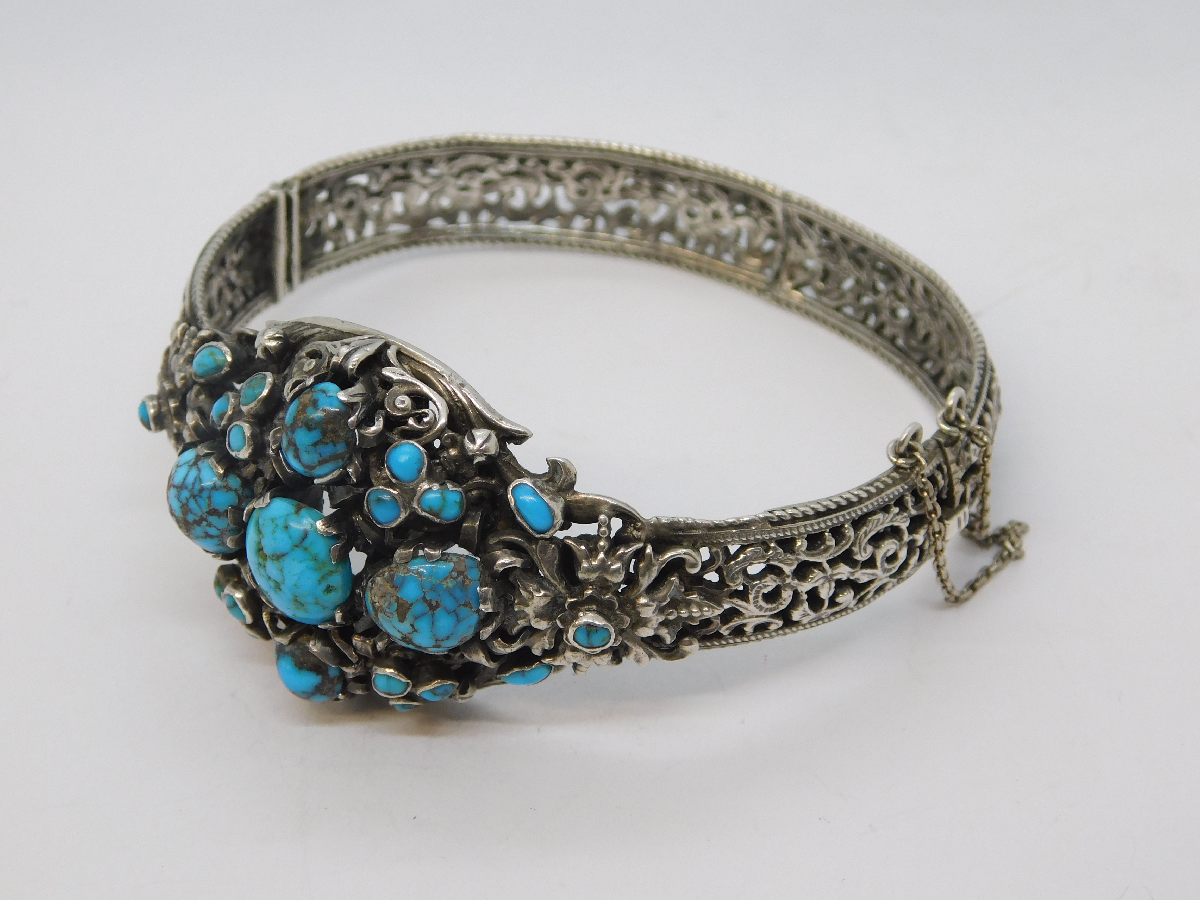 Details: A fantastic and wonderfully designed antique 19th century austo-hungarian 800 grade silver floral bangle bracelet set with wonderful turquoise stones throughout hallmarked to the clasp and XRF tested 1880. This is a wonderful item that would make a perfect gift or addition to any collection. We are more than happy to provide XRF reports for items upon request.
