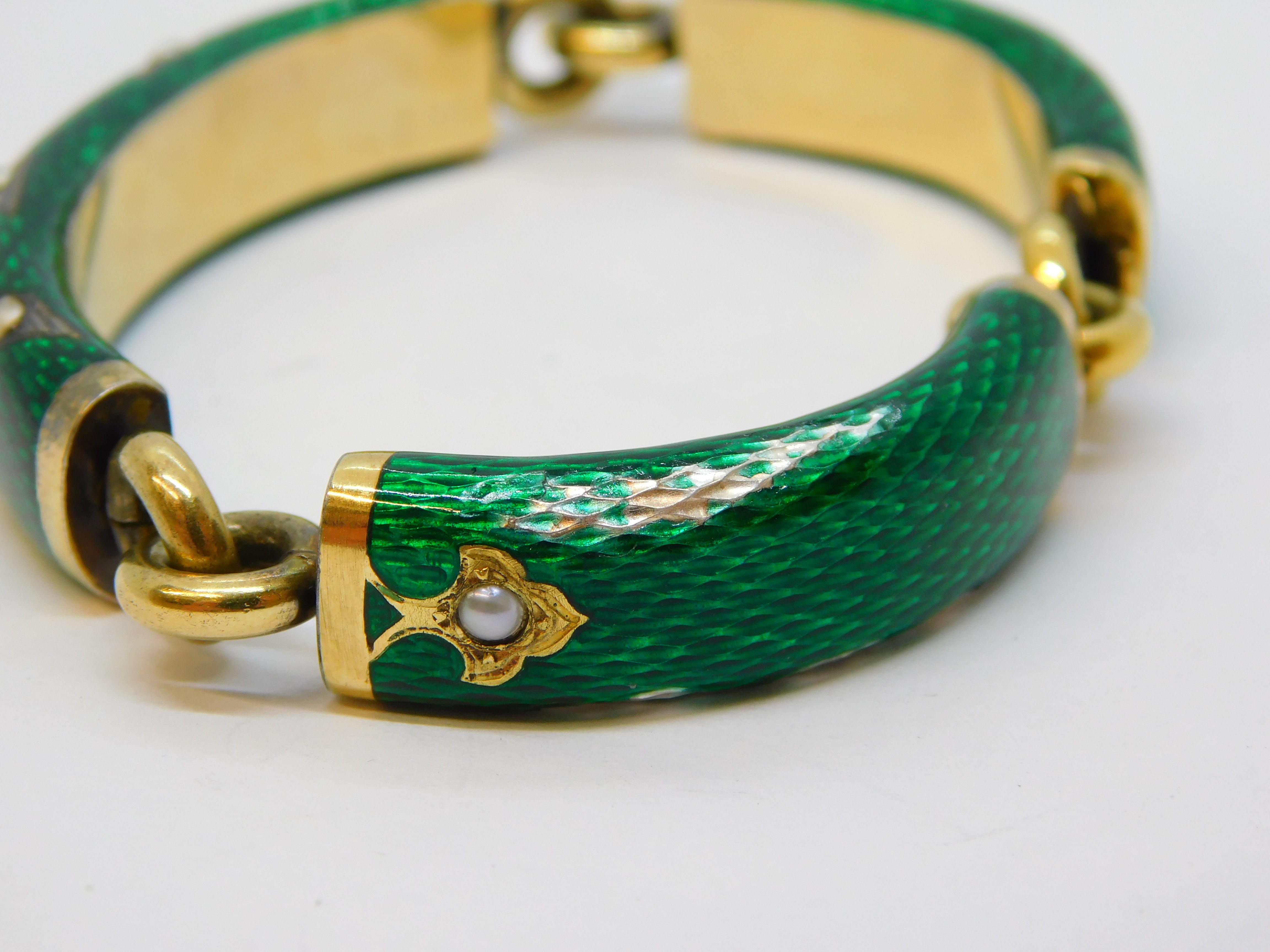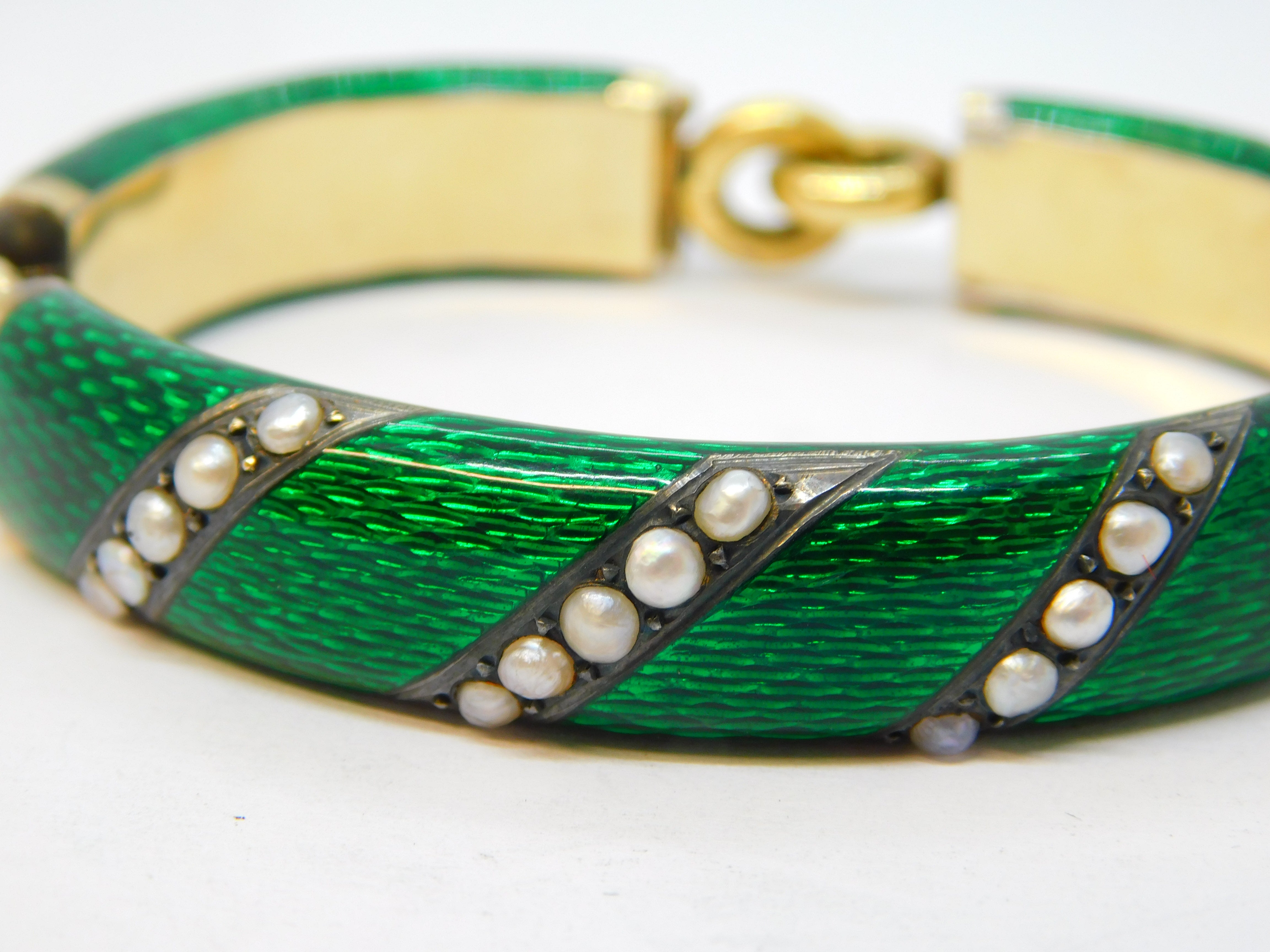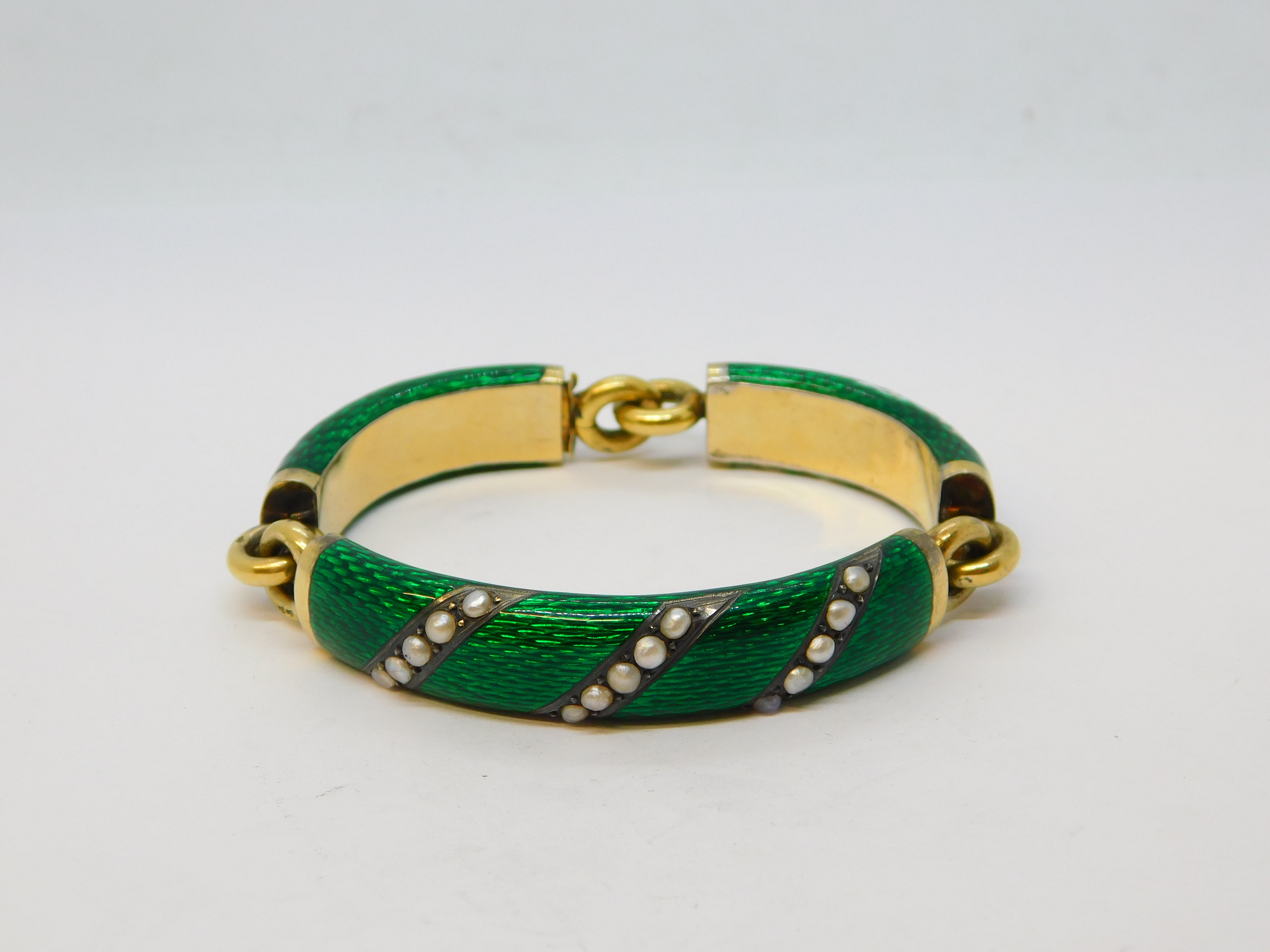 Details: A fantastic and wonderfully designed antique 19th century belle epoque French 18ct yellow gold linked bracelet set with sterling silver gilt panels adorned with stunning green guilloche enamel, freshwater pearls to the front and the side edges in superb period style, hallmarked to the bale and each link with French eagle head marks for 18ct purity, the bracelet has been XRF tested c1880. A gorgeous bracelet resonating style and class. This is a wonderful item that would make a perfect gift or addition to any collection.
