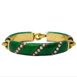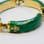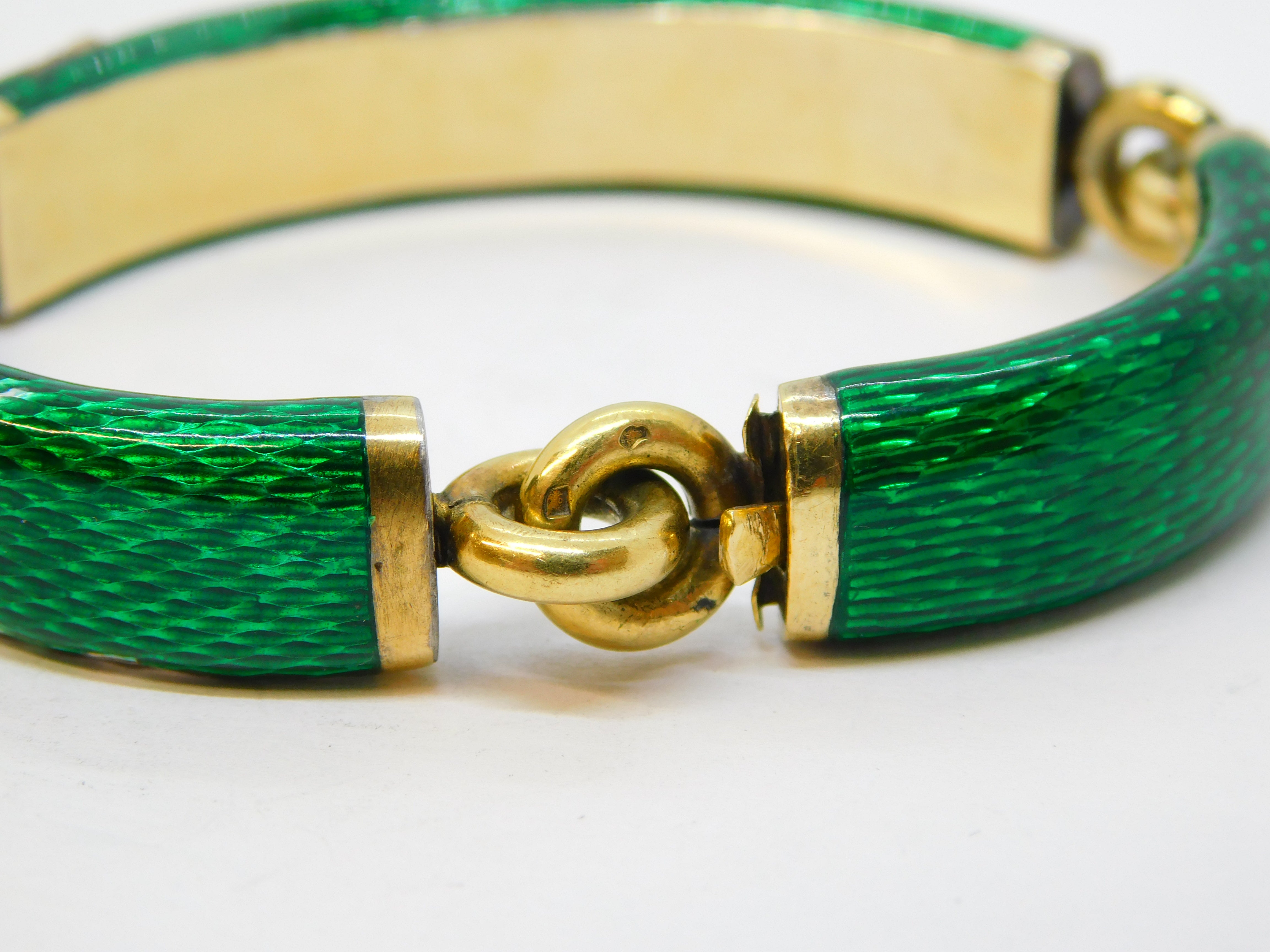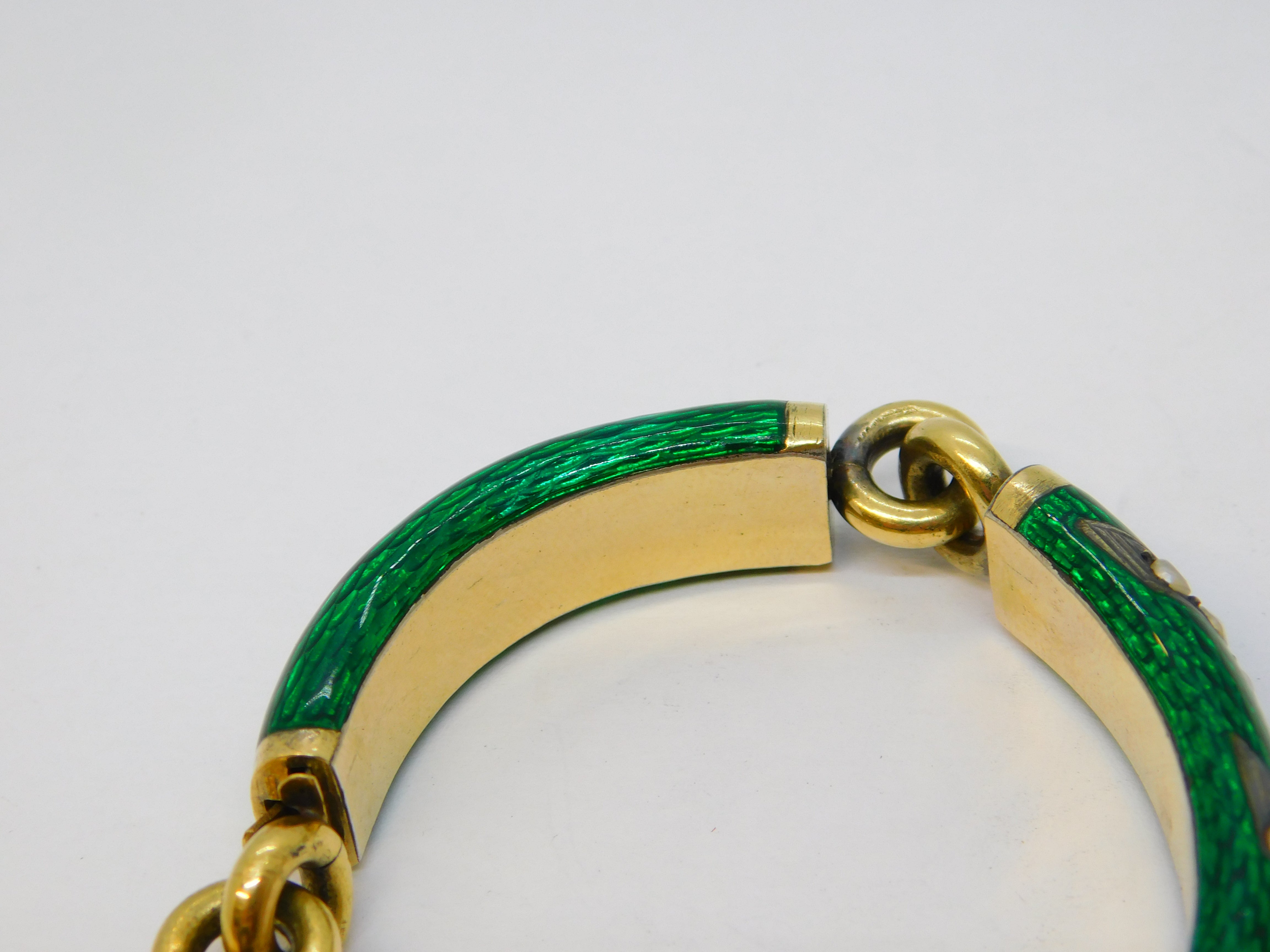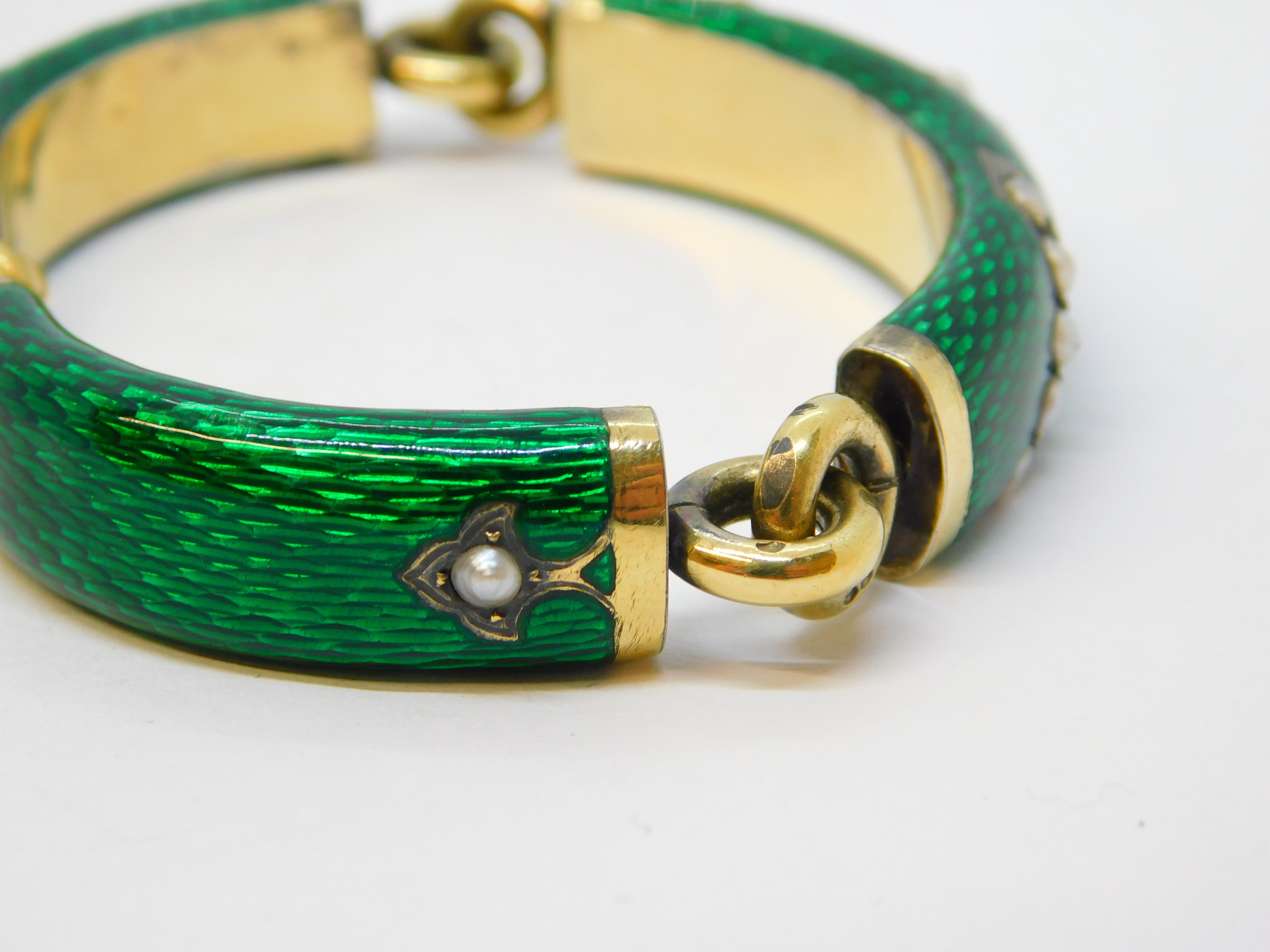 Details: A fantastic and wonderfully designed antique 19th century belle epoque French 18ct yellow gold linked bracelet set with sterling silver gilt panels adorned with stunning green guilloche enamel, freshwater pearls to the front and the side edges in superb period style, hallmarked to the bale and each link with French eagle head marks for 18ct purity, the bracelet has been XRF tested c1880. A gorgeous bracelet resonating style and class. This is a wonderful item that would make a perfect gift or addition to any collection.