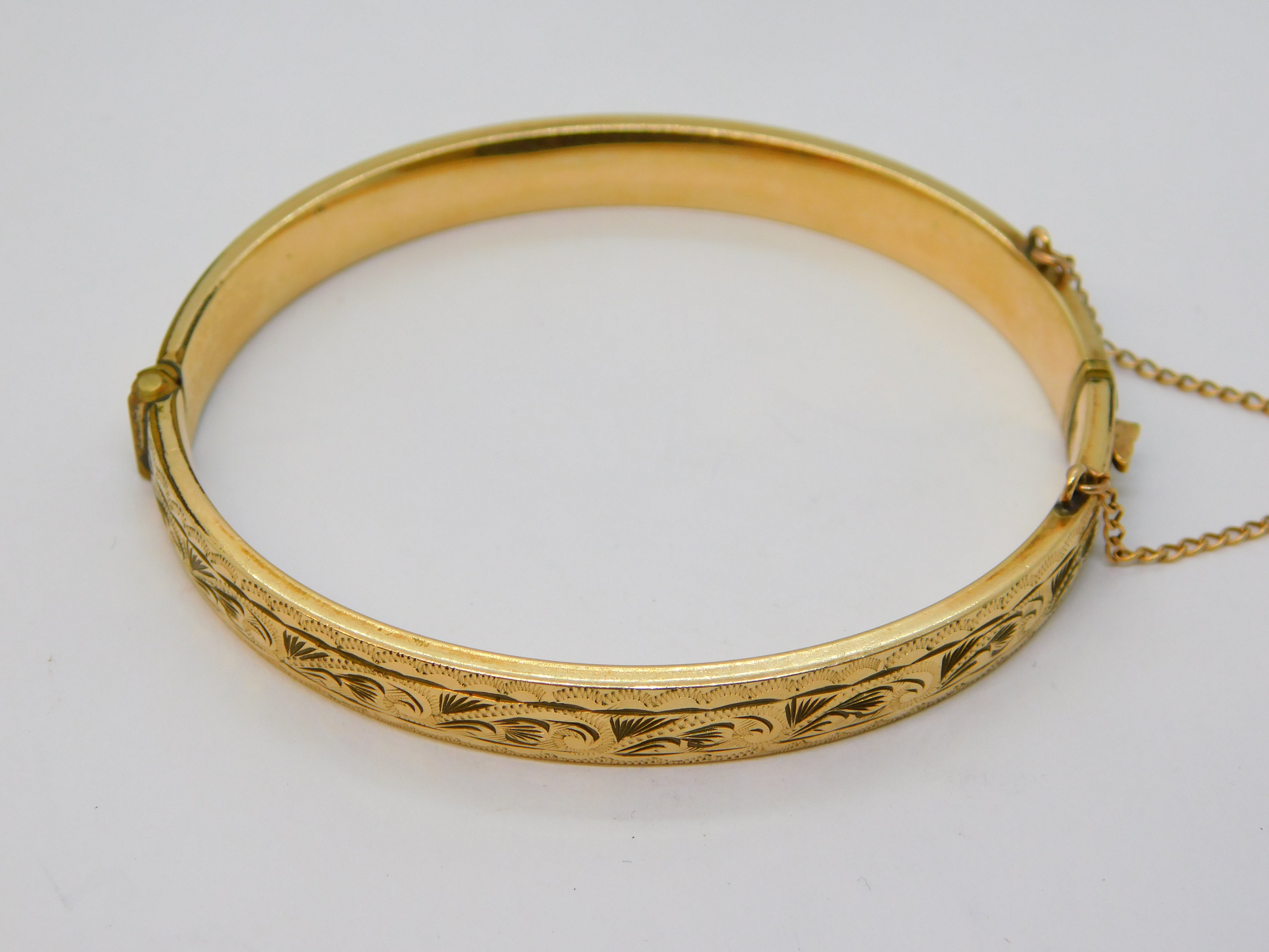 Details: A fantastic and wonderfully designed antique art deco 9ct yellow gold on metal core floral bangle bracelet with lovely detailing hallmarked '9ct on metal core' c1930 - please note this is not solid gold but gold case on metal. This is a wonderful item that would make a perfect gift or addition to any collection. We are more than happy to provide XRF reports for items upon request.