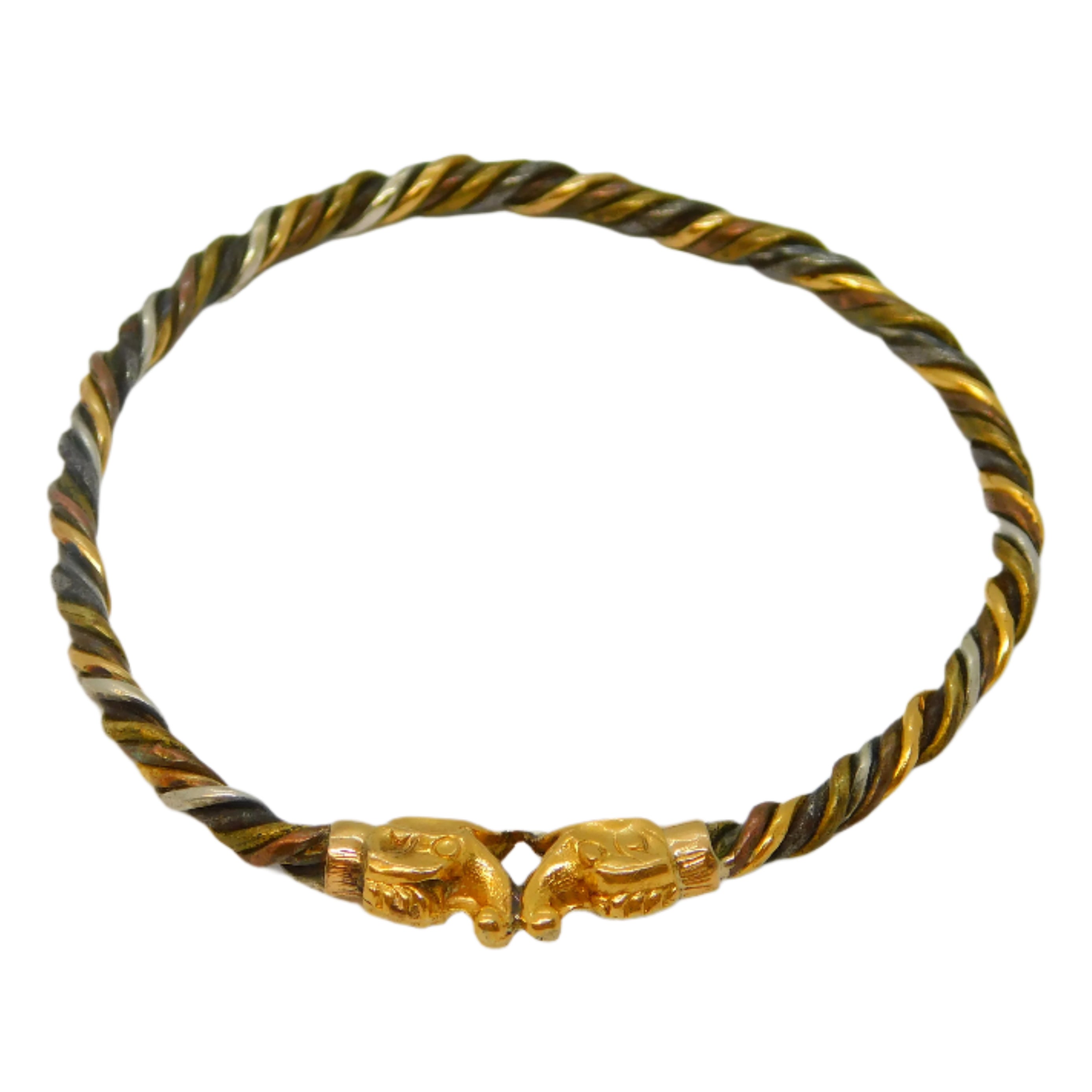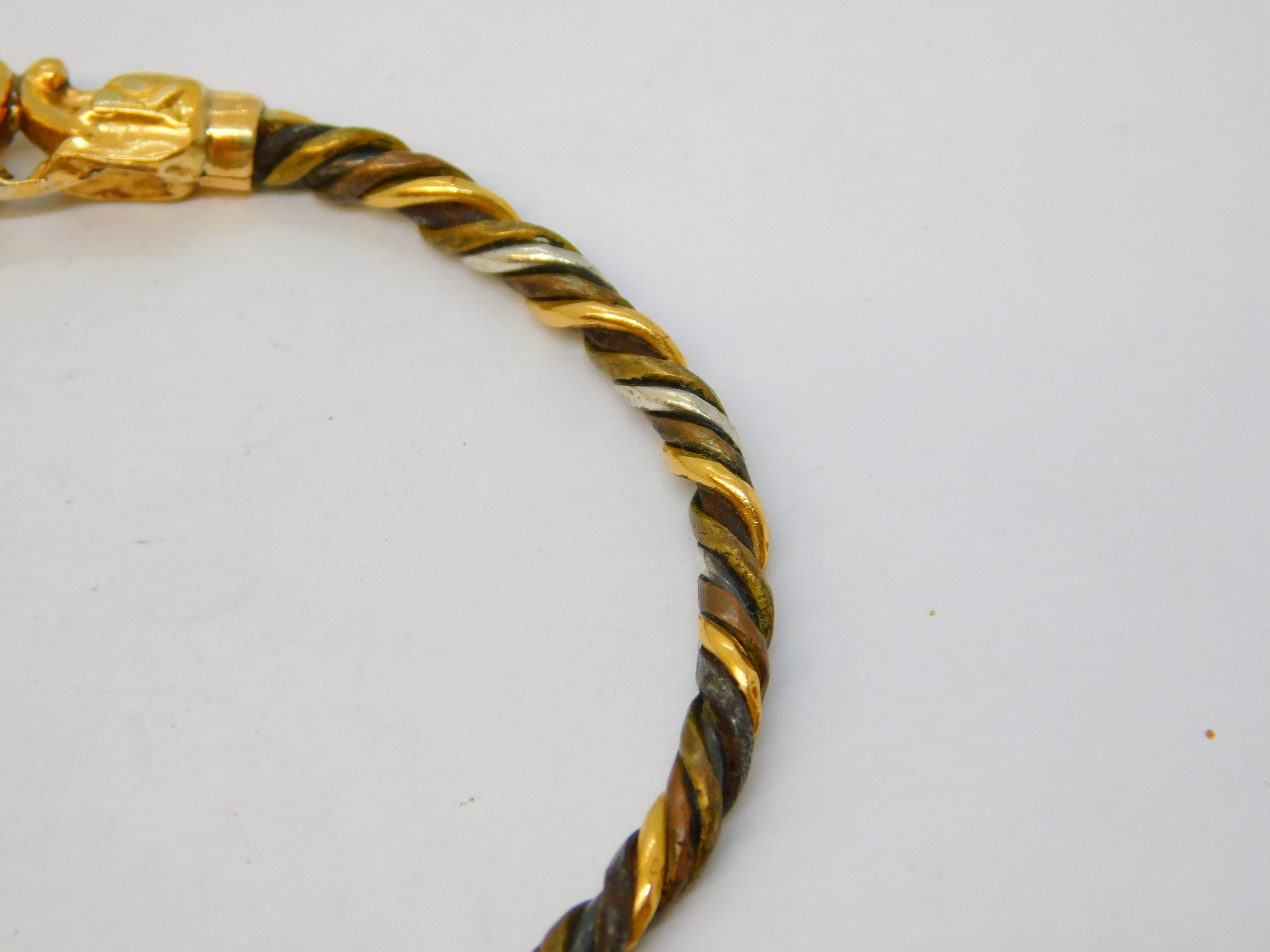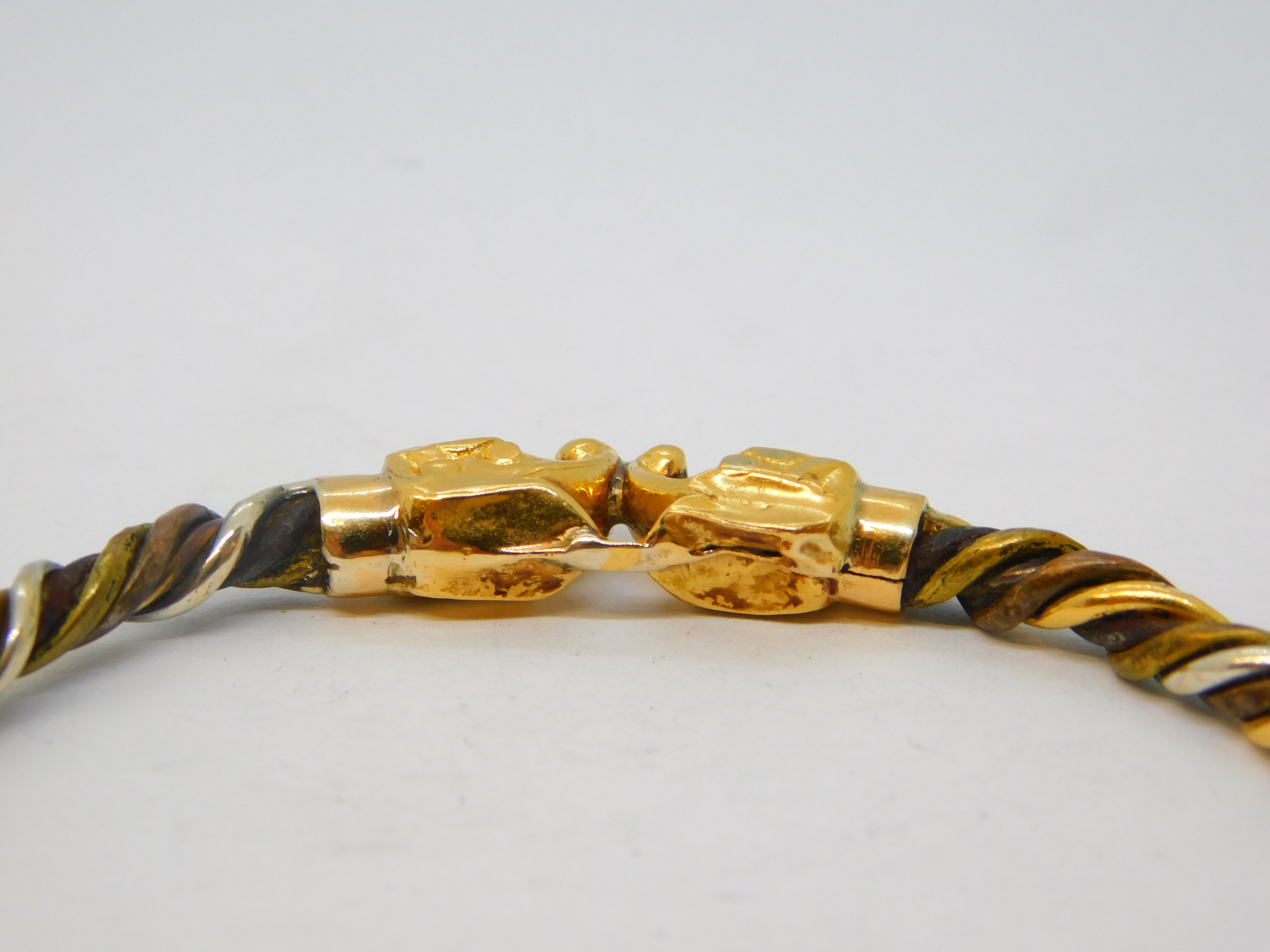 Details: A fantastic and wonderfully designed antique possibly ancient byzantine mixed metal bangle with 18ct yellow gold clasp in the form of mythical beasts, the metal testing as 18ct gold, copper and silver. This is a wonderful item that would make a perfect gift or addition to any collection.