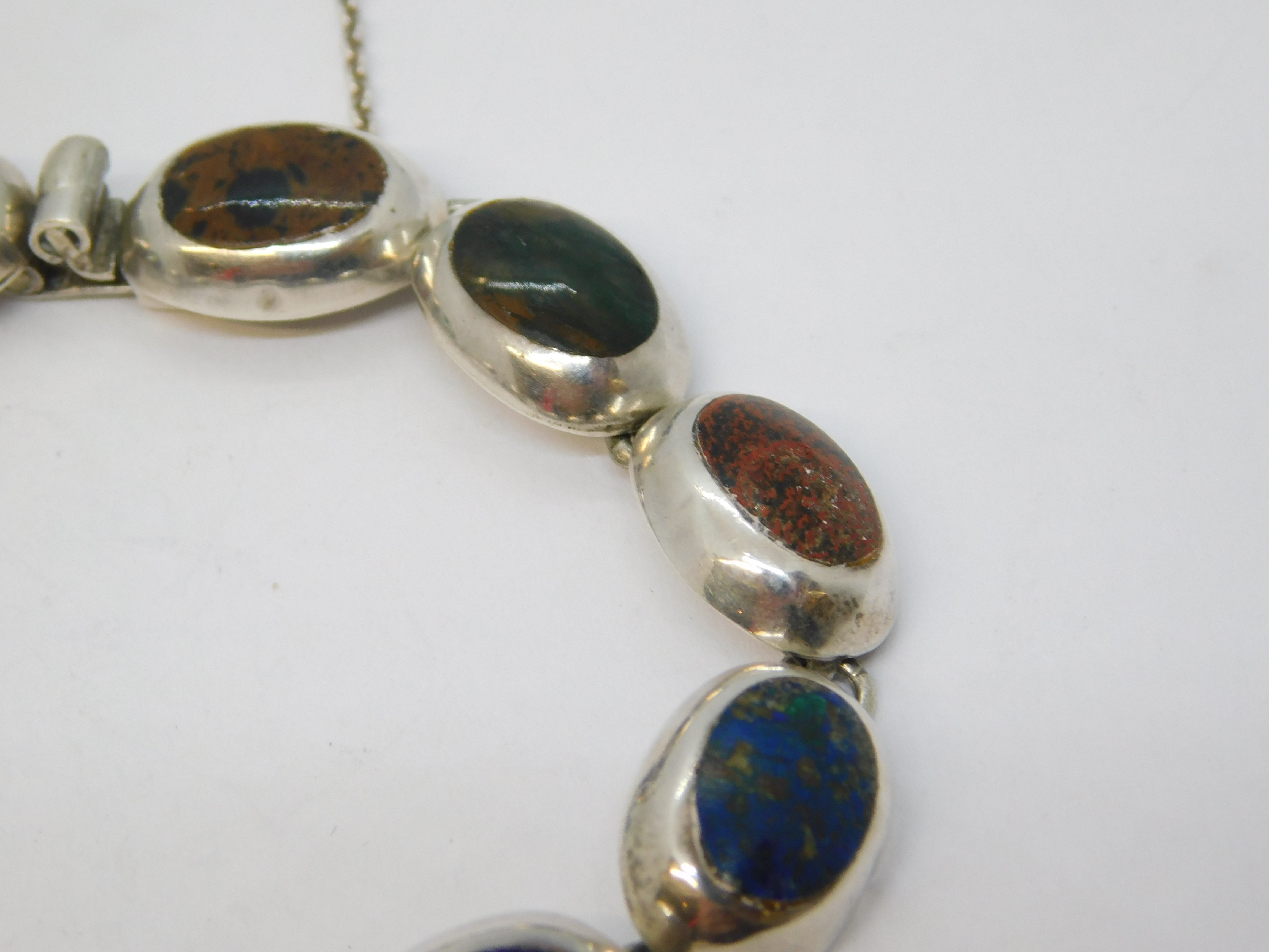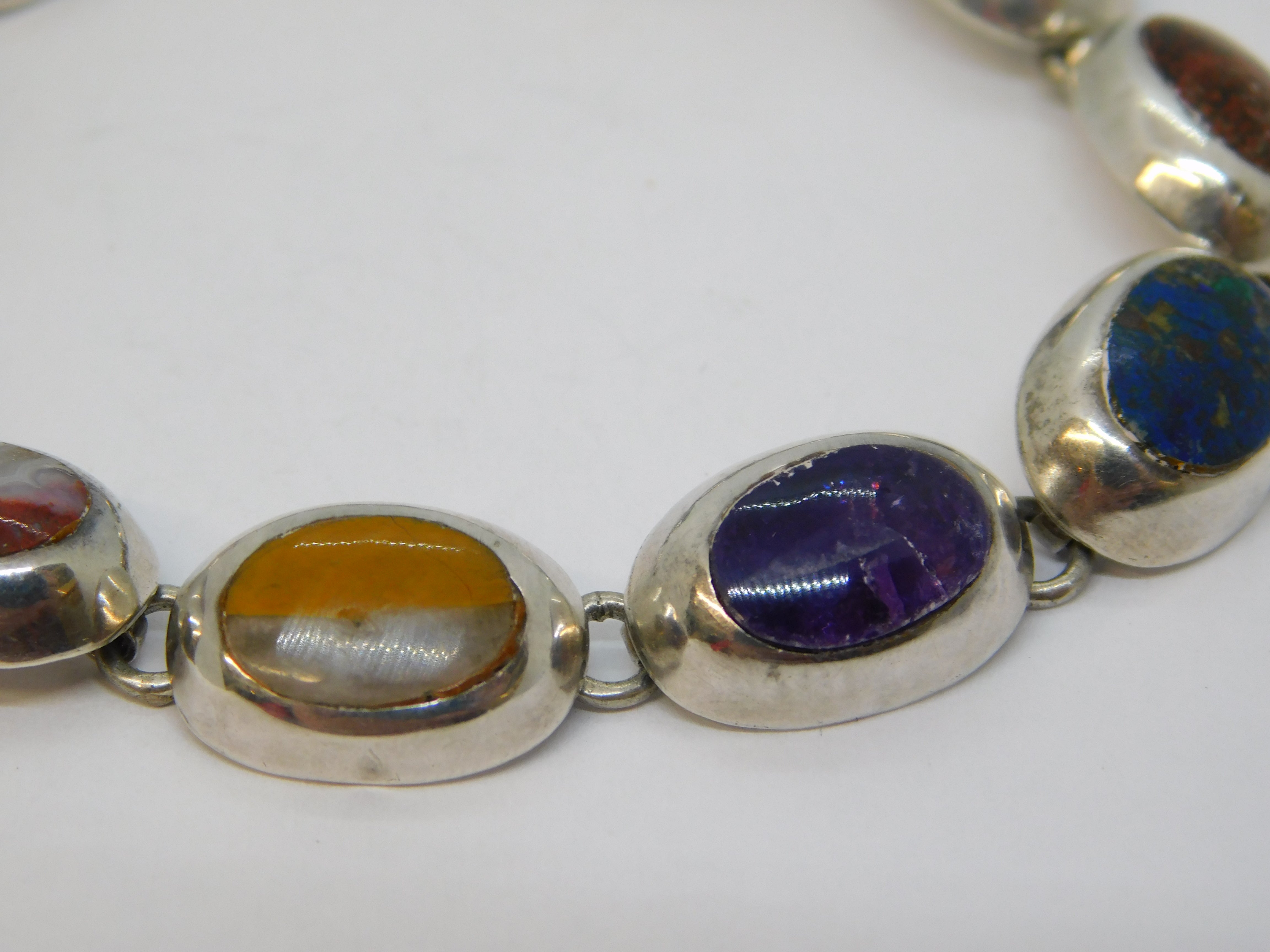 Details: A fantastic and wonderfully designed vintage Mexican sterling silver panel bracelet set with multiple stones to include opal, agate, amethyst and more, fully hallmarked to the reverse c1970. This is a wonderful item that would make a perfect gift or addition to any collection. We are more than happy to provide XRF reports for items upon request.