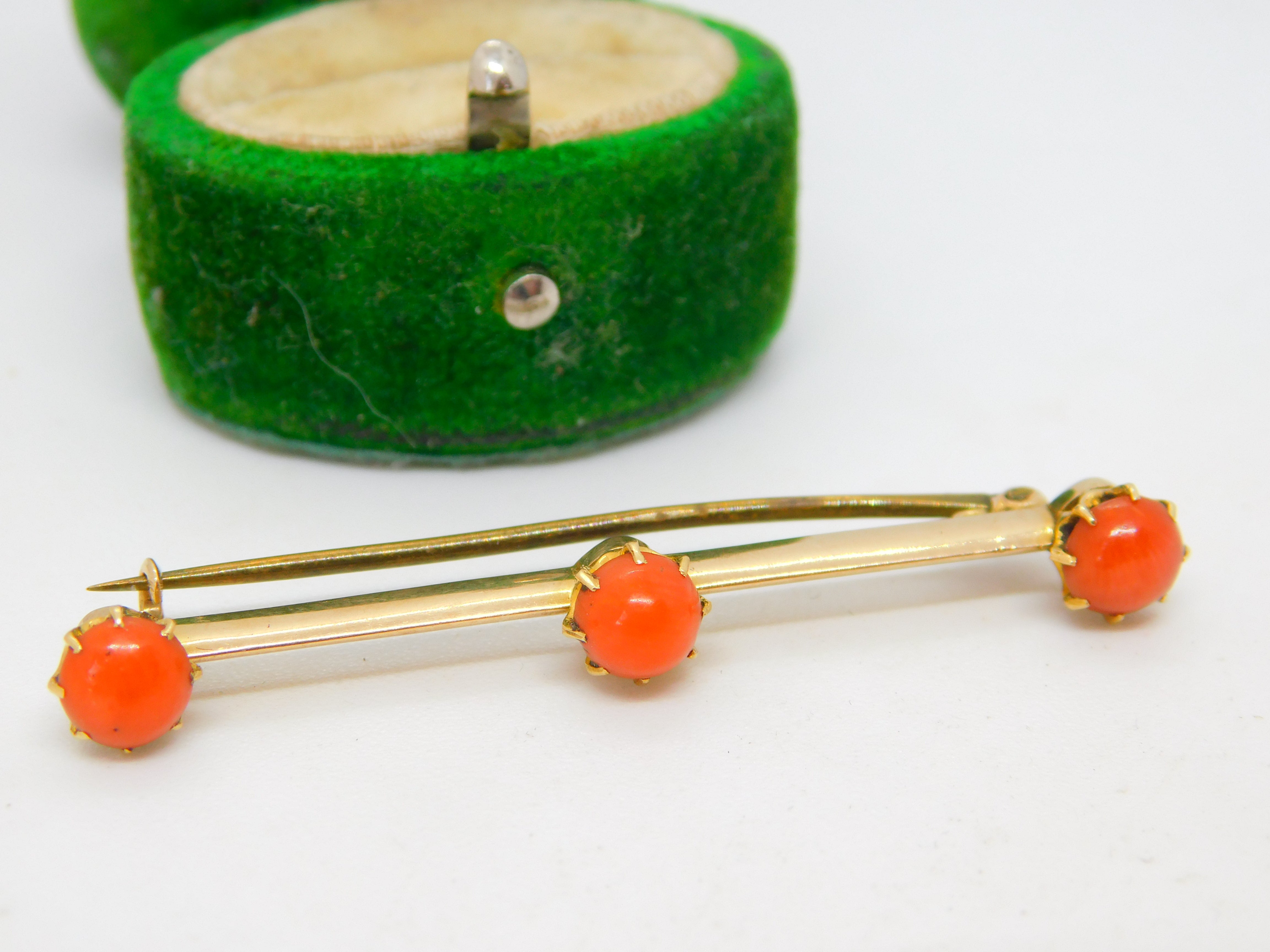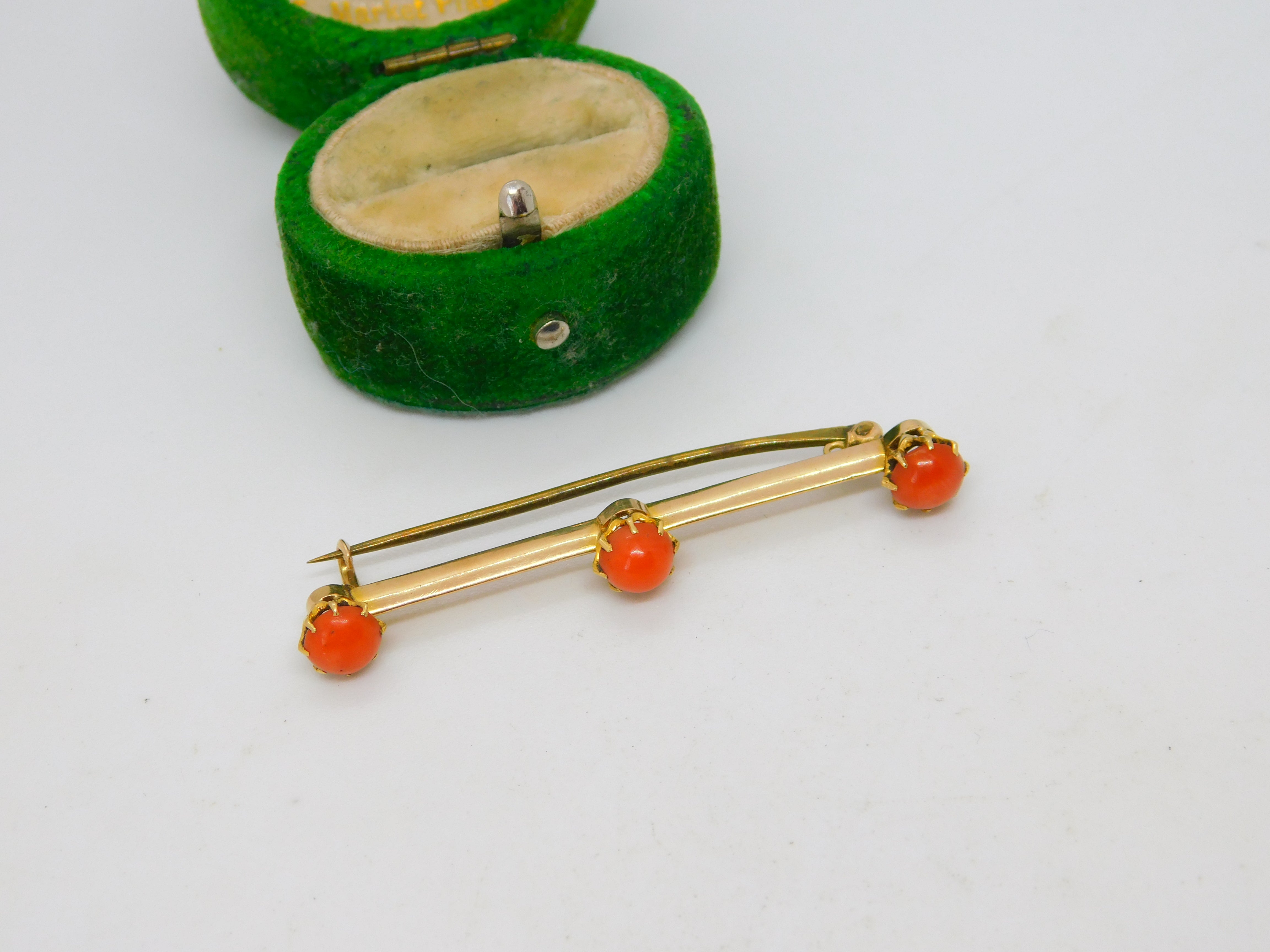 Details: A fantastic and wonderfully designed antique 19th century 15ct yellow gold bar brooch set with cabochon coral stones marked to the reverse with 'ii33' mark and XRF tested c1880. This is a wonderful item that would make a perfect gift or addition to any collection. The BOX pictured is for PRESENTATION ONLY and is NOT included in the listings but used to frame the pictures unless specifically stated otherwise.