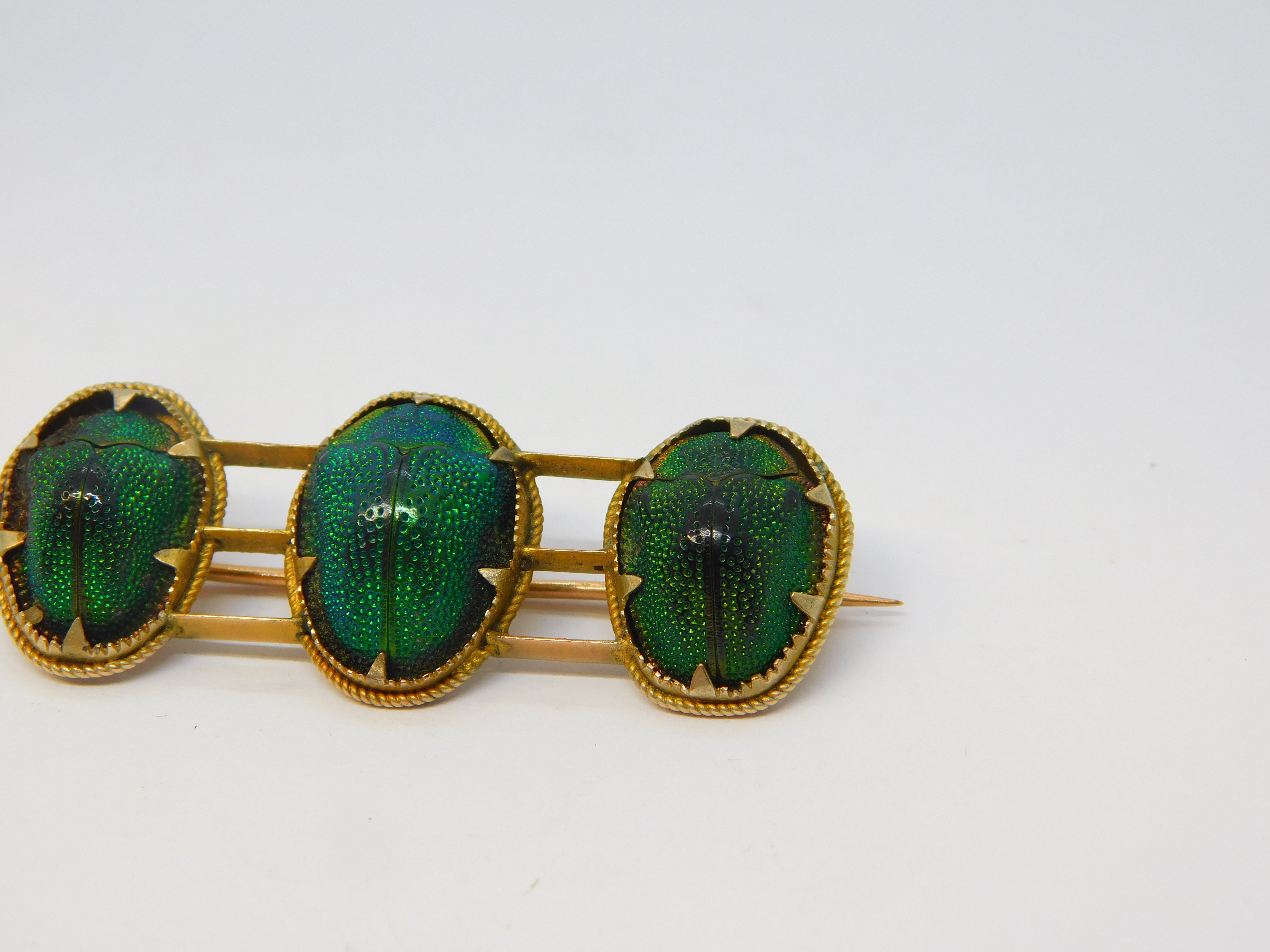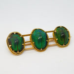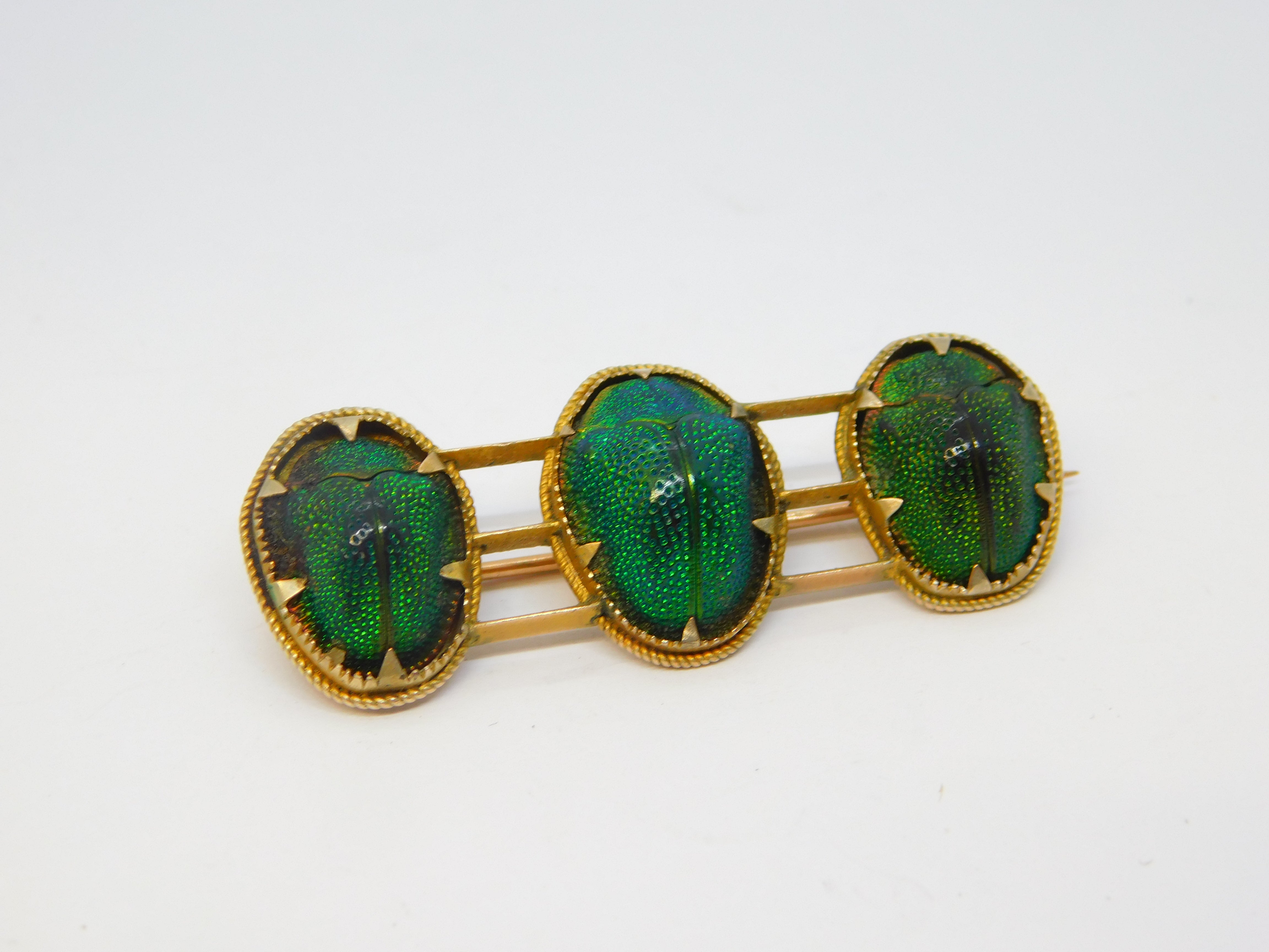 Details: A fantastic and wonderfully designed antique Victorian 9ct yellow gold egyptian revival three scarab beetle set brooch pin with super detailing hallmarked to the reverse c1890. This is a wonderful item that would make a perfect gift or addition to any collection.