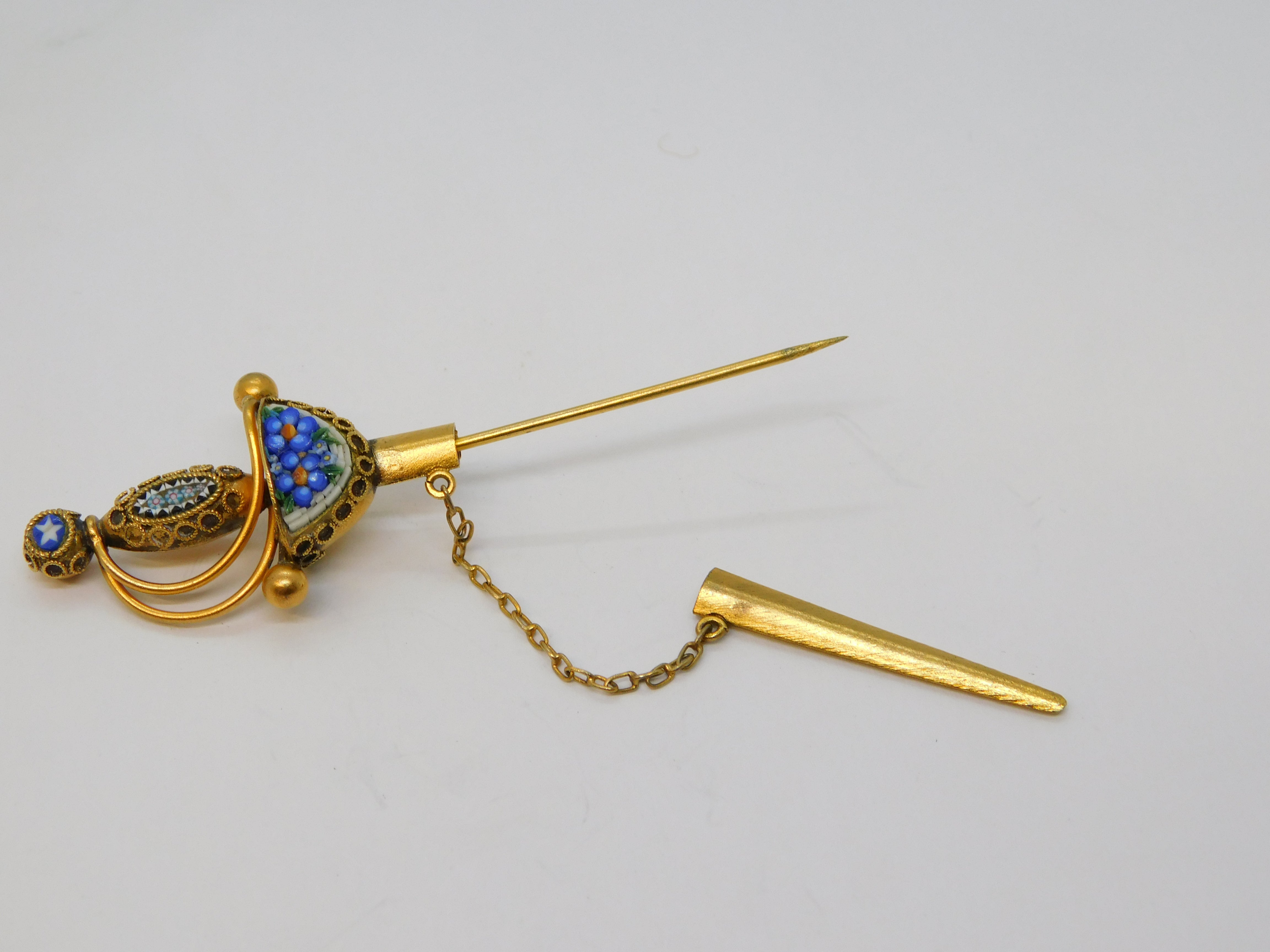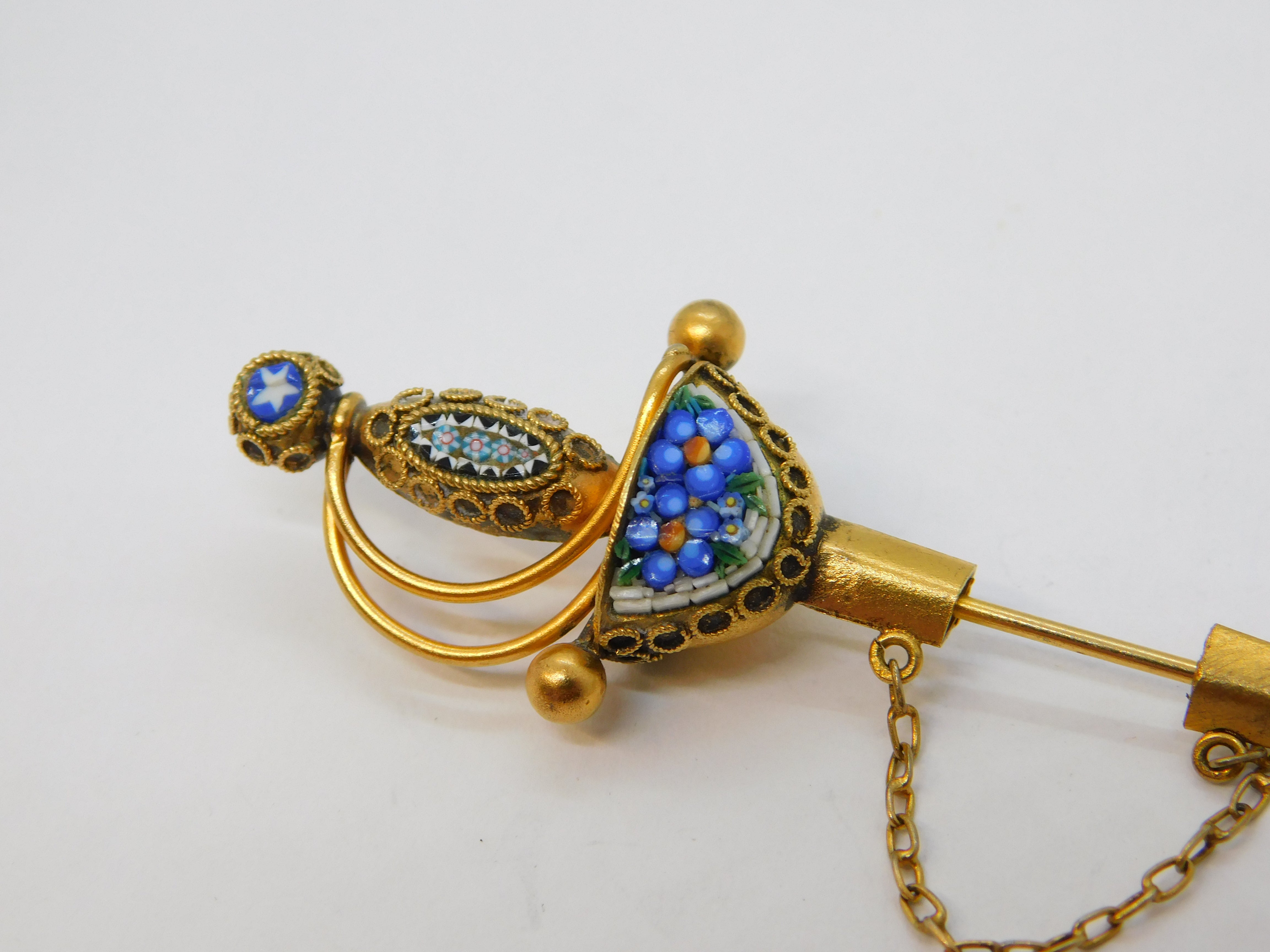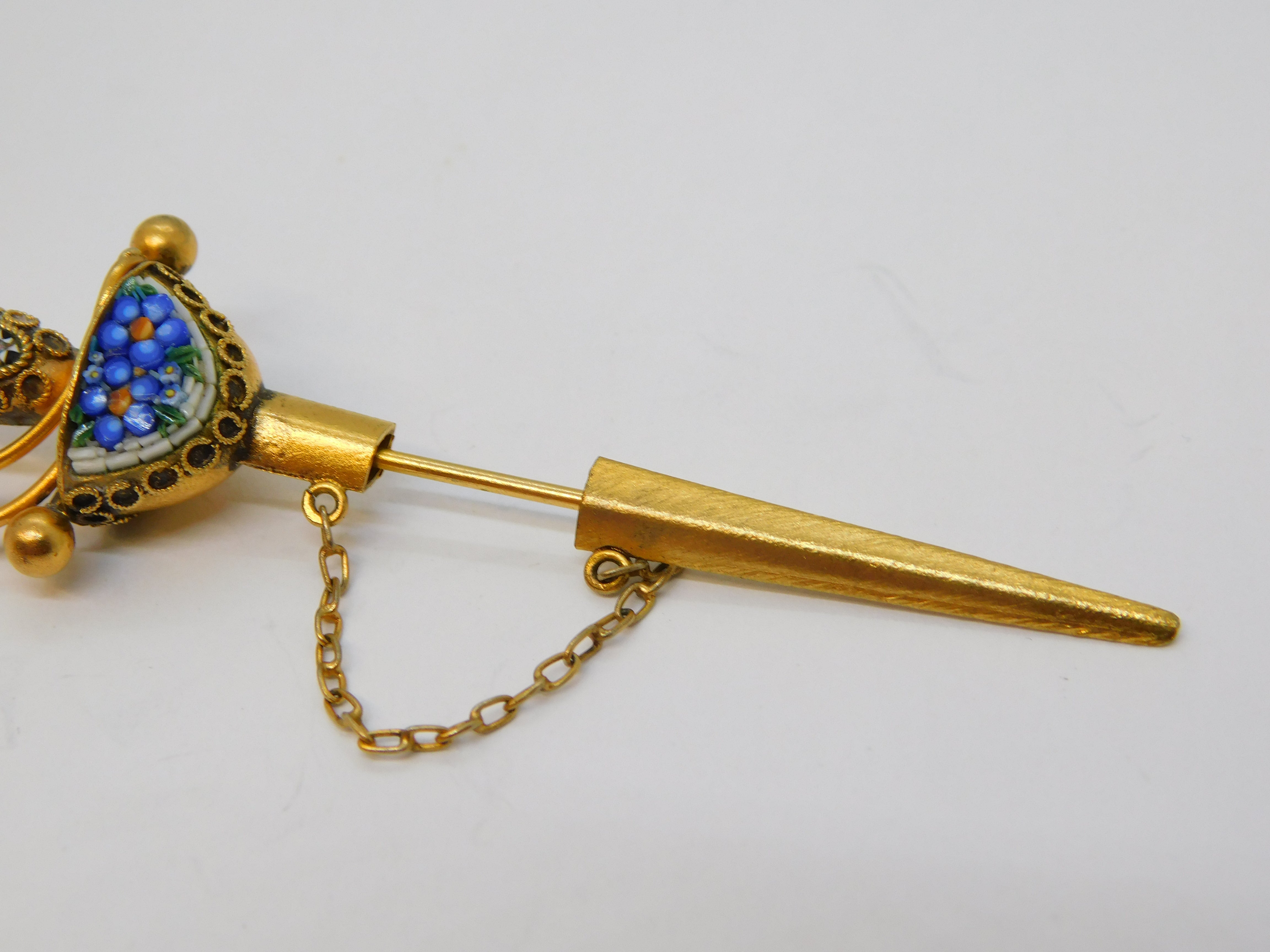 Details: A fantastic and wonderfully designed antique 19th century Italian gold plated sabre brooch pin or badge adorned with floral micro mosaic throughout c1890. This is a wonderful item that would make a perfect gift or addition to any collection. We are more than happy to provide XRF reports for items upon request.