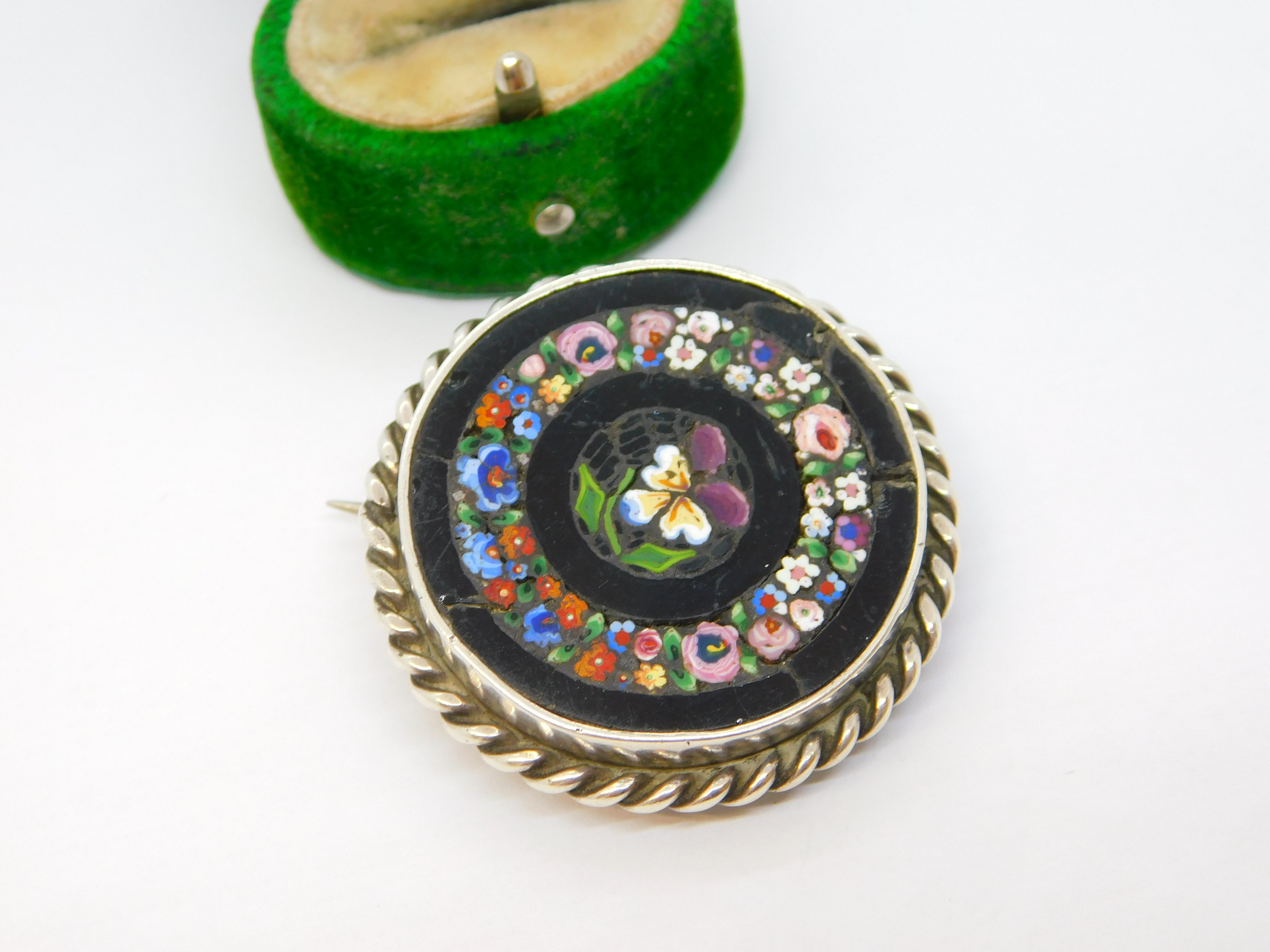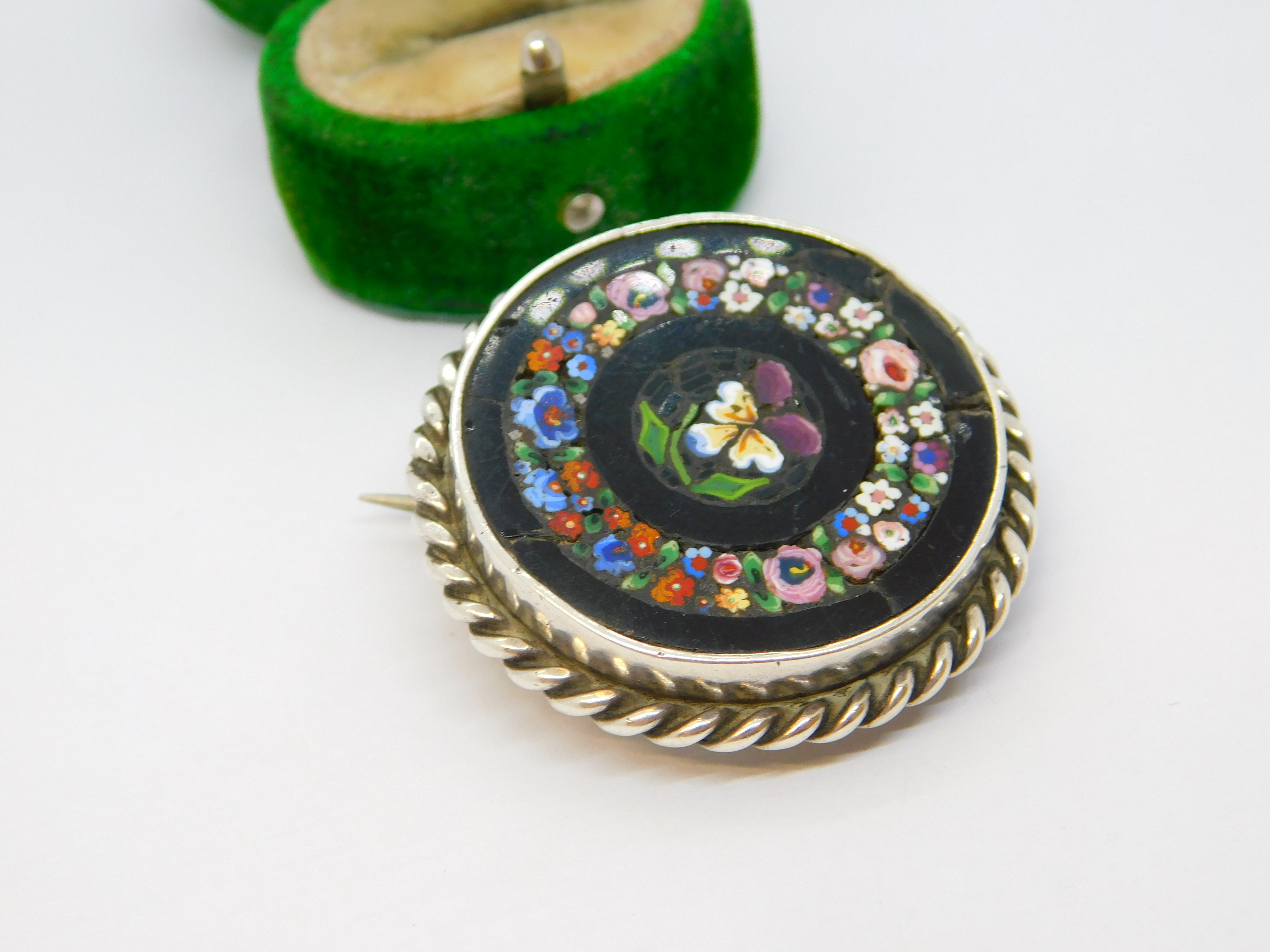 Details: A fantastic and wonderfully designed antique 19th century sterling silver mounted brooch set with colourful floral micro mosaic c1860, the silver has been XRF tested. This is a wonderful item that would make a perfect gift or addition to any collection. The BOX pictured is for PRESENTATION ONLY and is NOT included in the listings but used to frame the pictures unless specifically stated otherwise.