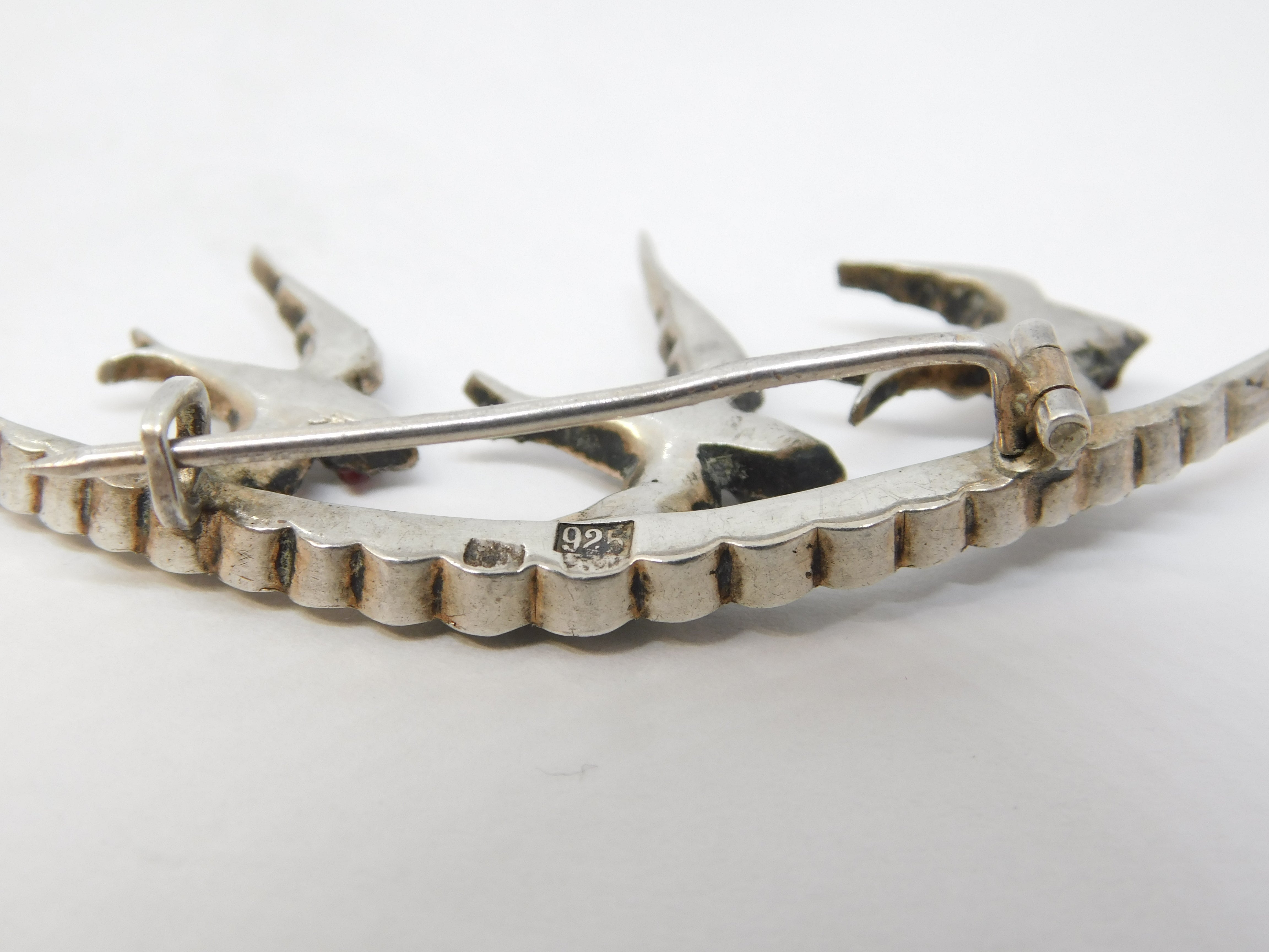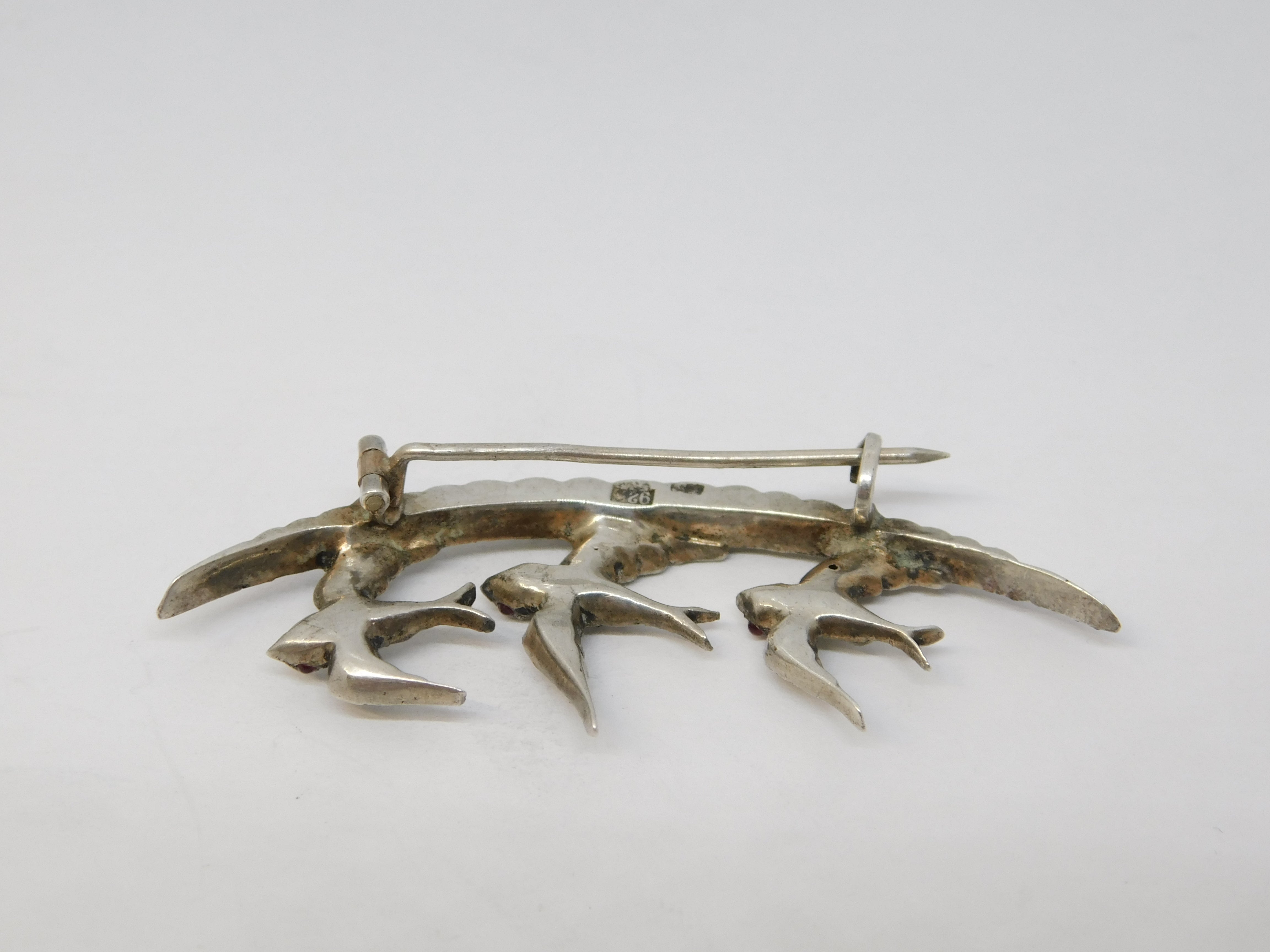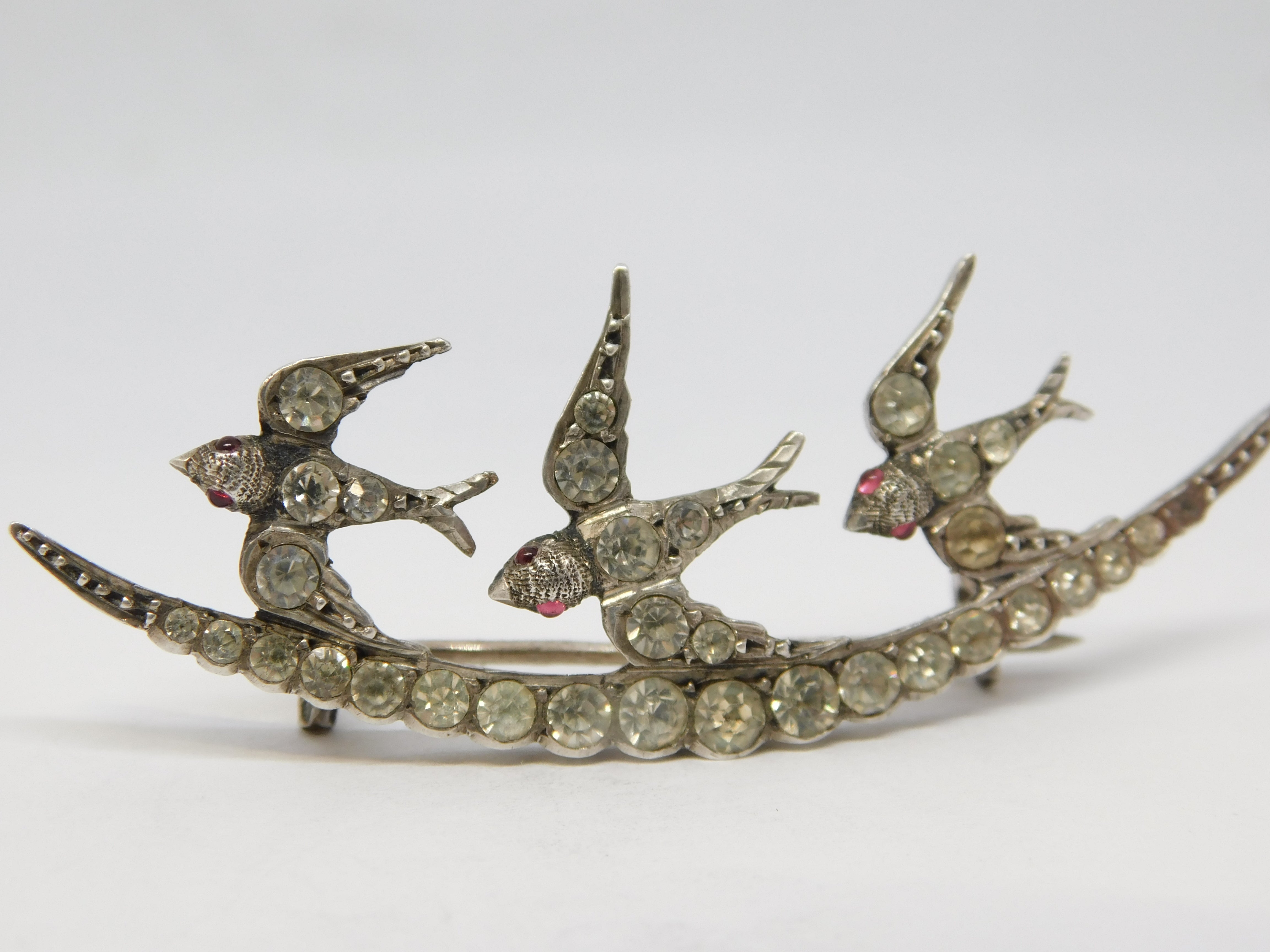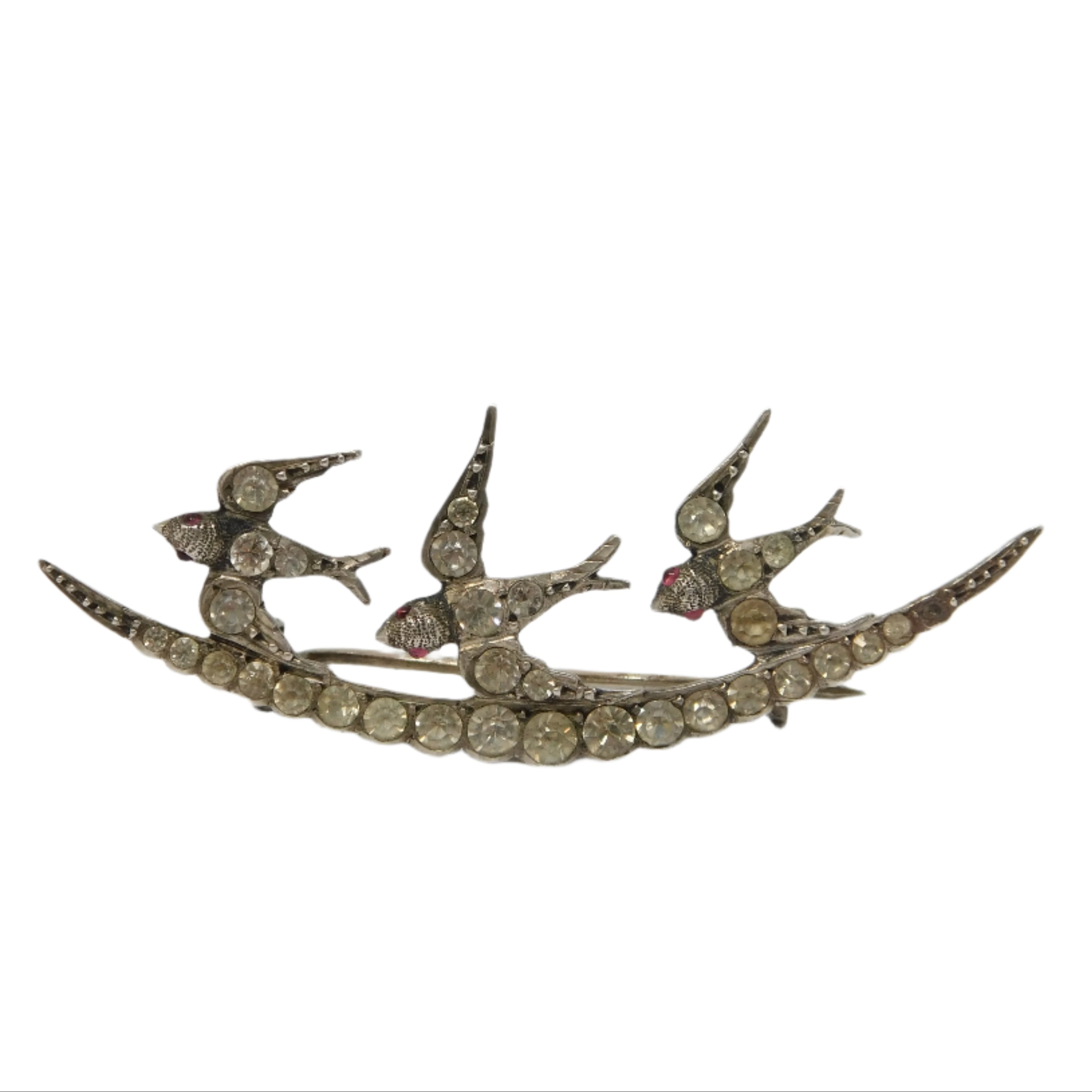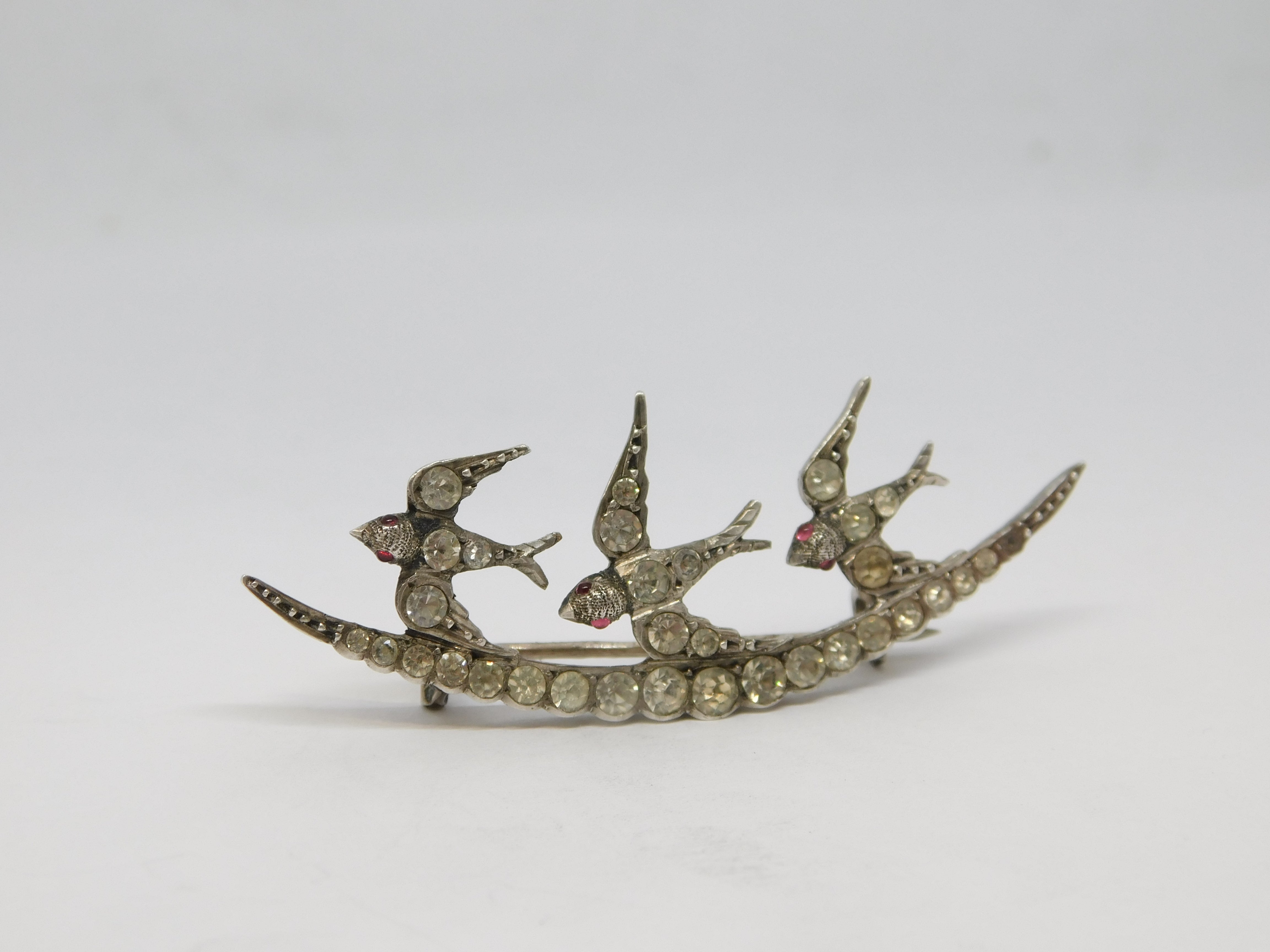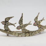 19th Century Sterling Silver Paste Set Three-Birds Sweetheart Brooch Antique c1890