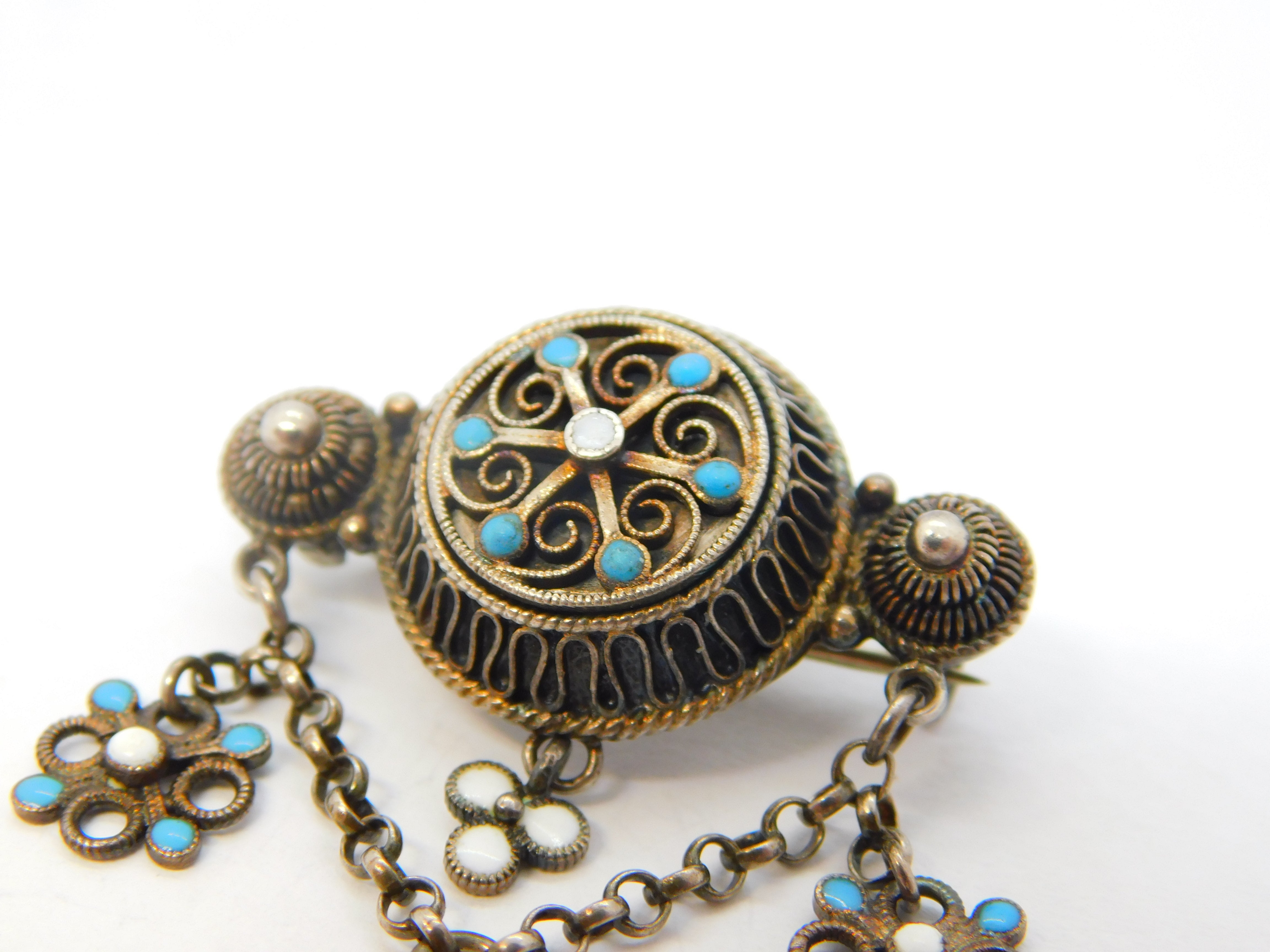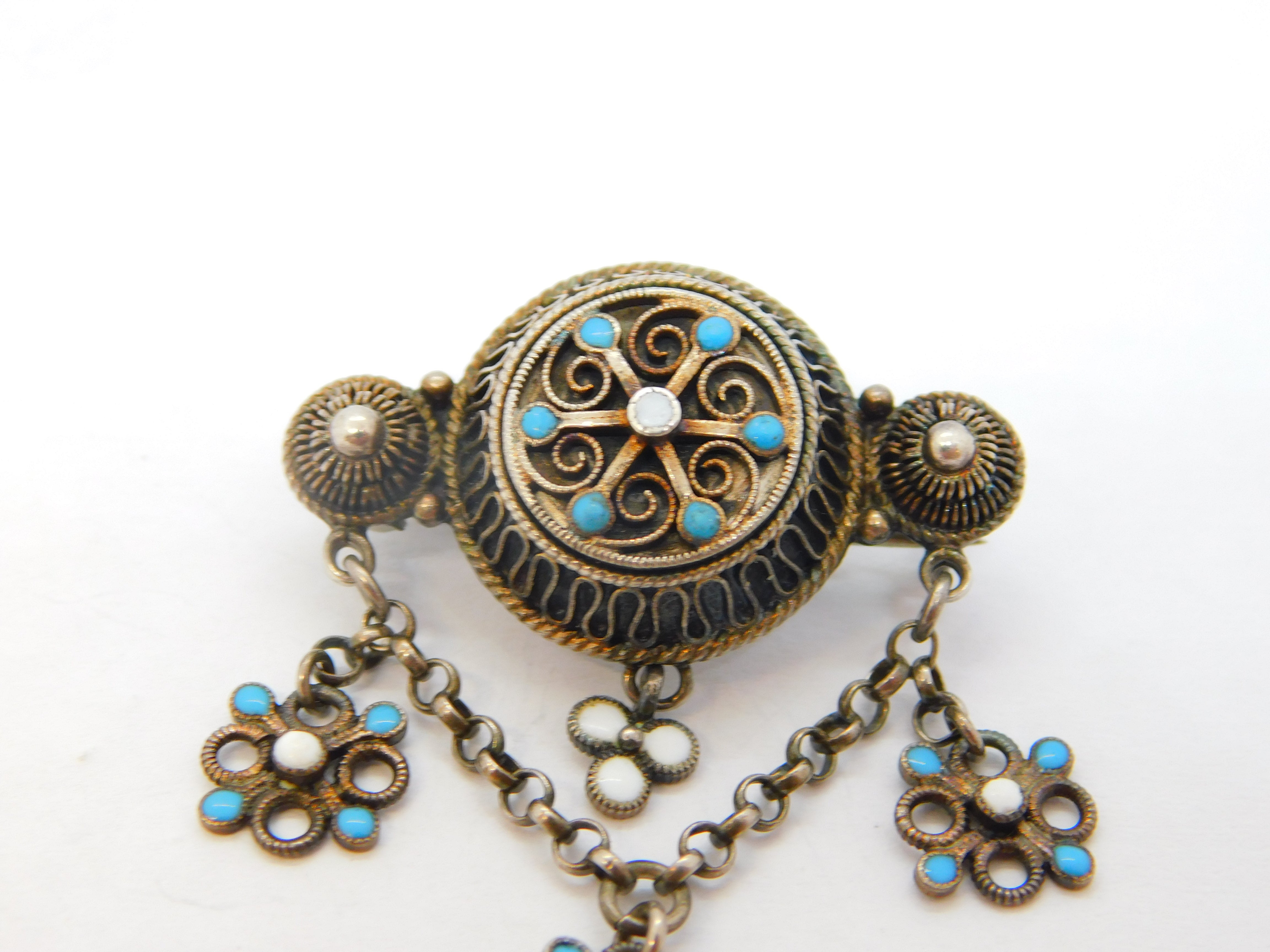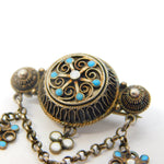 Decorative brooch with turquoise stones and floral designs on a white background