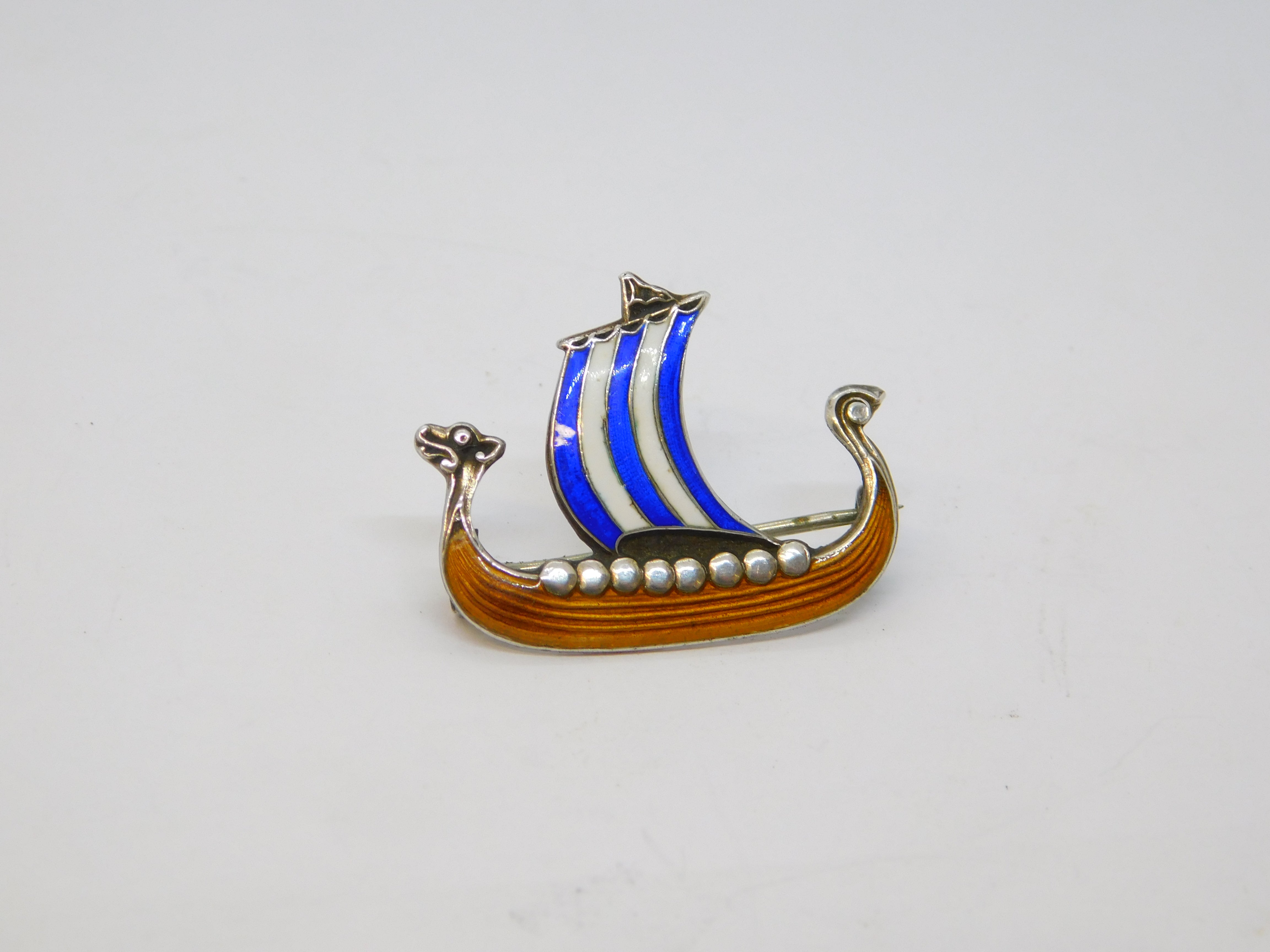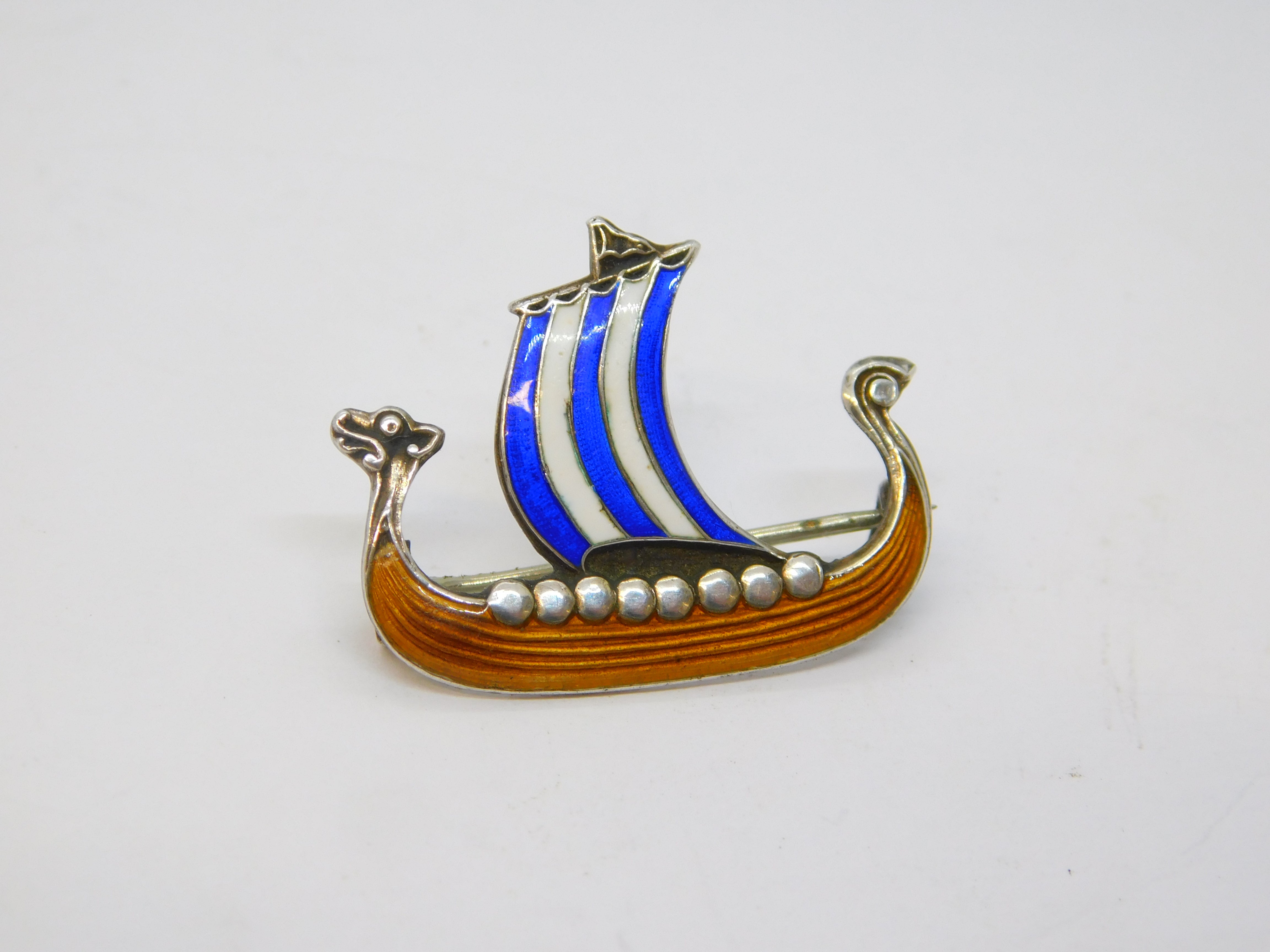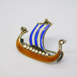 20th Century Scandinavian Sterling Silver Enamel Viking Boat Brooch Antique c1920