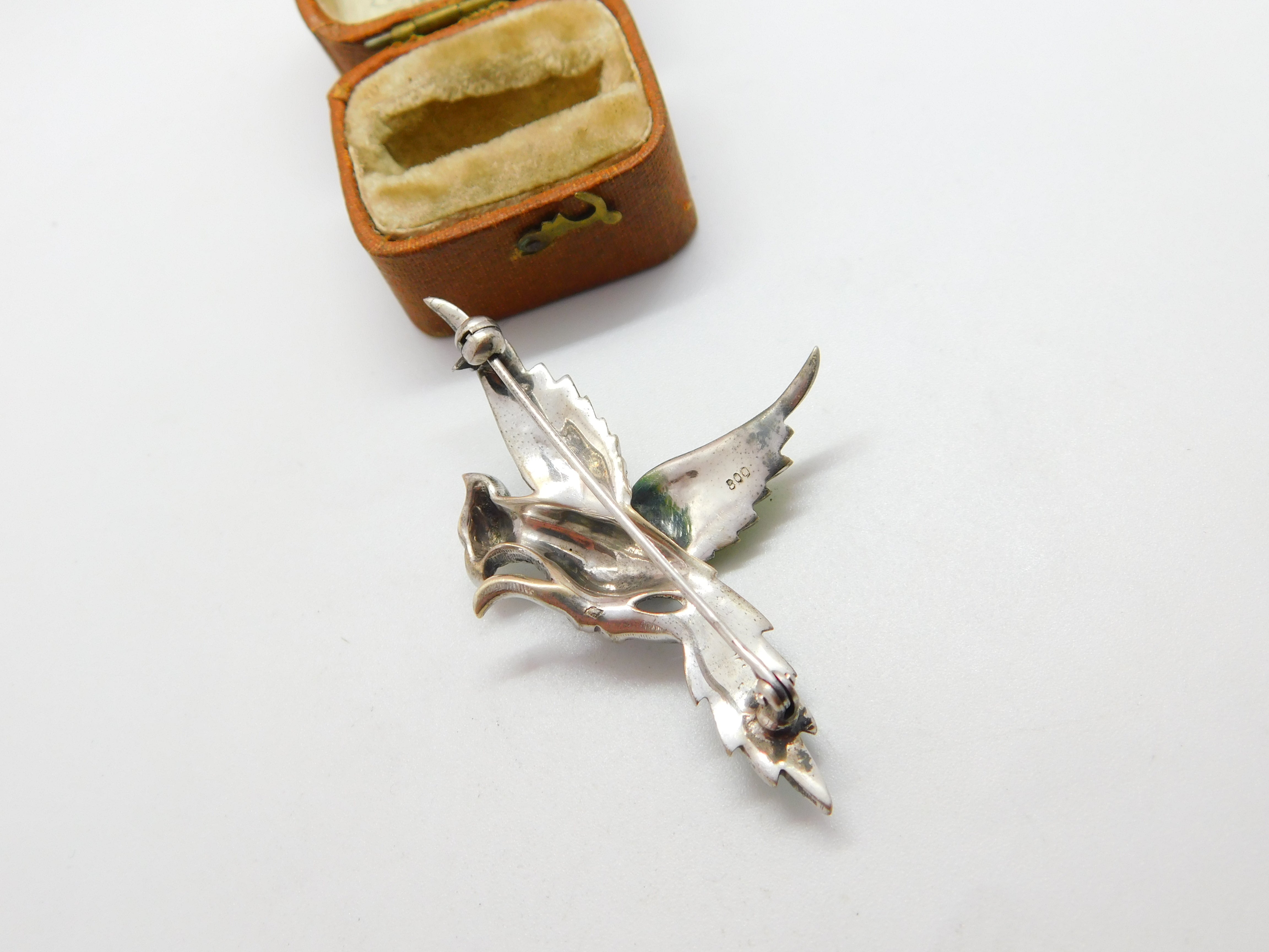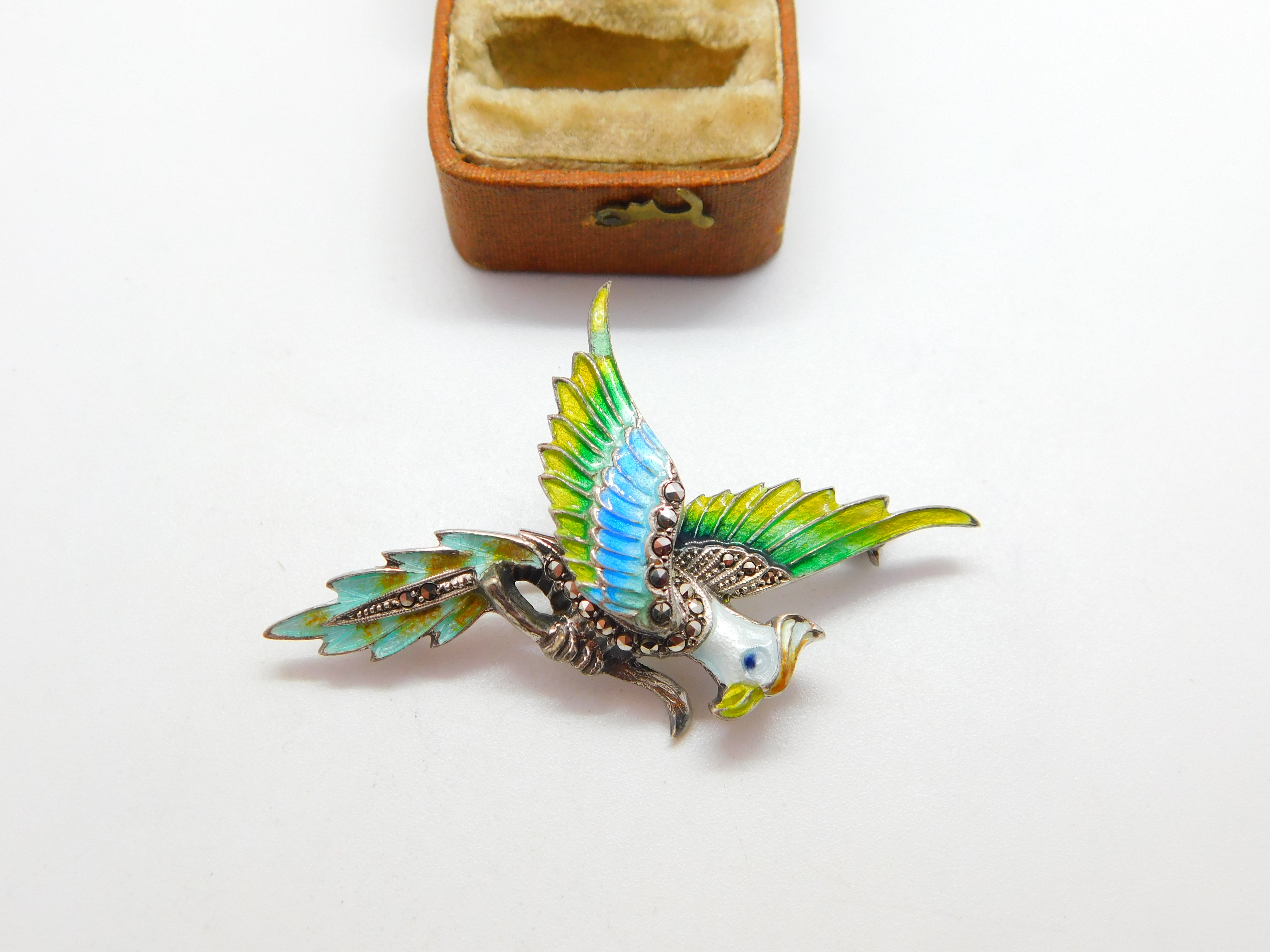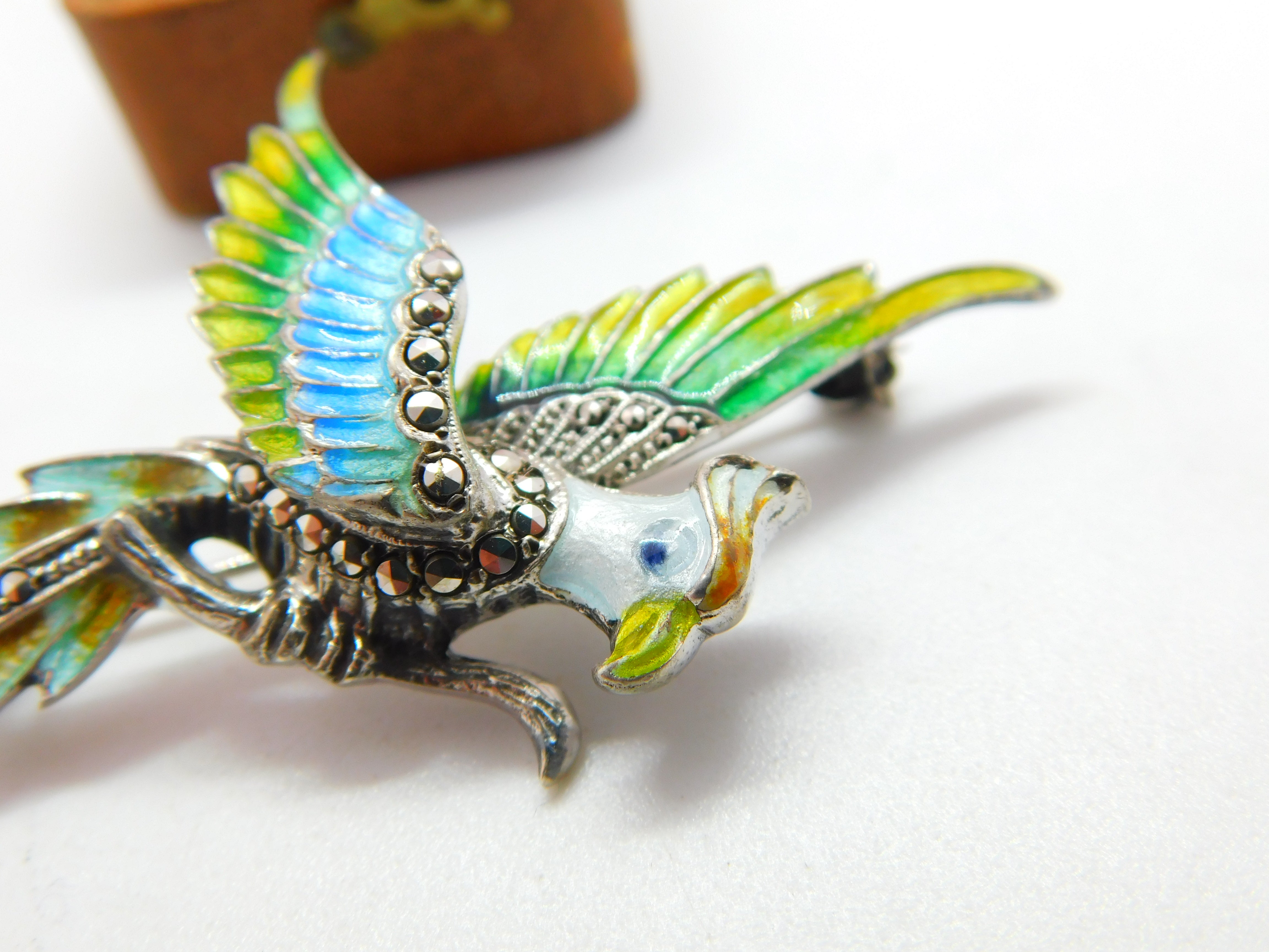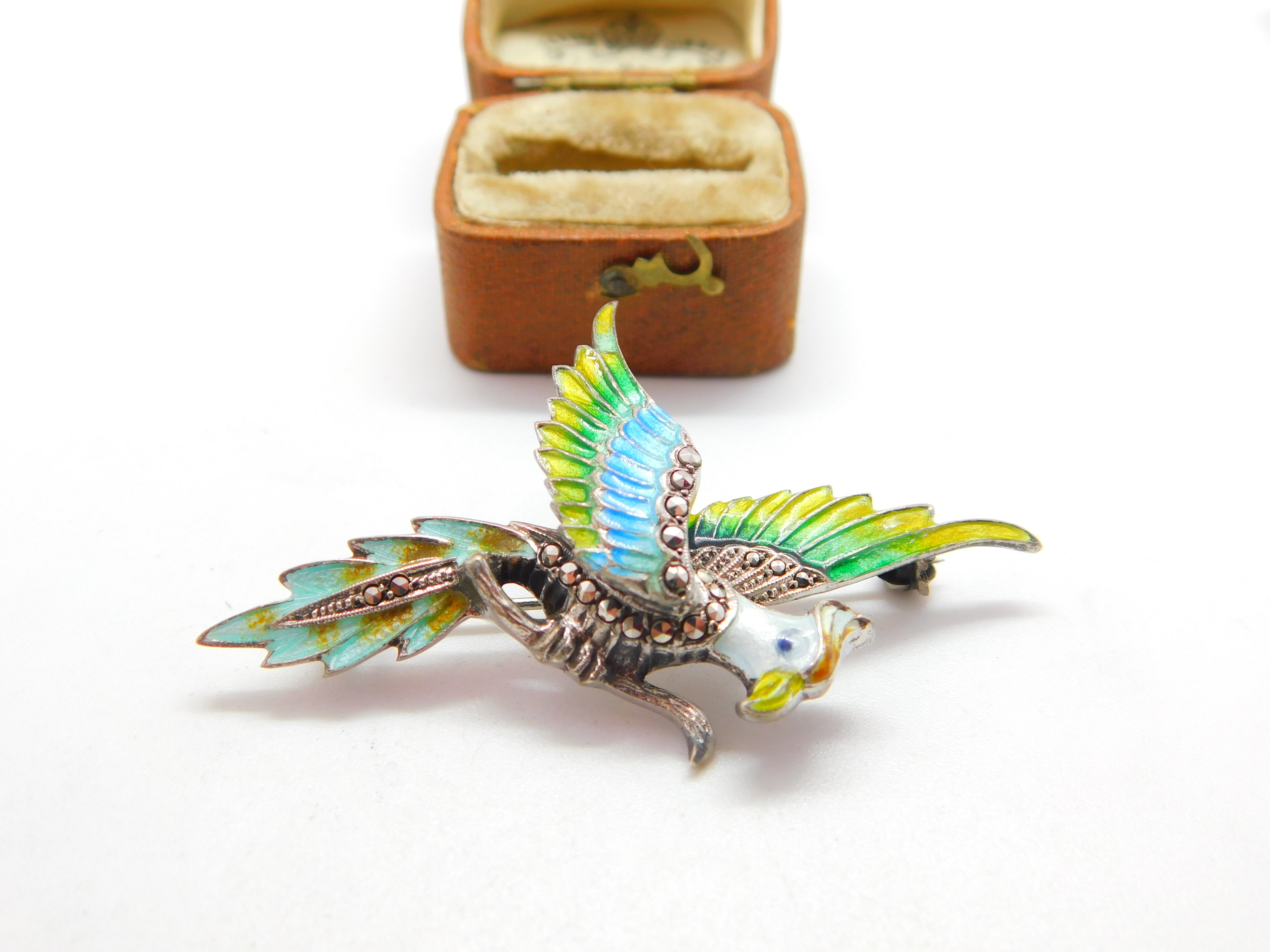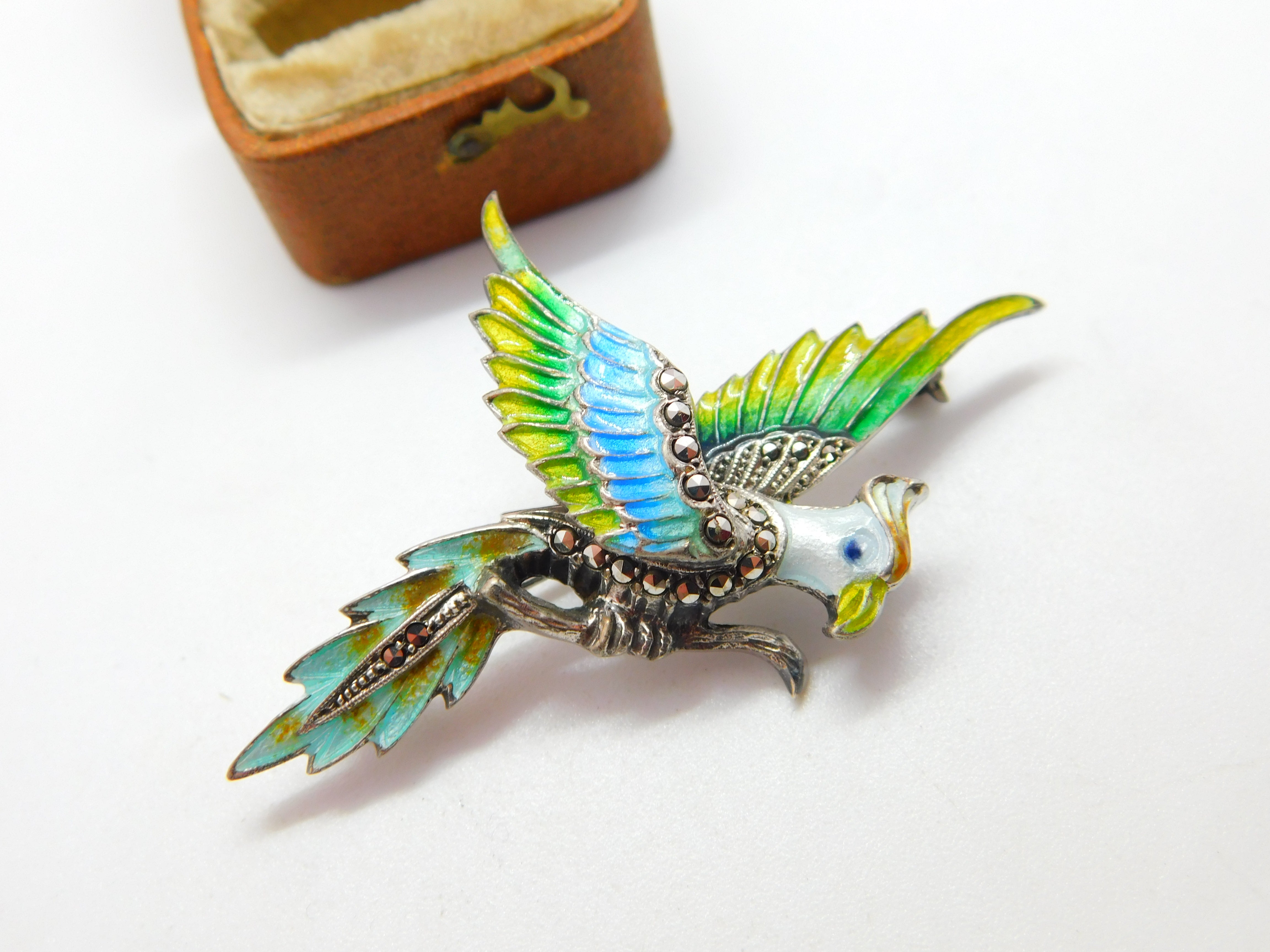 Details: A fantastic and wonderfully designed vintage .800 grade silver statement brooch set with colourful enamel and marcasite stones in lovely fashion hallmarked to the reverse c1990. This is a wonderful item that would make a perfect gift or addition to any collection. The BOX pictured is for PRESENTATION ONLY and is NOT included in the listings but used to frame the pictures unless specifically stated otherwise.