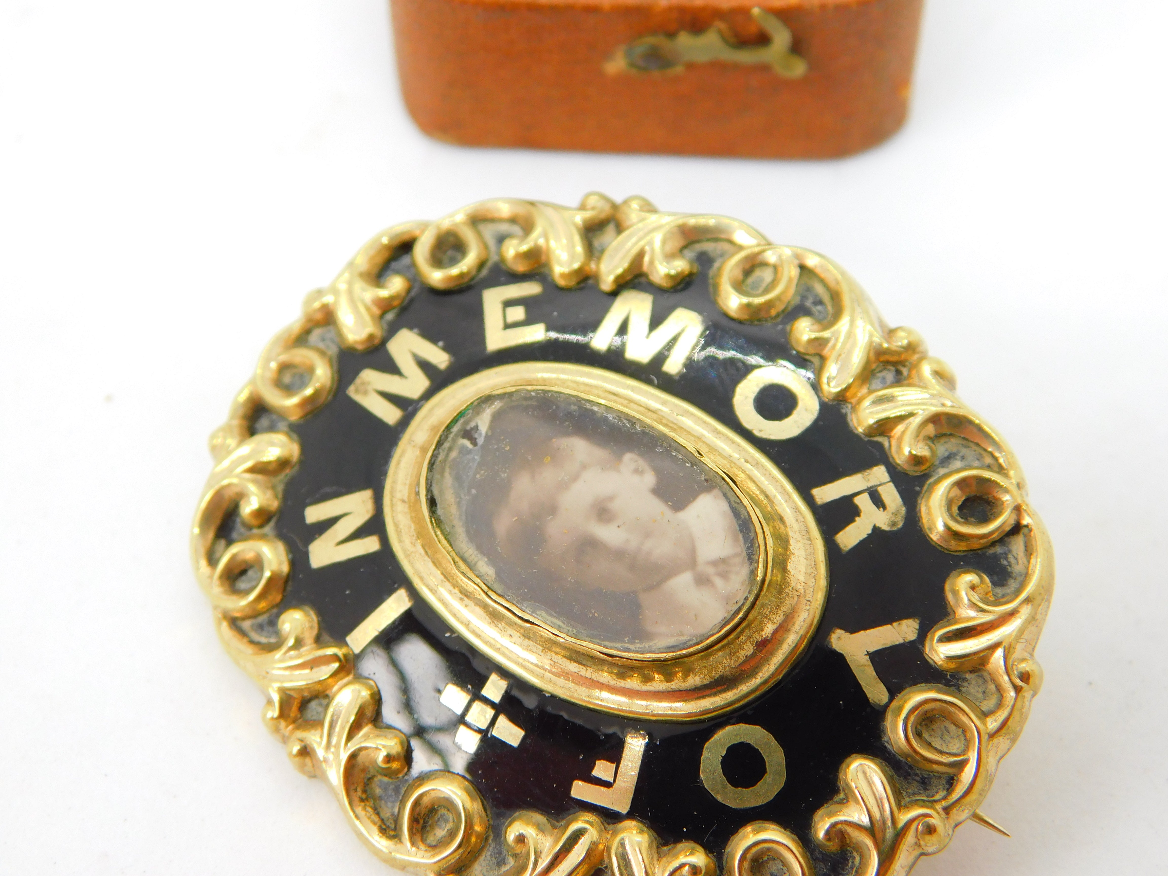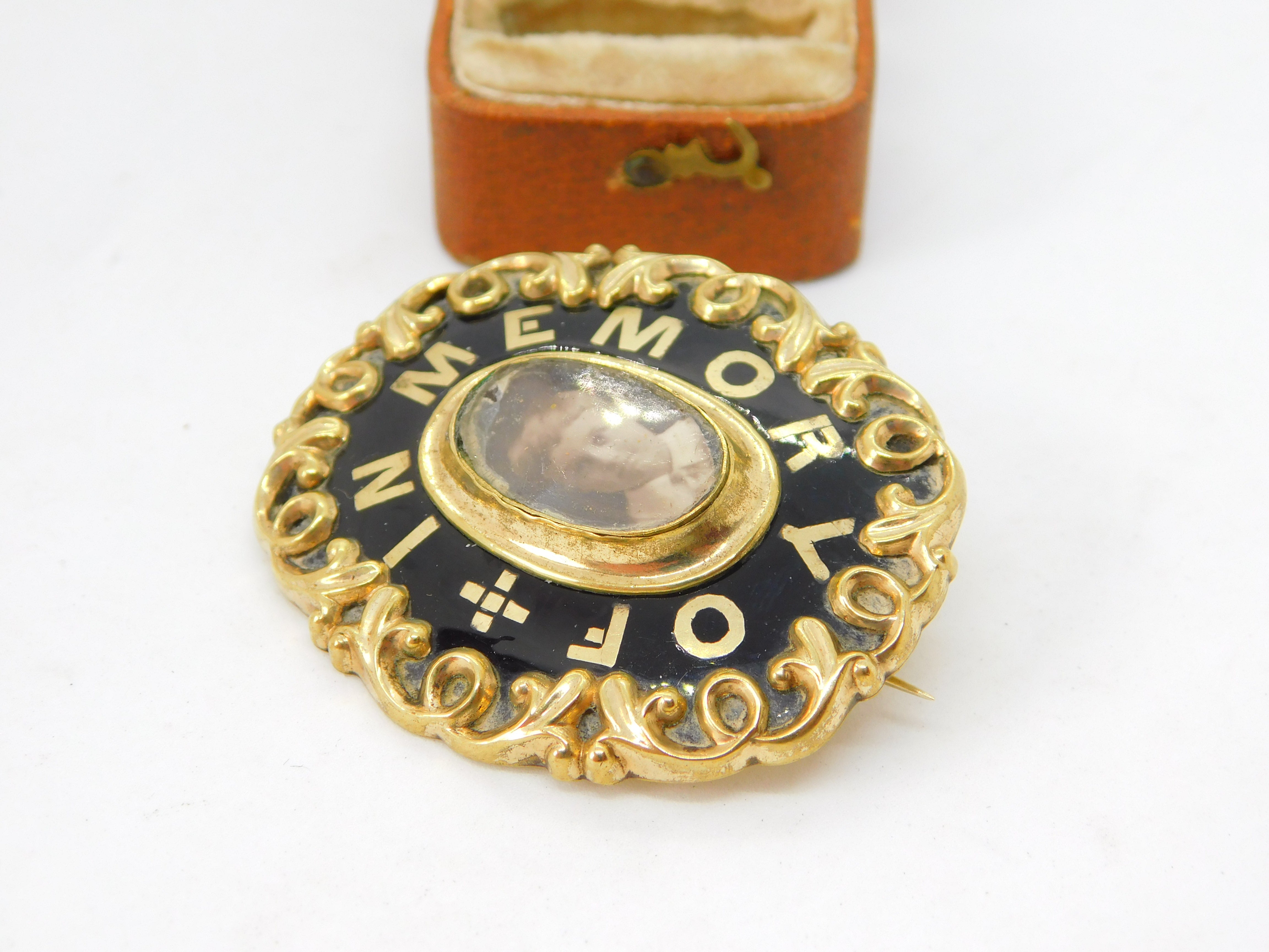 Details: A fantastic and wonderfully designed antique Victorian 9ct yellow gold cased black enamel 'In Memory Of' mourning brooch set with photograph to the centre c1880. The gold has been tested. This is a wonderful item that would make a perfect gift or addition to any collection. The BOX pictured is for PRESENTATION ONLY and is NOT included in the listings but used to frame the pictures unless specifically stated otherwise.