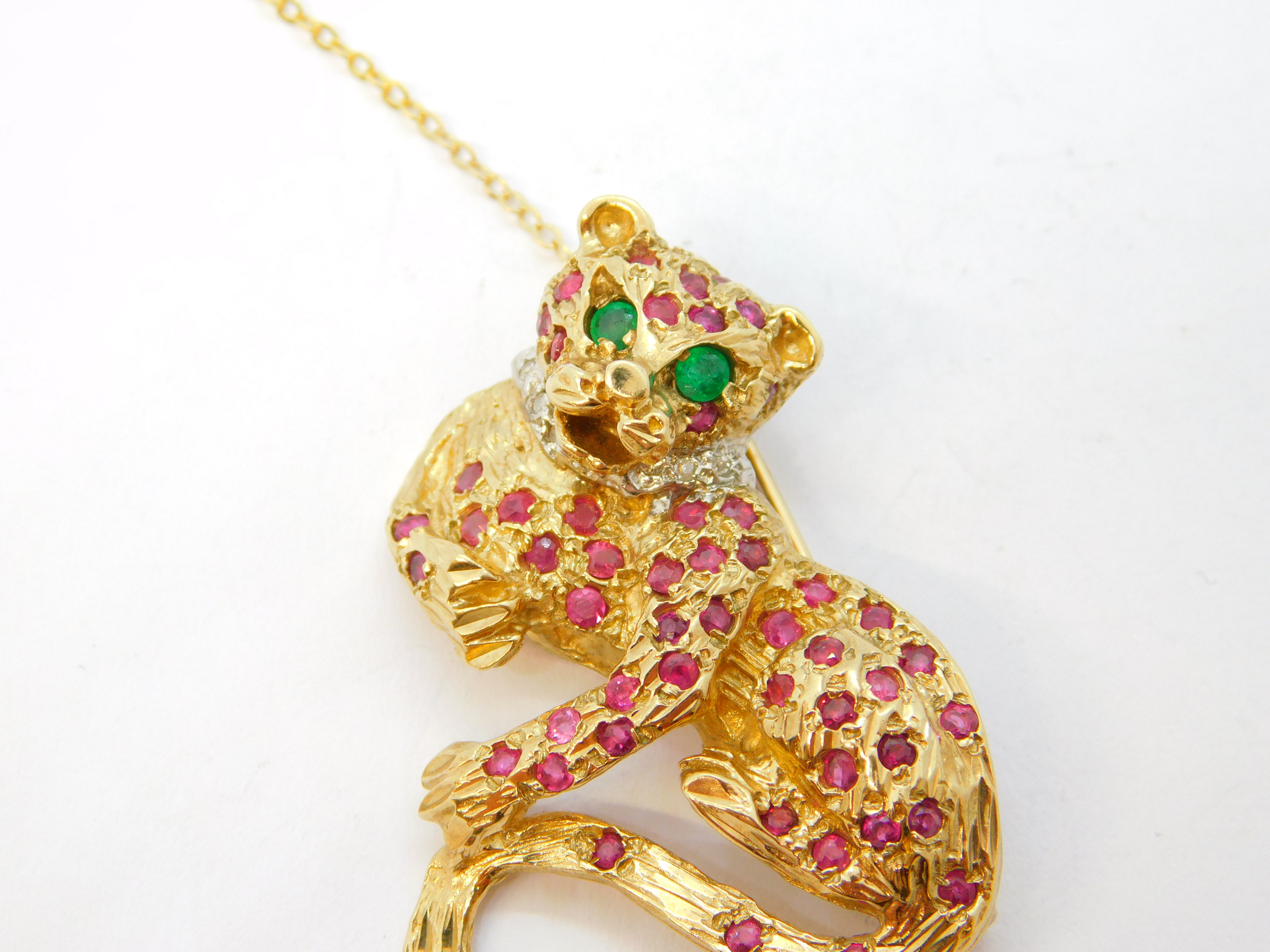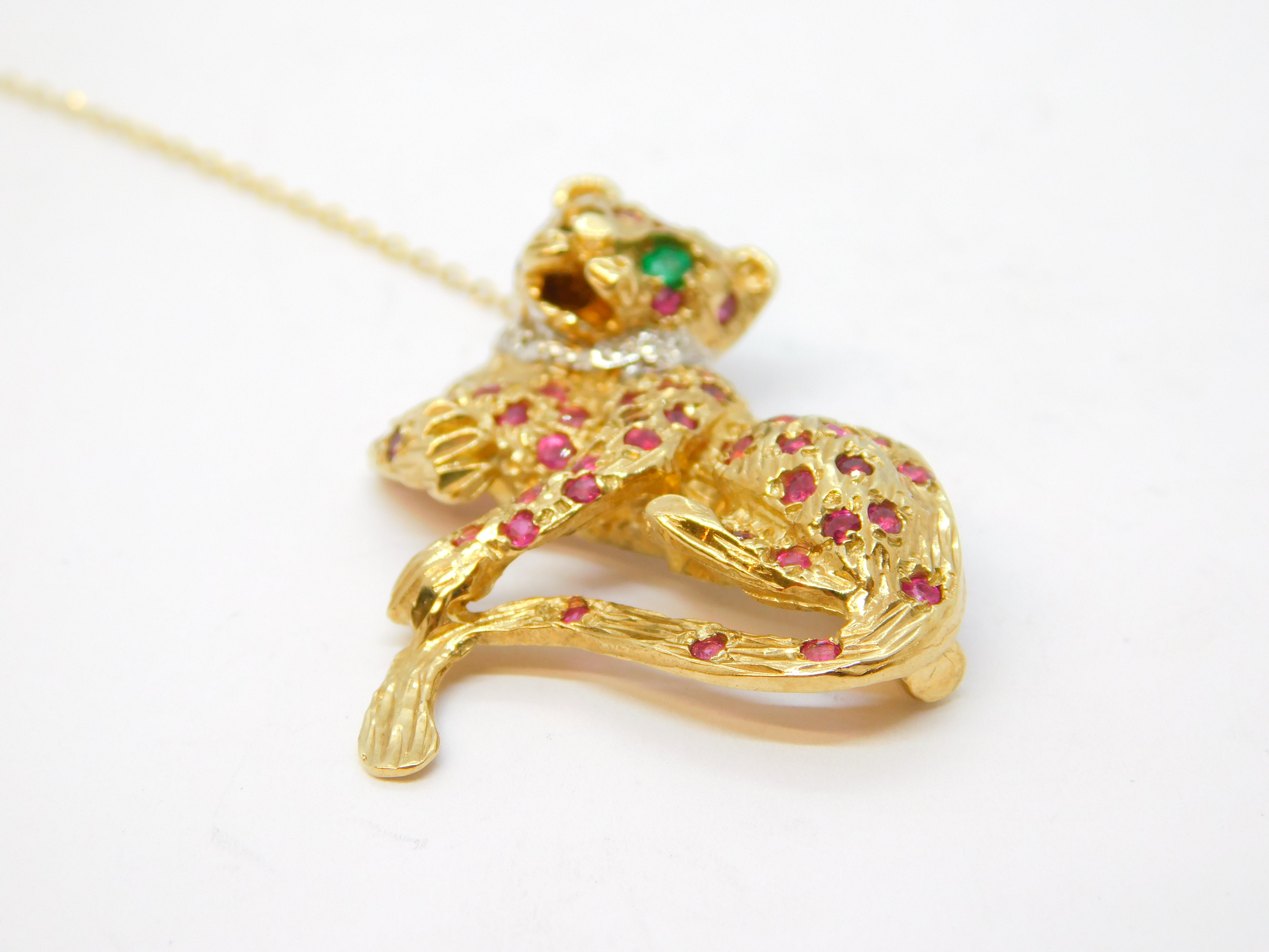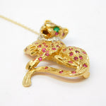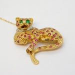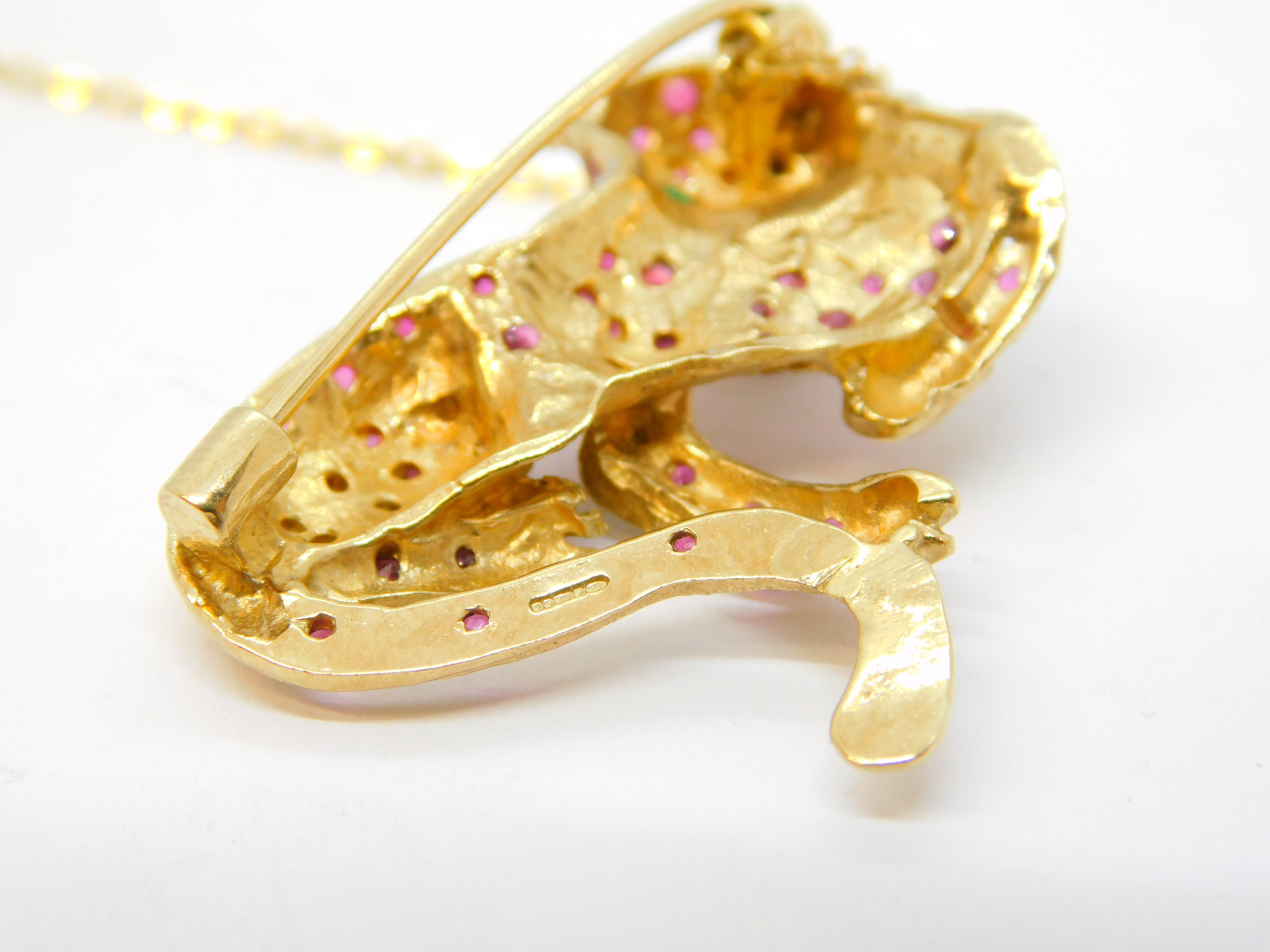 9ct Yellow Gold, Ruby, Diamond, Emerald Sitting Panther Brooch Vintage 1989 London