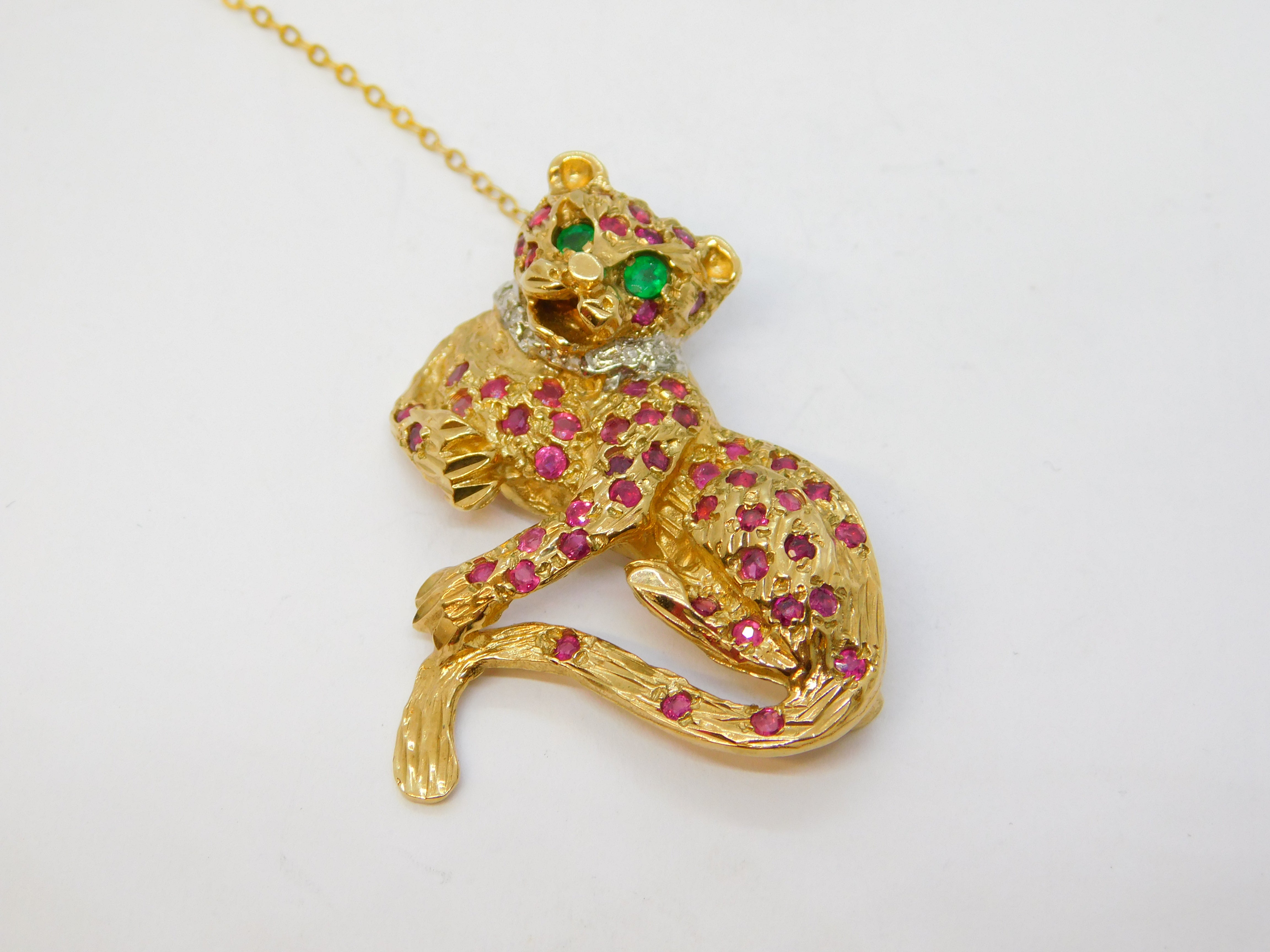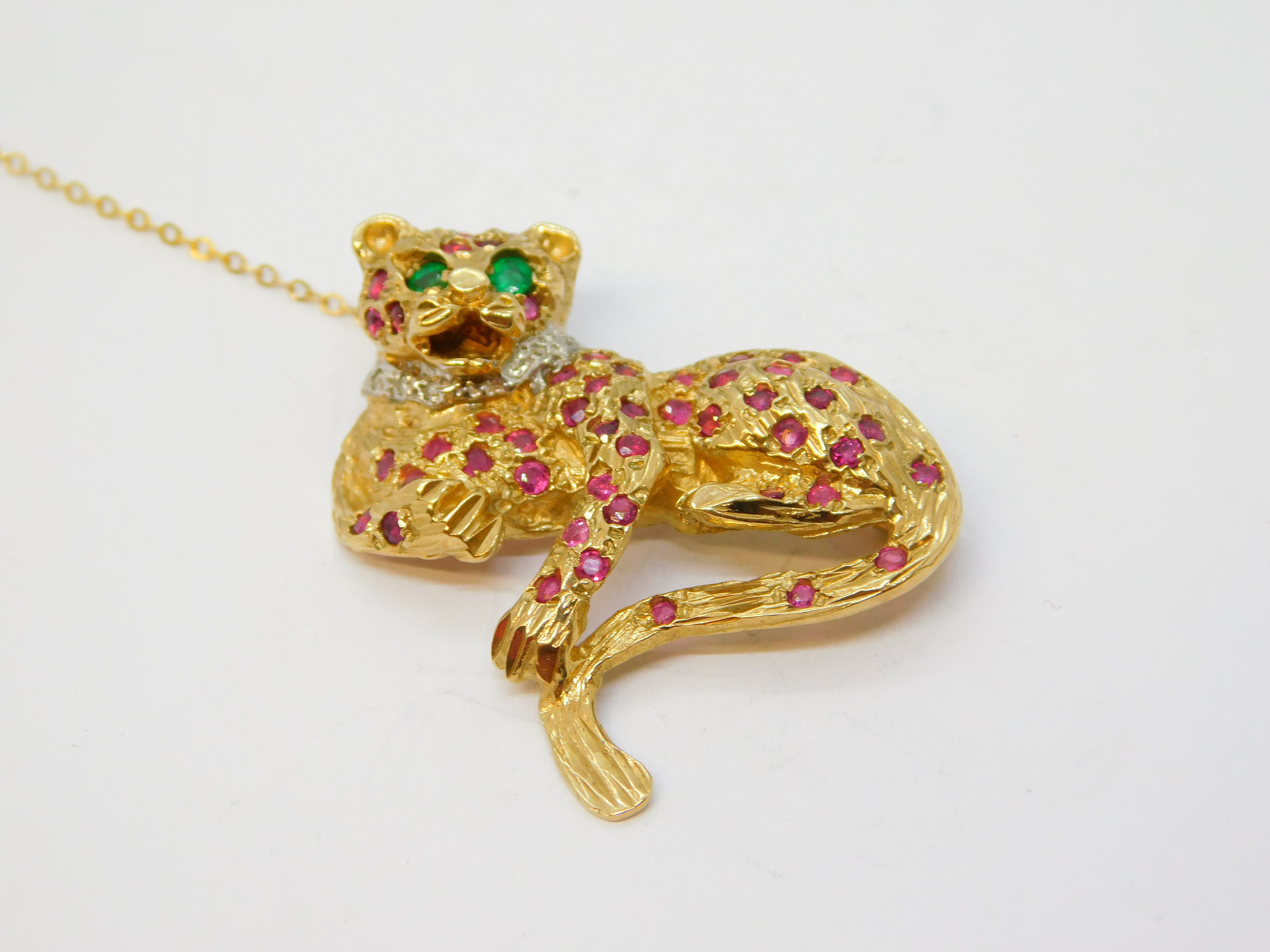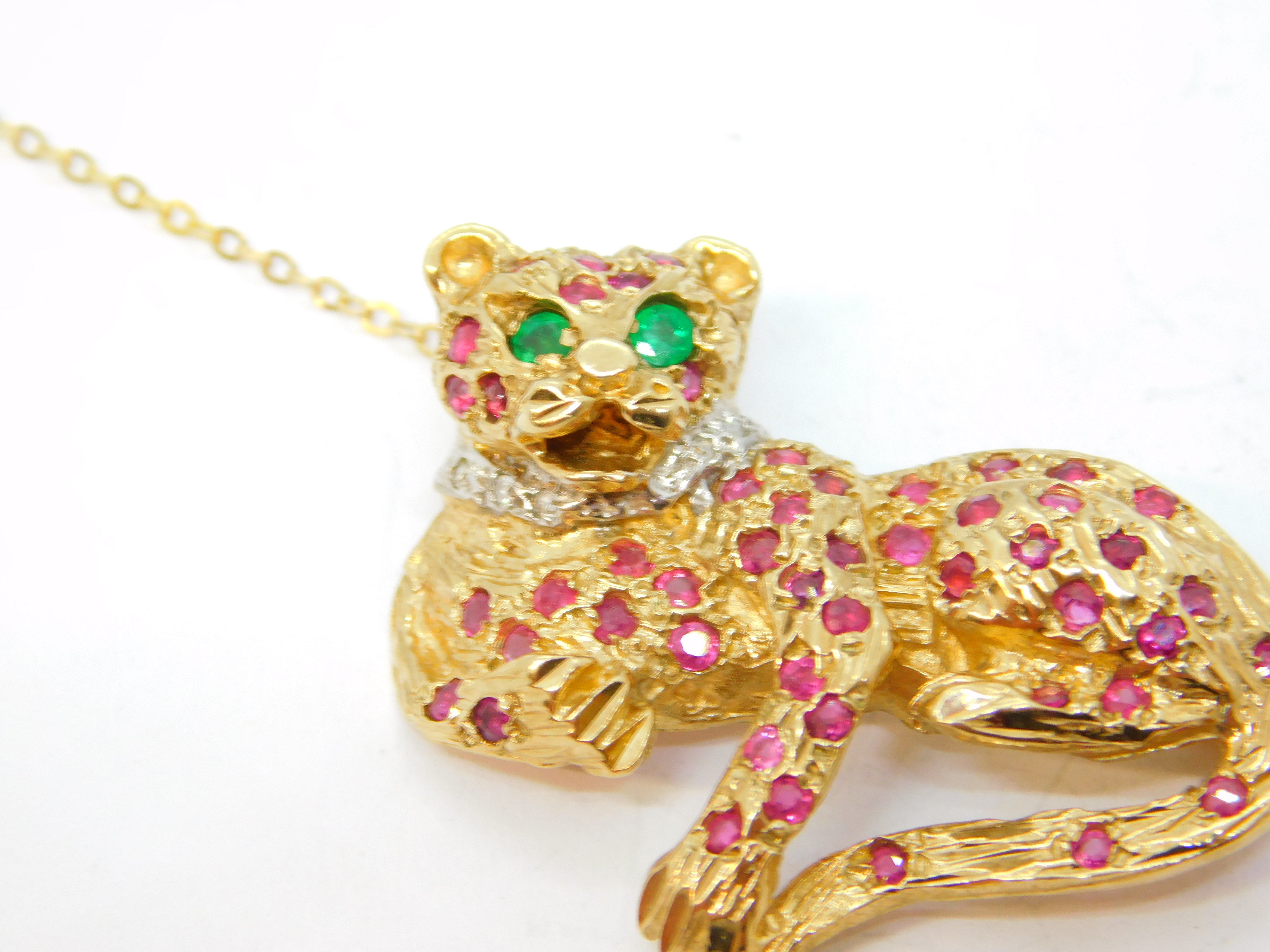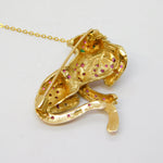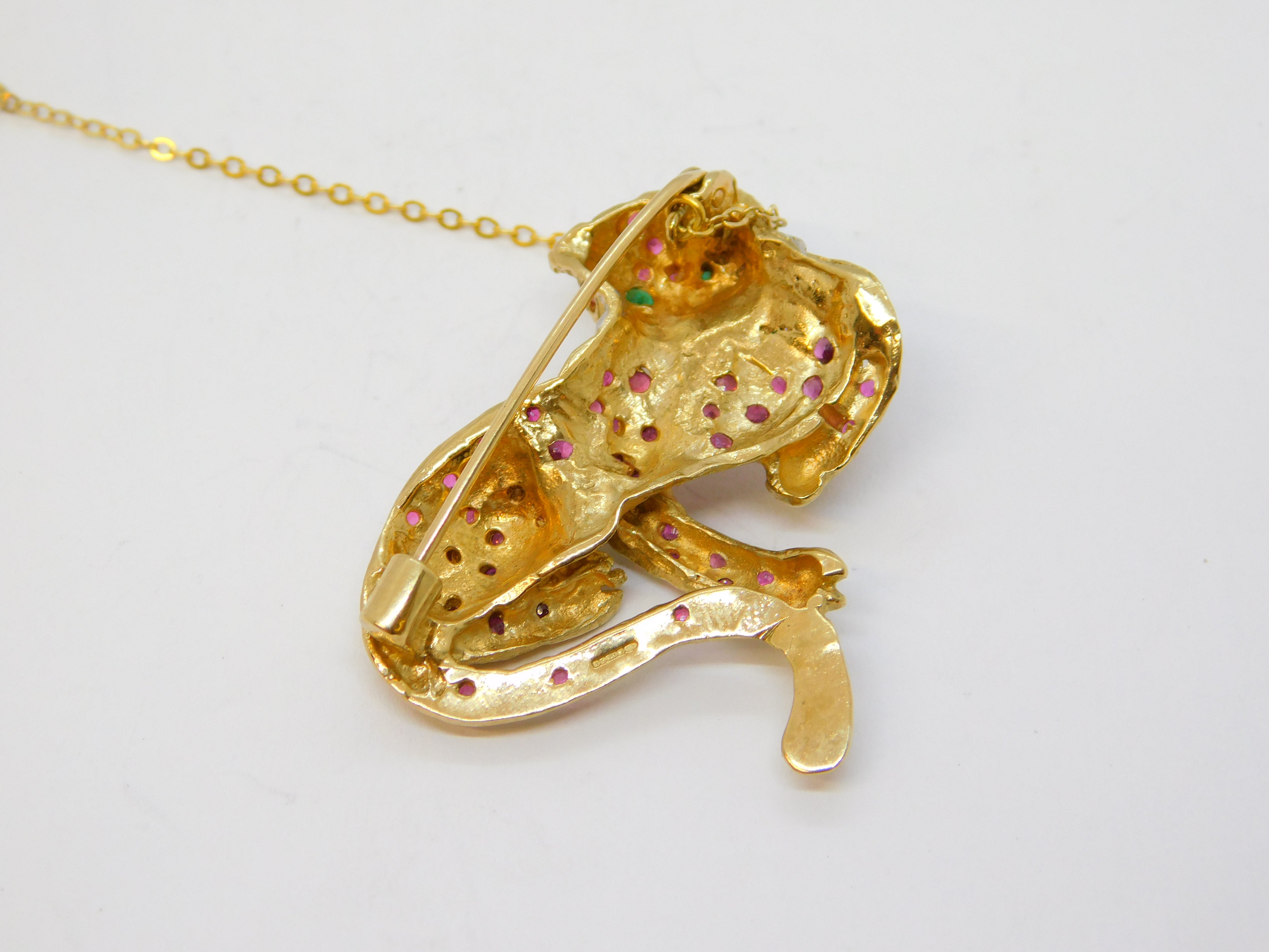 9ct Yellow Gold, Ruby, Diamond, Emerald Sitting Panther Brooch Vintage 1989 London