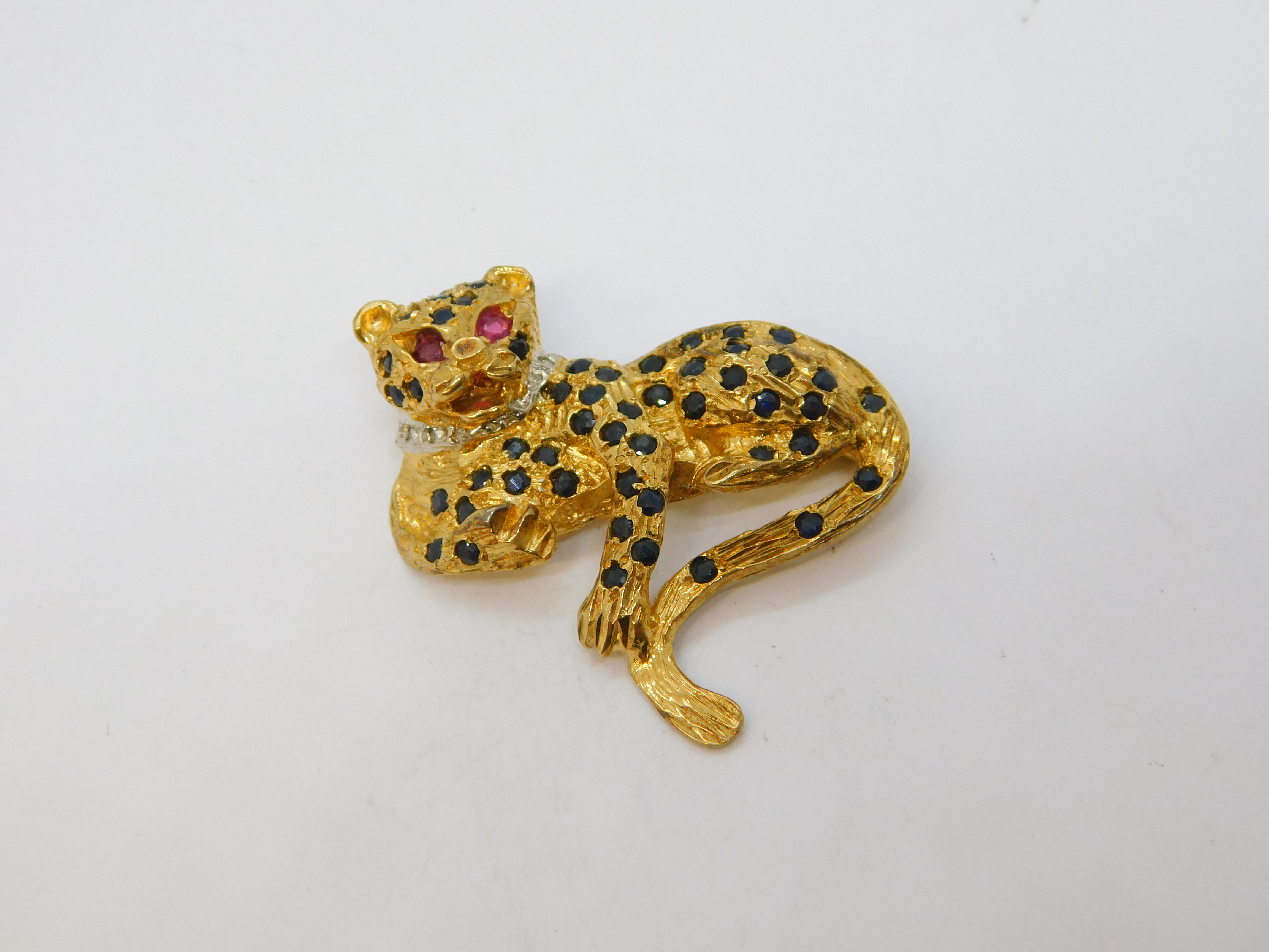 Details: A fantastic and wonderfully designed vintage 9ct yellow gold sitting panther brooch set with sapphires, rubies and diamonds to the collar hallmarked Birmingham 1988 to the reverse, the stones have been tested. This is a wonderful item that would make a perfect gift or addition to any collection. We are more than happy to provide XRF reports for items upon request.