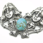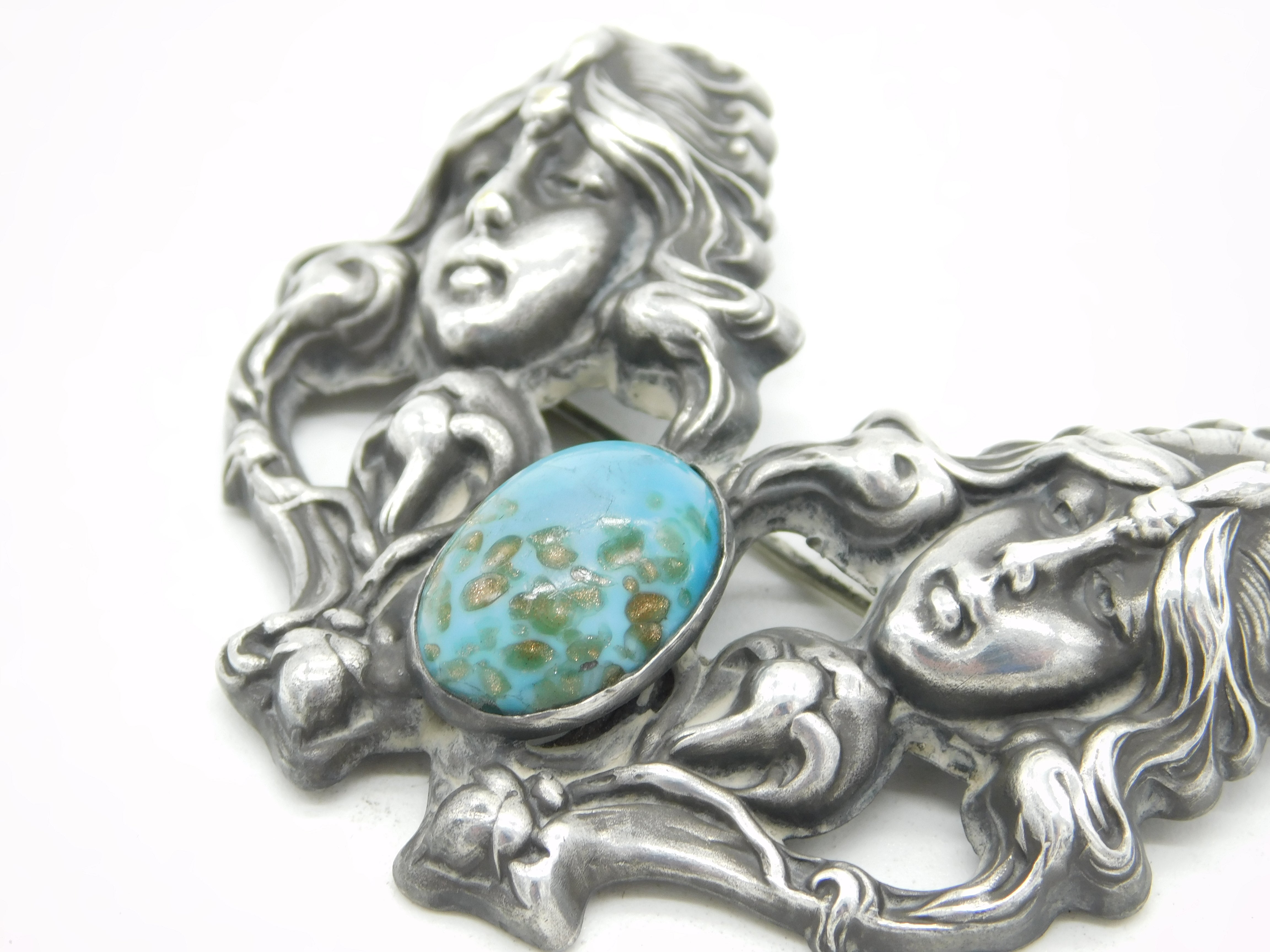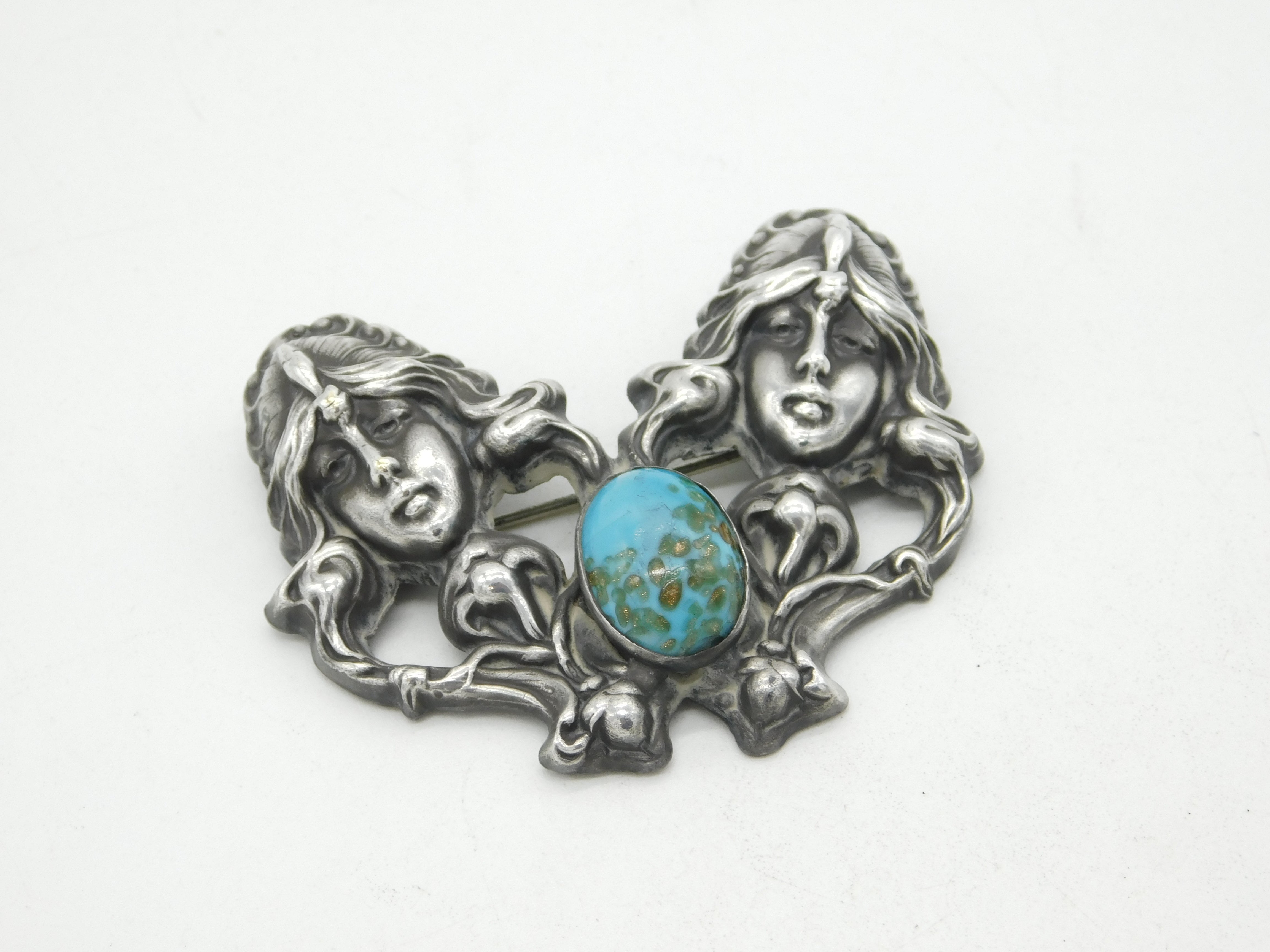 Details: A fantastic and wonderfully designed antique 19th century art nouveau sterling silver large brooch depicting two fairies adorne with art nouveau decoration set with a central ruskin style cabochon to the centre c1890, the silver has been XRF tested as it is unmarked. This is a wonderful item that would make a perfect gift or addition to any collection. The BOX pictured is for PRESENTATION ONLY and is NOT included in the listings but used to frame the pictures unless specifically stated otherwise.