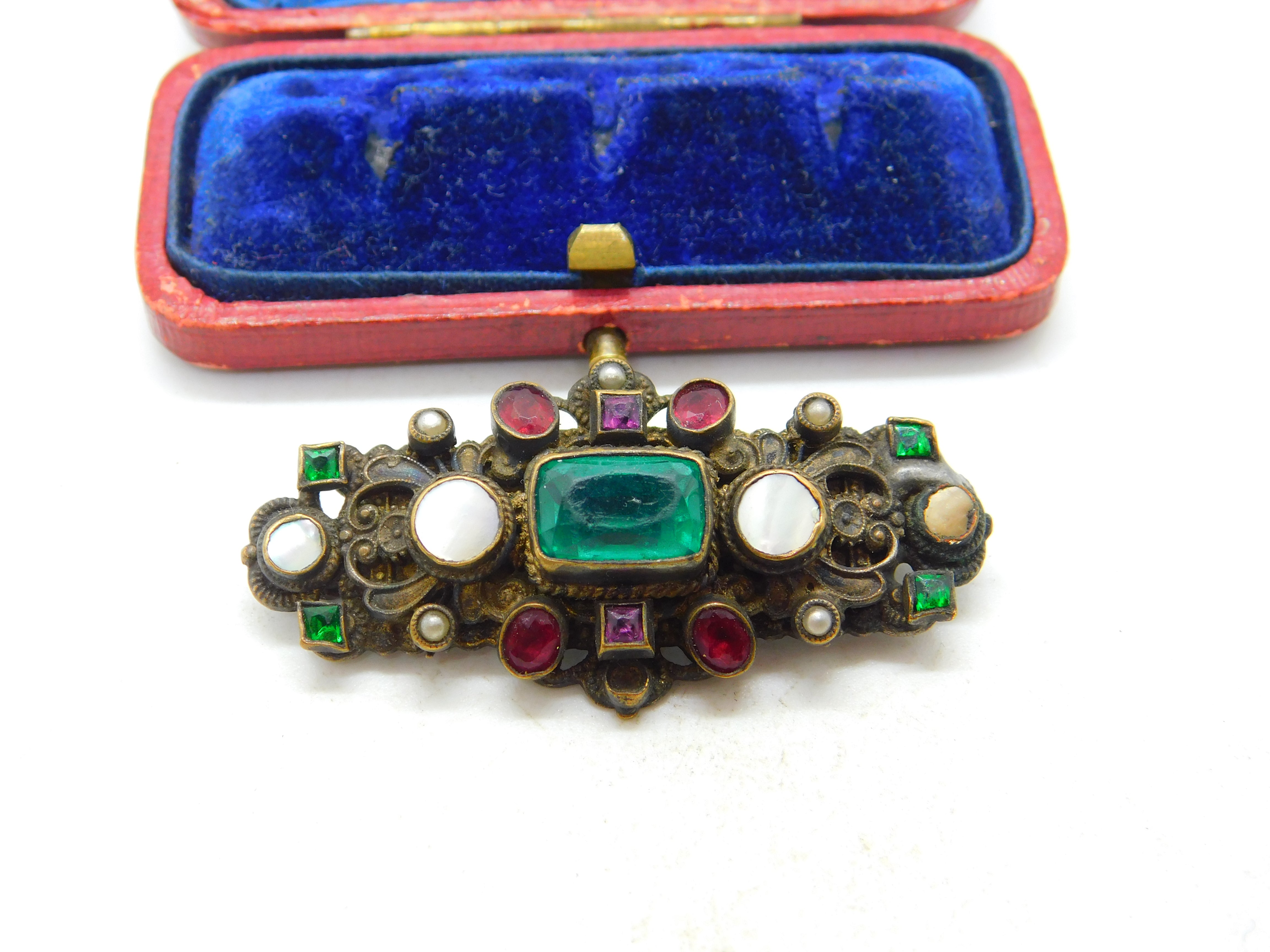 Pretty antique Austro Hungarian sterling silver brooch or pin set with red and green paste and mother of pearl dating from the late Victorian period. There is some rounding to the paste stone, one edge green stone is chipped and 1 mother of pearl detailing is missing please see the pictures. There is also a solder repair to the rear by the clasp. Good secure clasp and pin. The silver is tested as there are no marks. However still a pretty antique Austro Hungarian brooch.