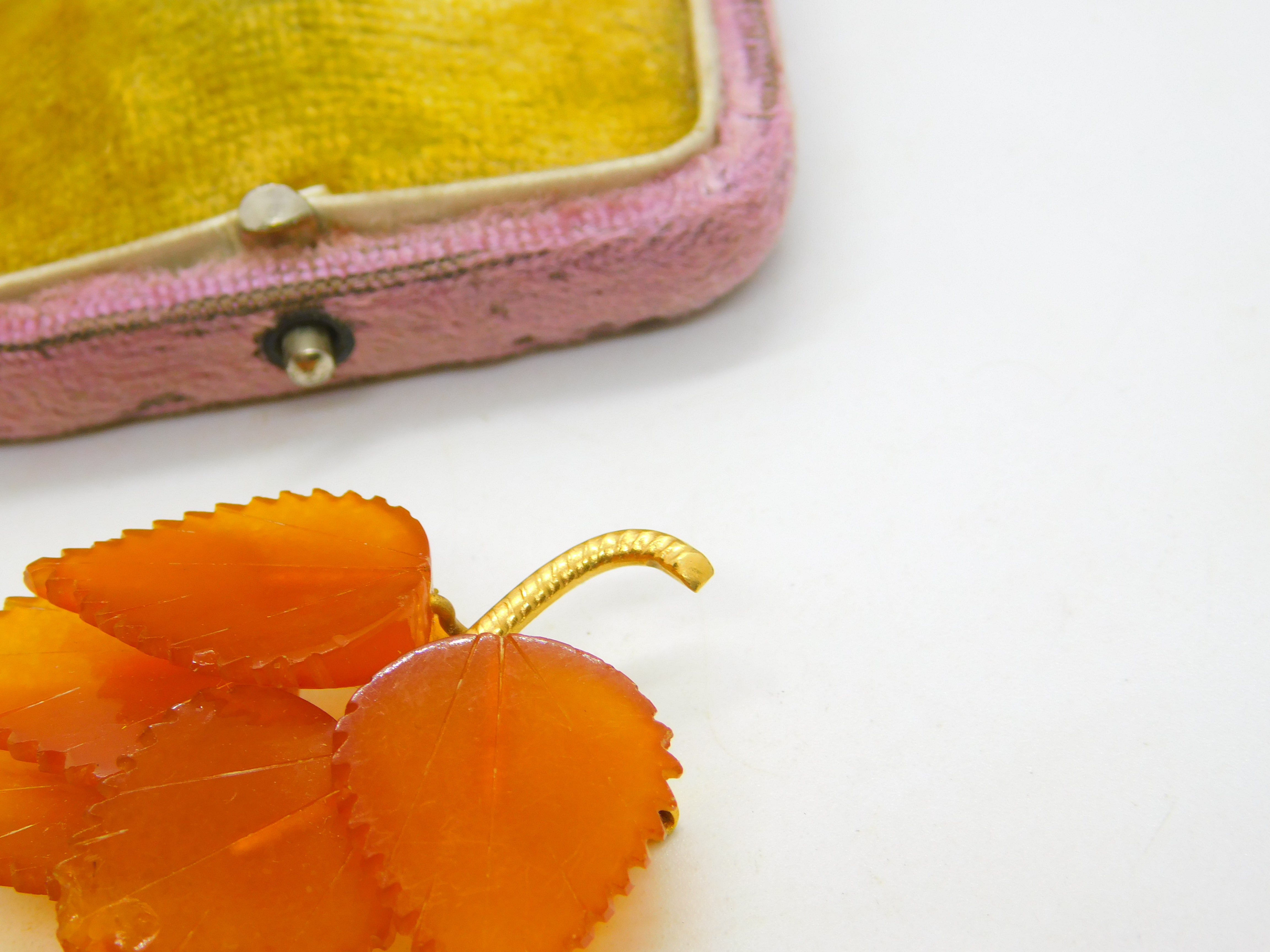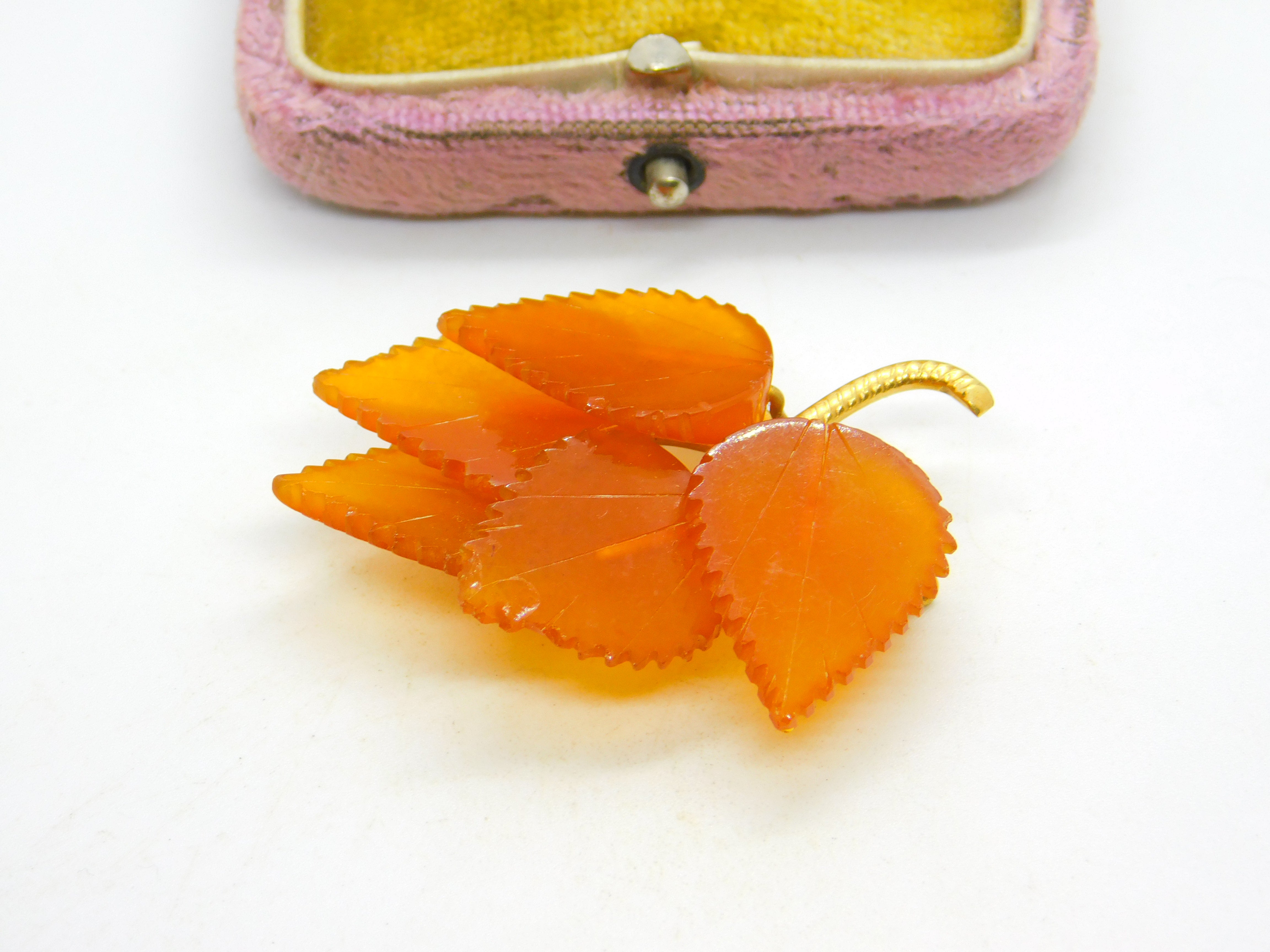 Baltic 18ct Yellow Gold & Amber Leaf Form Brooch Pin Antique c1930 Art Deco