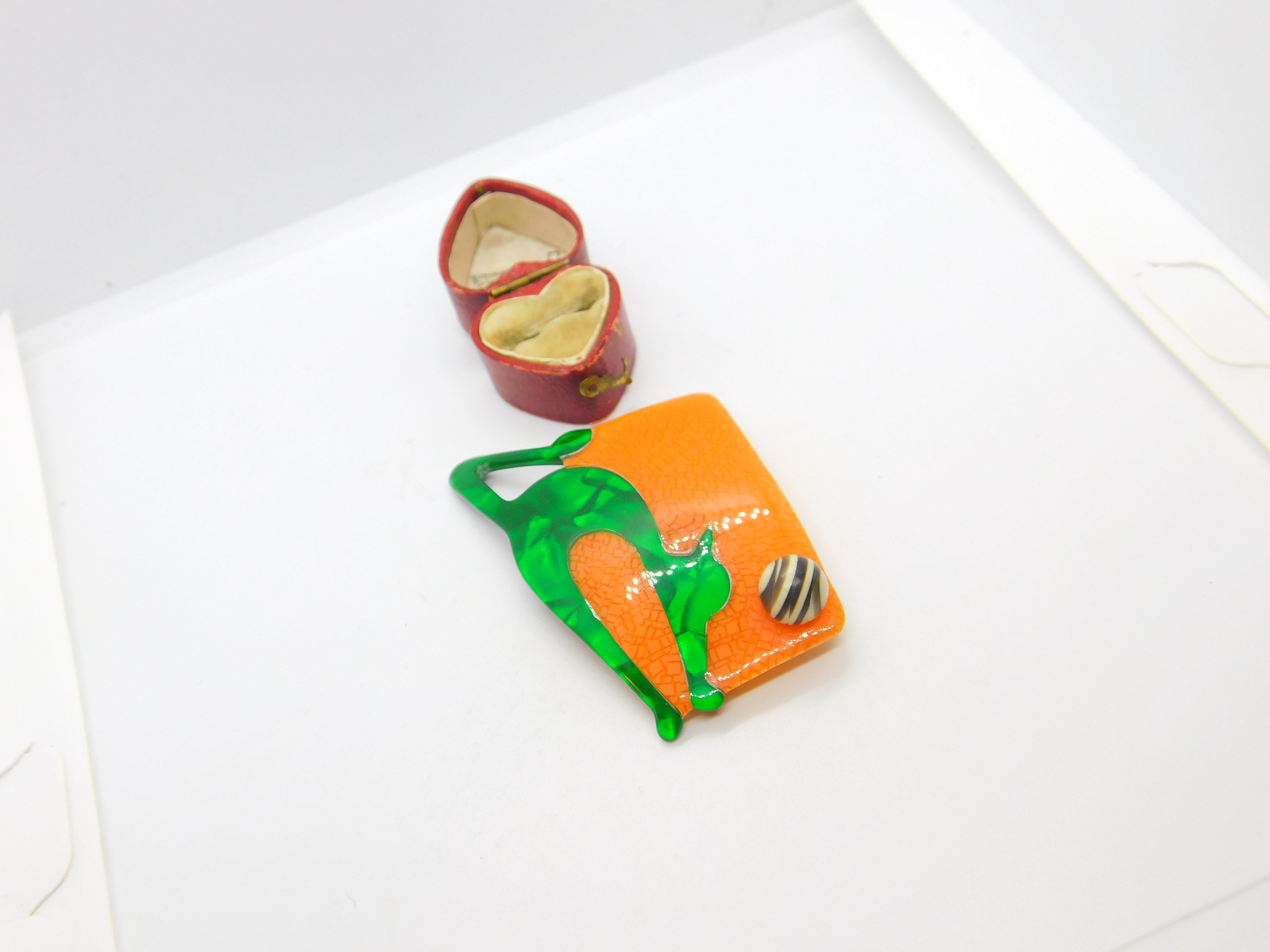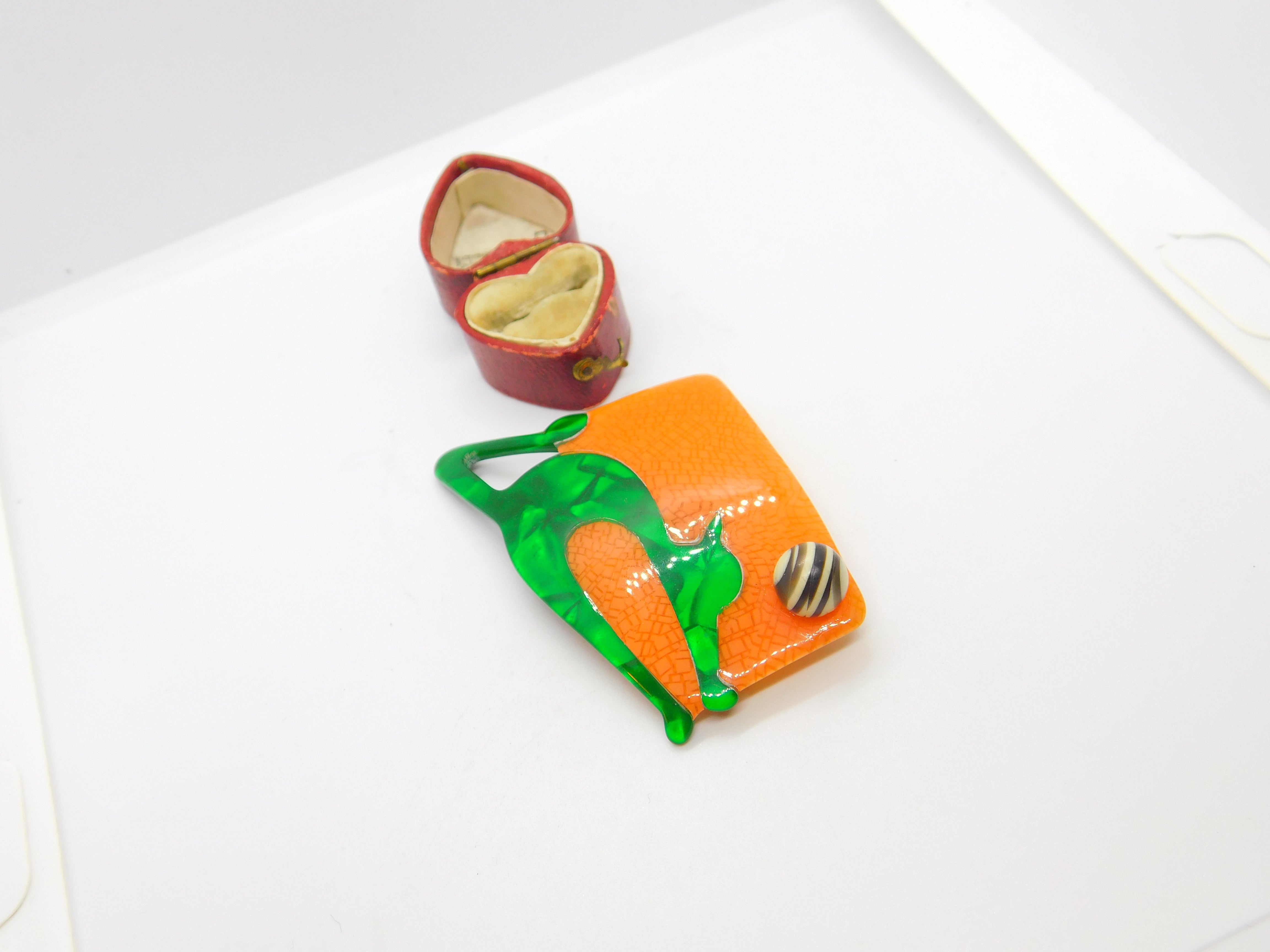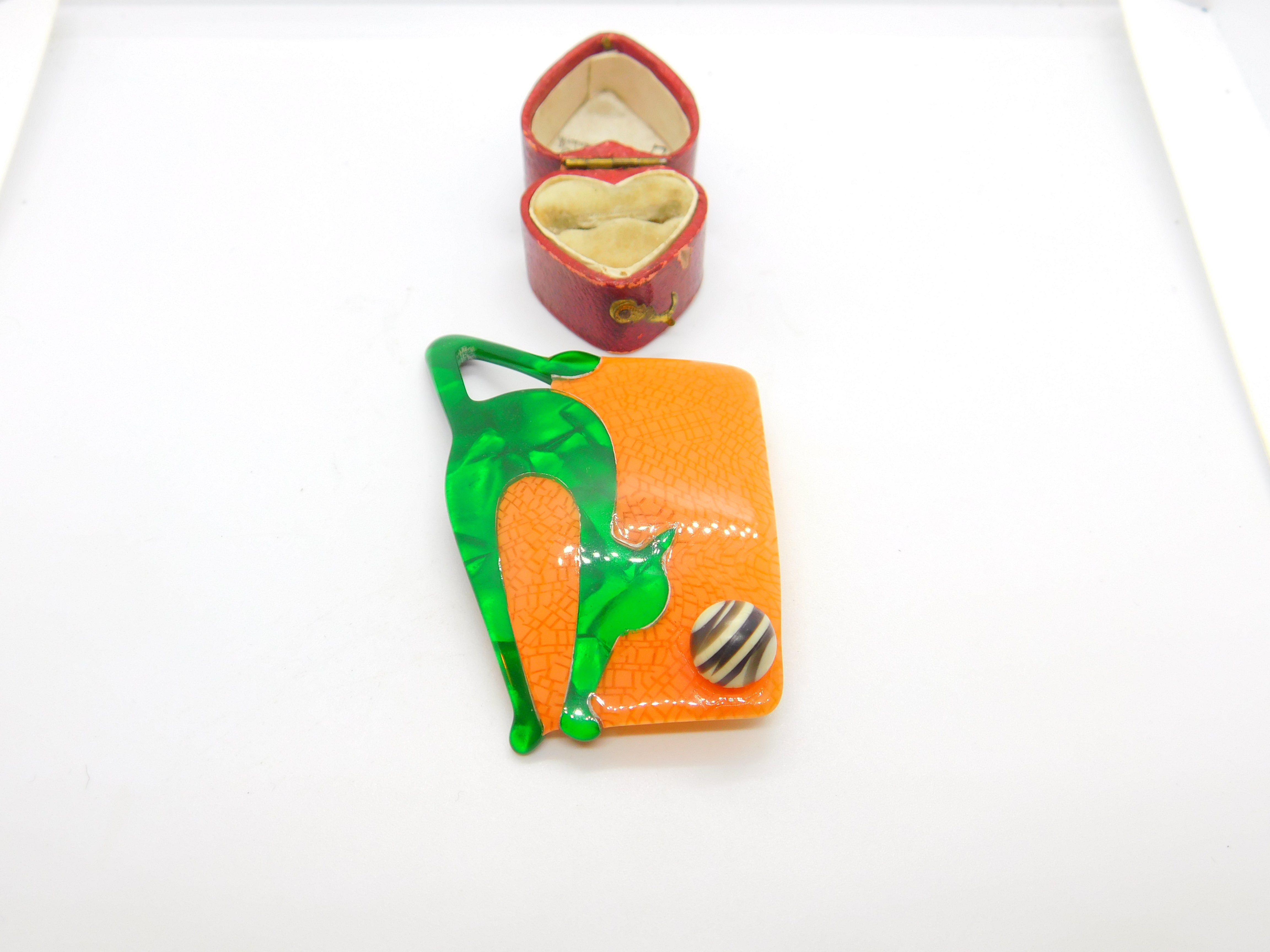 Simply iconic, this is a wonderful and very collectable Lea Stein of Paris brooch or pin of a cat playing with a ball dating from the 1960's.
