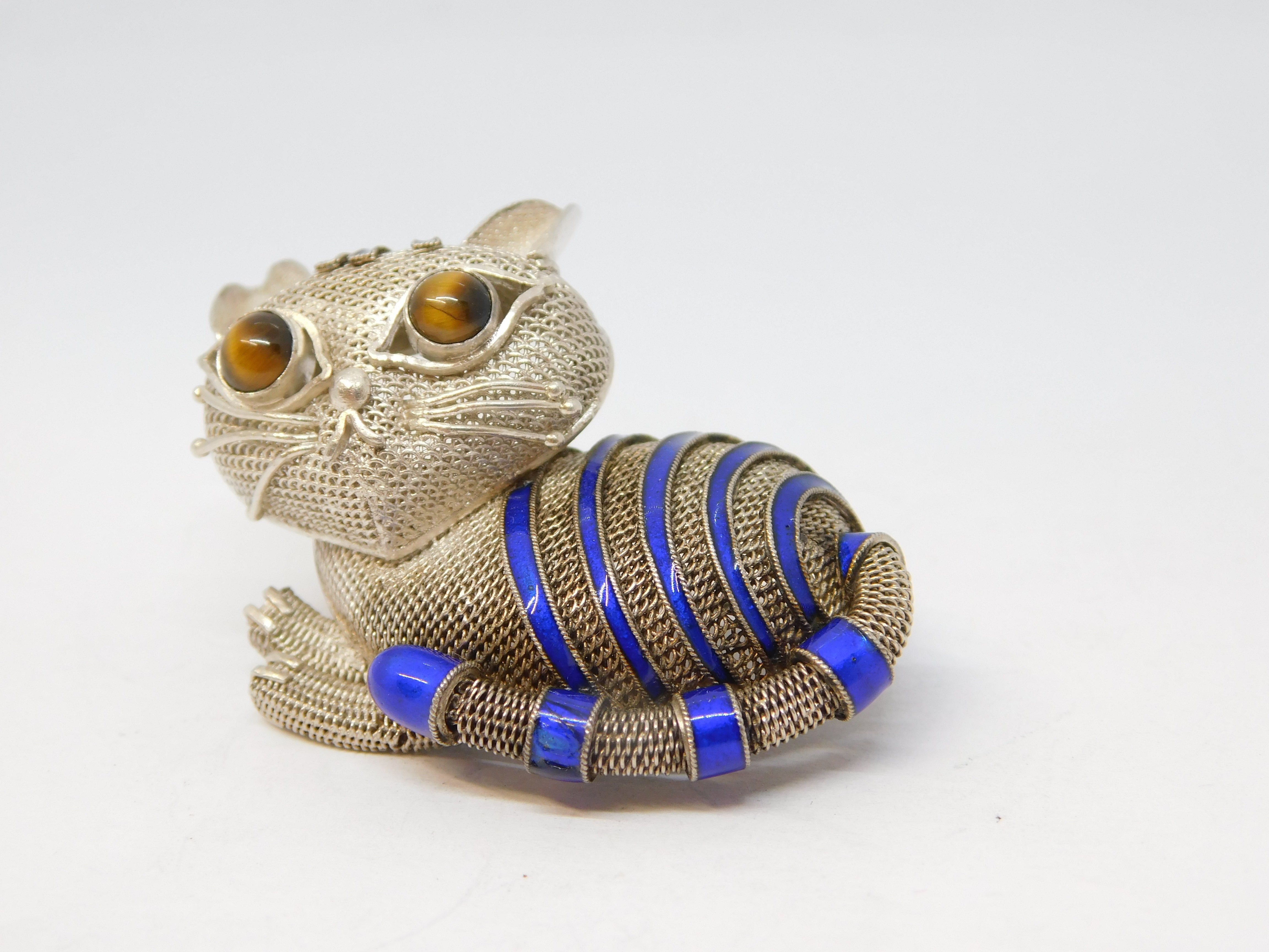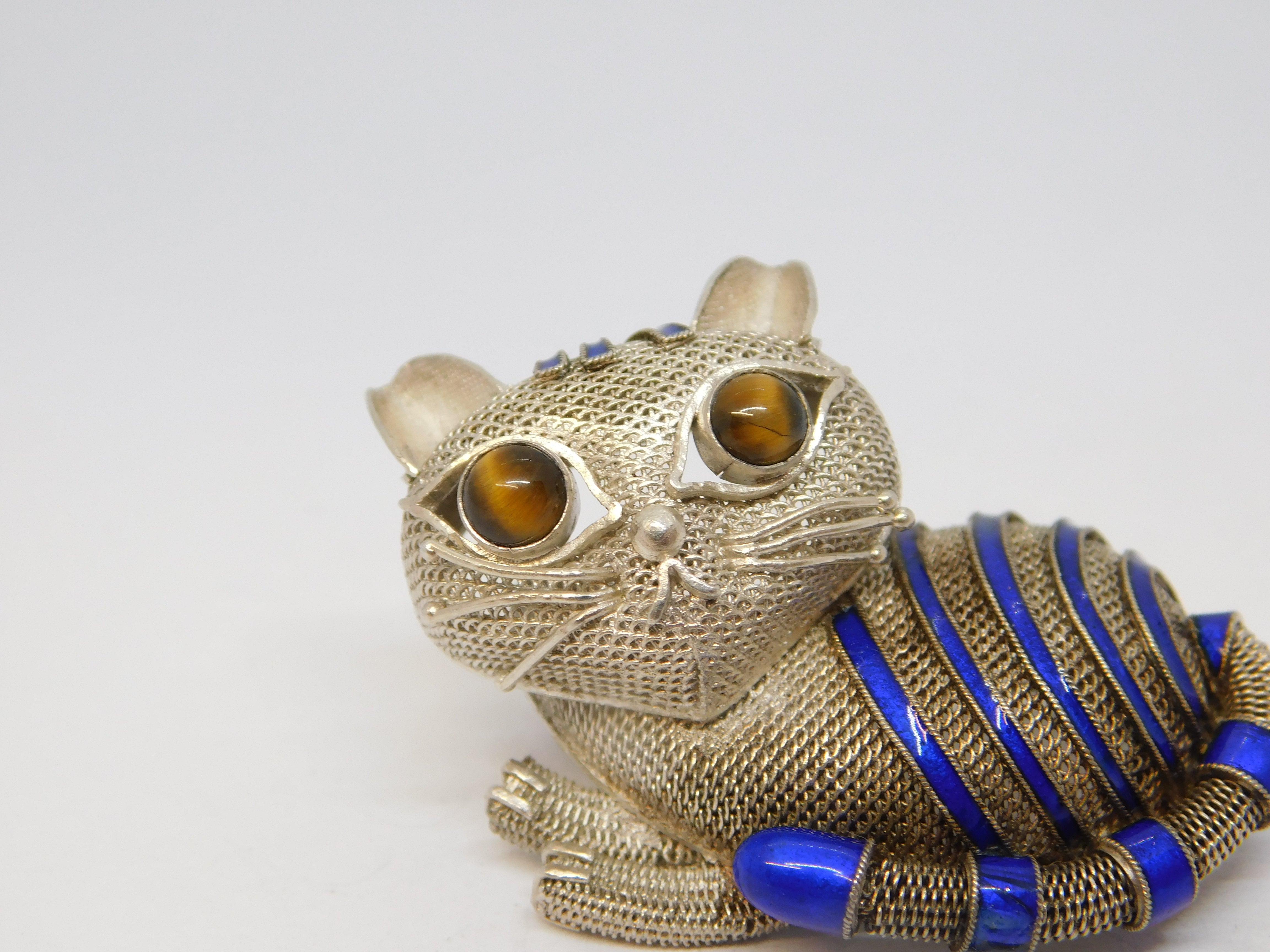 Details: A fantastic and wonderfully designed vintage Chinese sterling silver blue enamel brooch in the form of a sitting cat with blue enamel swirls and lovely tiger's eye cabochons set to the eyes hallmarked to the reverse c1960. This is a wonderful item that would make a perfect gift or addition to any collection. The BOX pictured is for PRESENTATION ONLY and is NOT included in the listings but used to frame the pictures unless specifically stated otherwise.