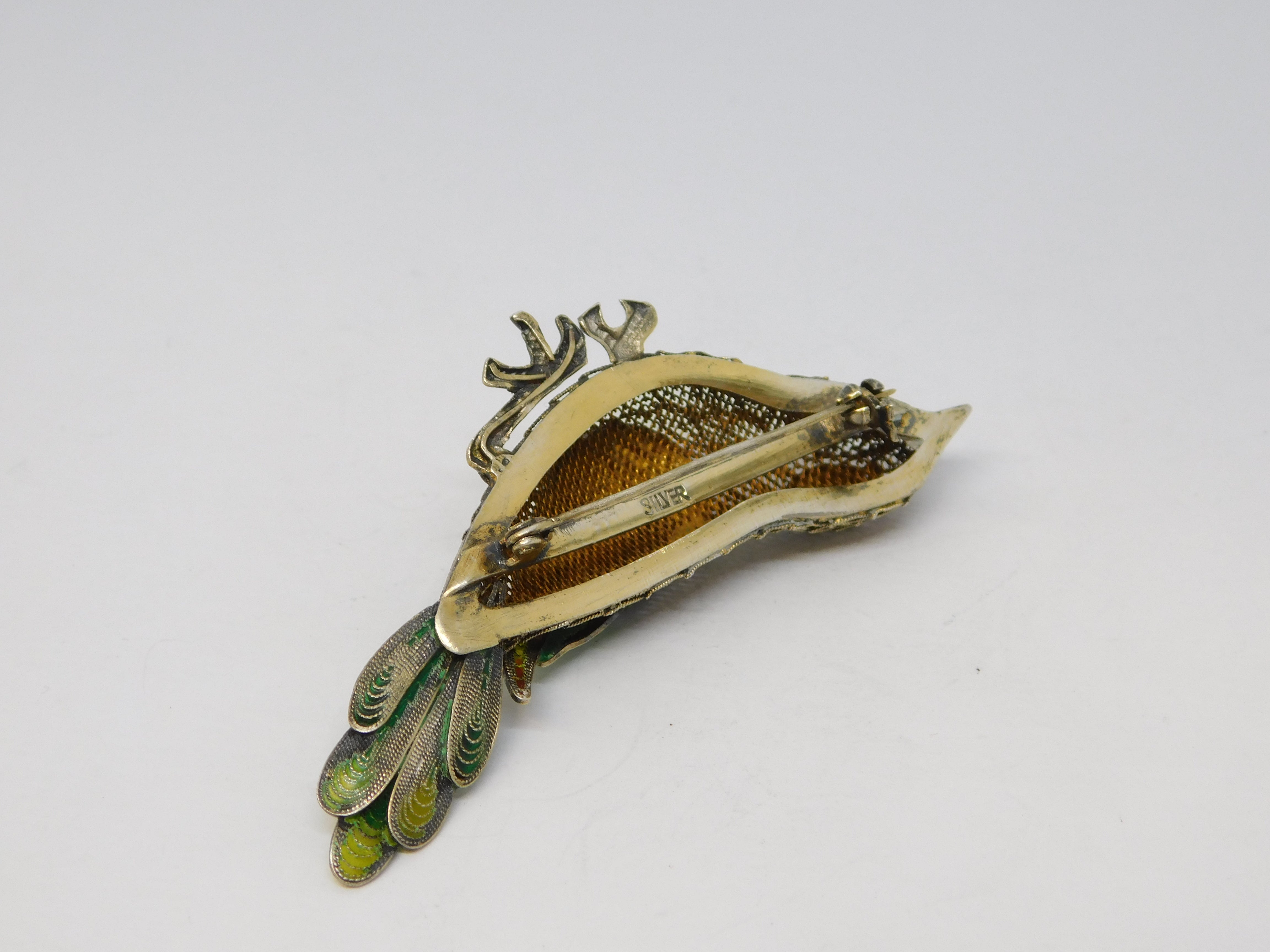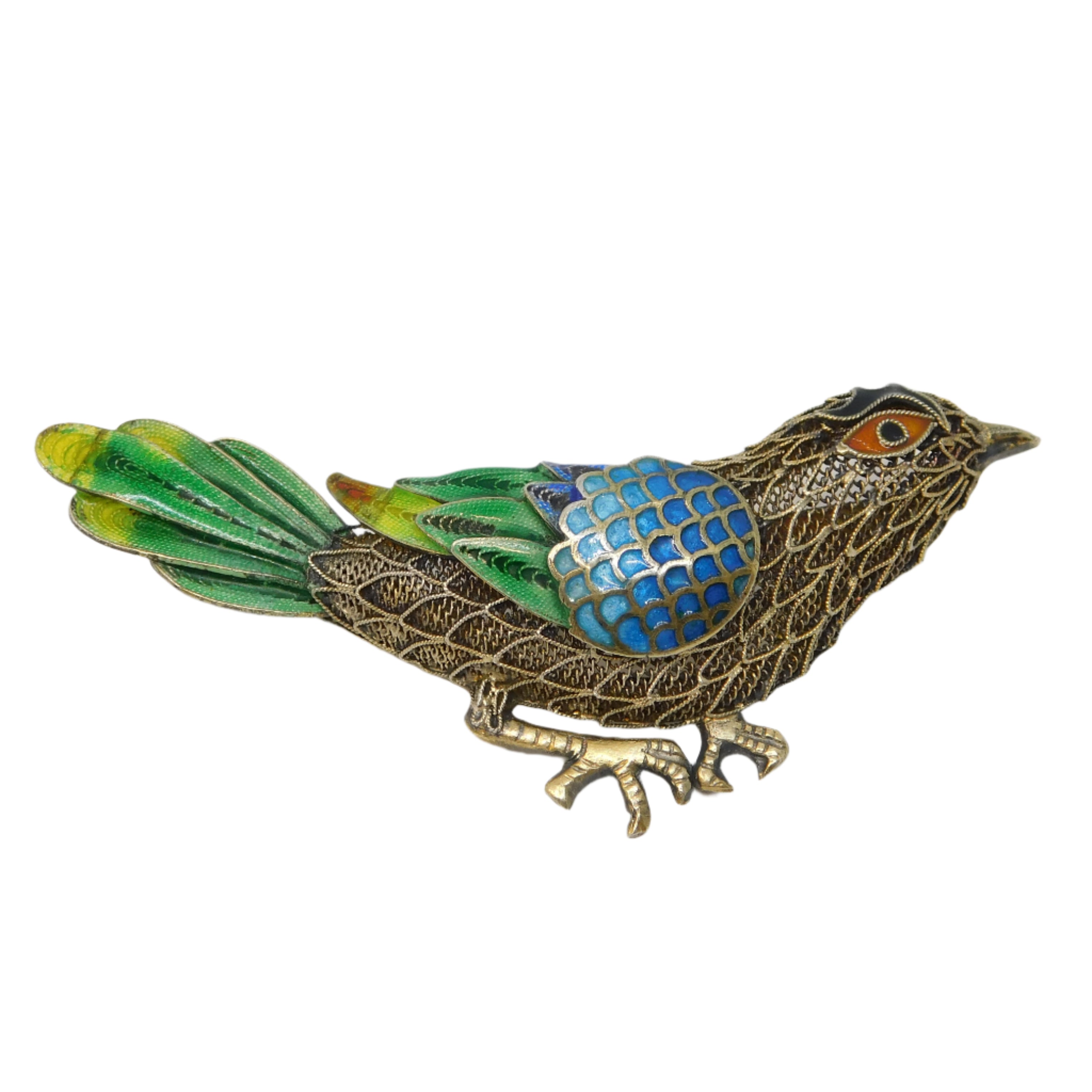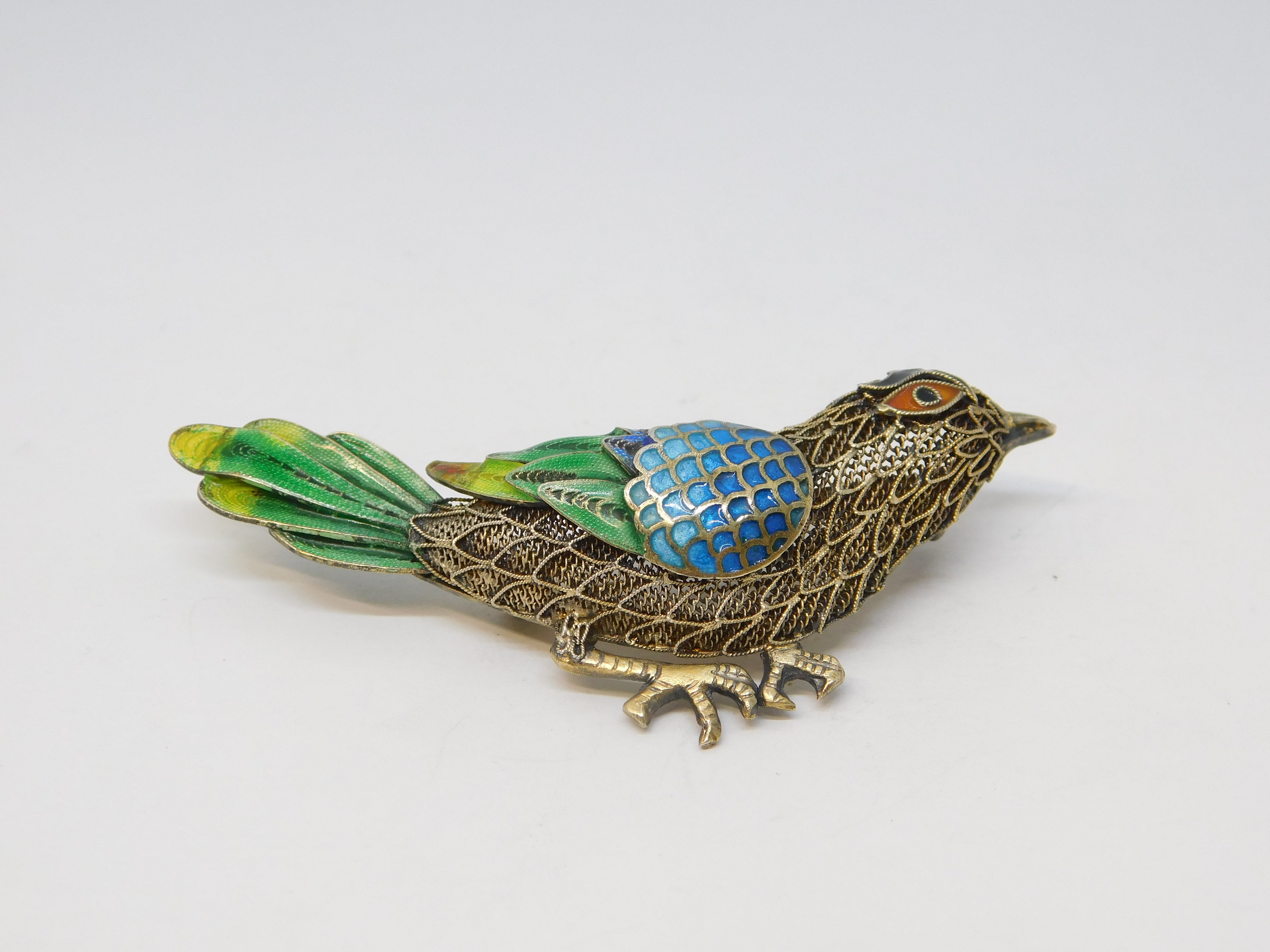 Chinese Sterling Silver Gilt & Enamel Bird Sweetheart Brooch Vintage c1950