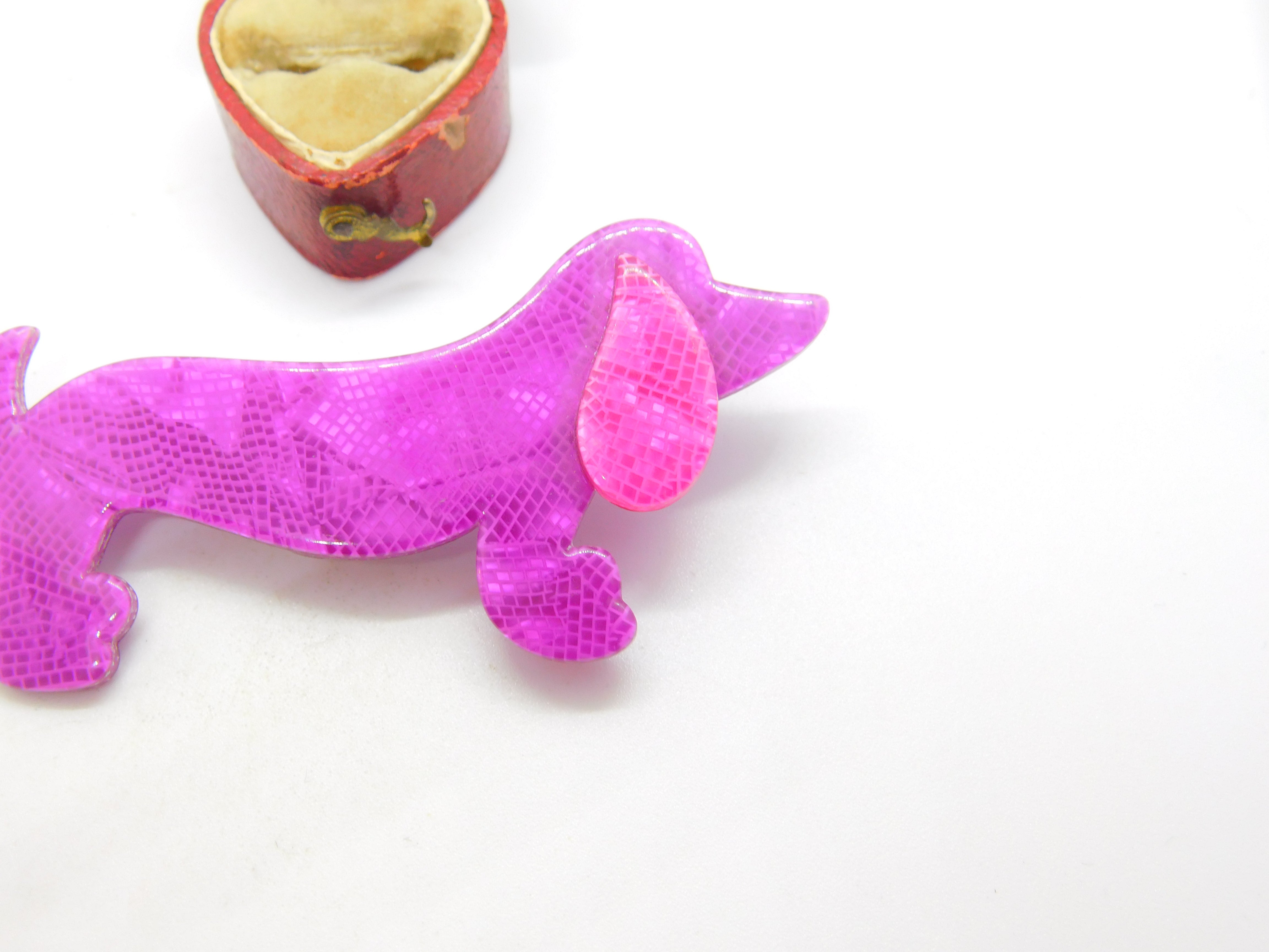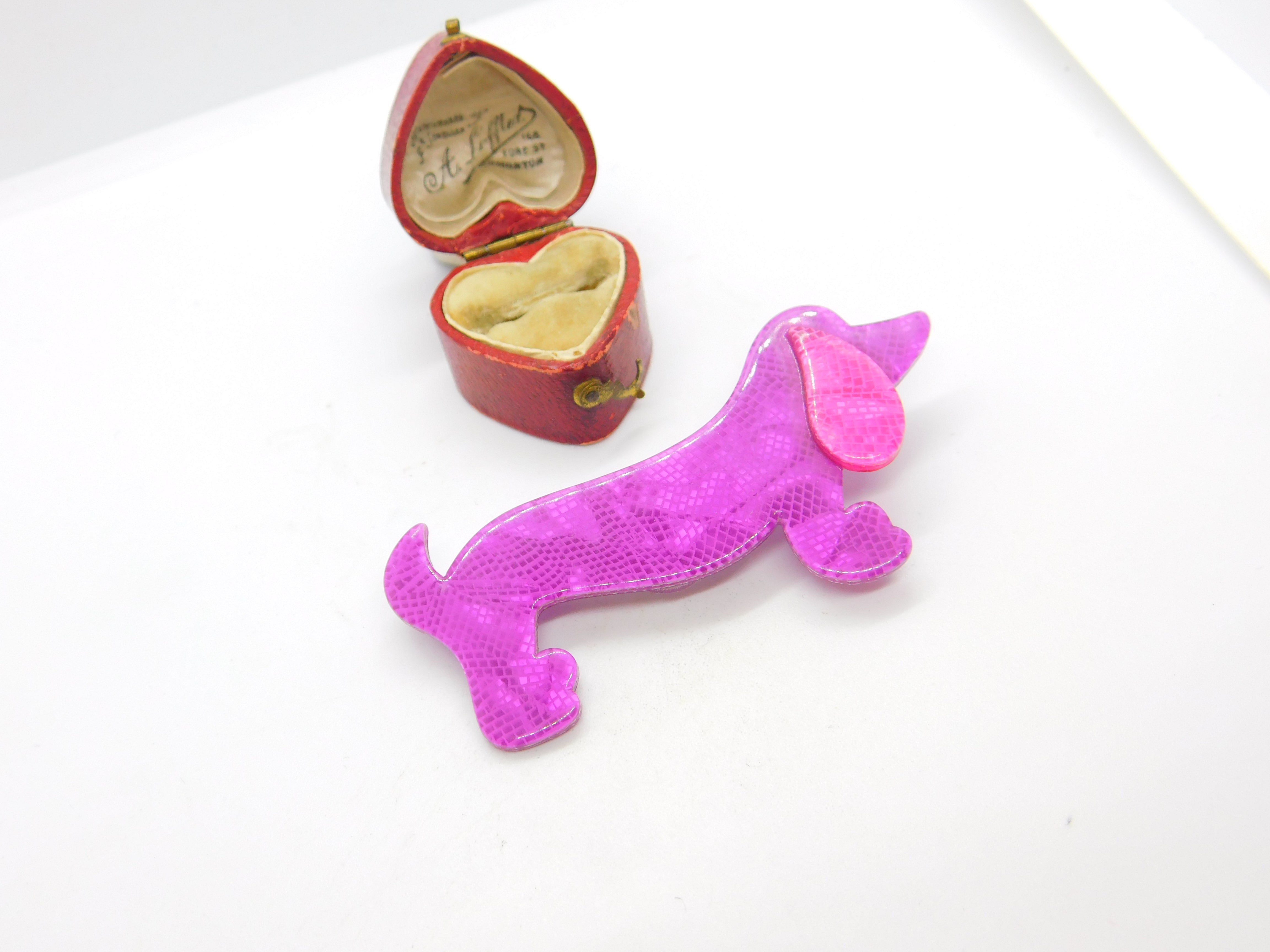 Dachshund Sausage Dog Lea Stein Paris Brooch Pin Vintage c1960. Simply iconic, this is a wonderful and very collectable Lea Stein of Paris brooch or pin of a daschund sausage dog dating from the 1960's.