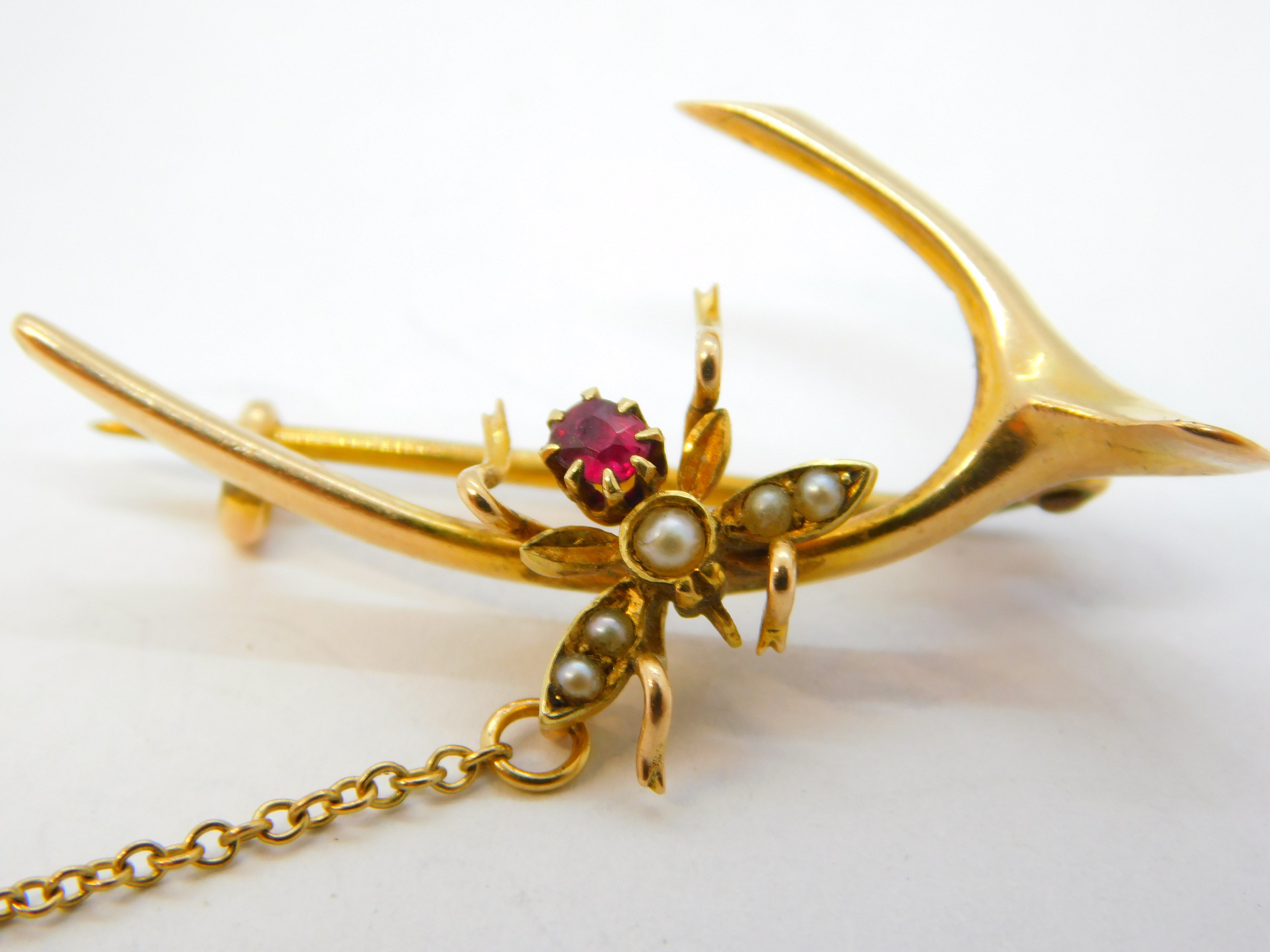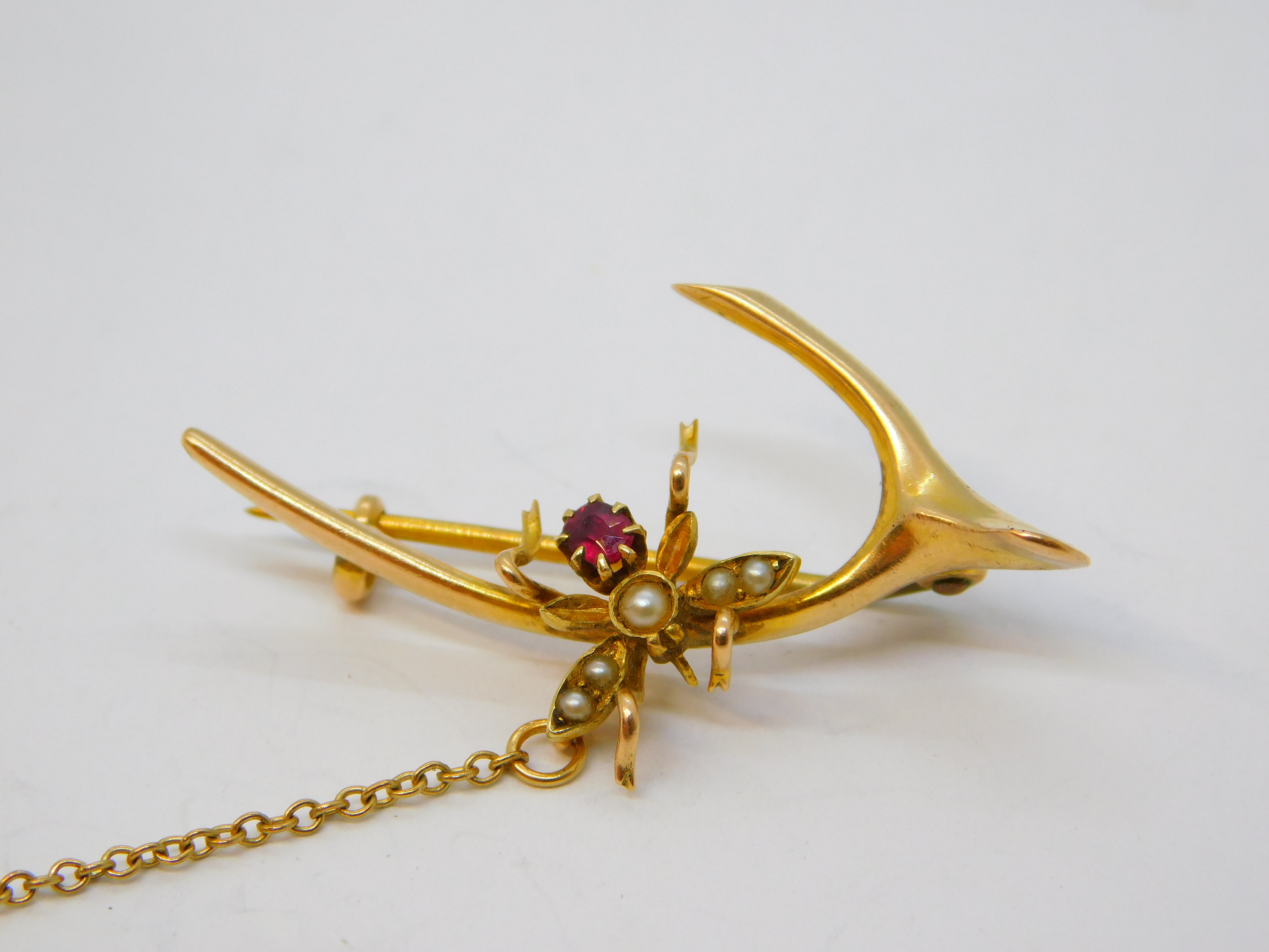 Edwardian 15ct Yellow Gold, Ruby & Seed Pearl Insect Wishbone Brooch Antique c1910