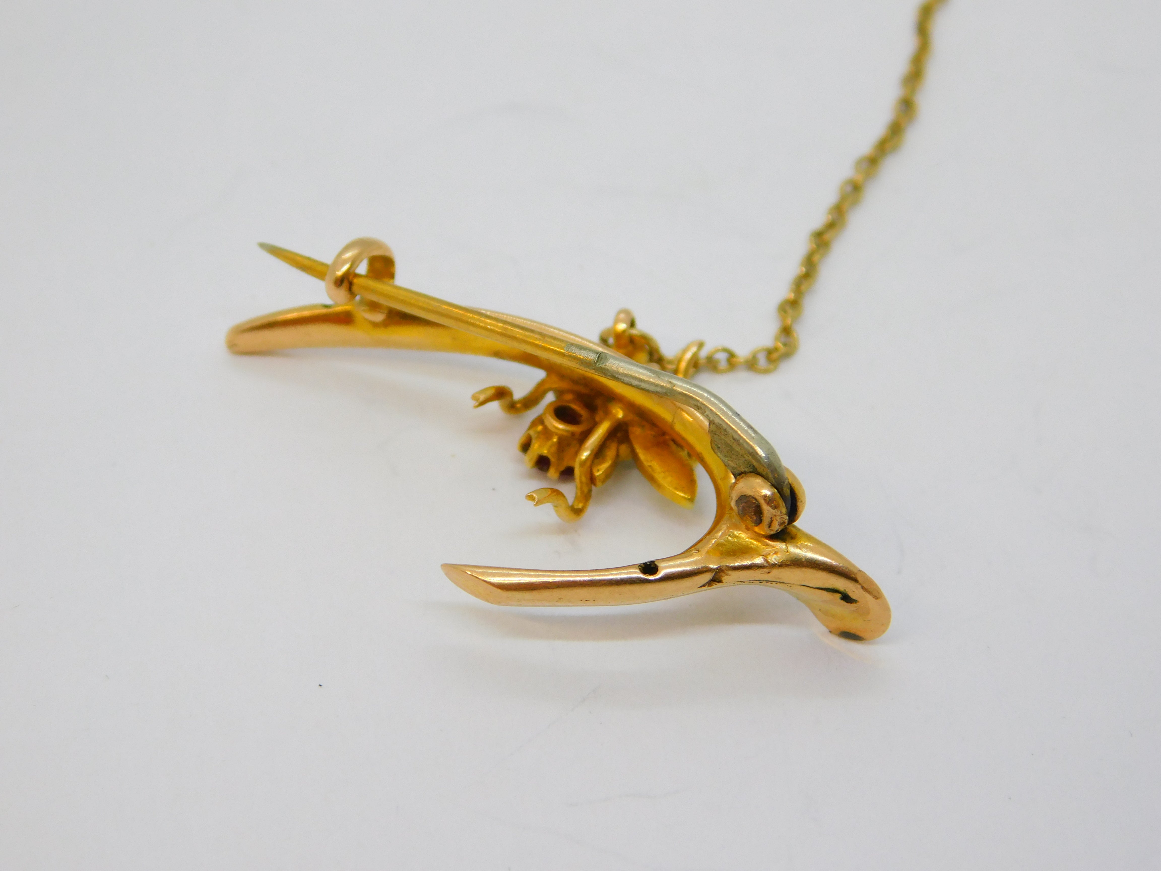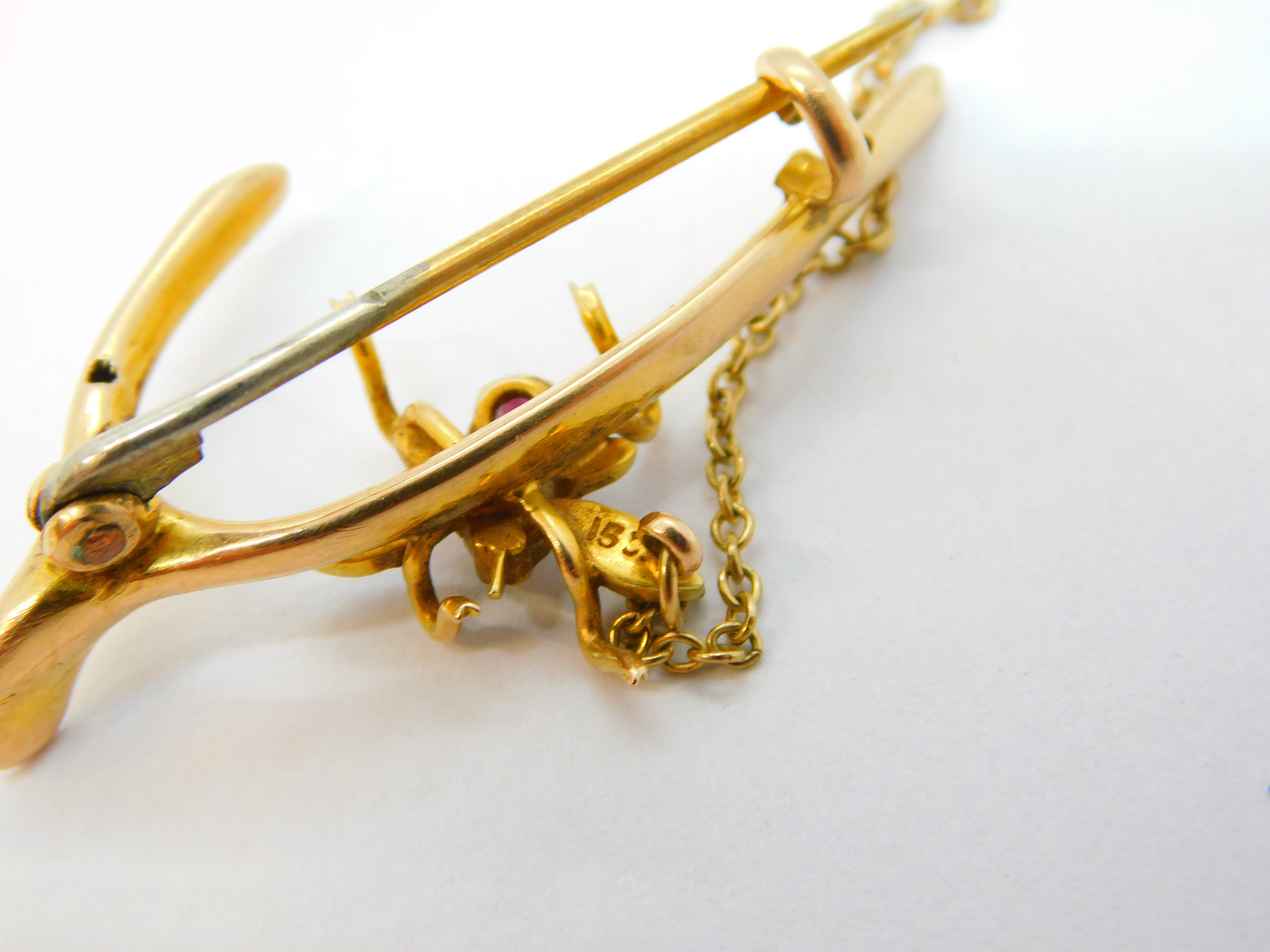 Details: A fantastic and wonderfully designed antique Edwardian 15ct yellow gold sweetheart brooch in the form of a wishbone with little insect to the edge, set with ruby and seed pearls hallmarked to the reverse c1910. This is a wonderful item that would make a perfect gift or addition to any collection. We are more than happy to provide XRF reports for items upon request.