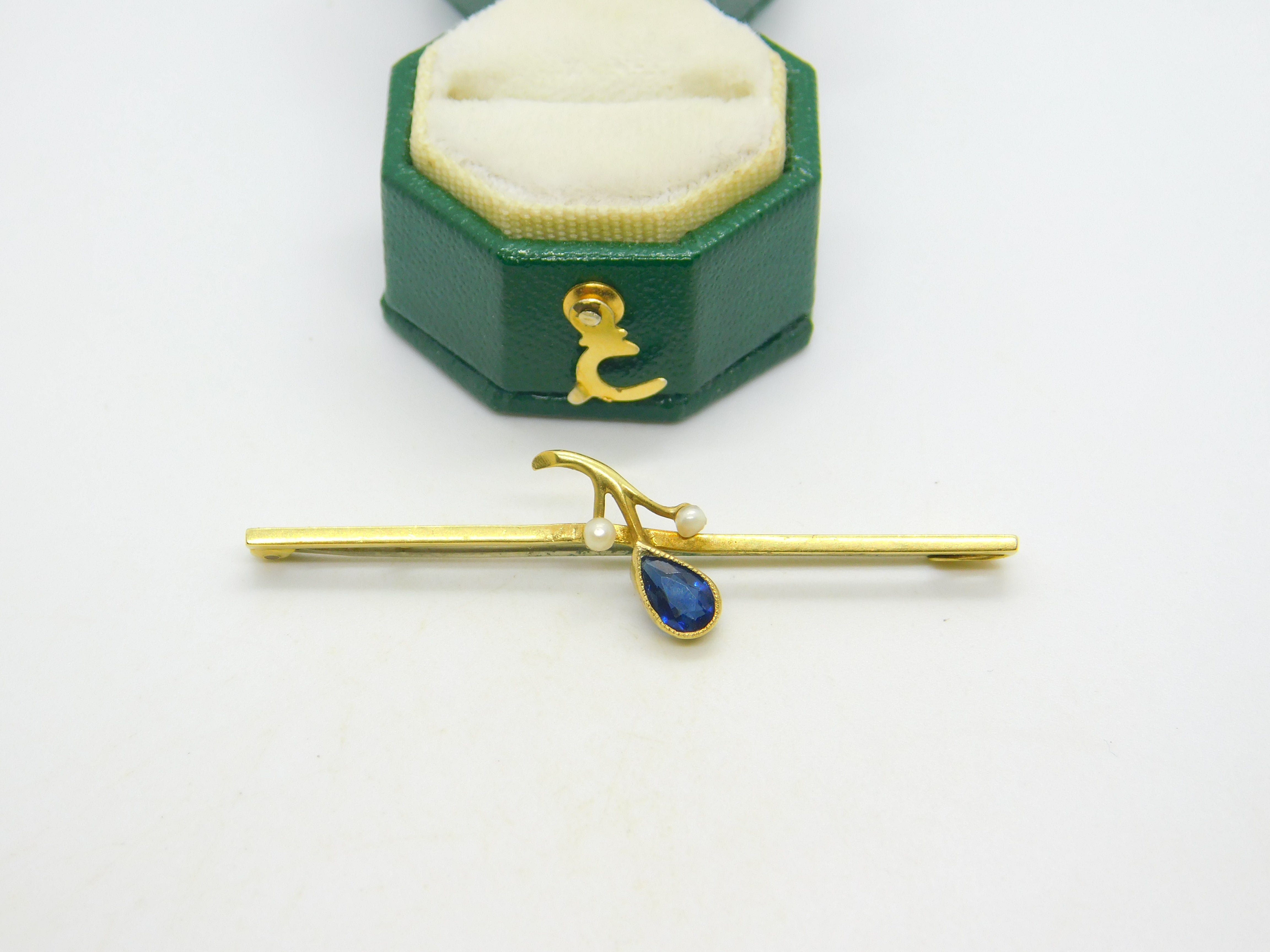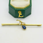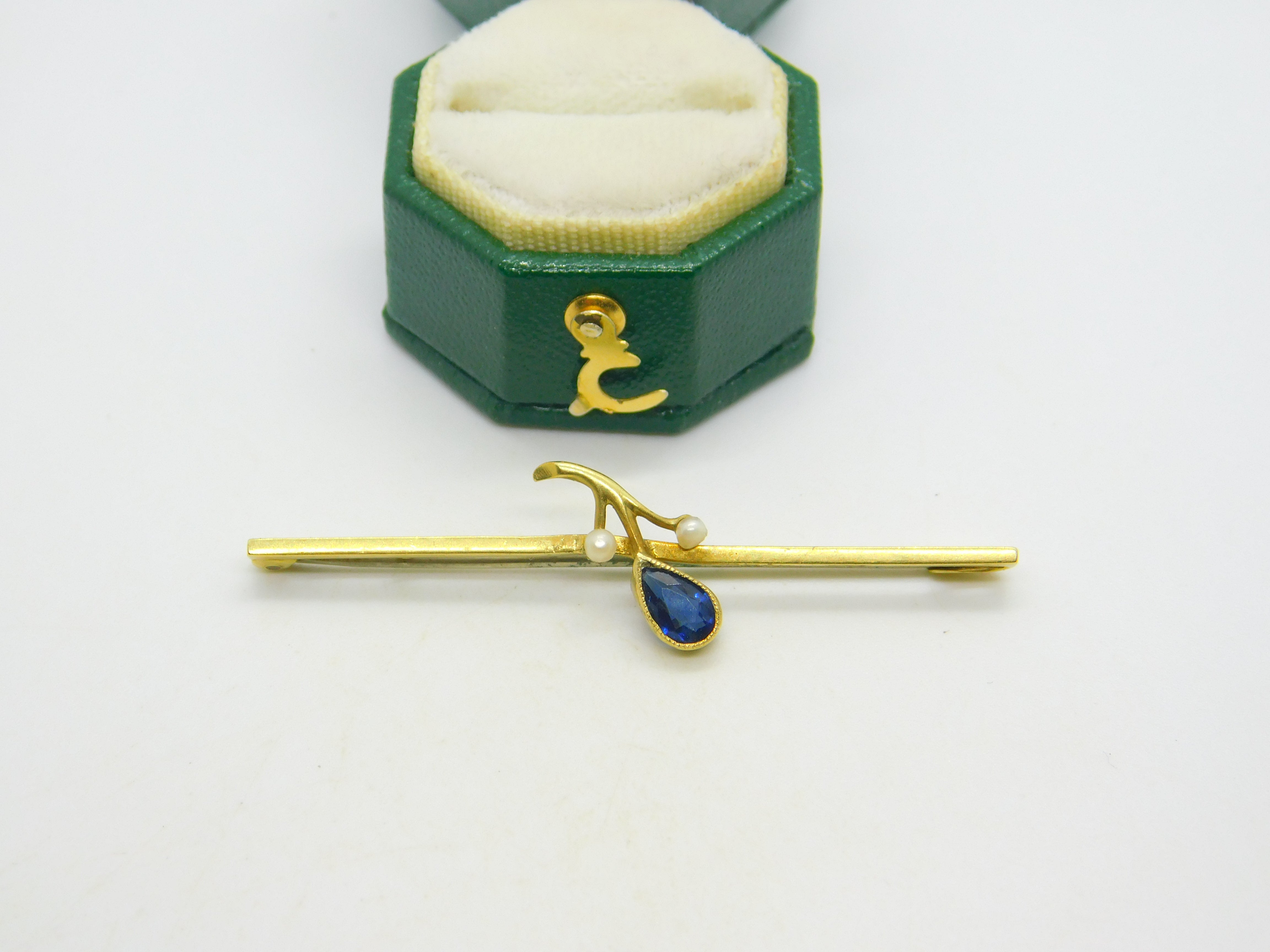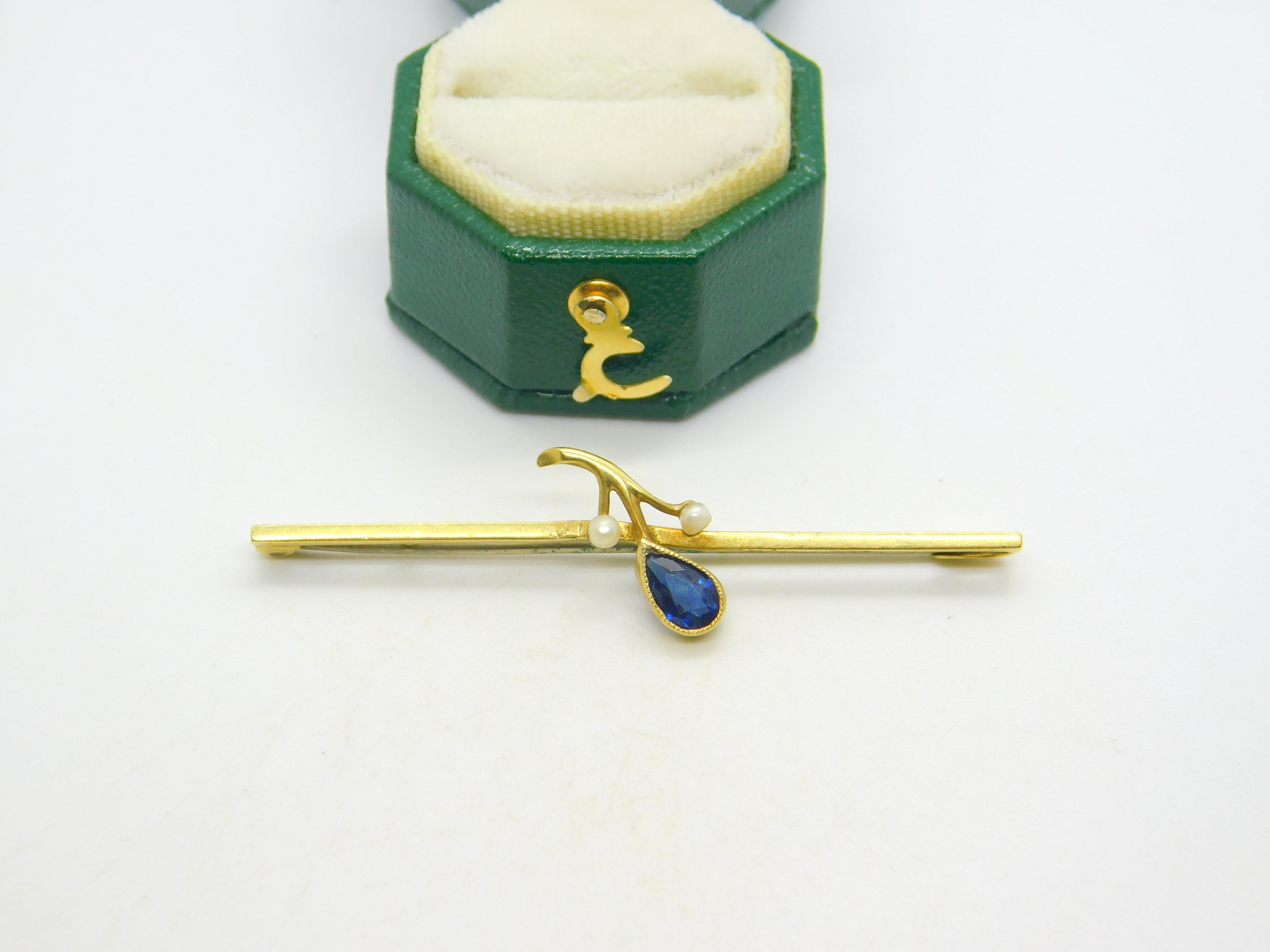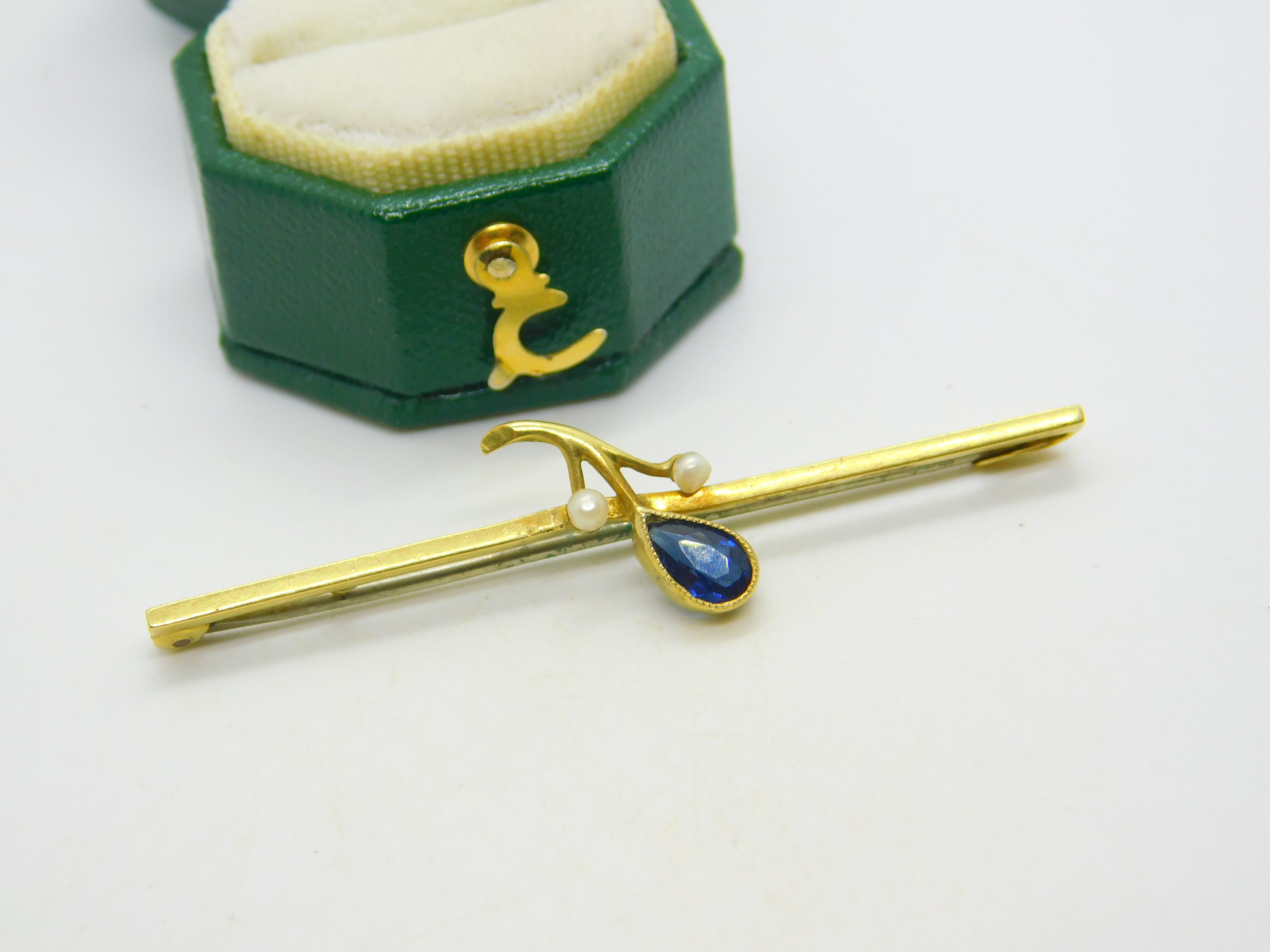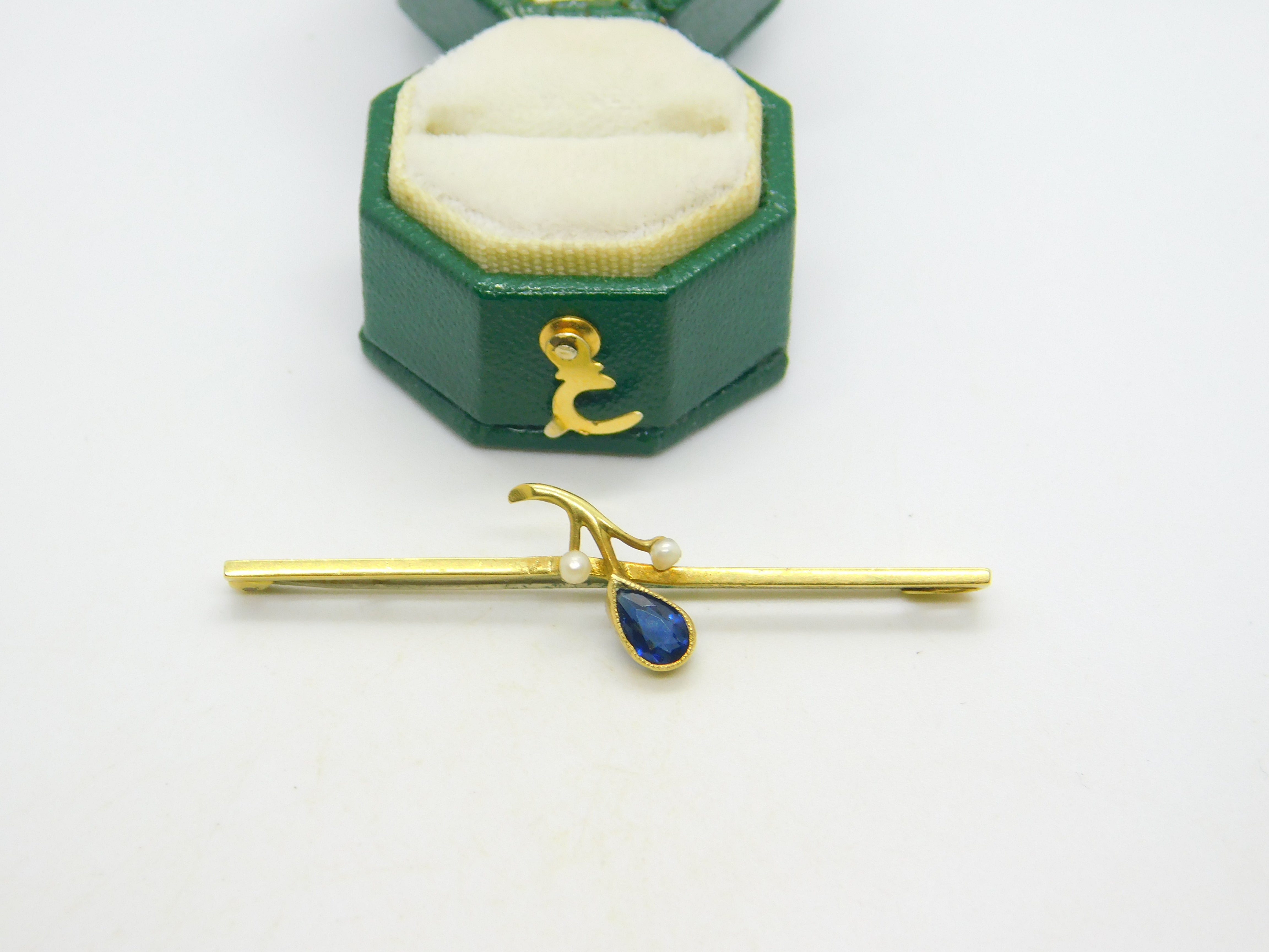 Edwardian 15ct Yellow Gold, Sapphire & Seed Pearl Sweetheart Brooch Antique c1910