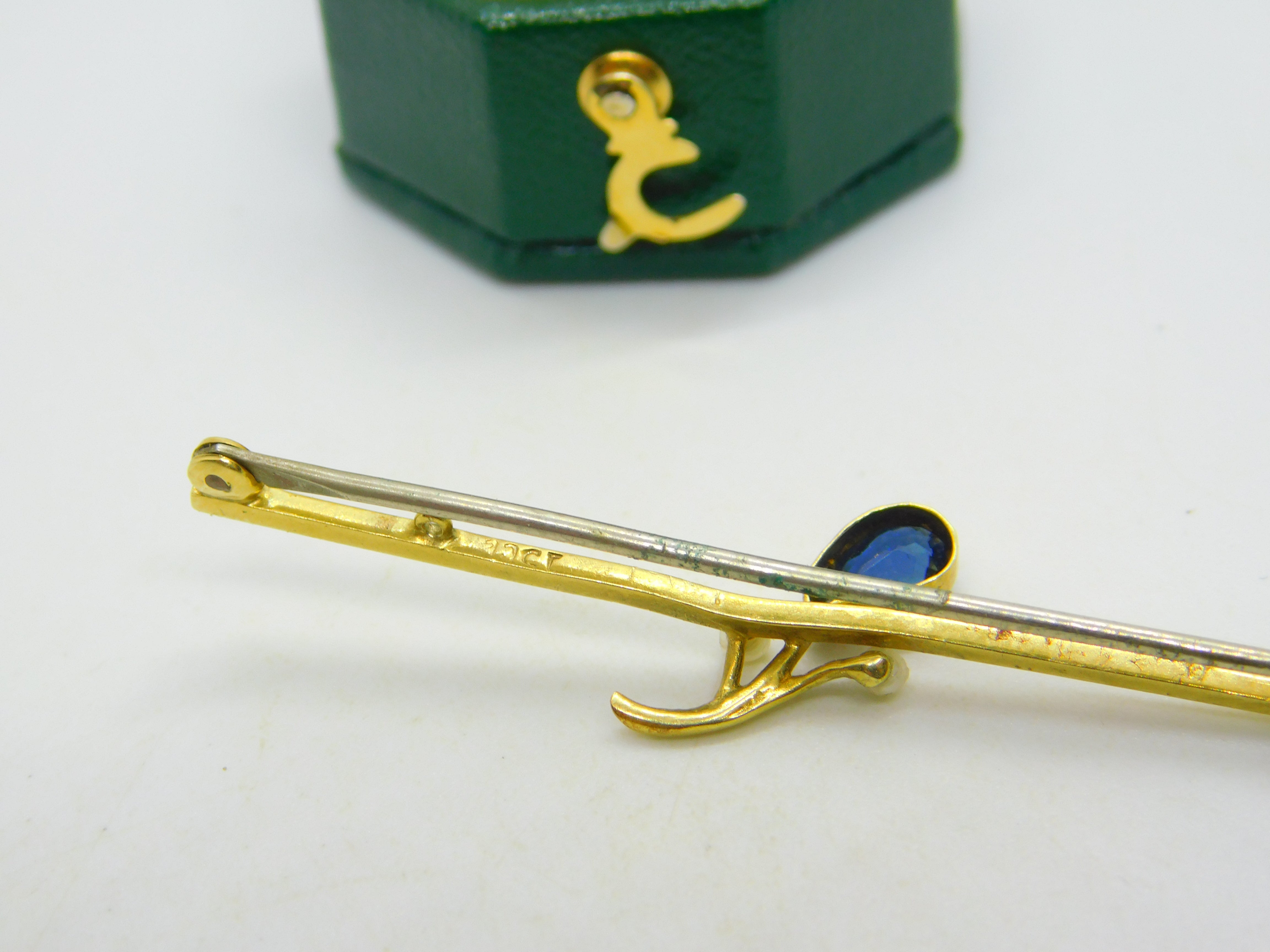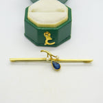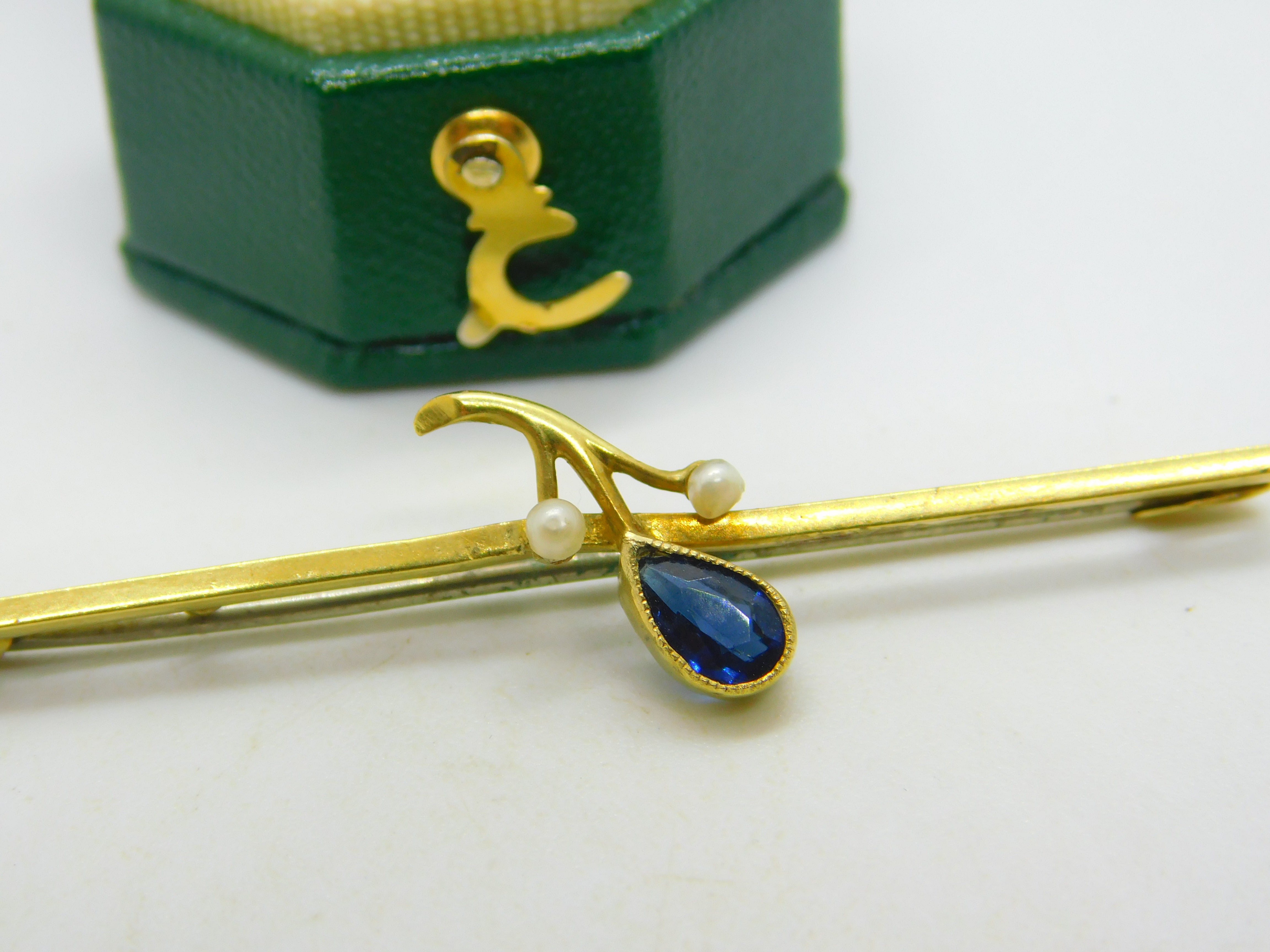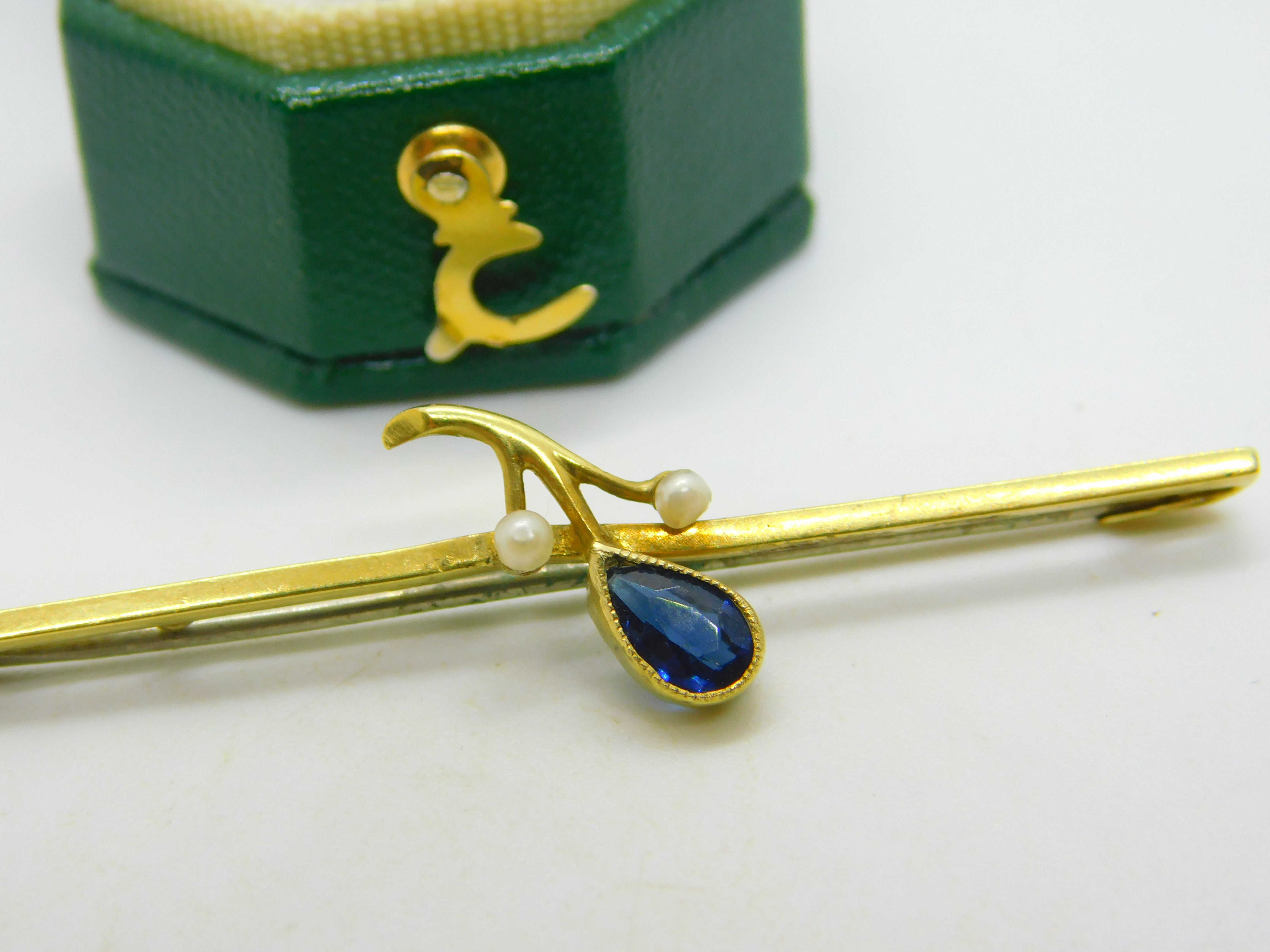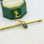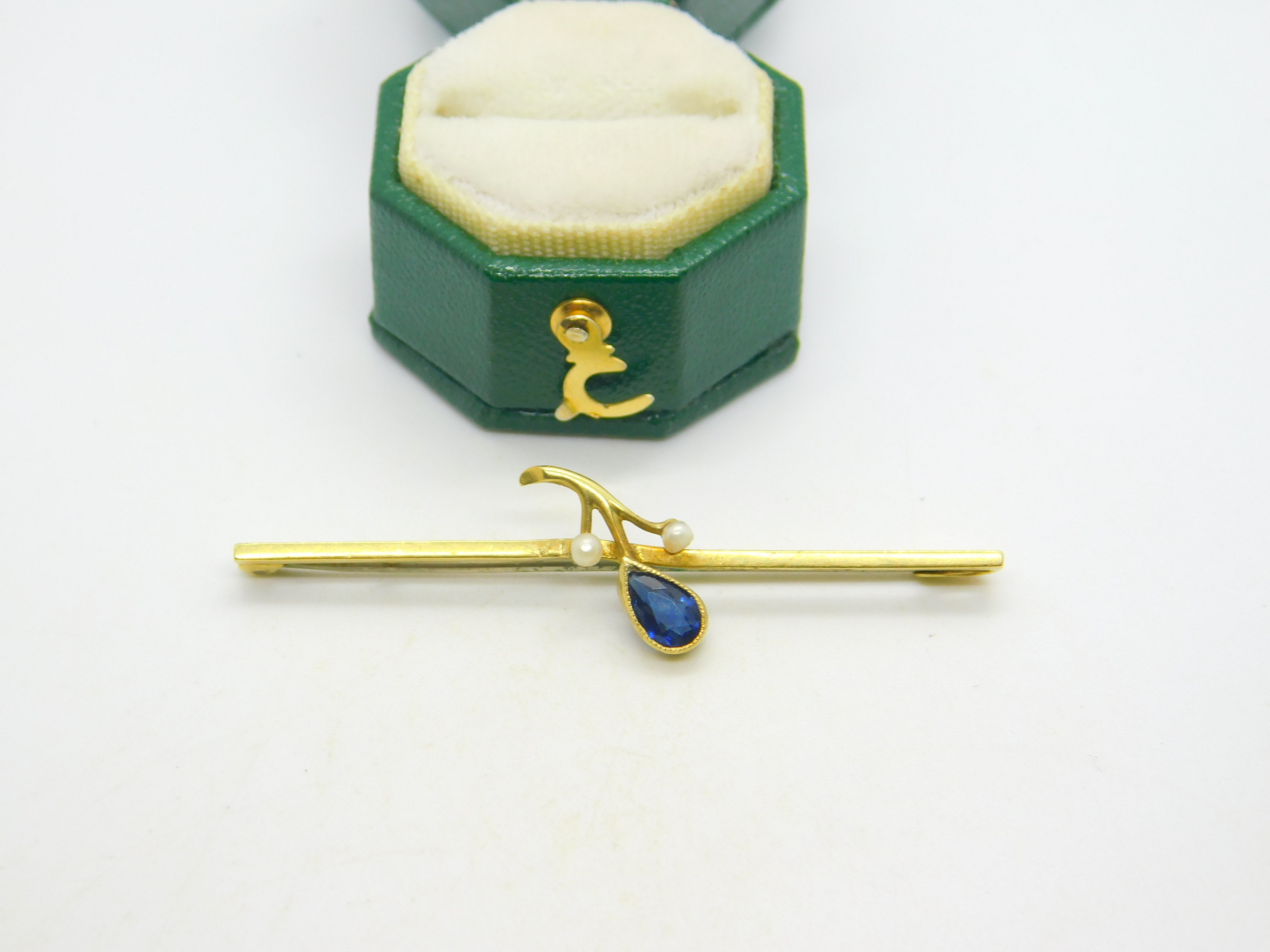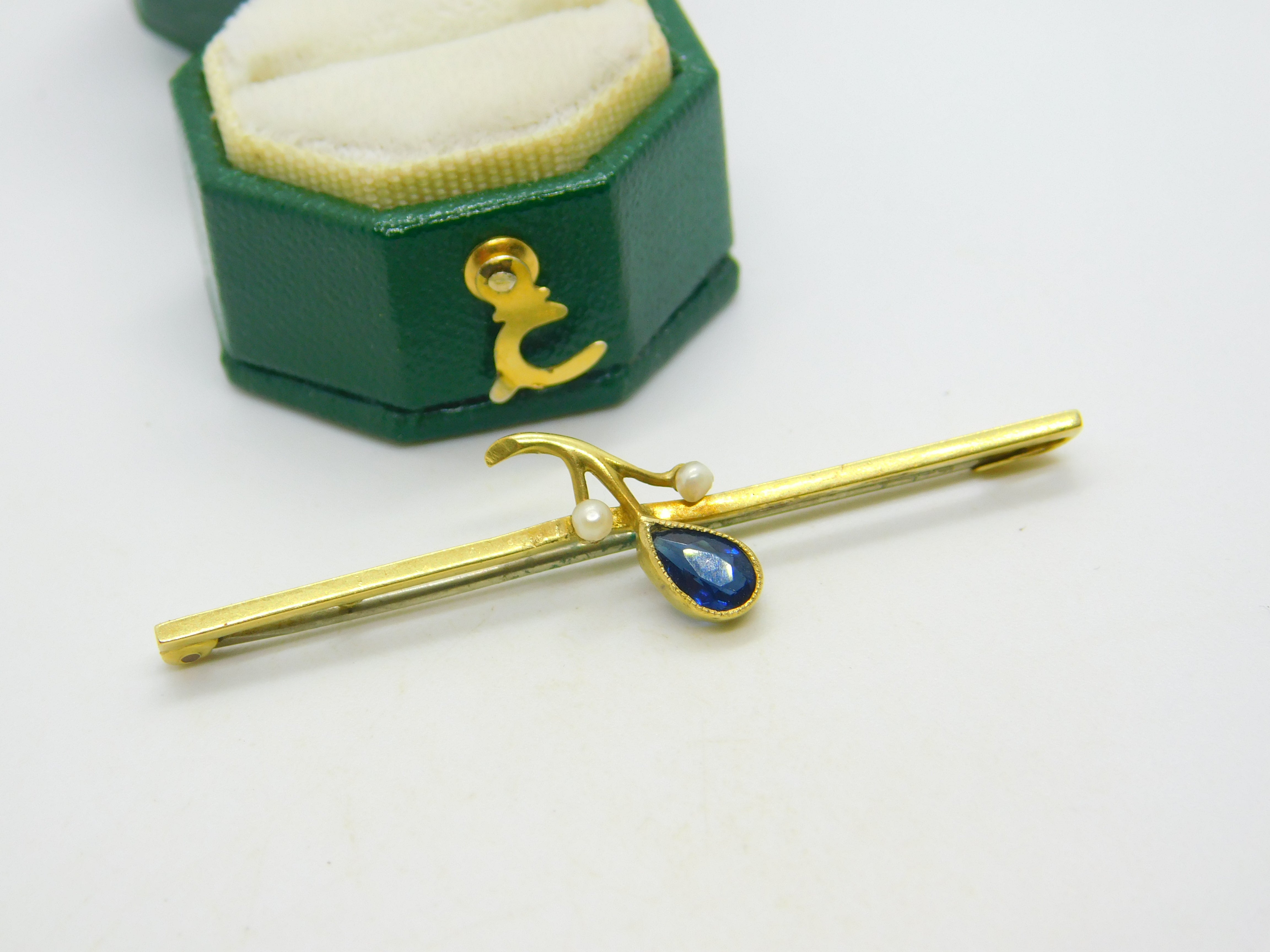 Edwardian 15ct Yellow Gold, Sapphire & Seed Pearl Sweetheart Brooch Antique c1910