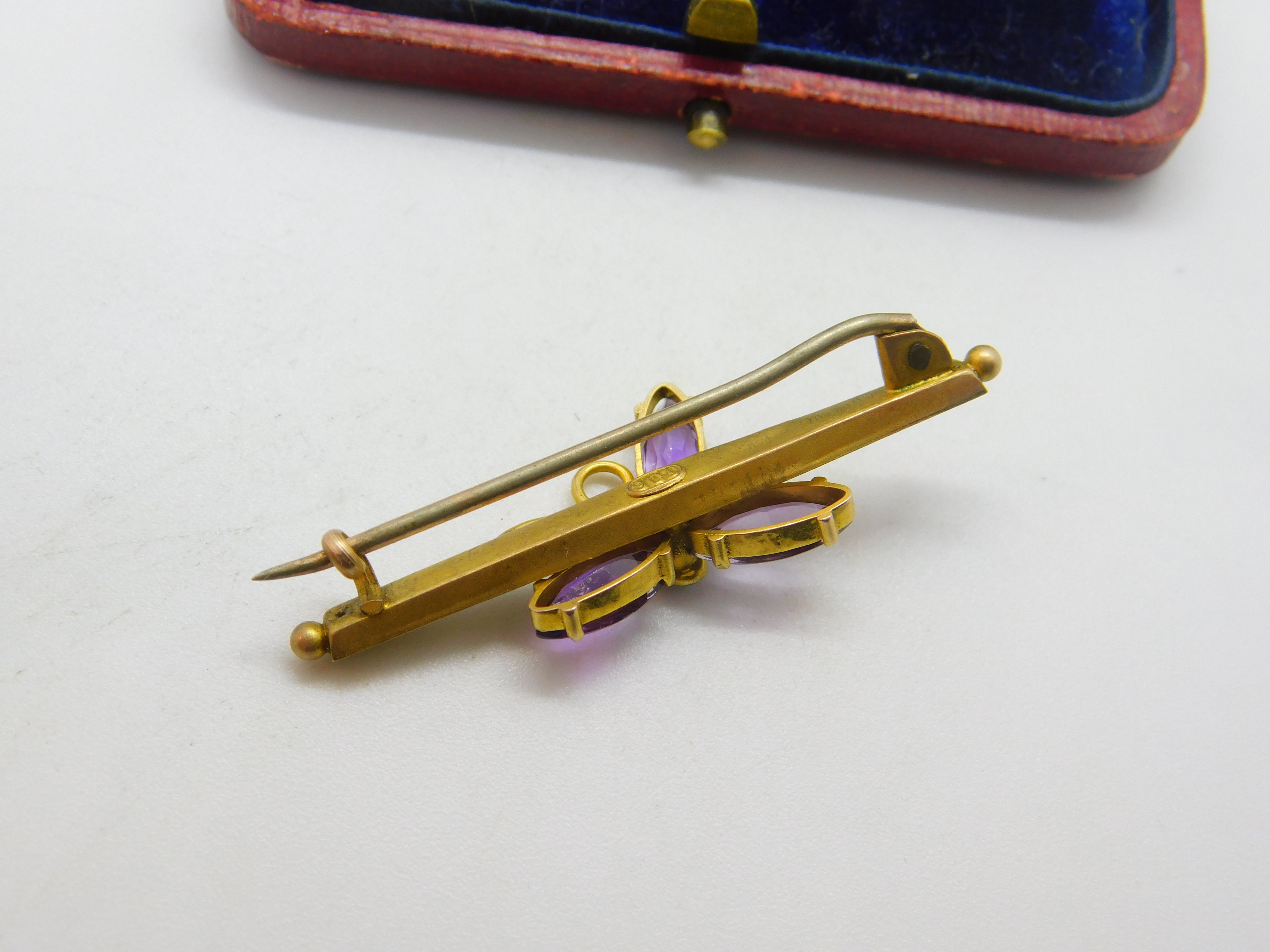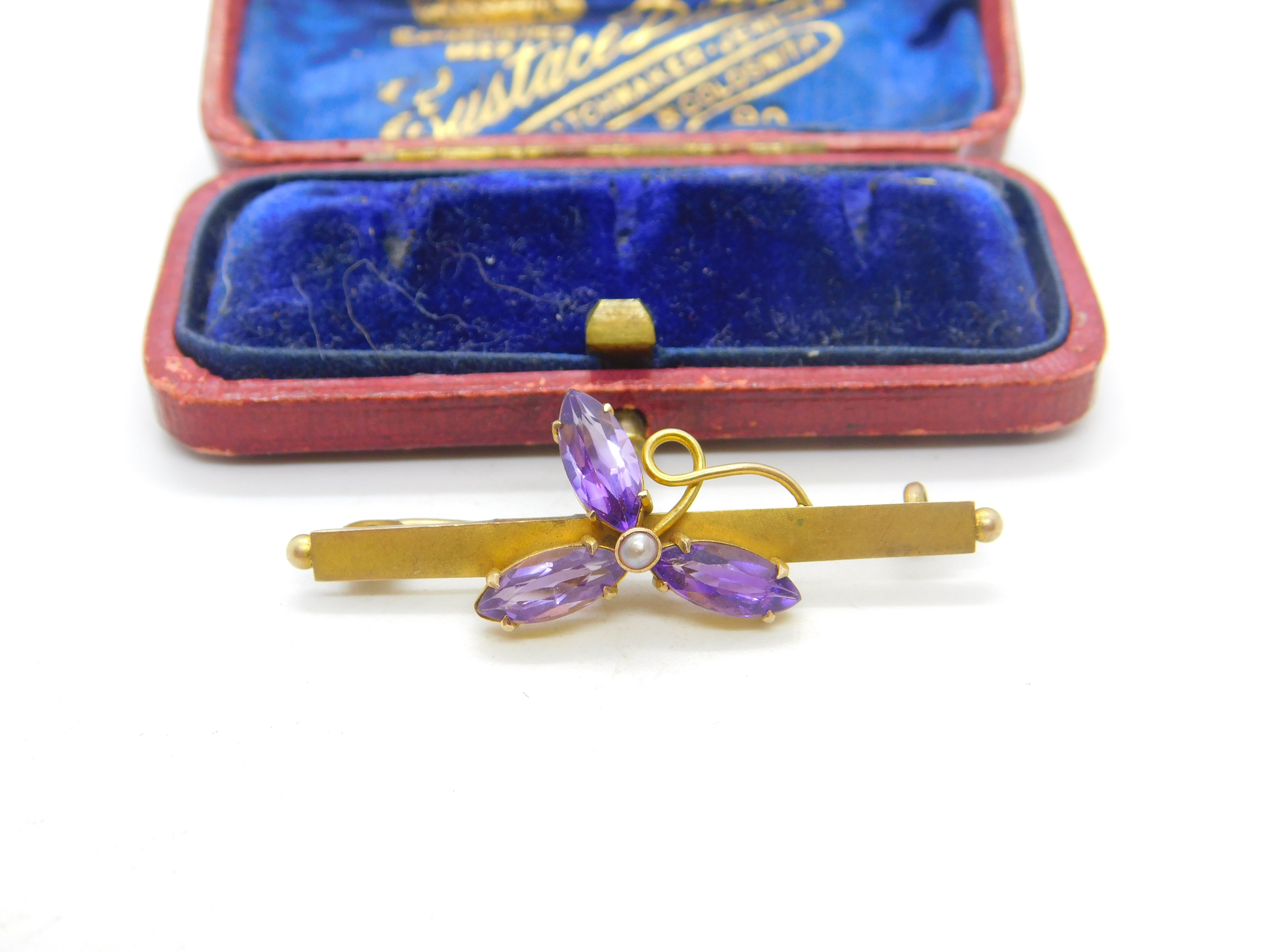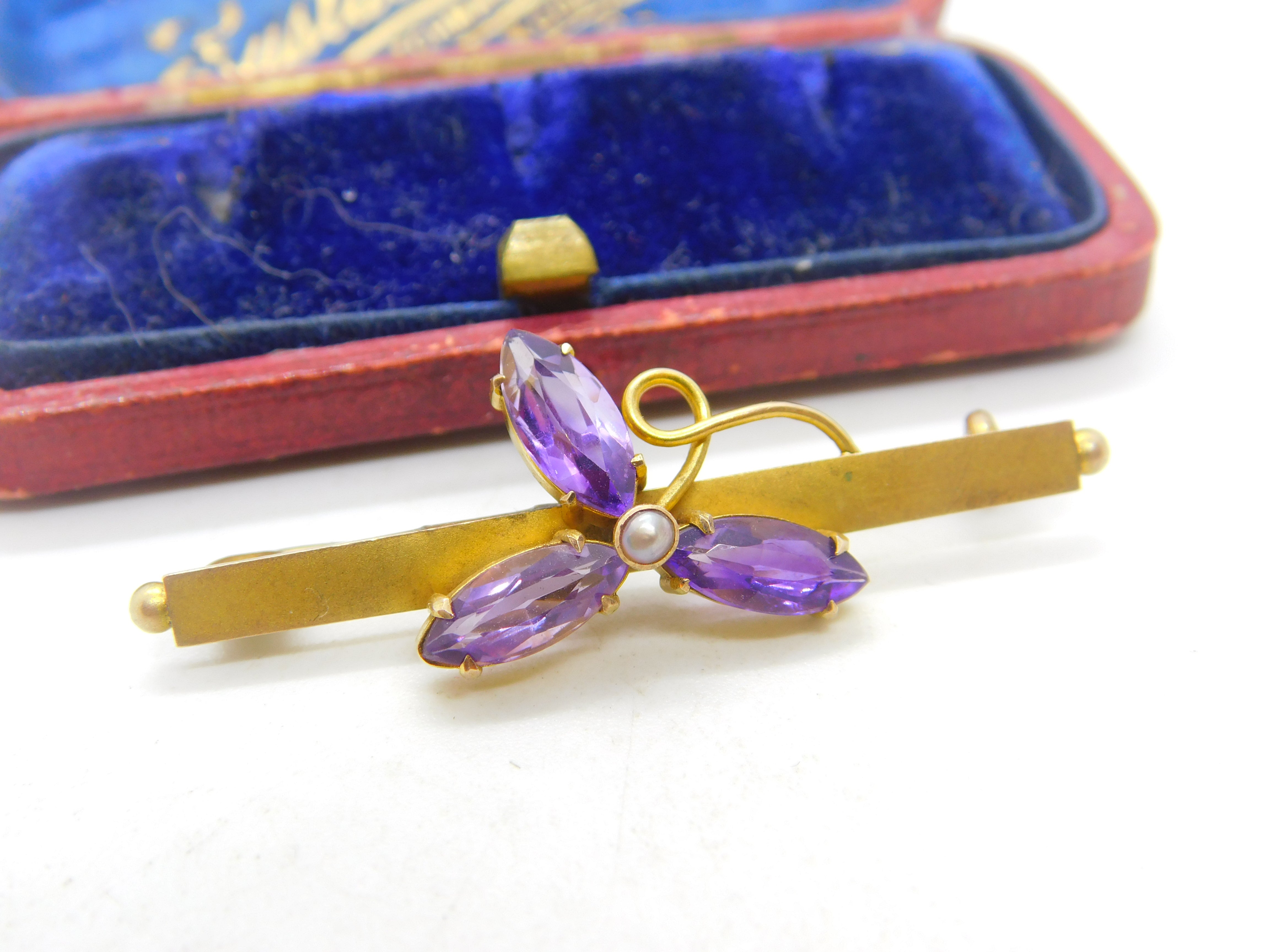 Edwardian 9ct Gold, Amethyst & Pearl Set Shamrock Brooch Antique c1910