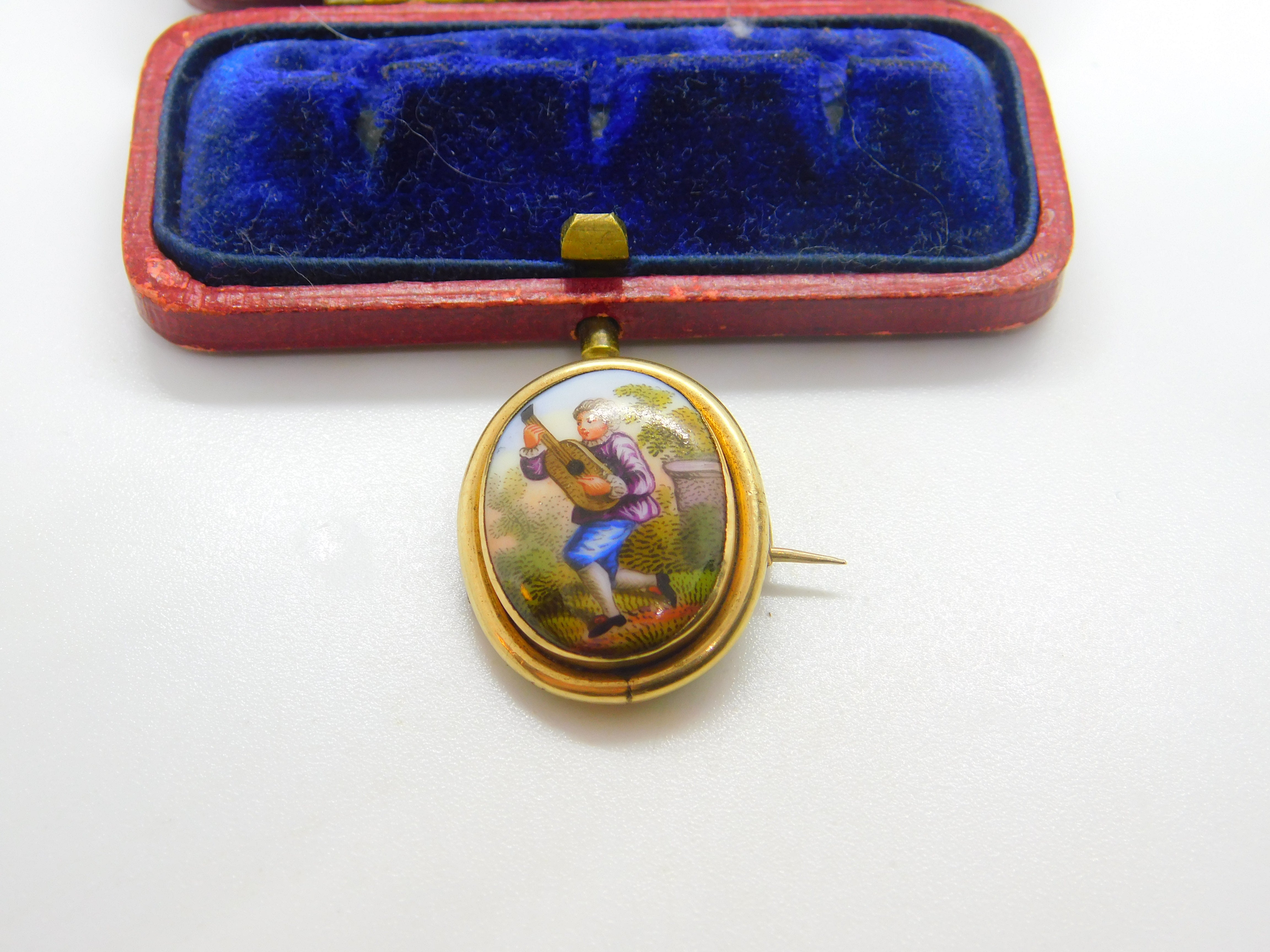 Edwardian 9ct Yellow Gold Brooch with Painted Porcelain Lute Player c1910