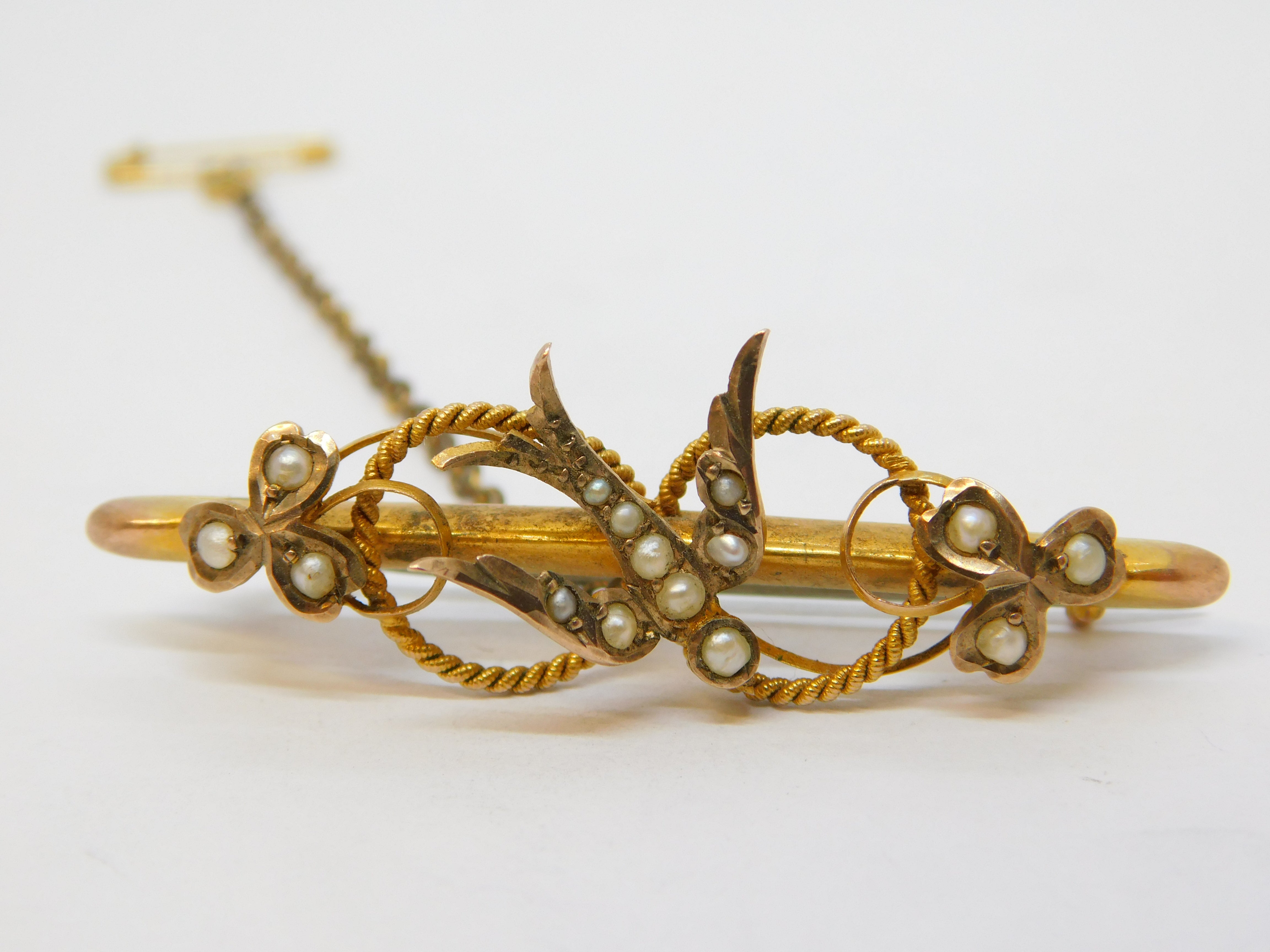 Details: A fantastic and wonderfully designed antique Edwardian 9ct yellow gold swallow sweetheart brooch set with seed pearls hallmarked Chester 1908 to the reverse. This is a wonderful item that would make a perfect gift or addition to any collection.
