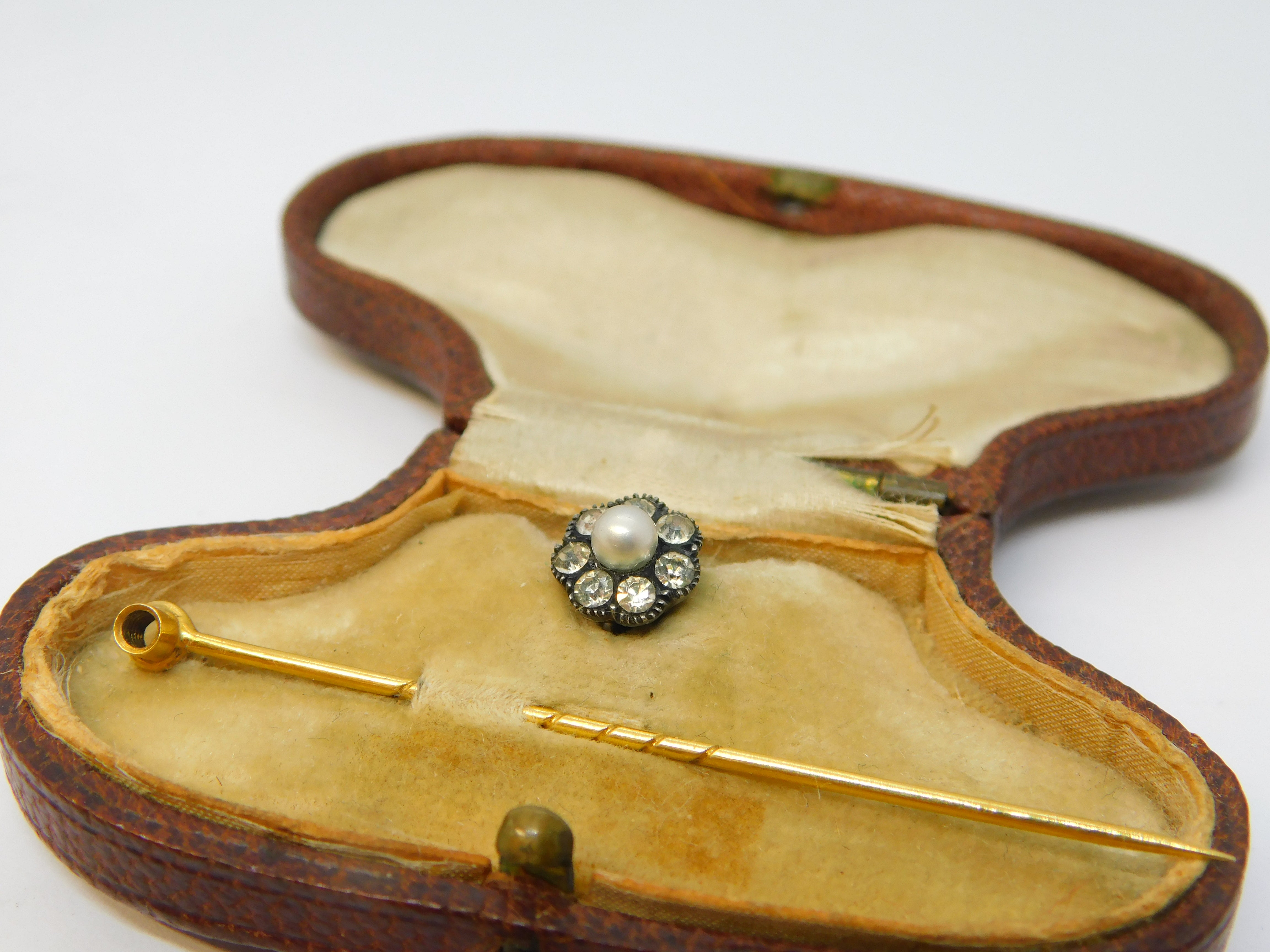 Details: A fantastic and wonderfully designed antique Edwardian boxed 9ct yellow gold adjustable stick pin and collar stud set with paste & pearl set floral detailing hallmarked to both aspects c1910. This is a wonderful item that would make a perfect gift or addition to any collection.