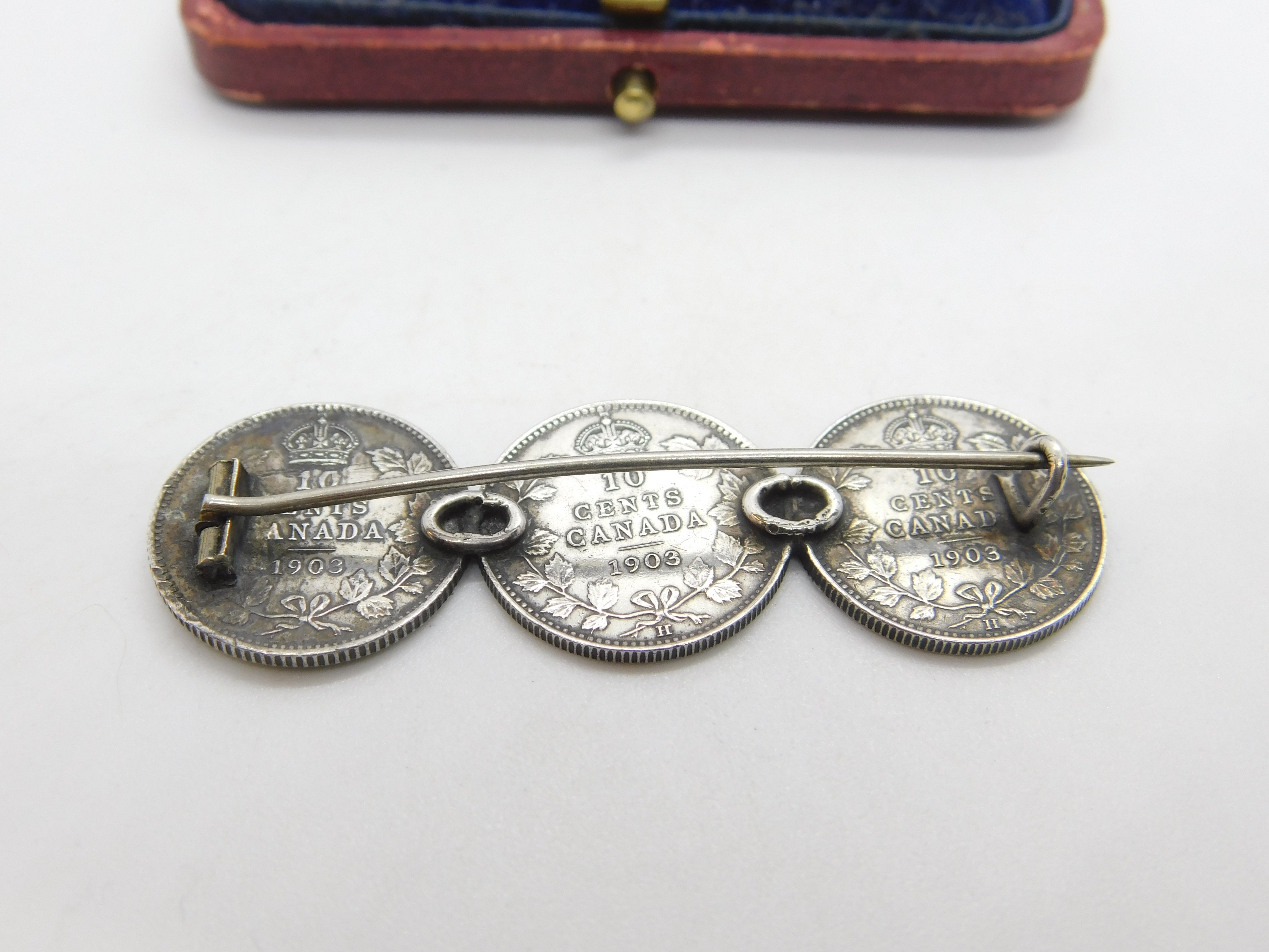 Details: A fantastic and wonderfully designed antique Edwardian sterling silver Canadian 10 cents coin brooch with lovely detailing dated 1903. This is a wonderful item that would make a perfect gift or addition to any collection. The BOX pictured is for PRESENTATION ONLY and is NOT included in the listings but used to frame the pictures unless specifically stated otherwise.