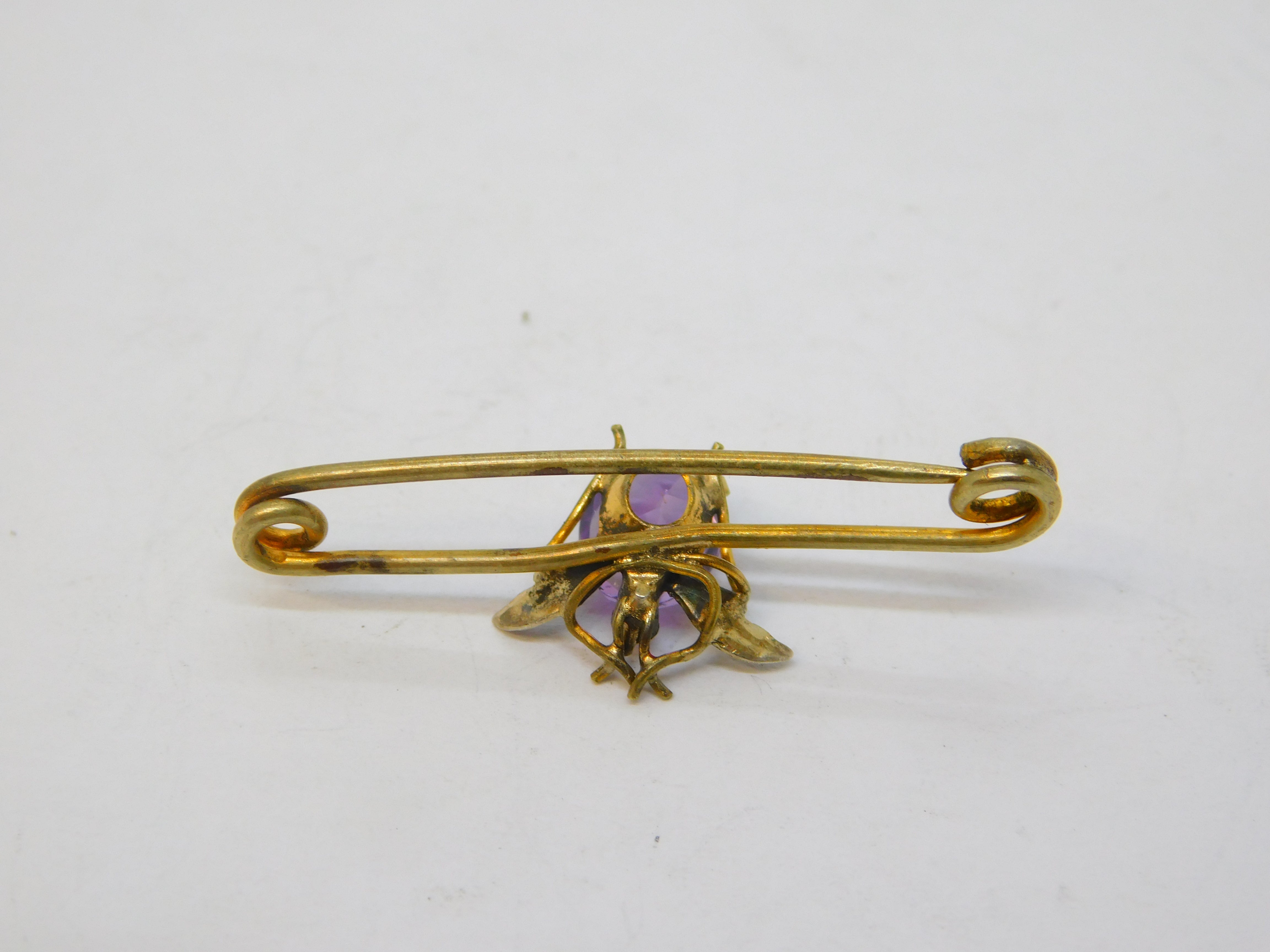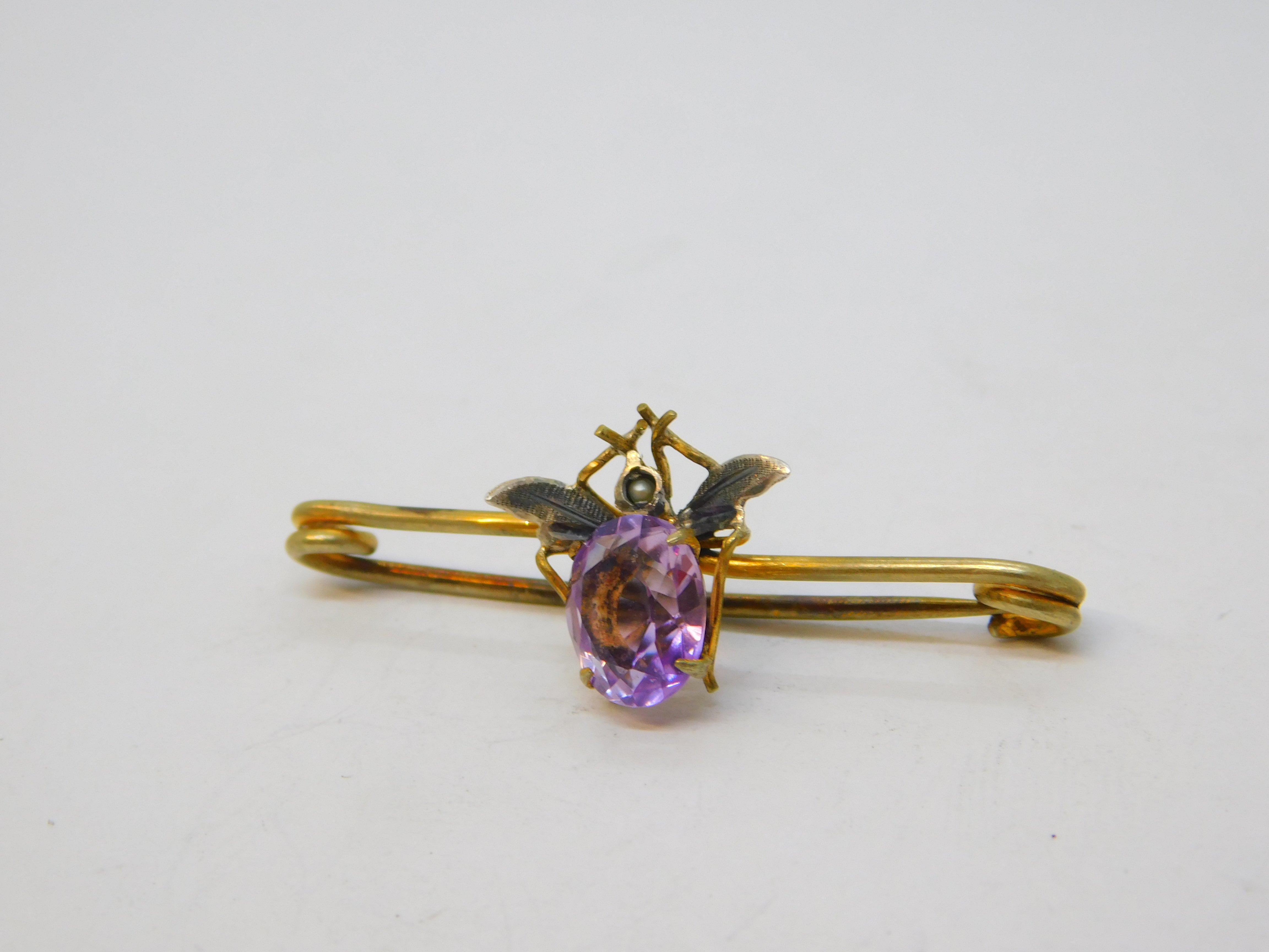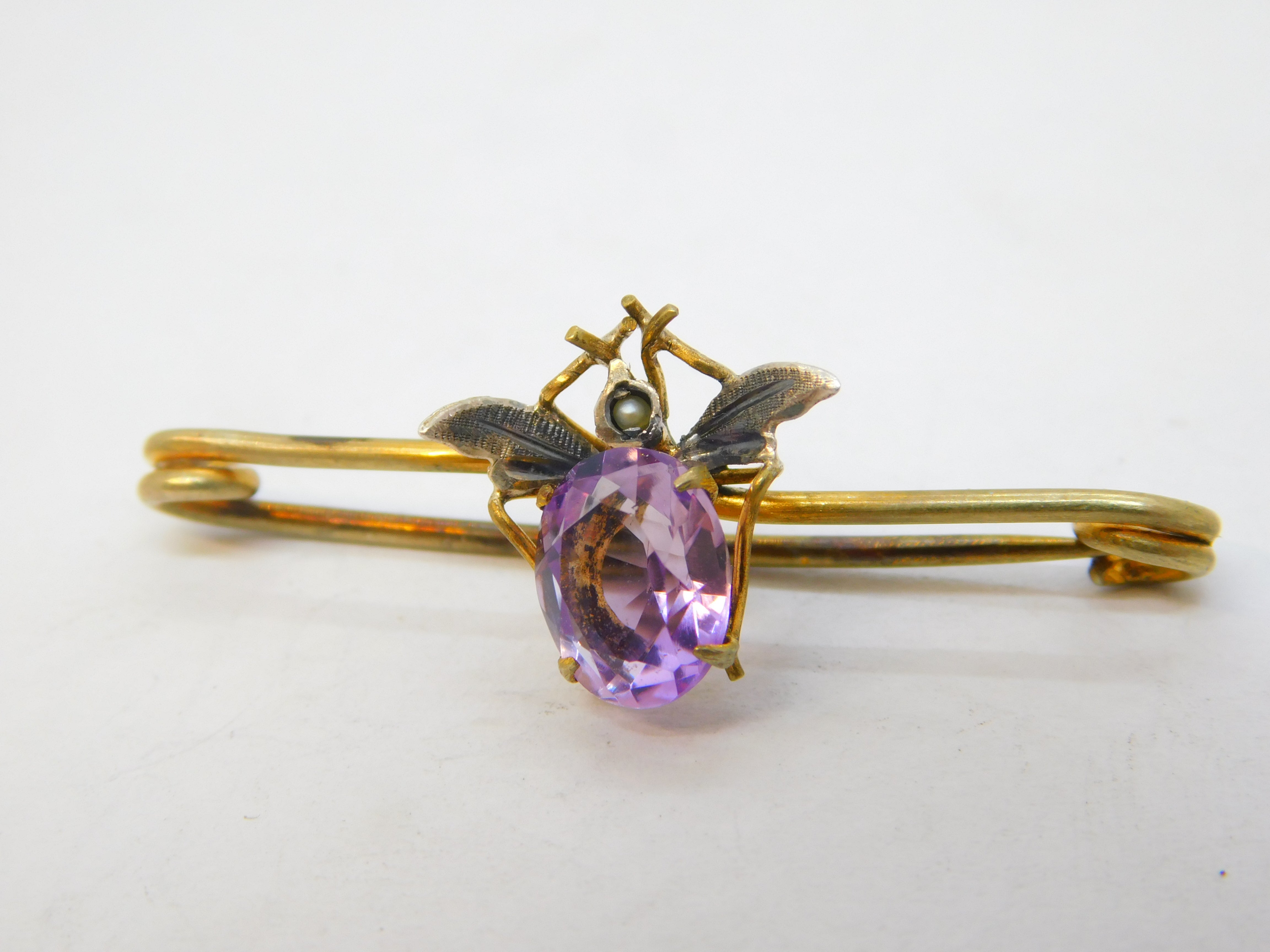 Edwardian Gold Plated Amethyst, Seed Pearl Insect Brooch Antique c1910