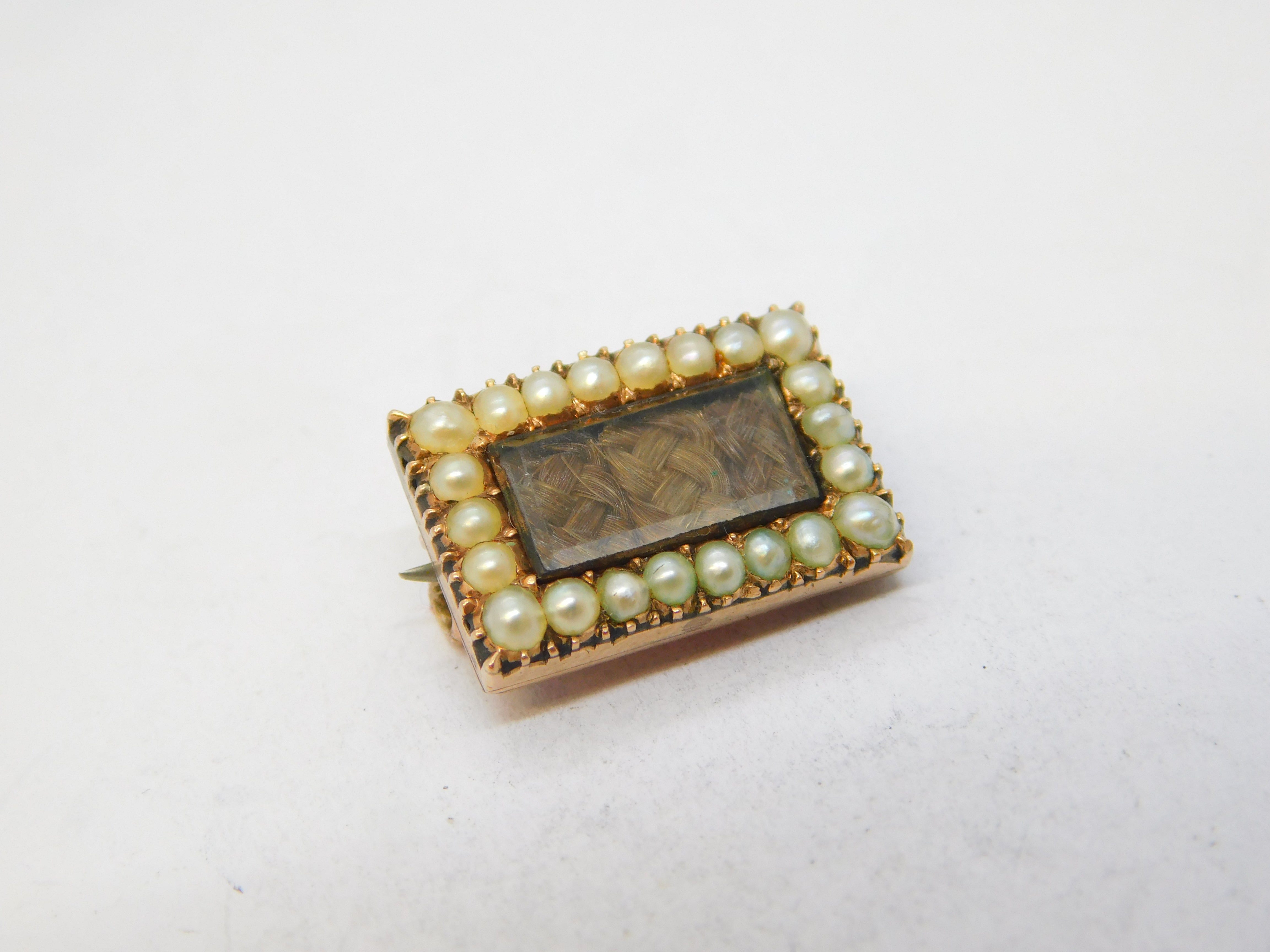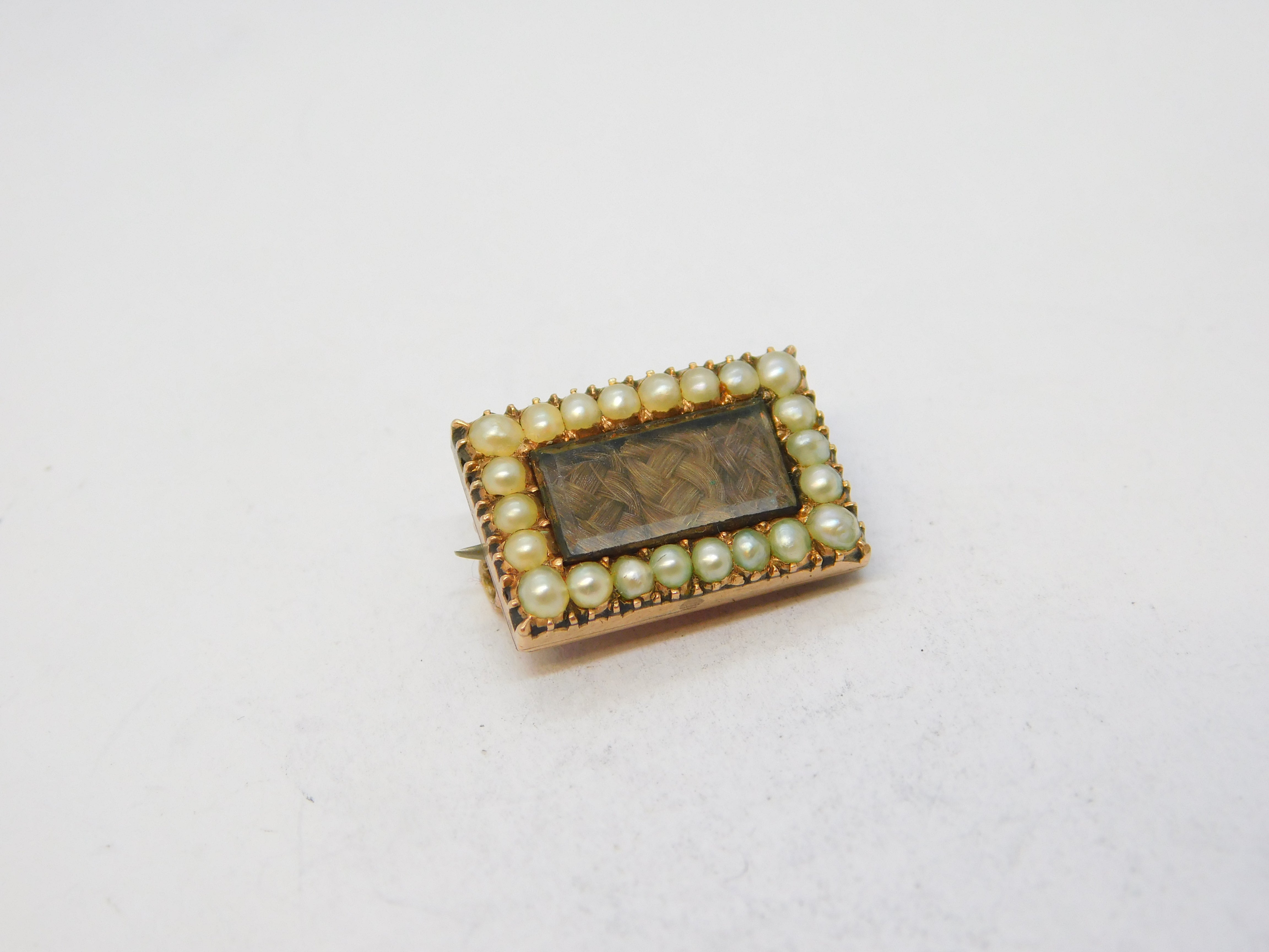 George III 10ct Rose Gold, Seed Pearl, Woven Hair, Agate Mourning Brooch Antique