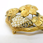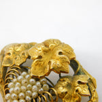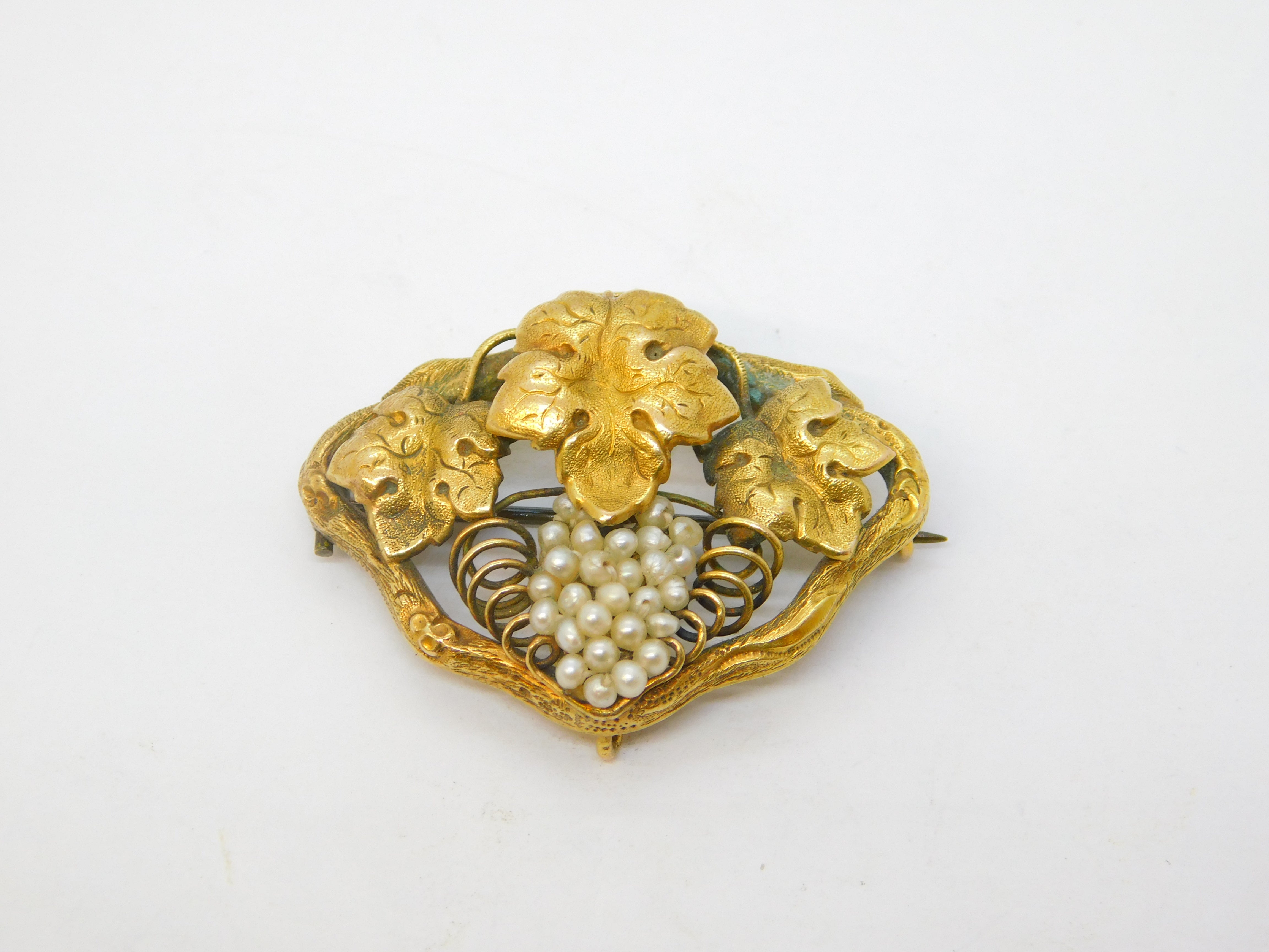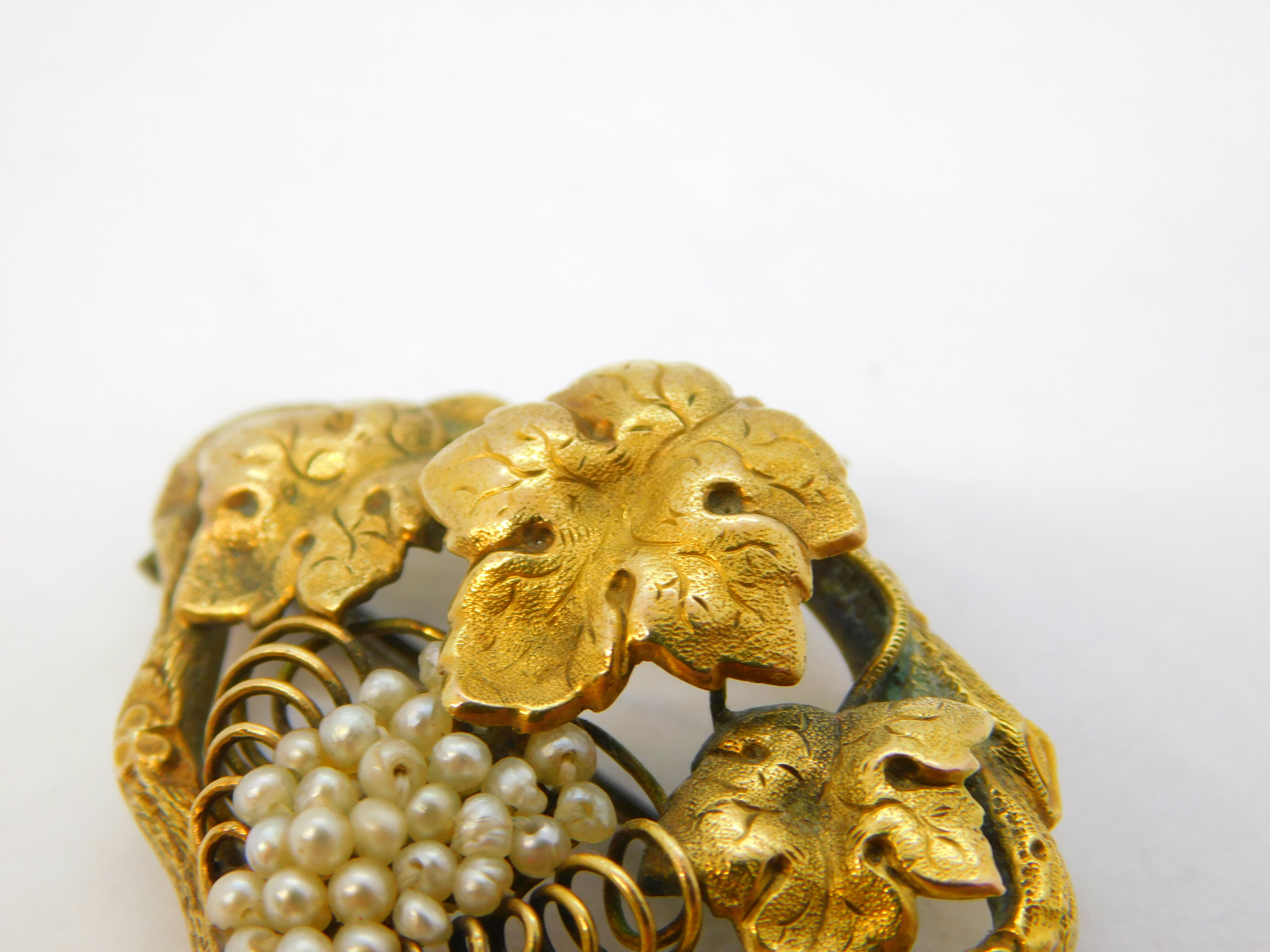 Details: A fantastic and wonderfully designed antique georgian 18ct yellow gold sweetheart brooch formed of three leaves above a bunch of grapes set with seed pearls, engraved with initials to the reverse, the gold has been XRF tested as it is unmarked c1790. This is a wonderful item that would make a perfect gift or addition to any collection.