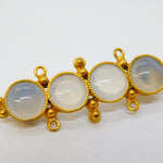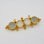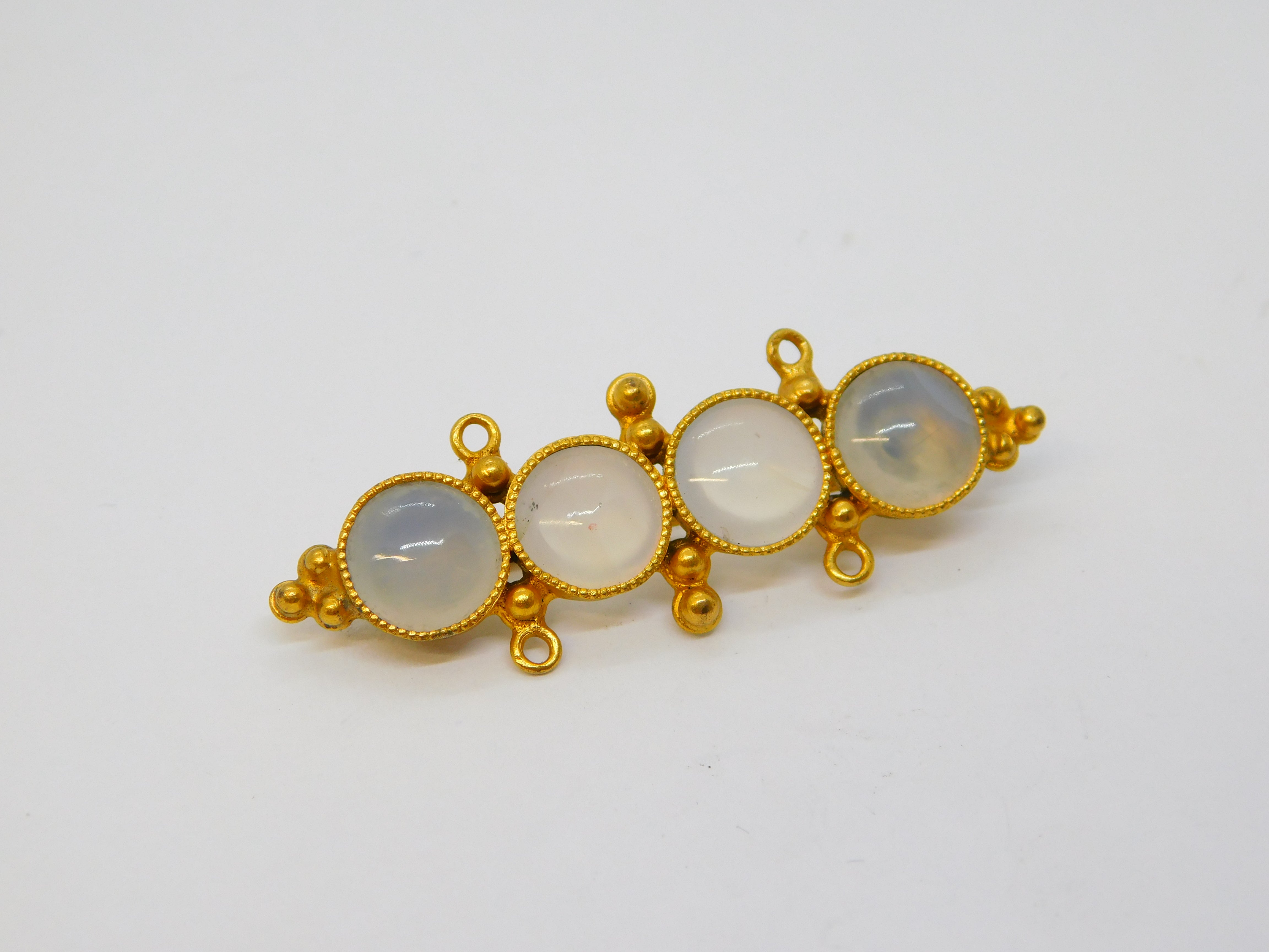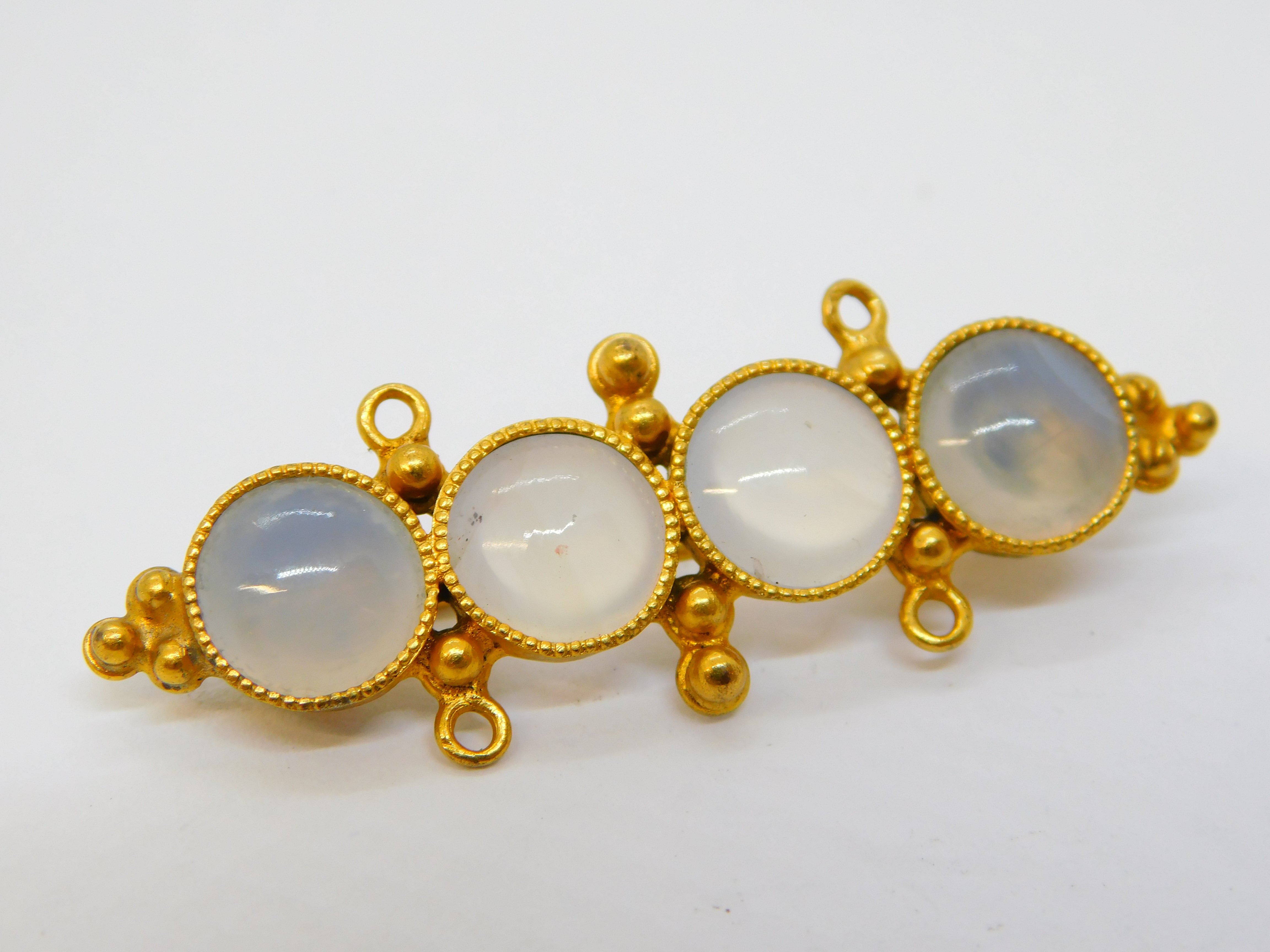 Details: A fantastic and wonderfully designed antique georgian gold plated four-part bar brooch set with beautiful moonstones c1820. This is a wonderful item that would make a perfect gift or addition to any collection. We are more than happy to provide XRF reports for items upon request.