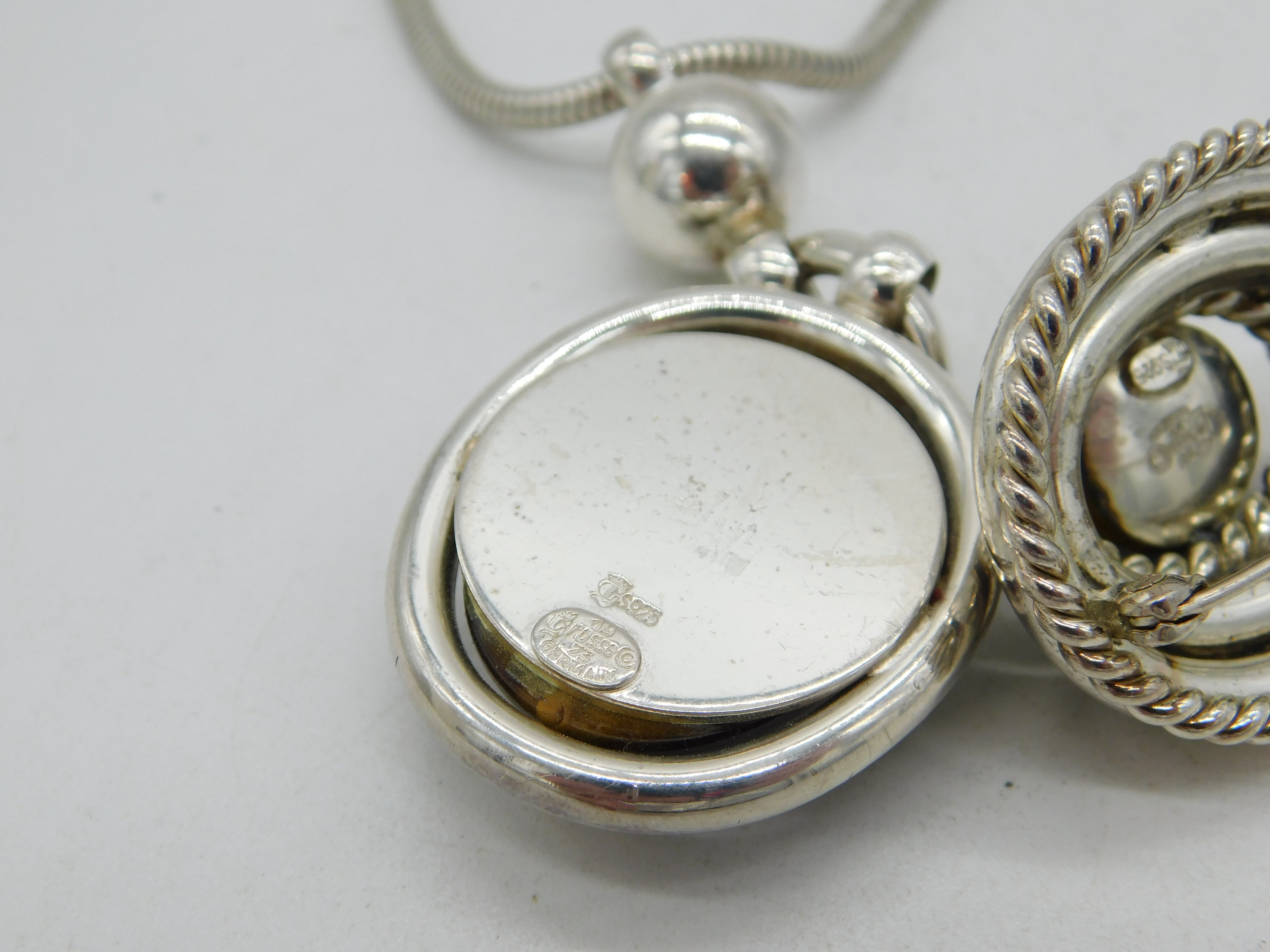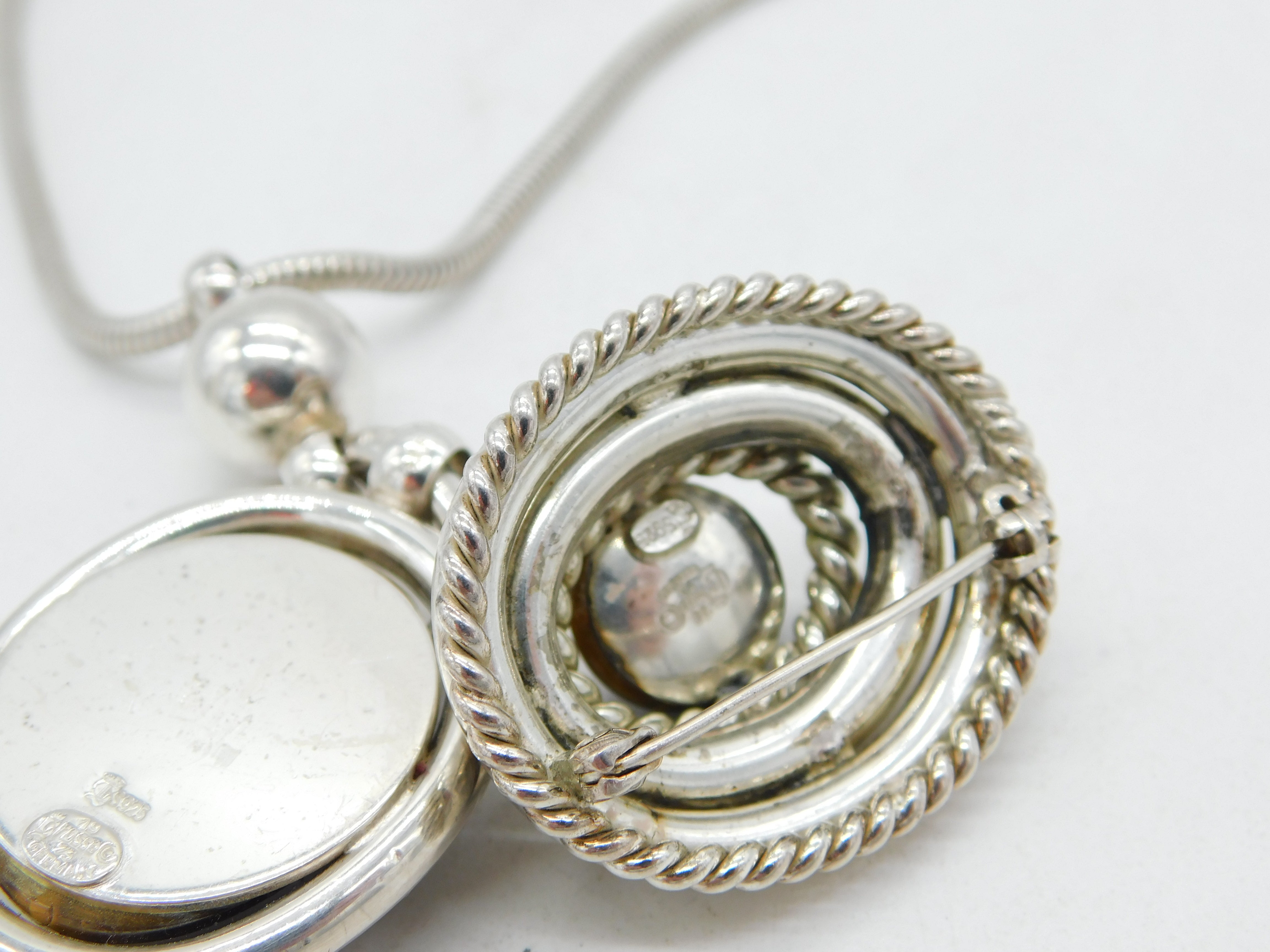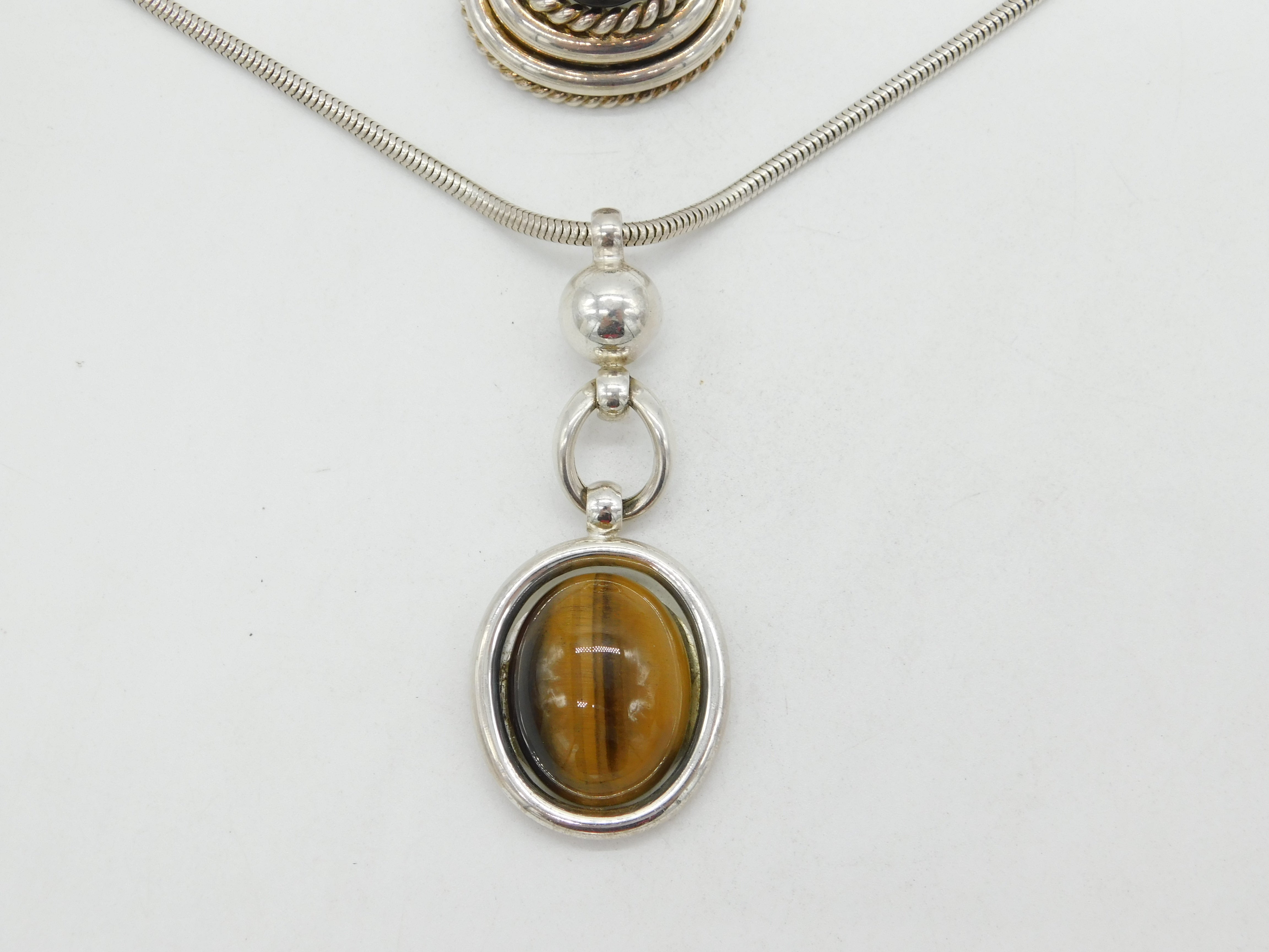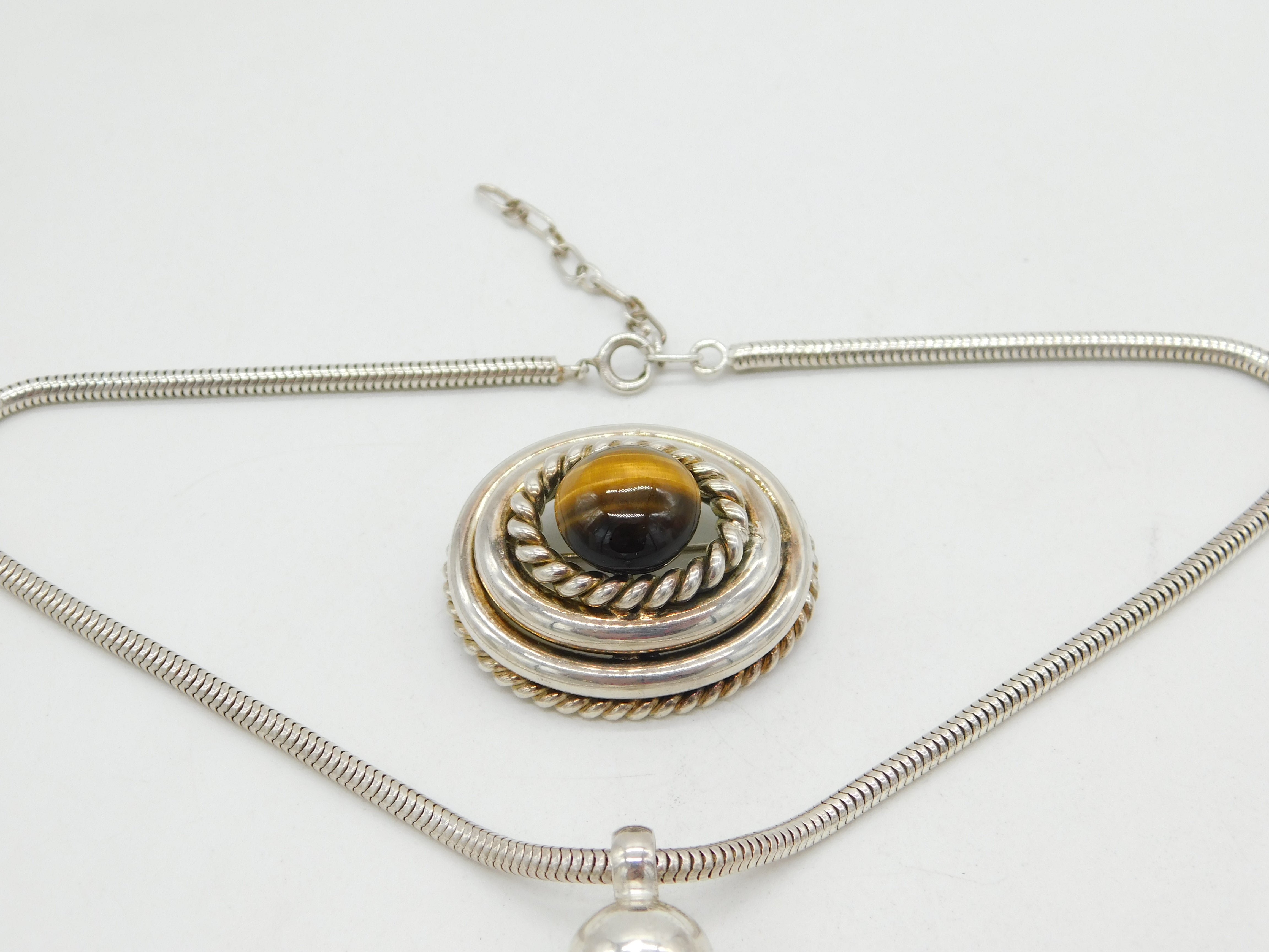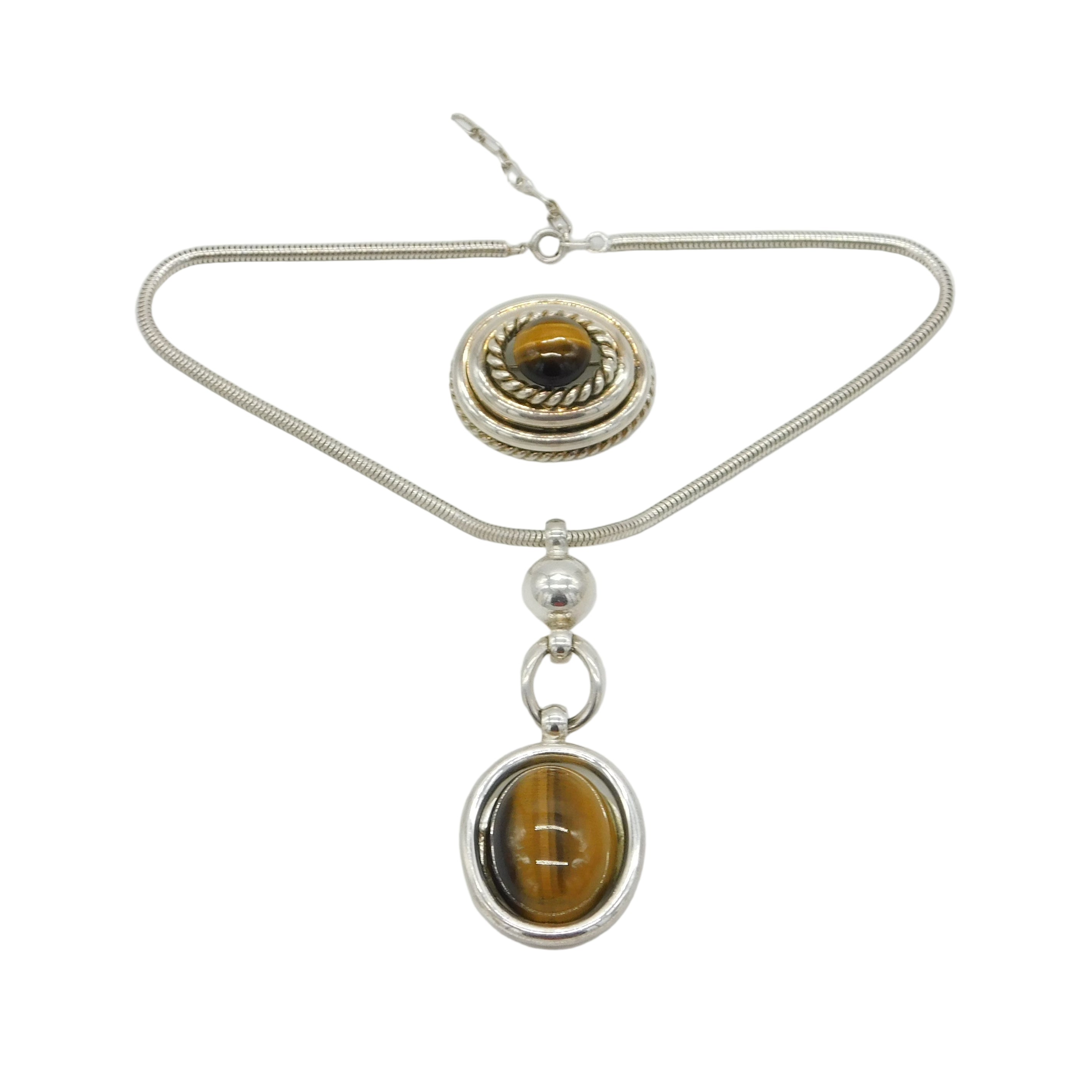 Details: A fantastic and wonderfully designed vintage German sterling silver modernist jewellery suite to include a wonderful chunky silver brooch alongside a gorgeous drop pendant necklace both set with large tiger's eye cabochons, both hallmarked Grosse 1973 to the reverse. This is a wonderful item that would make a perfect gift or addition to any collection. We are more than happy to provide XRF reports for items upon request.
