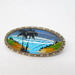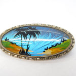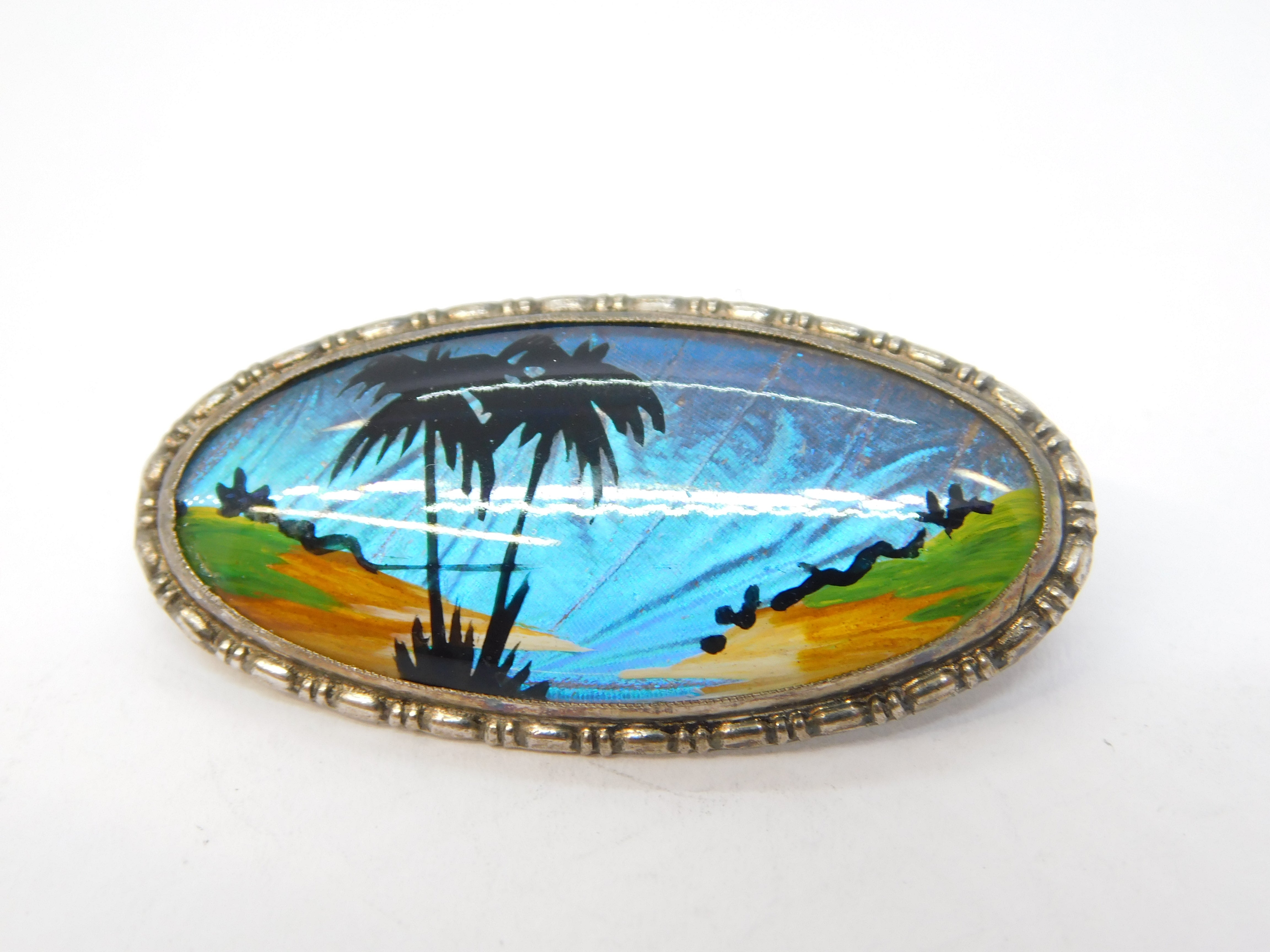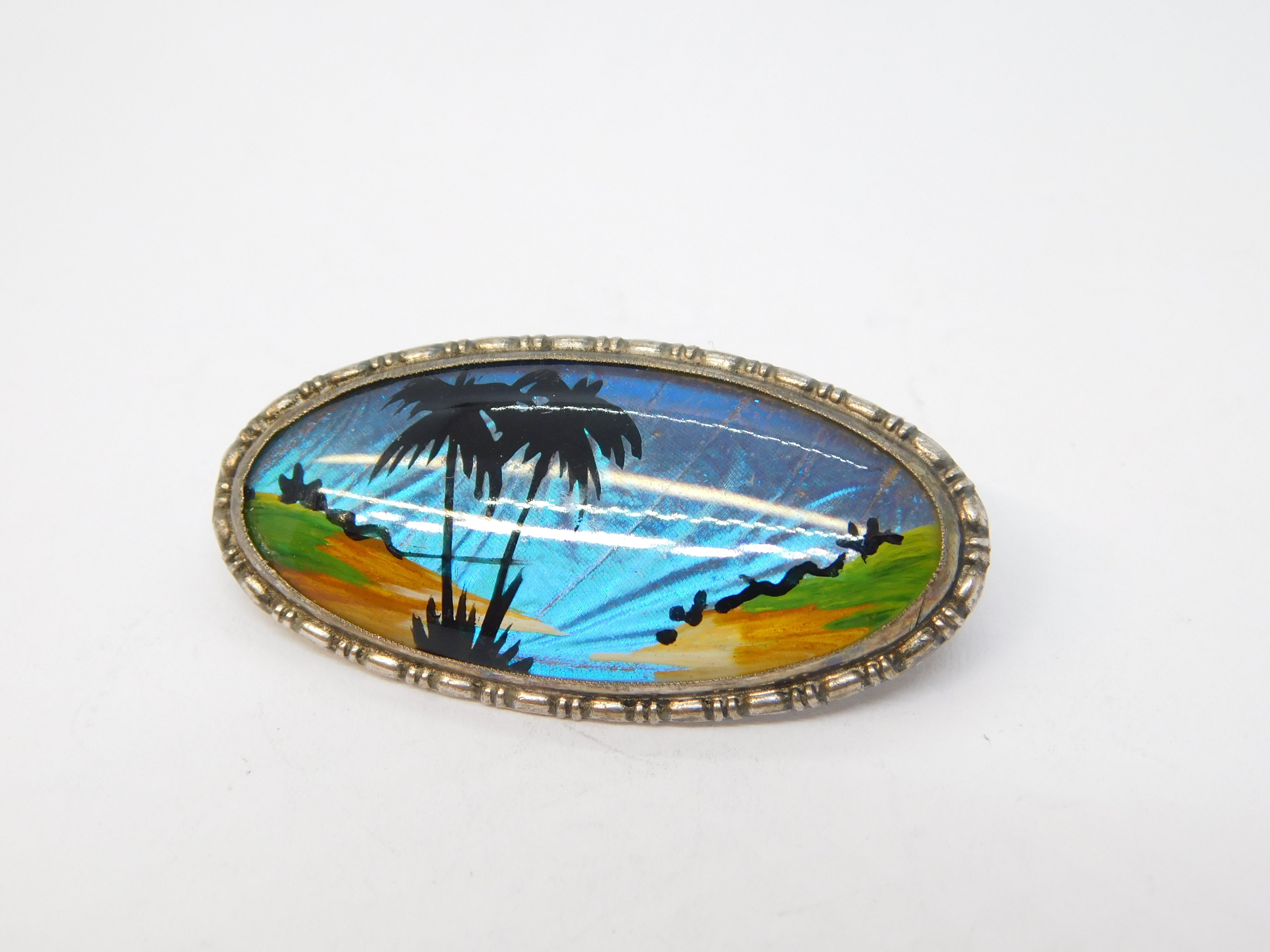 TLM Sterling Silver Morpho Butterfly Wing Set Island Scene Brooch Antique c1930