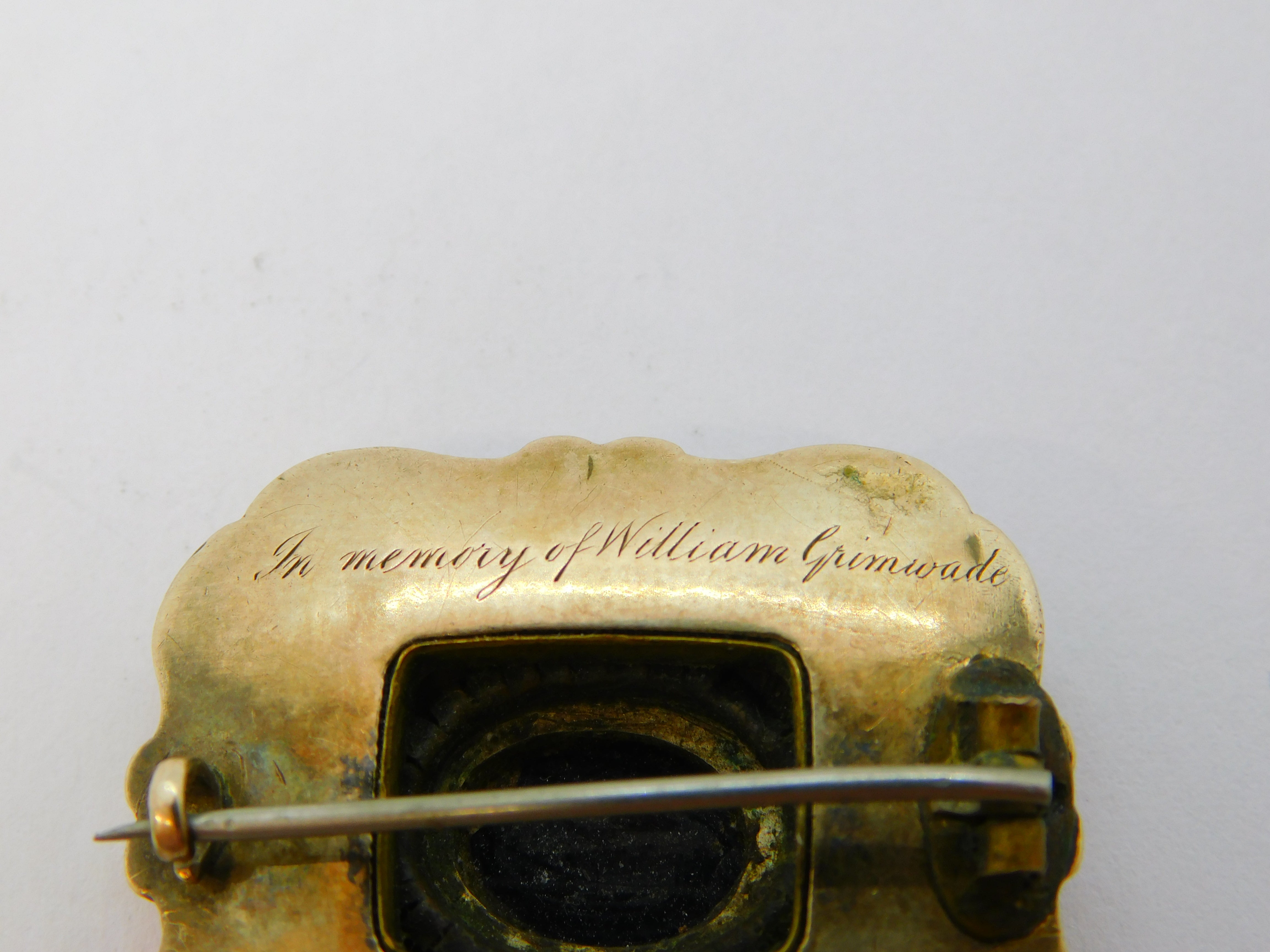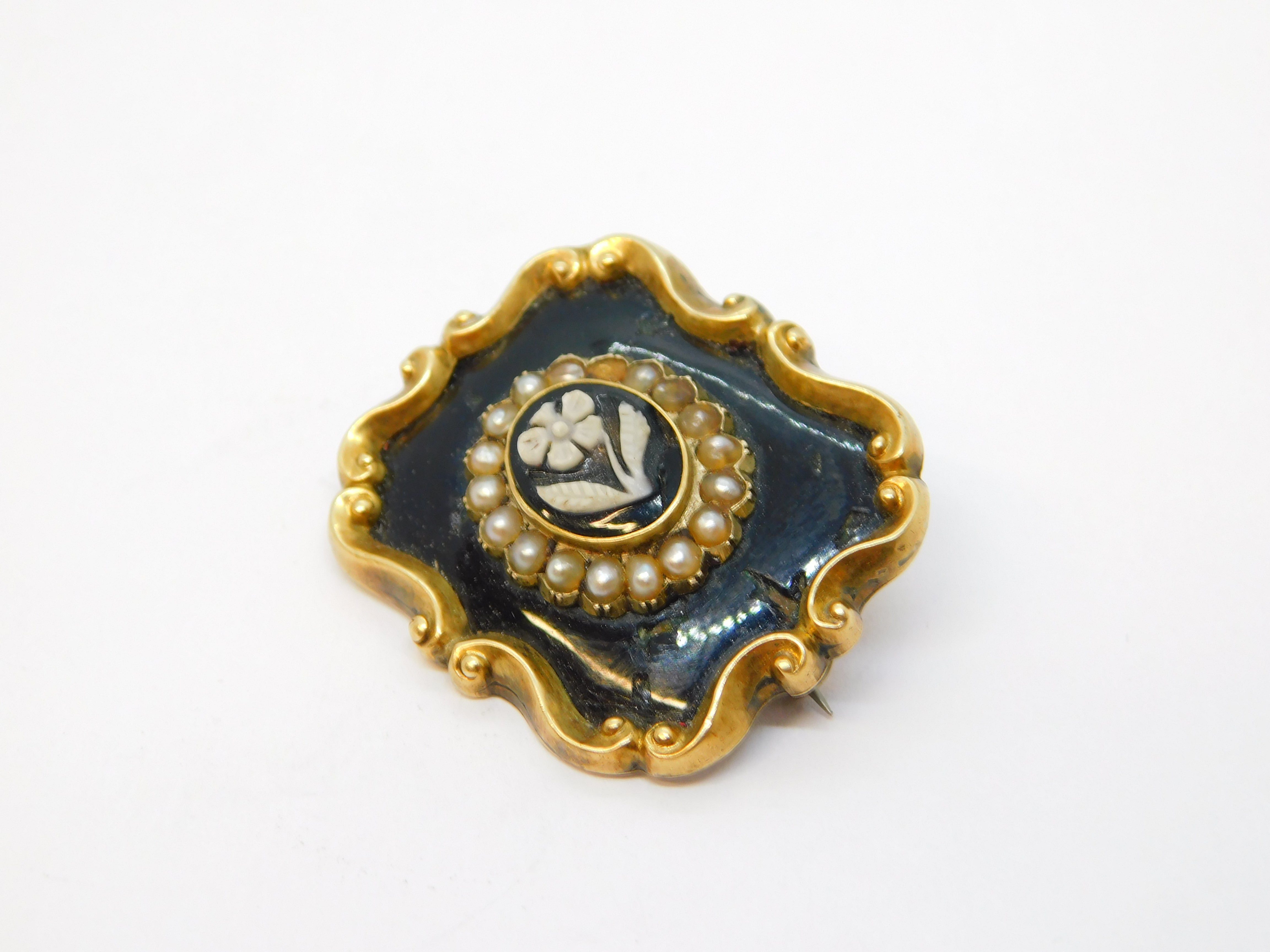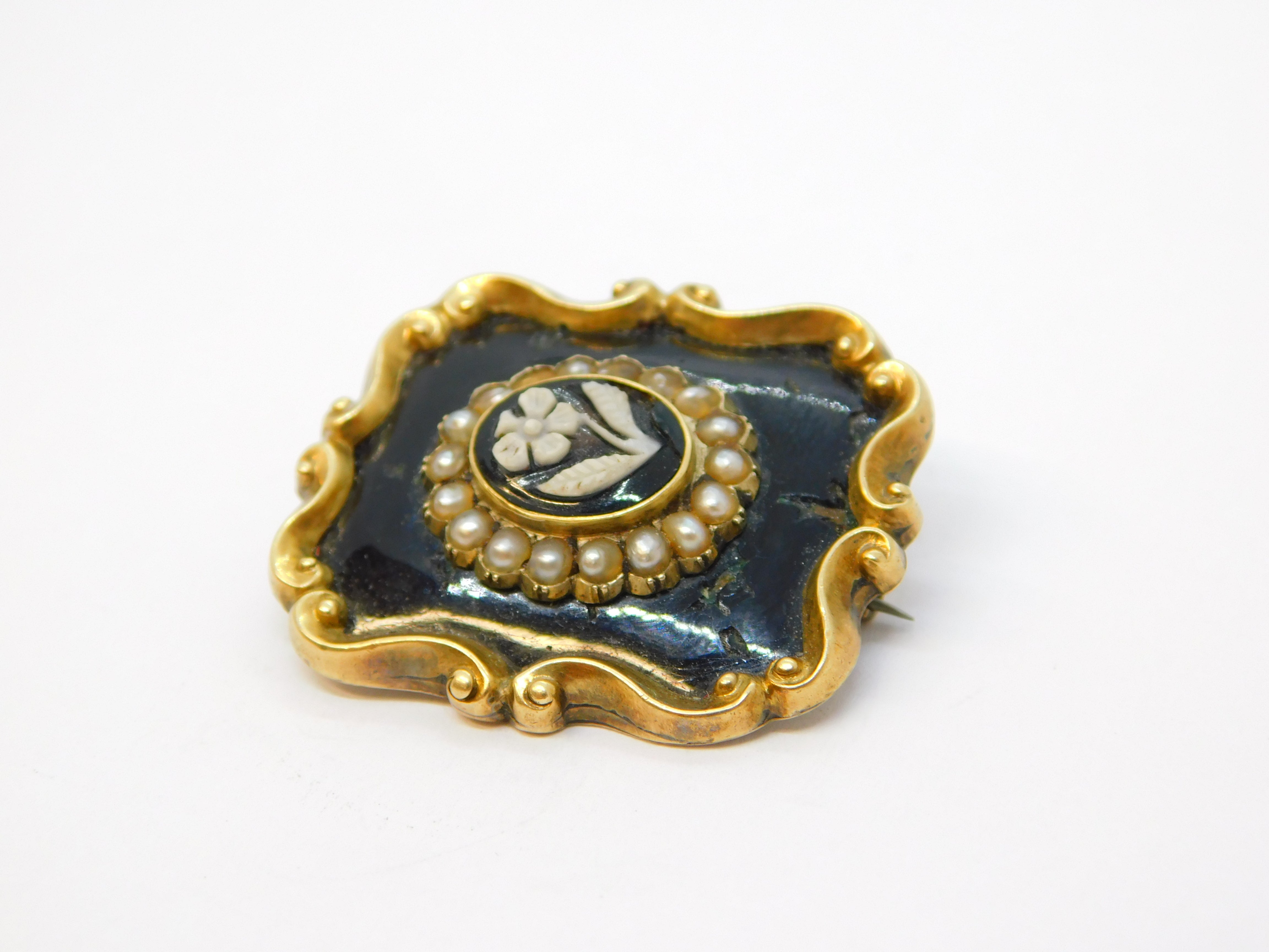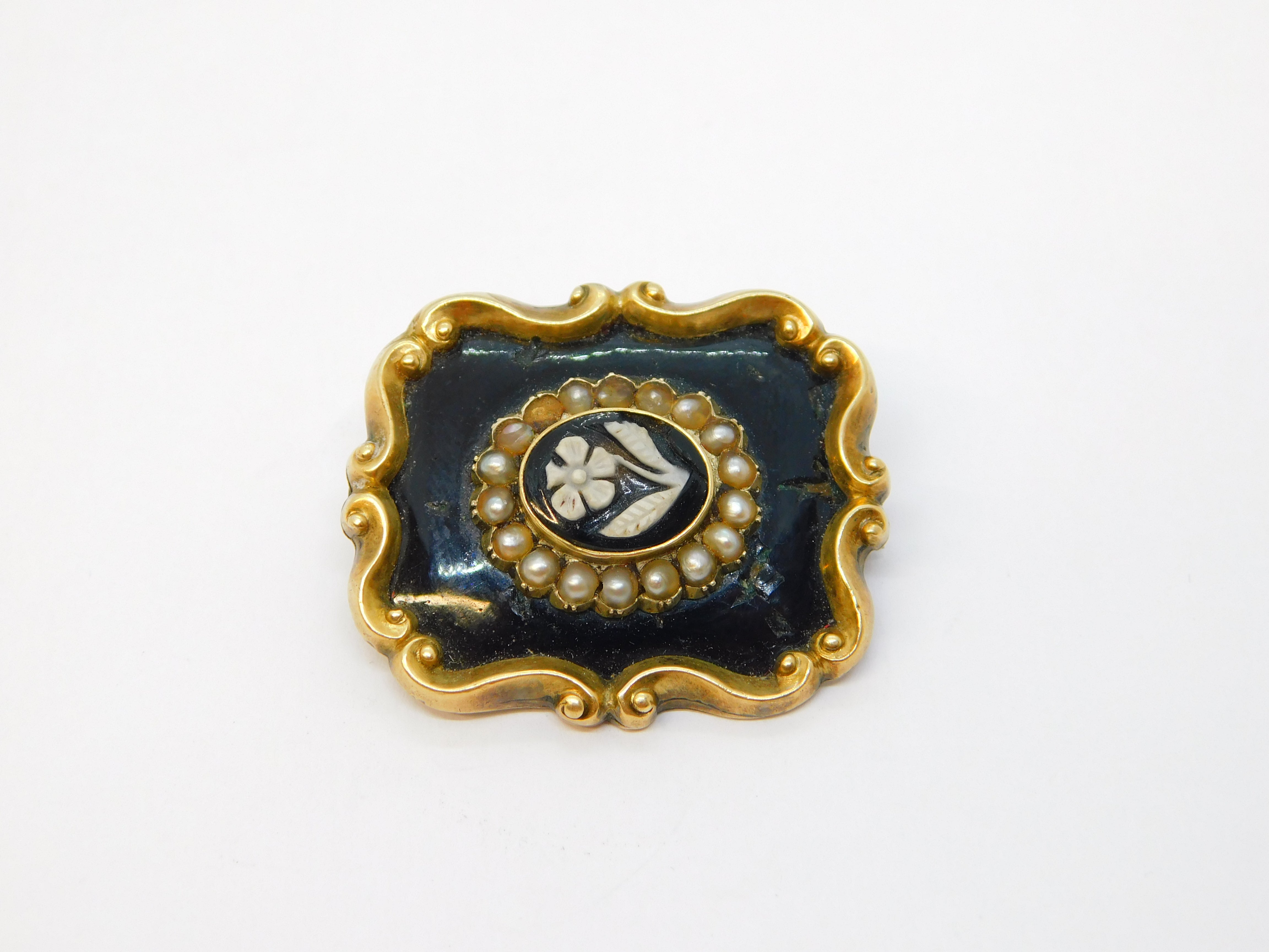Details: A fantastic and wonderfully designed antique early-Victorian 9ct yellow gold mourning brooch with black enamel surrounding a central carved black hardstone panel with floral detailing flanked with seed pearls, engraved to the reverse 'In Memory of William Grimwade, Died 23 Oct 1843 At 62', the gold has been XRF tested please see pictures, enamel damage to the front. This is a wonderful item that would make a perfect gift or addition to any collection. We are more than happy to provide XRF reports for items upon request.