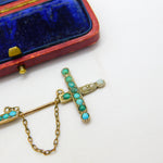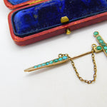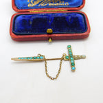 Victorian 9ct Rose Gold, Turquoise & Seed Pearl Sword Form Lapel Brooch c1840
